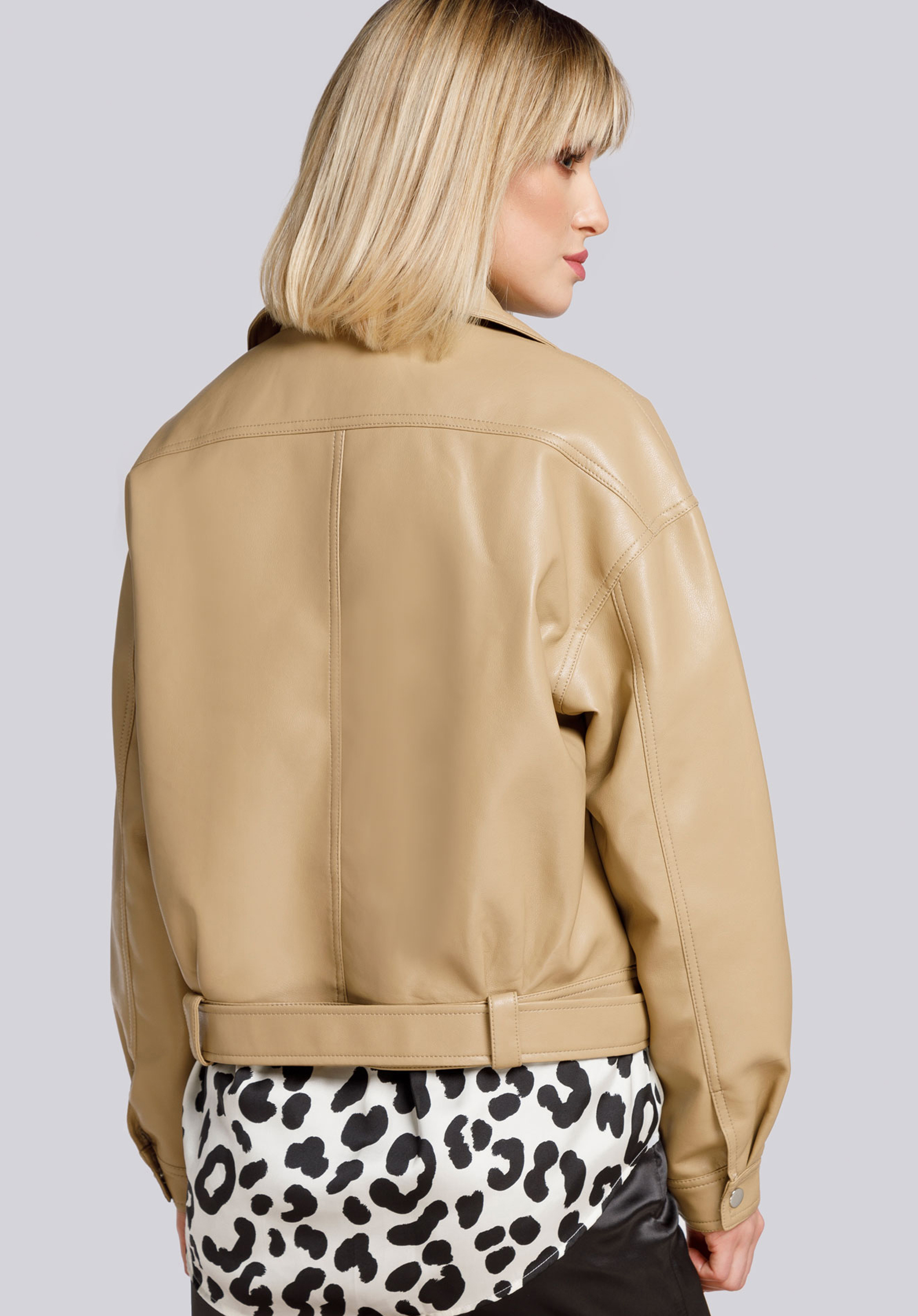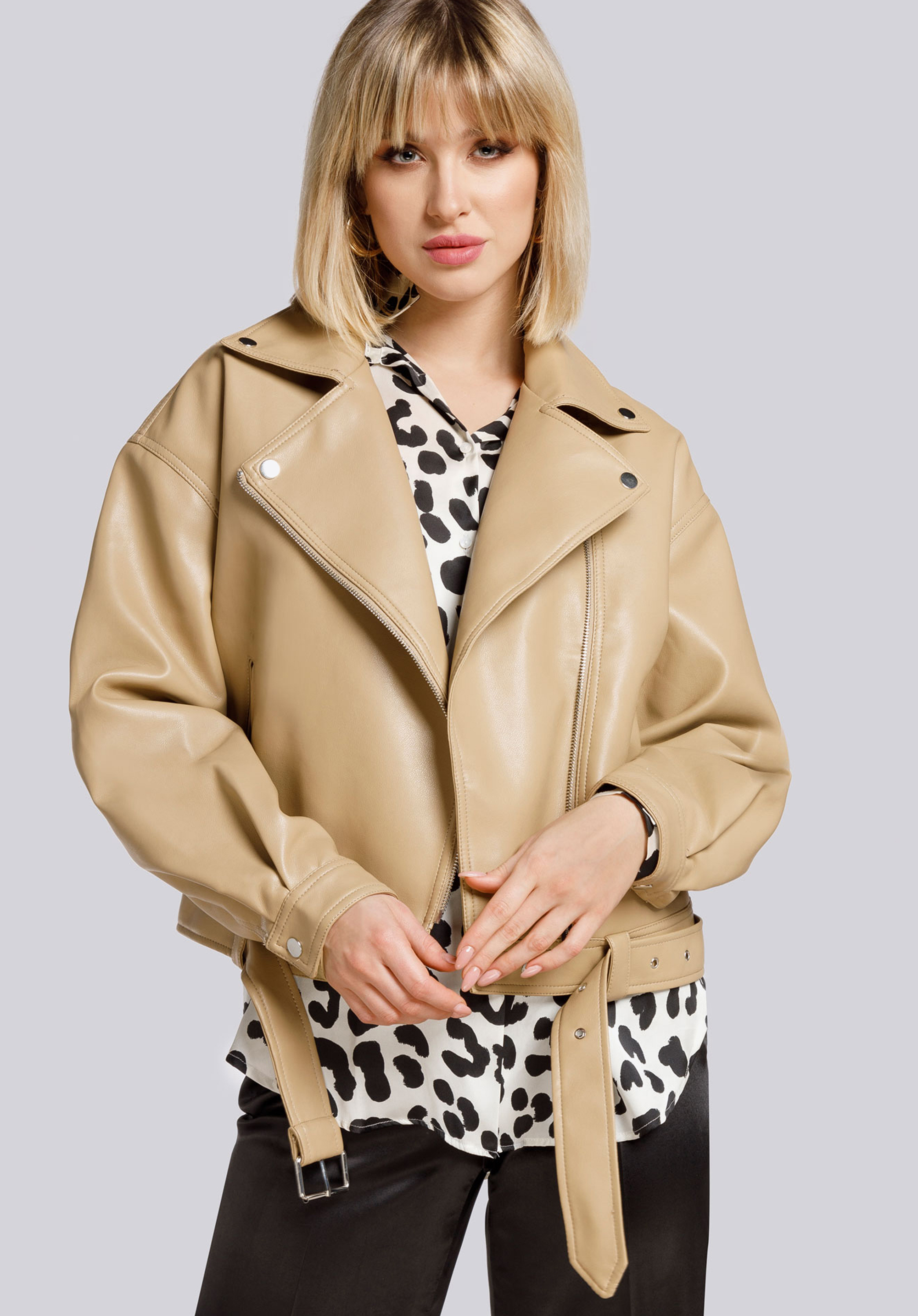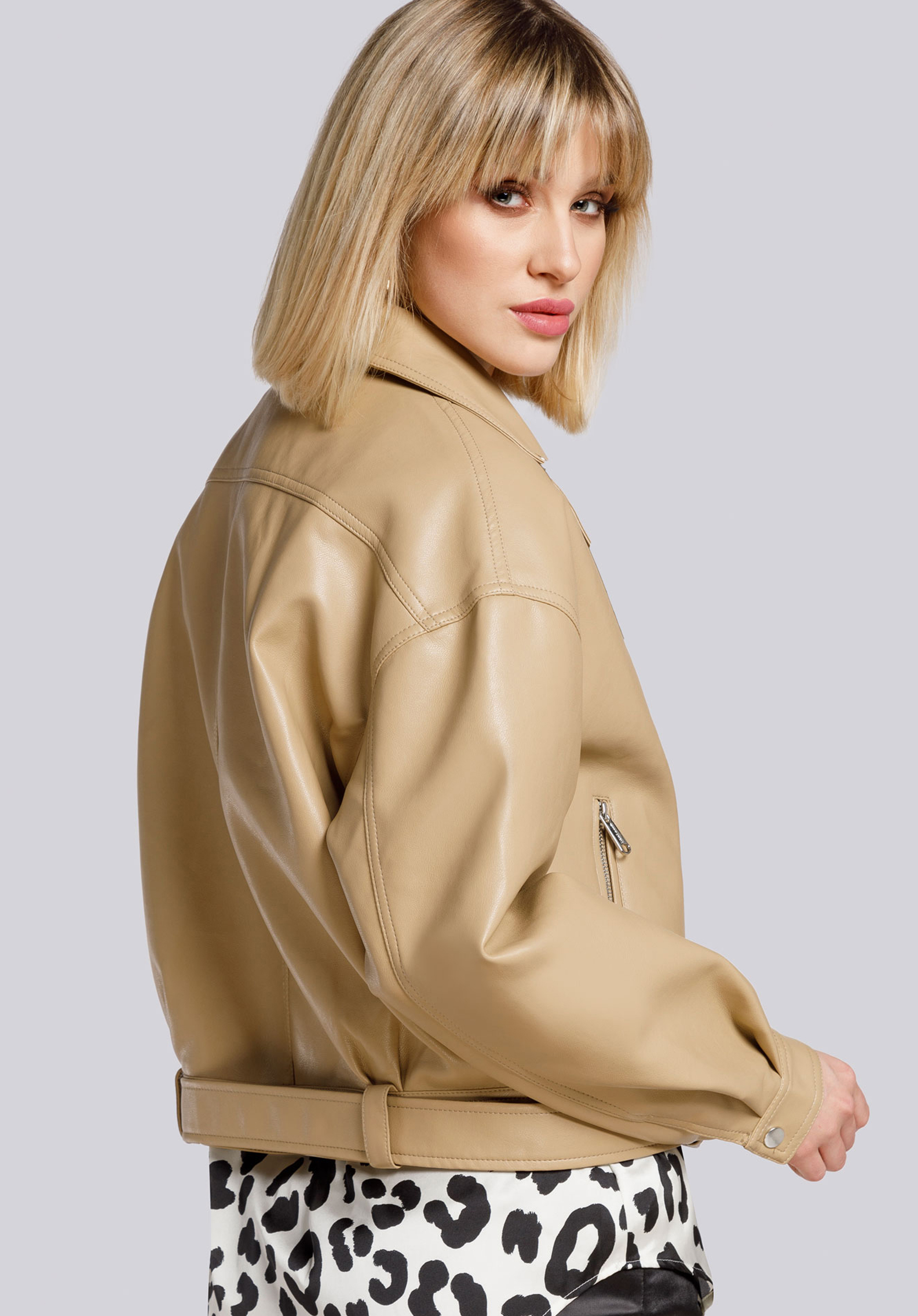 Tato moderní bunda podtrhne charakter vašeho obleku. Střih je zdůrazněn širokými rukávy zakončenými patentkou. I přes vetší střih má standardní délku: lehce pod pas. Bude vypadat skvěle s vypasovanými úzkými sukněmi. Vpředu má dvě šikmé kapsy na zip, zapíná se na zip a navíc na dole má druky. Nastavitelný pásek se sponou a kováním lze nosit nebo sundávat v závislosti na povaze obleku. Dámská bunda s páskem bude se skvěle hodit na procházku.