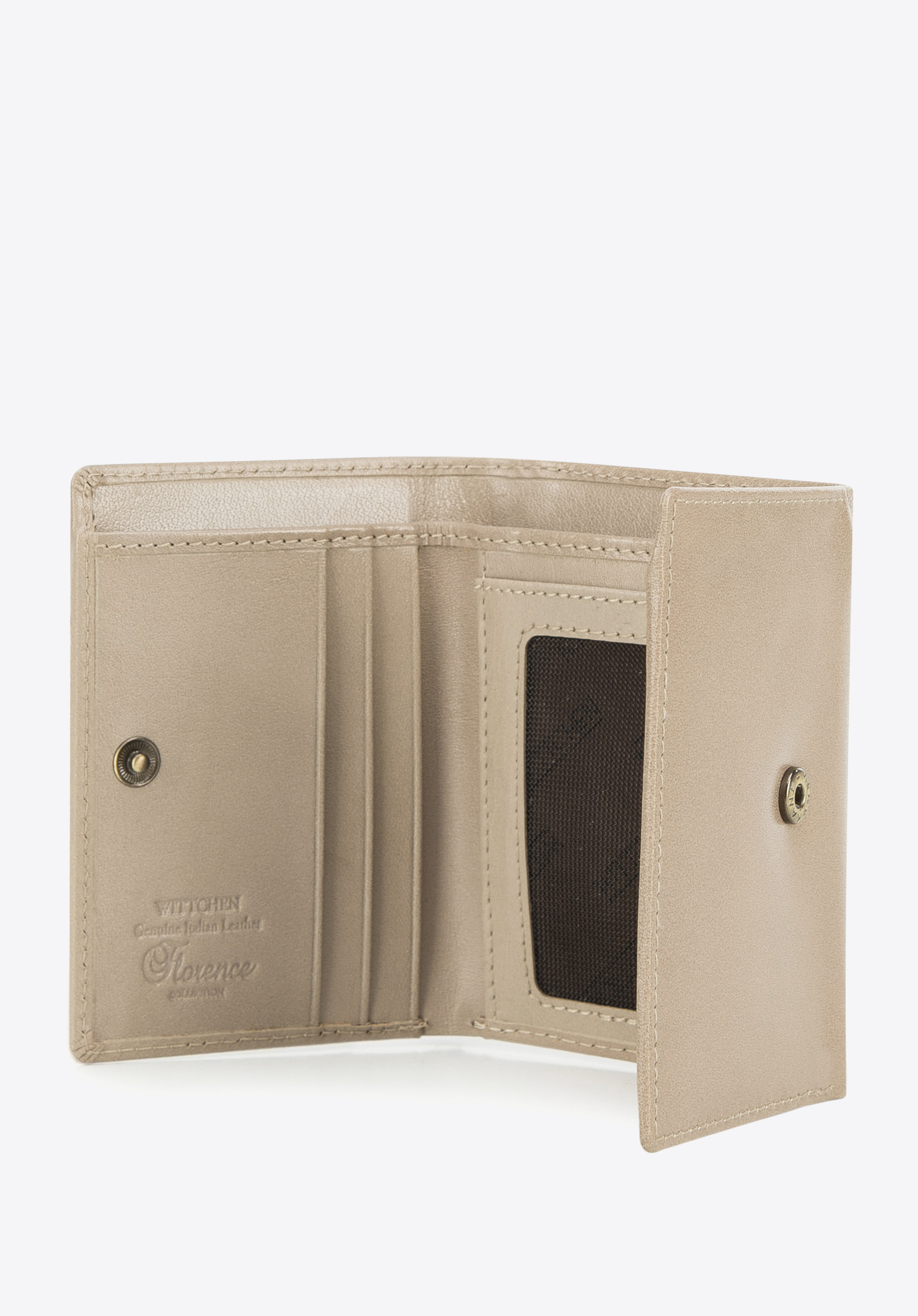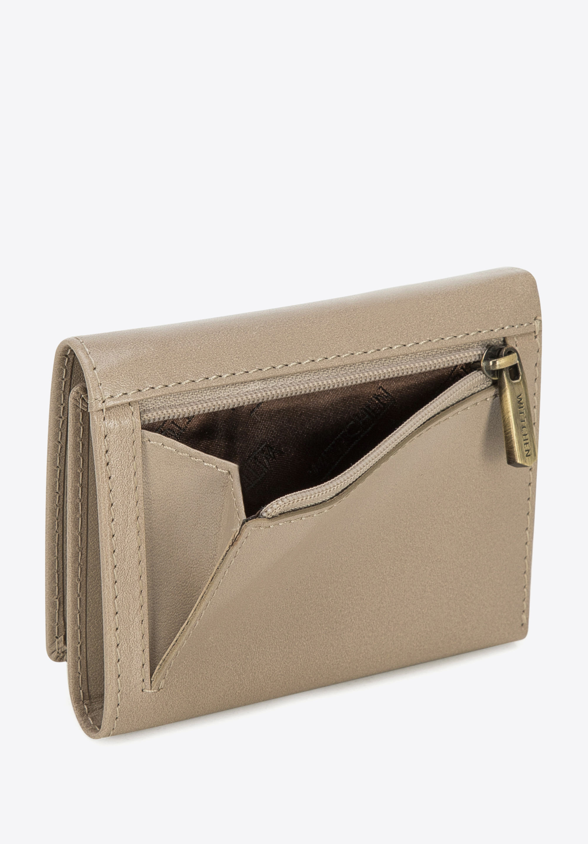 Tato elegantní dámská peněženka je určena pro každou ženu, která cení praktické a stylové doplňky. Byla vyrobena z přírodní kůže, na přední straně má vyražené logo WITTCHEN. Je mala, ale šikovná. Má dobře organizovaný vnitřek: několik přehrádek na karty, otevřené kapsy a síťovaná přehrádka například na fotografii. Z vnější strany je kapsa na zip, takže budete moci ji pohodlně používat, aniž byste museli otevírat celou peněženku. Malá dámská peněženka z hladké kůže je skvělým tipem na dárek pro každou ženu.