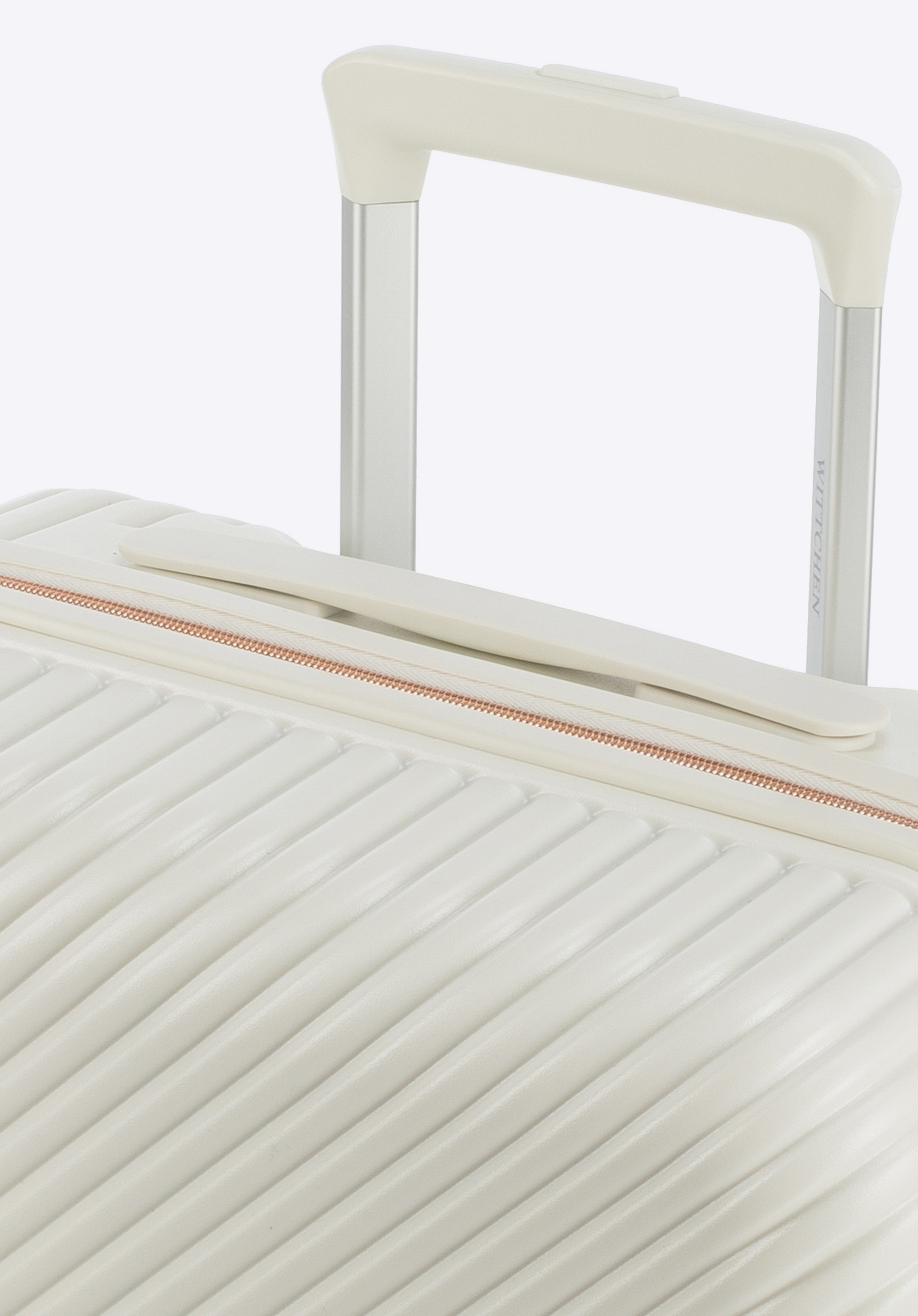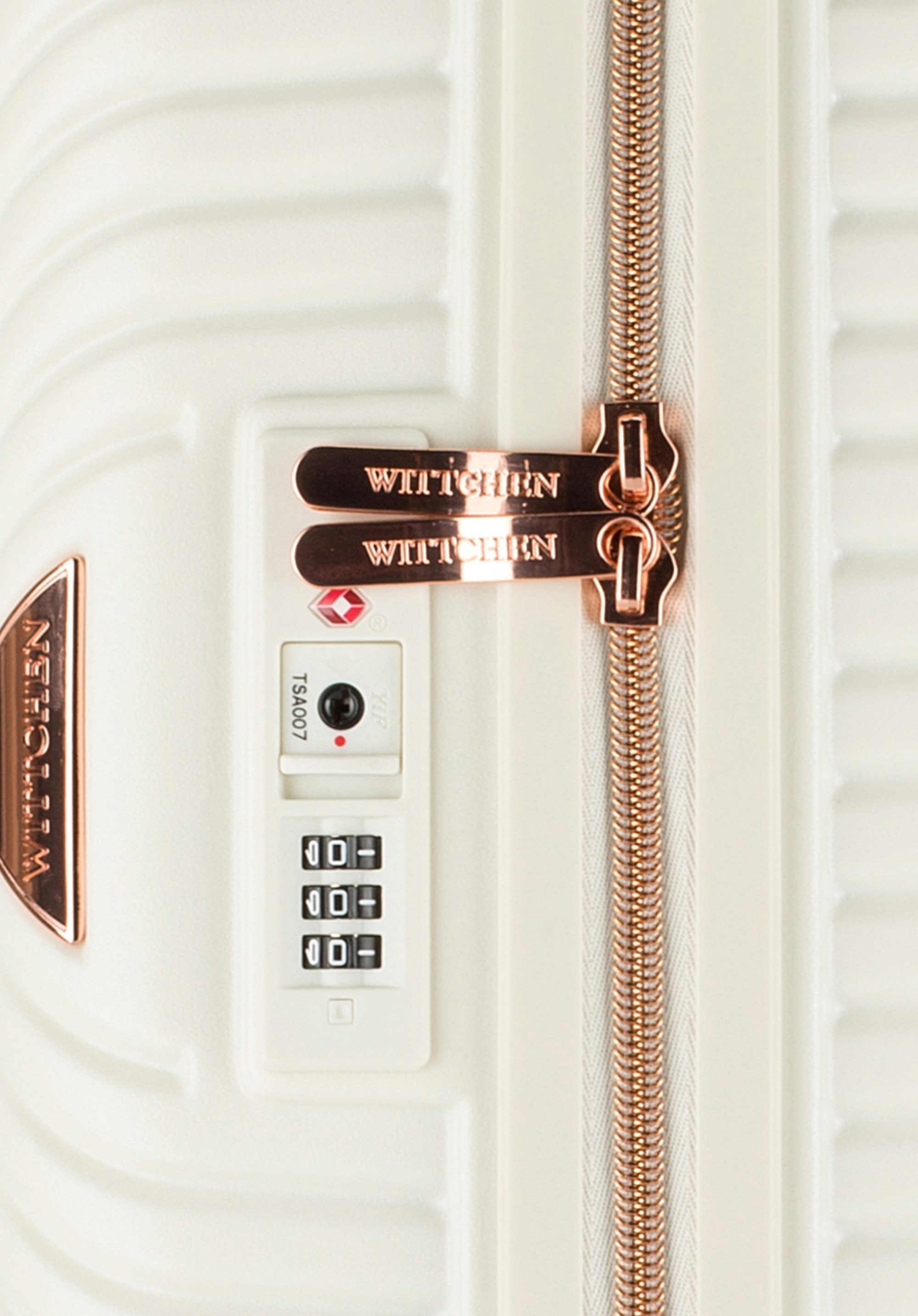 Velký kufr vyrobený z odolného polykarbonátu s matným povrchem s kolečky z ABS se speciální termoplastickou vrstvou. Jedná se o designový projekt s lesklým kováním v růžovém zlatě. Kolečka z plastu ABS s elastickým povlakem. Vnitřek kufru je potažen béžovou podšívkou s logem WITTCHEN. Model je k dispozici ve třech odstínech: bílým, černým a růžovém.