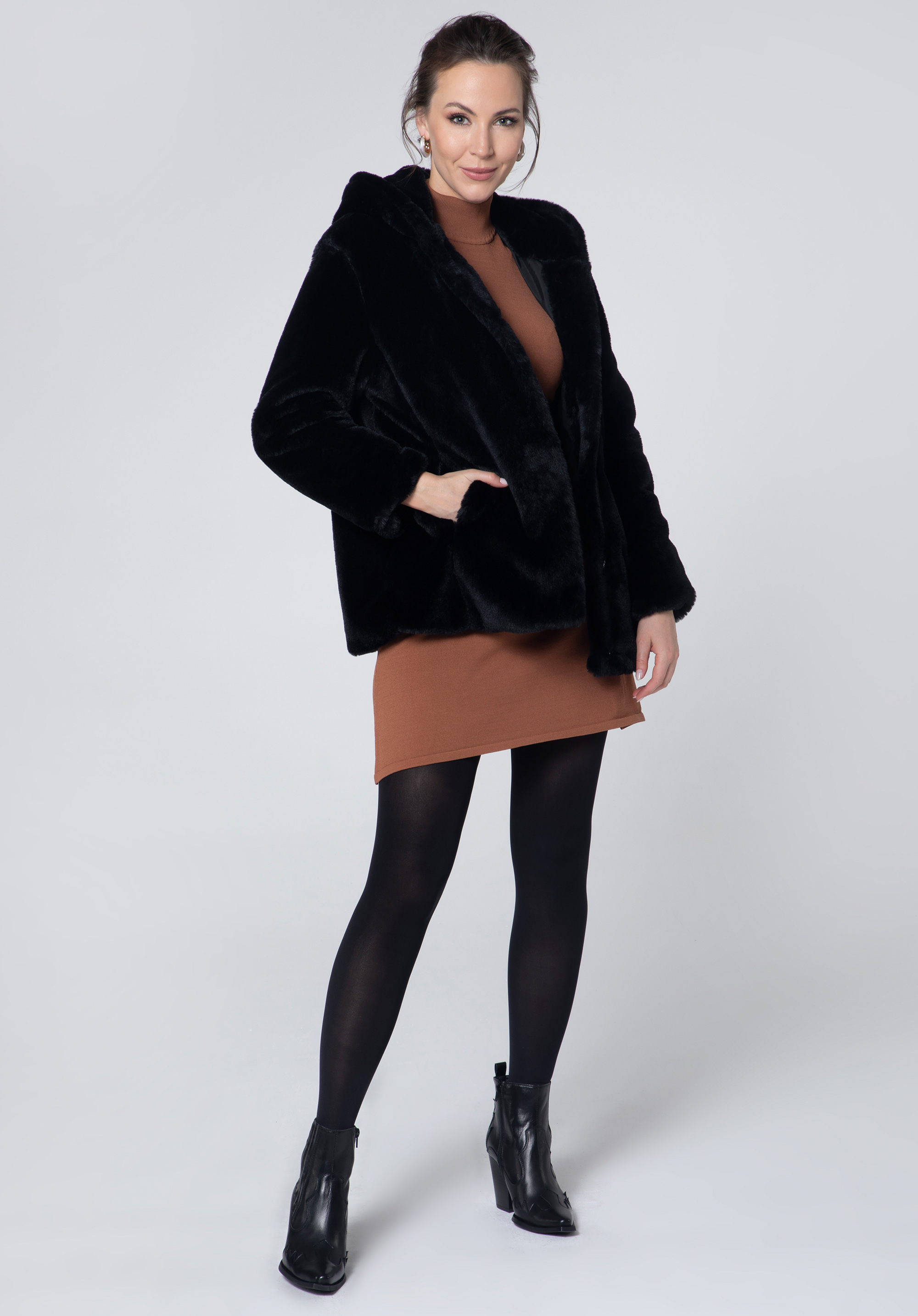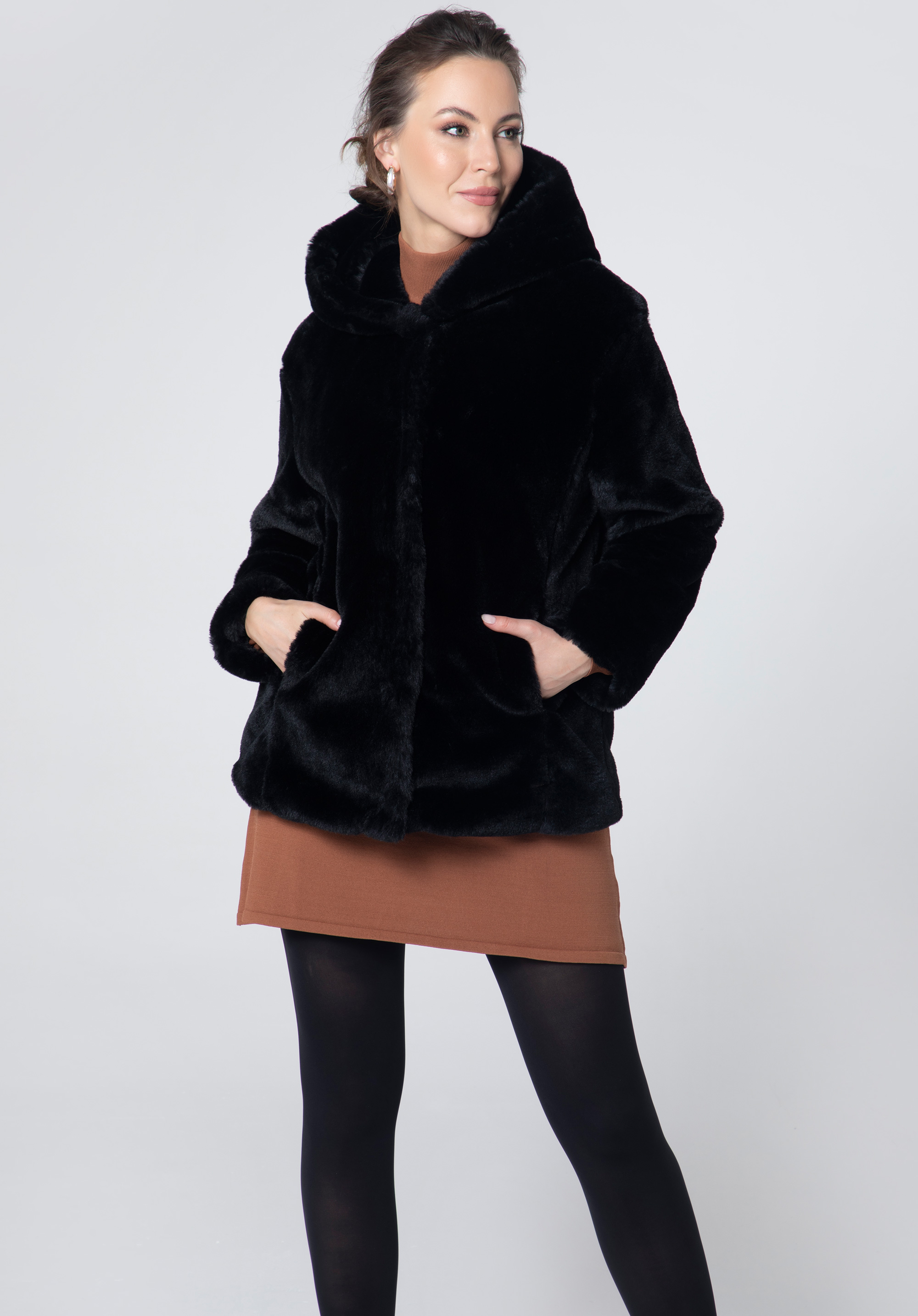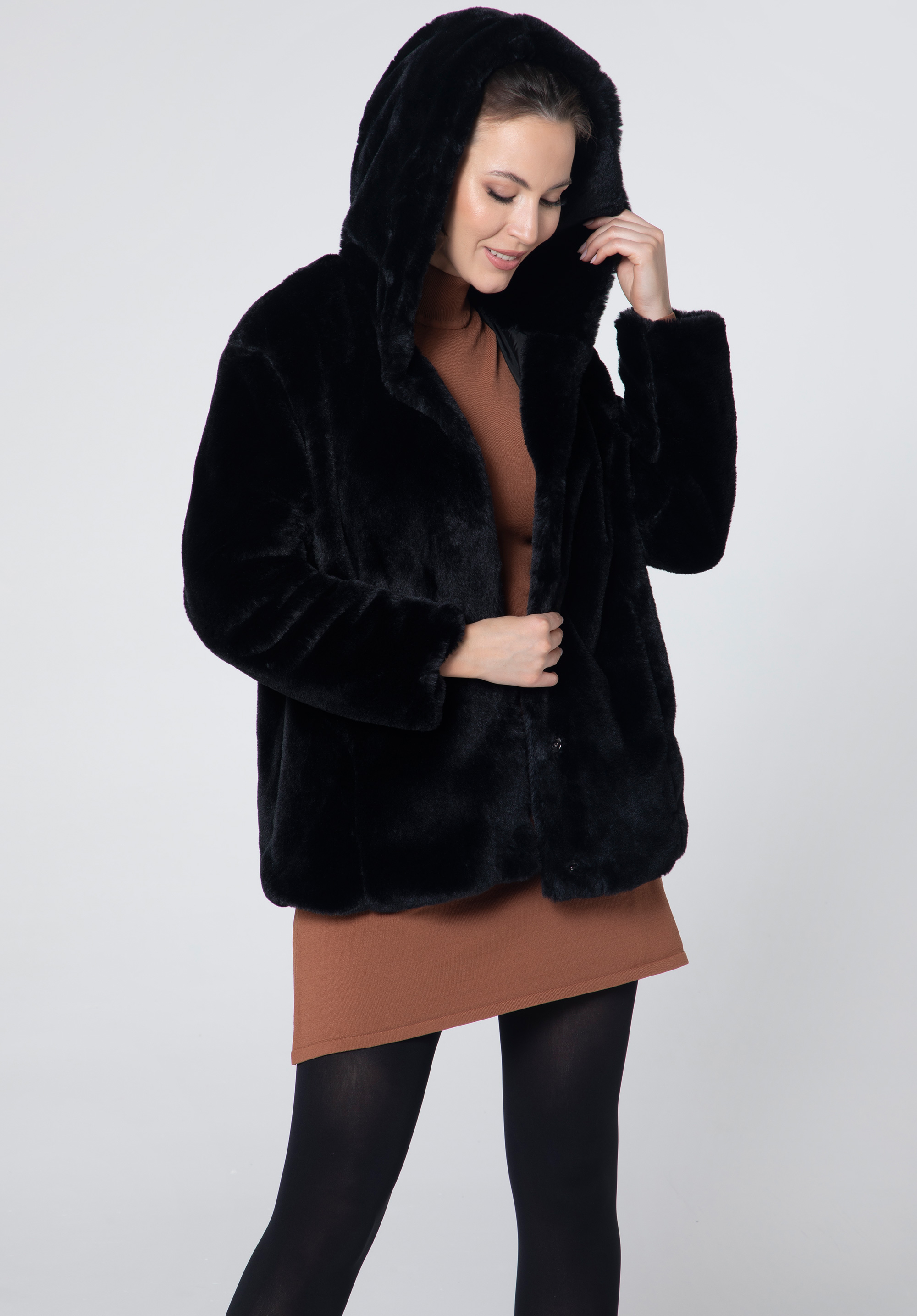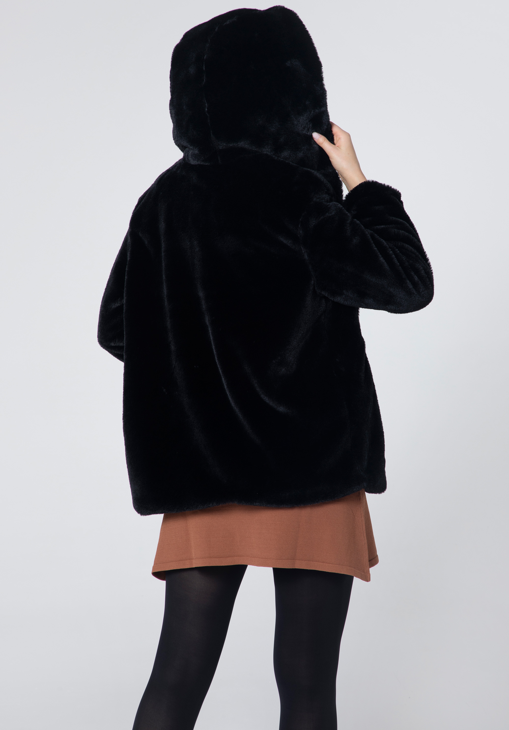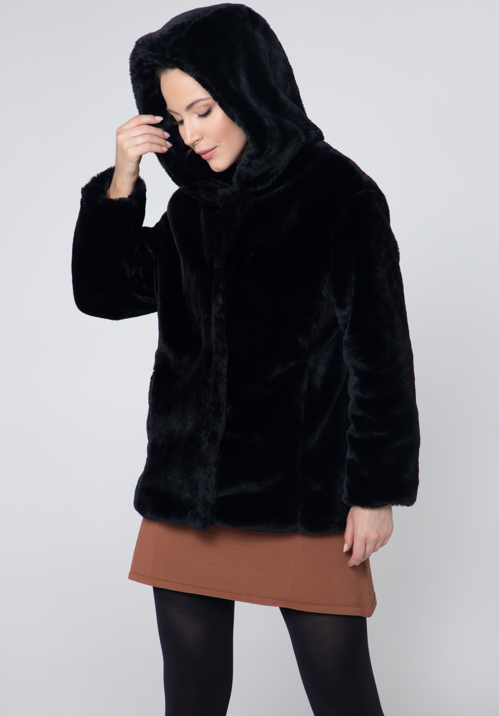 Ekologická kožešinanadměrné velikosti je skvělým doplňkem každé módní ženy. Je velmi příjemná na dotek a v podzimních dnech vás pohodlně zahalí. Velká kapuce ochrání vaši hlavu před chladem a ruce pohodlně schováte do postranních kapes. Tato bunda bude vypadat skvěle jak s dužinami tak s punčochami. V takové kombinaci upoutáte pozornost.