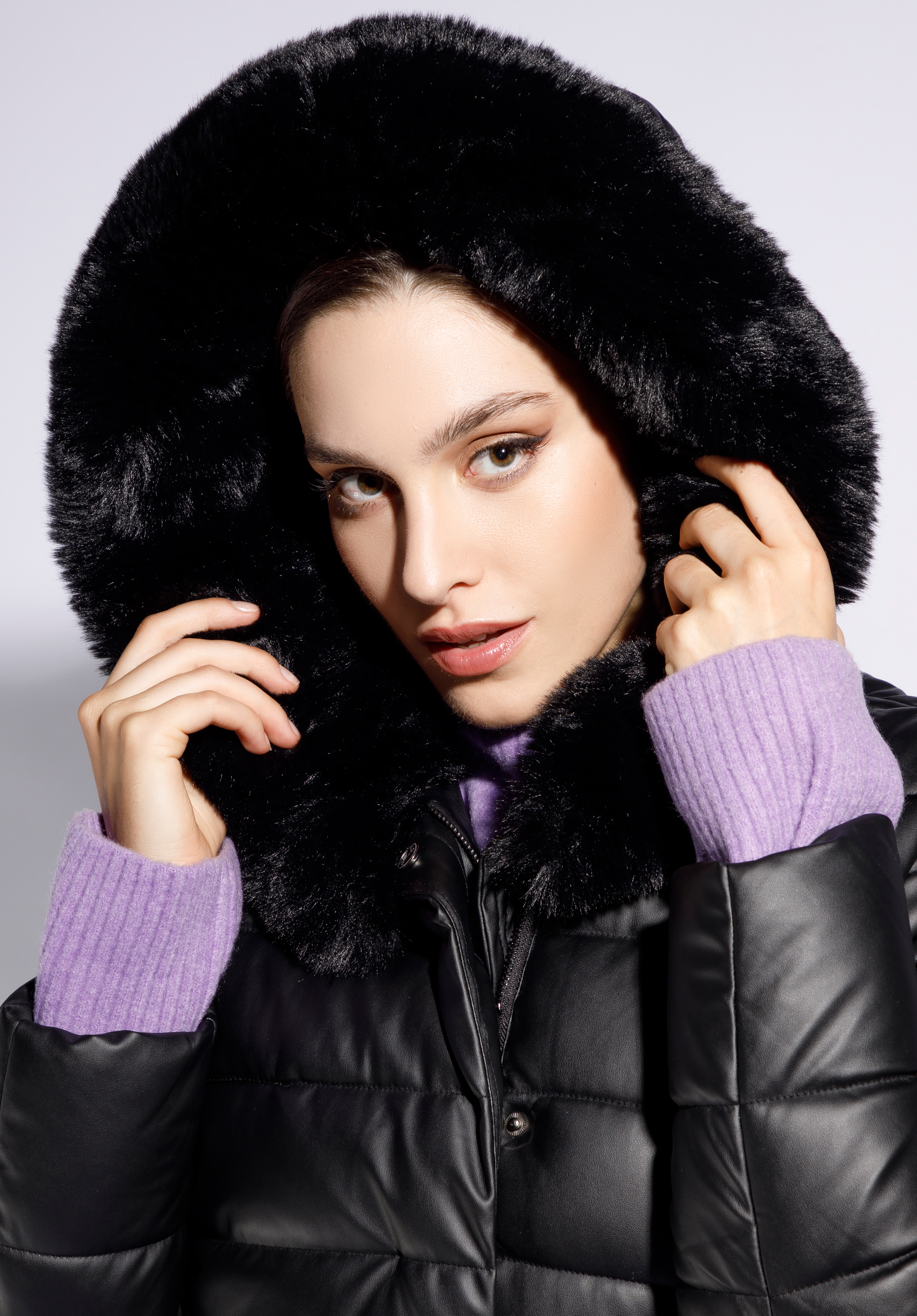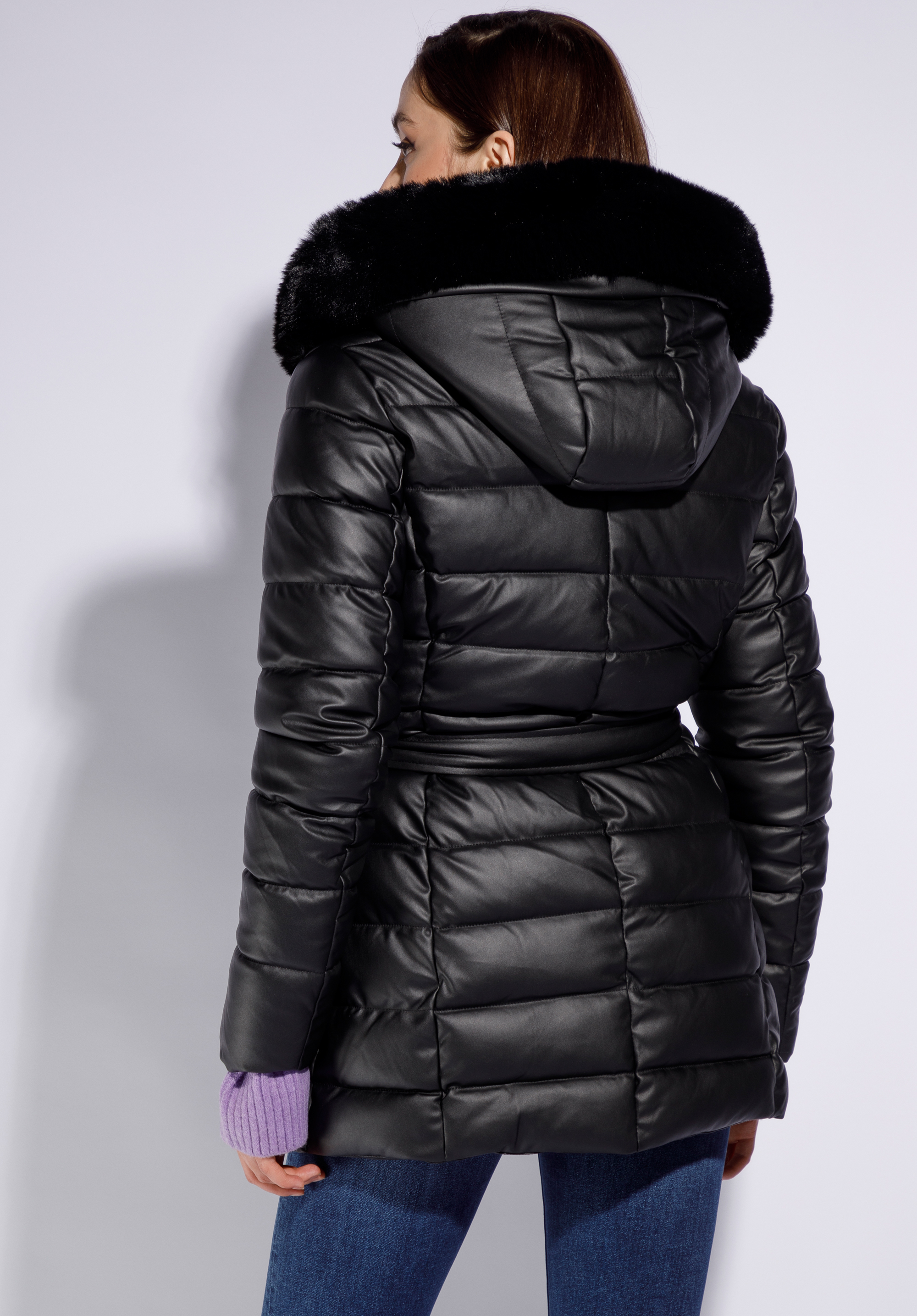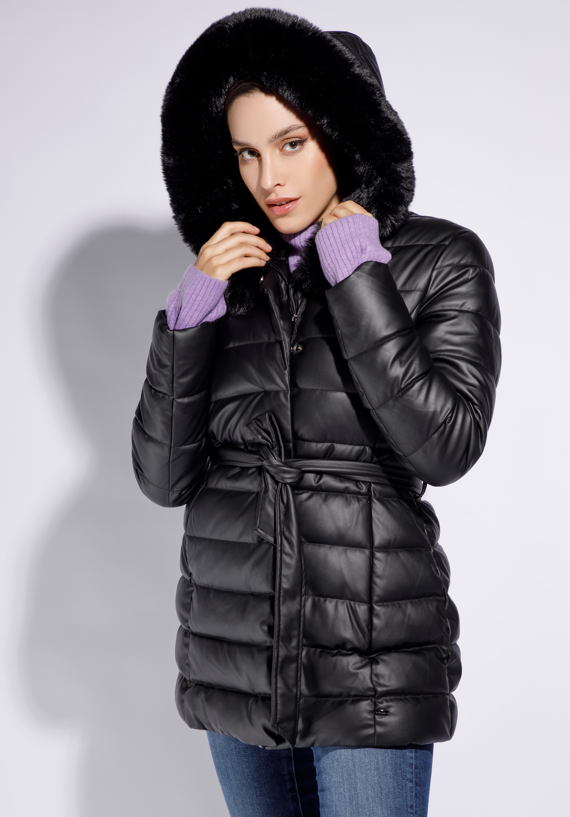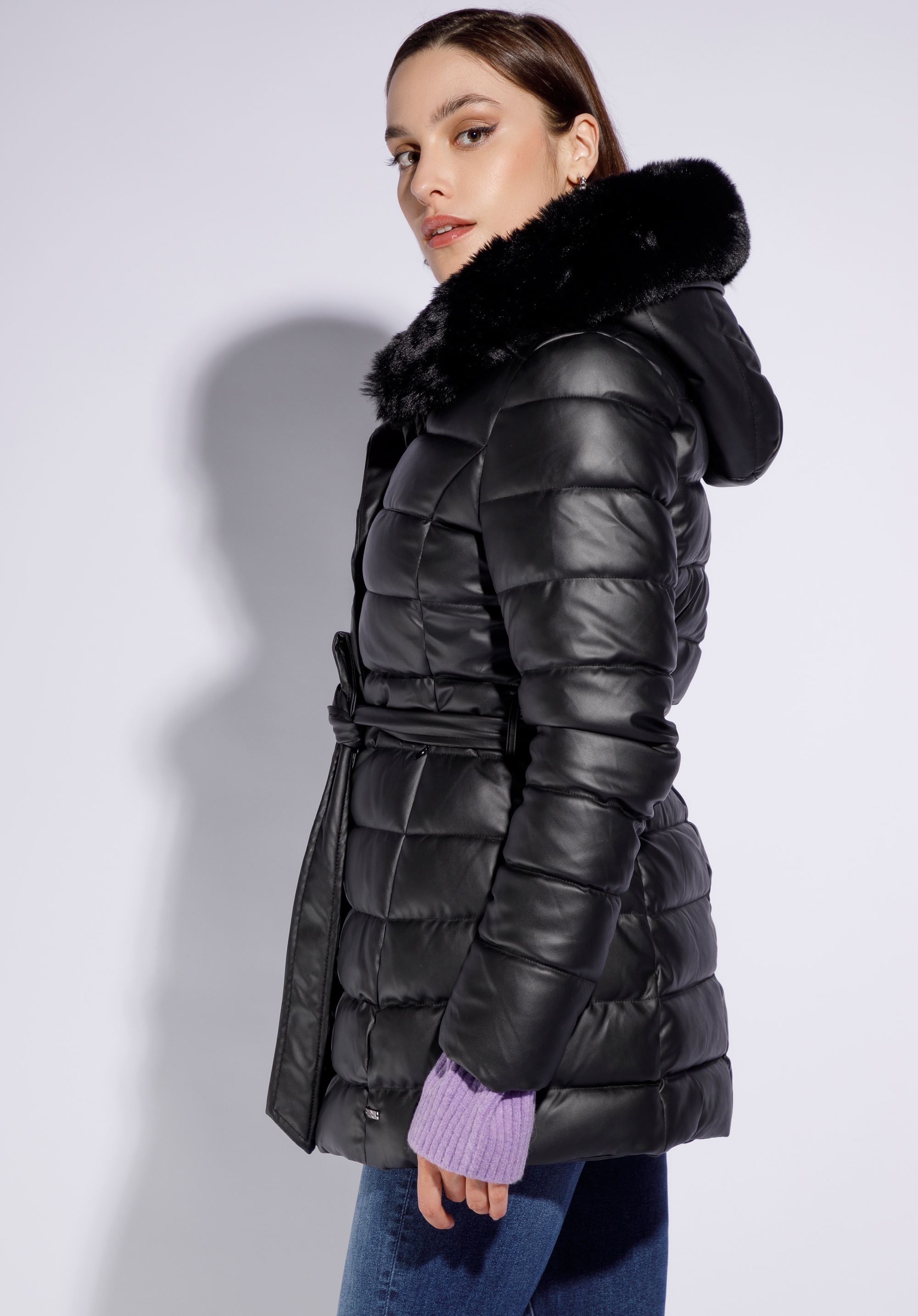 Tato elegantní bunda bude dokonalým doplňkem pro chladnější měsíce. Má klasický střih prošívané bundy. Je vyrobena z originálního materiálu: ekologické kůže, jemné a příjemné na dotek. Na bocích najdete kapsy na zip, do kterých můžete dát ruce nebo klíče. Bunda má pásek, který zvýrazňuje pas, a velkou kapuci lemovanou ekologickou kožešinou. Kožešina je umístěna nejen uvnitř kapuce, ale také po jejích okrajích. Dlouhá dámská prošívaná bunda z ekologické kůže s páskem je skvělou volbou pro každý zimní den.
