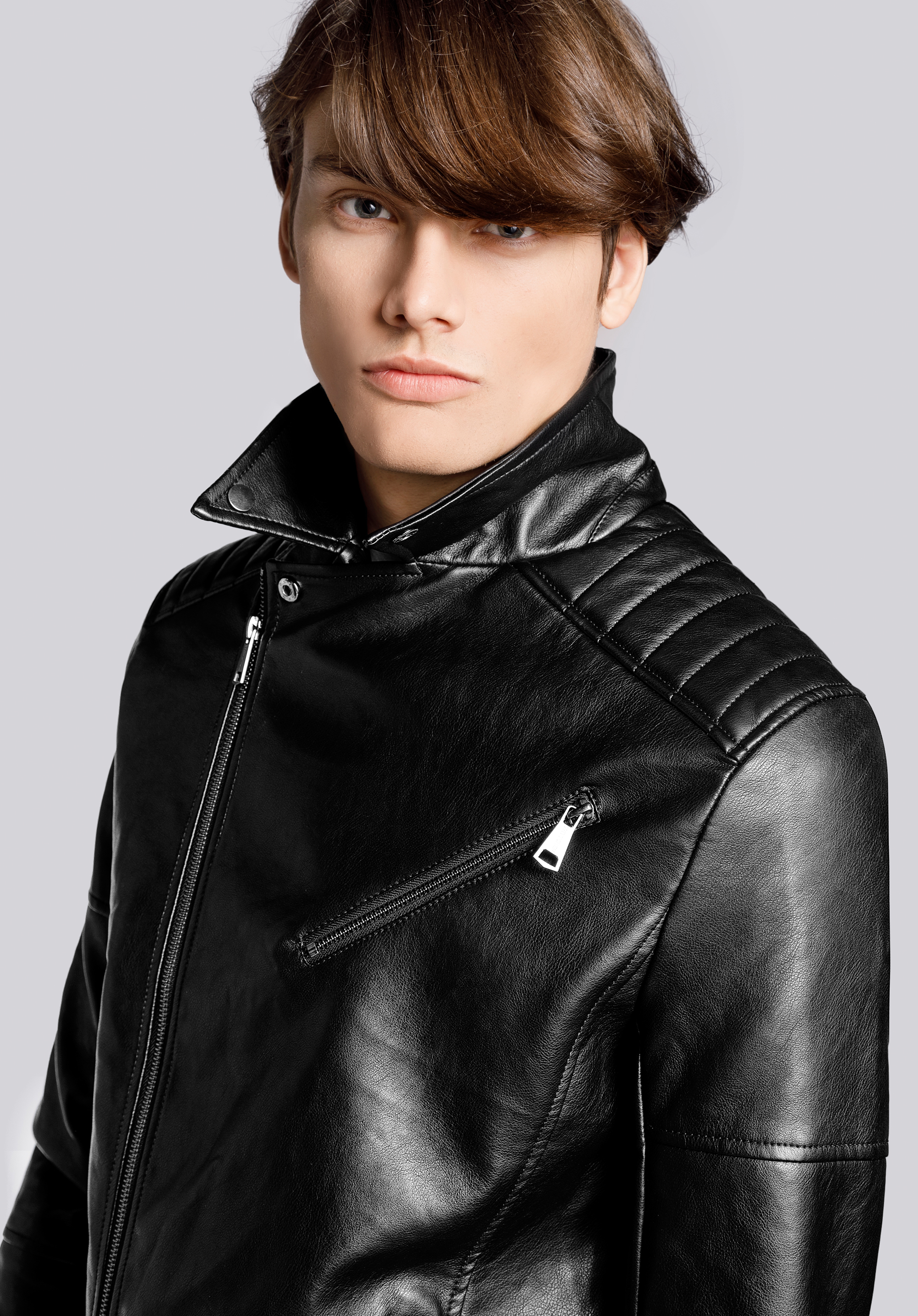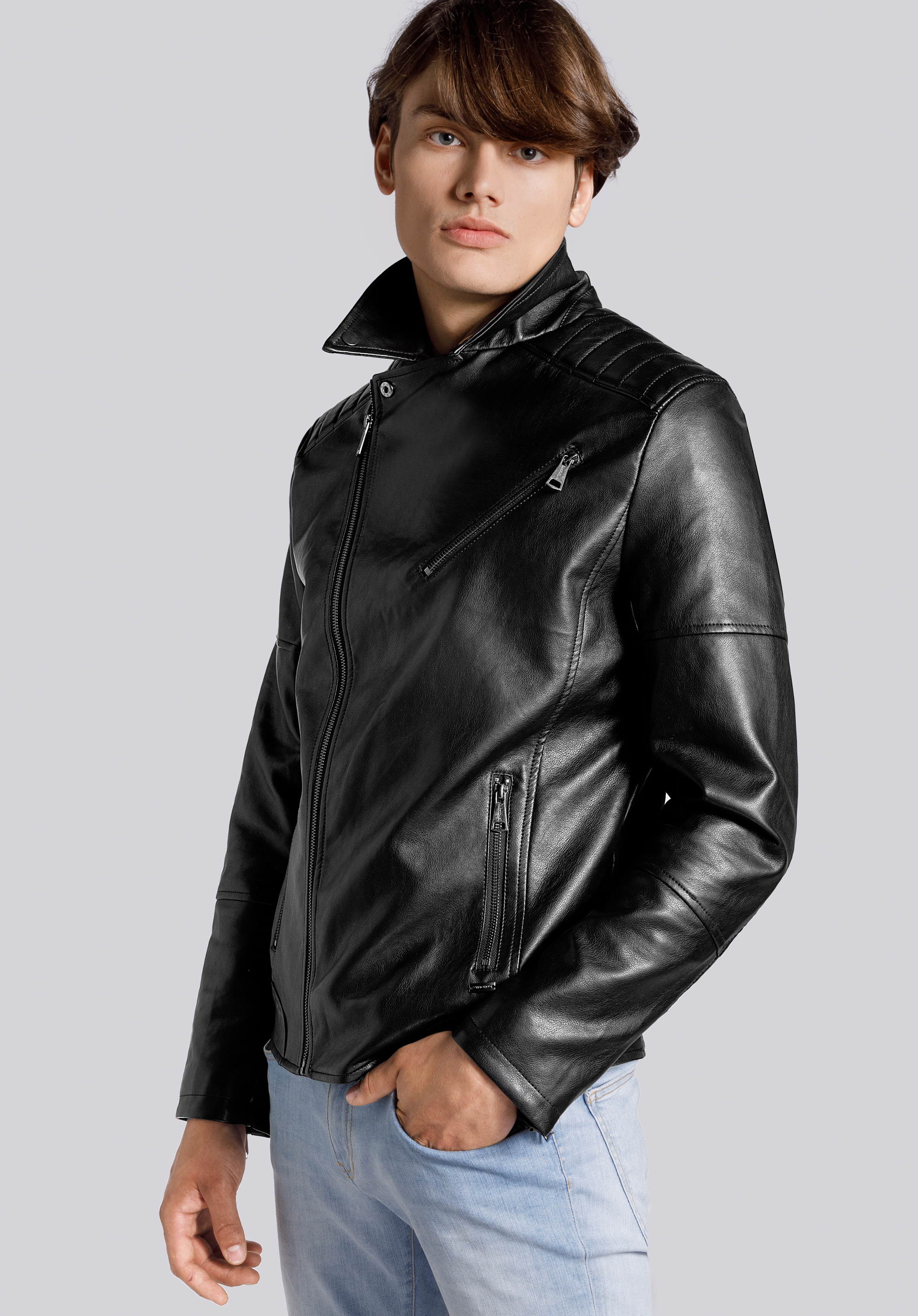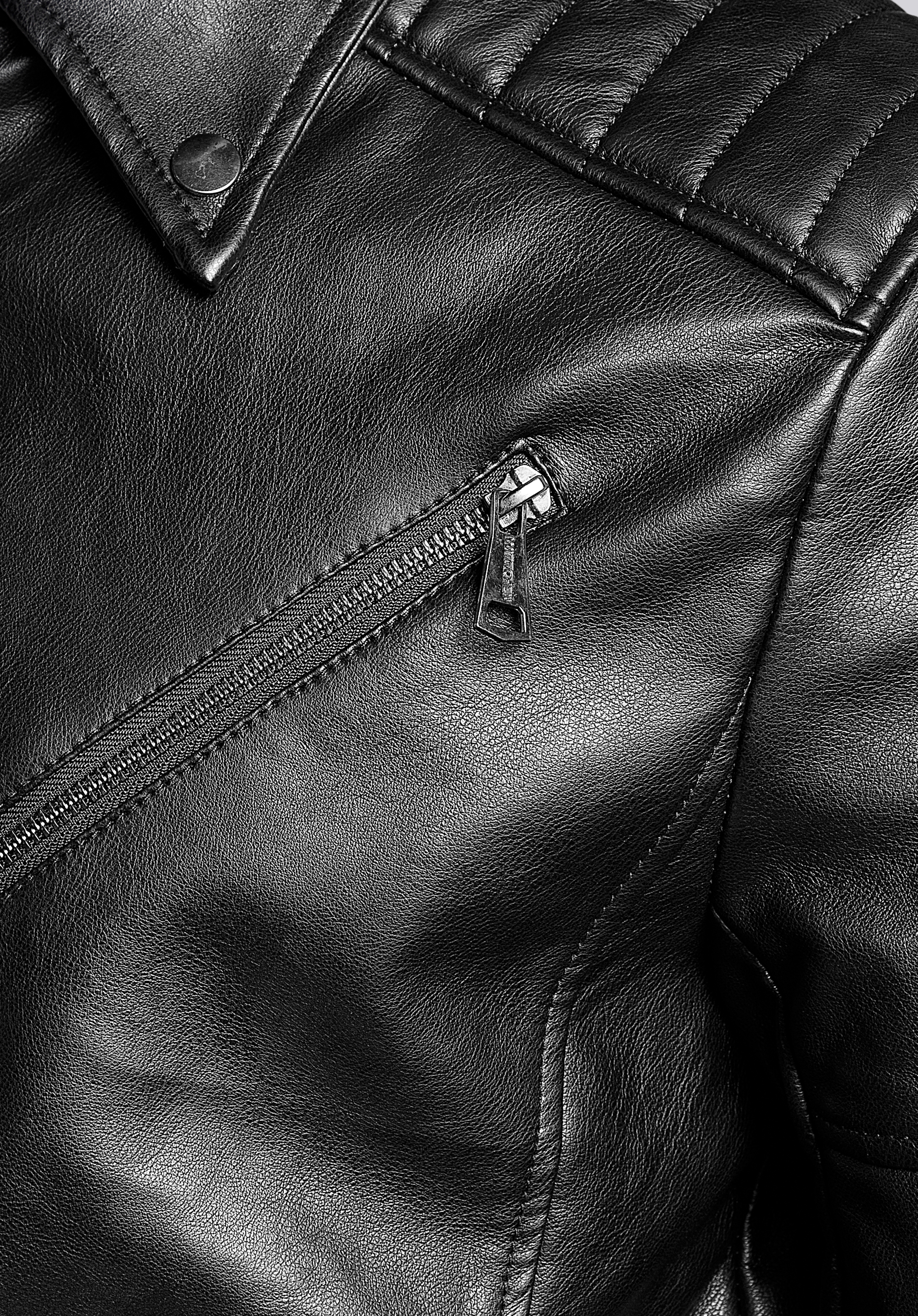 Tuto stylovou bundu osloví muže, kteří rádi dělají dobrý dojem. Siluetu podtrhují prošívané výztuhy a široký límec s ozdobnými patentkami. Bunda má tři ozdobné zipy - jeden na hrudi a dva na rukávech. Do prostorných kapes se svislým zipem uložíte peněženku nebo telefon a v chladných dnech i ruce. Tato pánská bunda je vyrobena z nejkvalitnější měkké ekologické kůže, která bude vypadat skvěle po mnoho let. Klasická pánská kožená bunda z ekologické kůže bude vypadat skvěle jak s tričkem, tak s elegantní košilí.