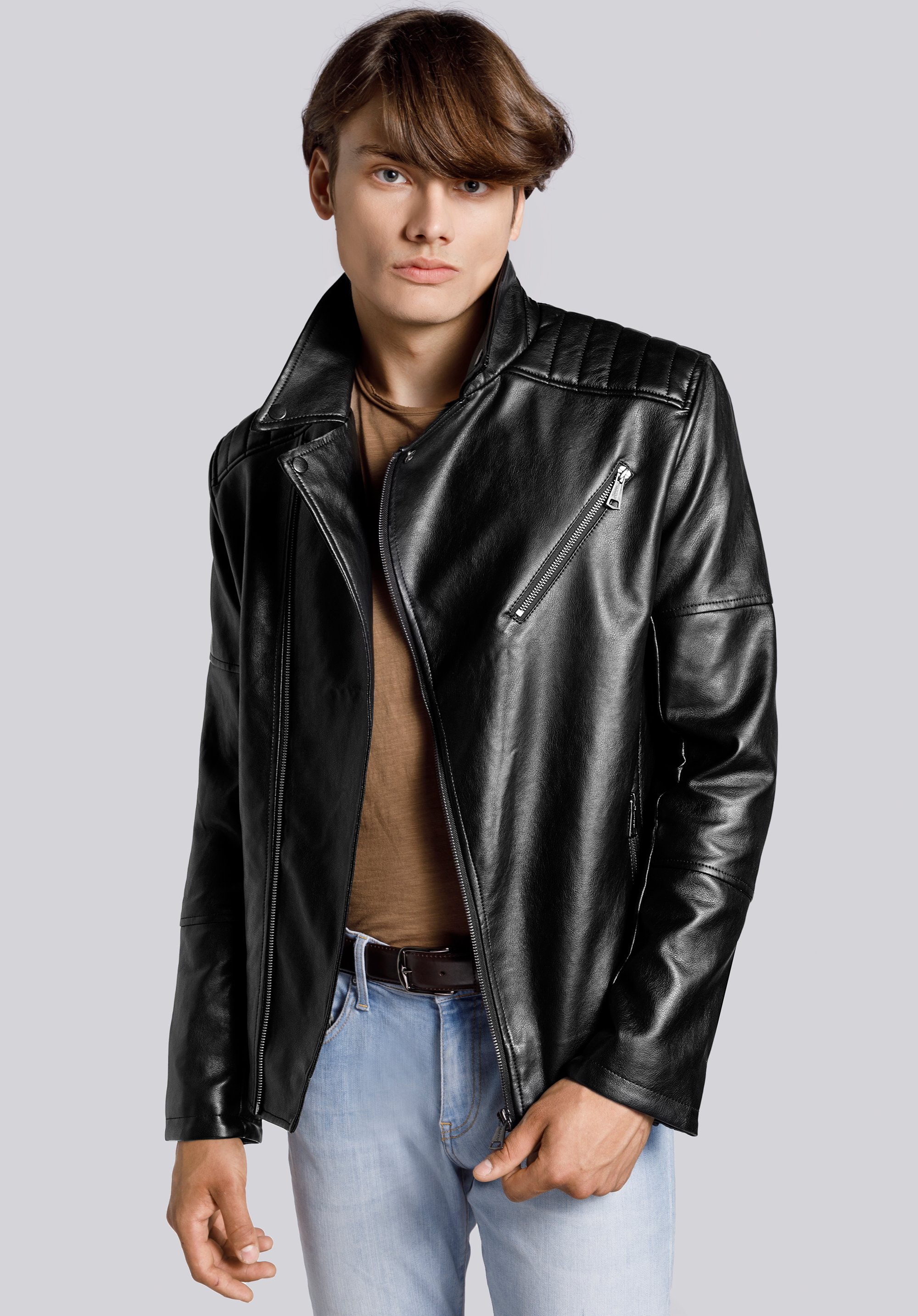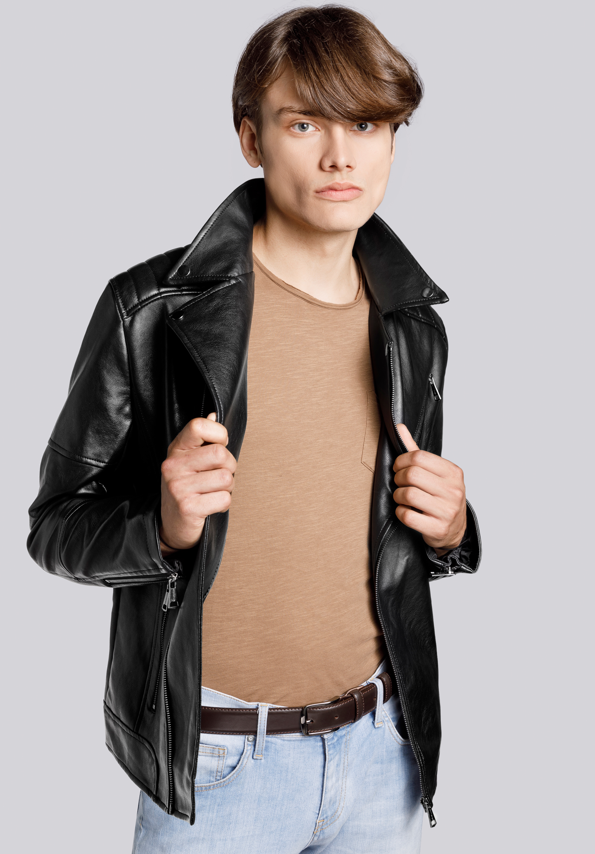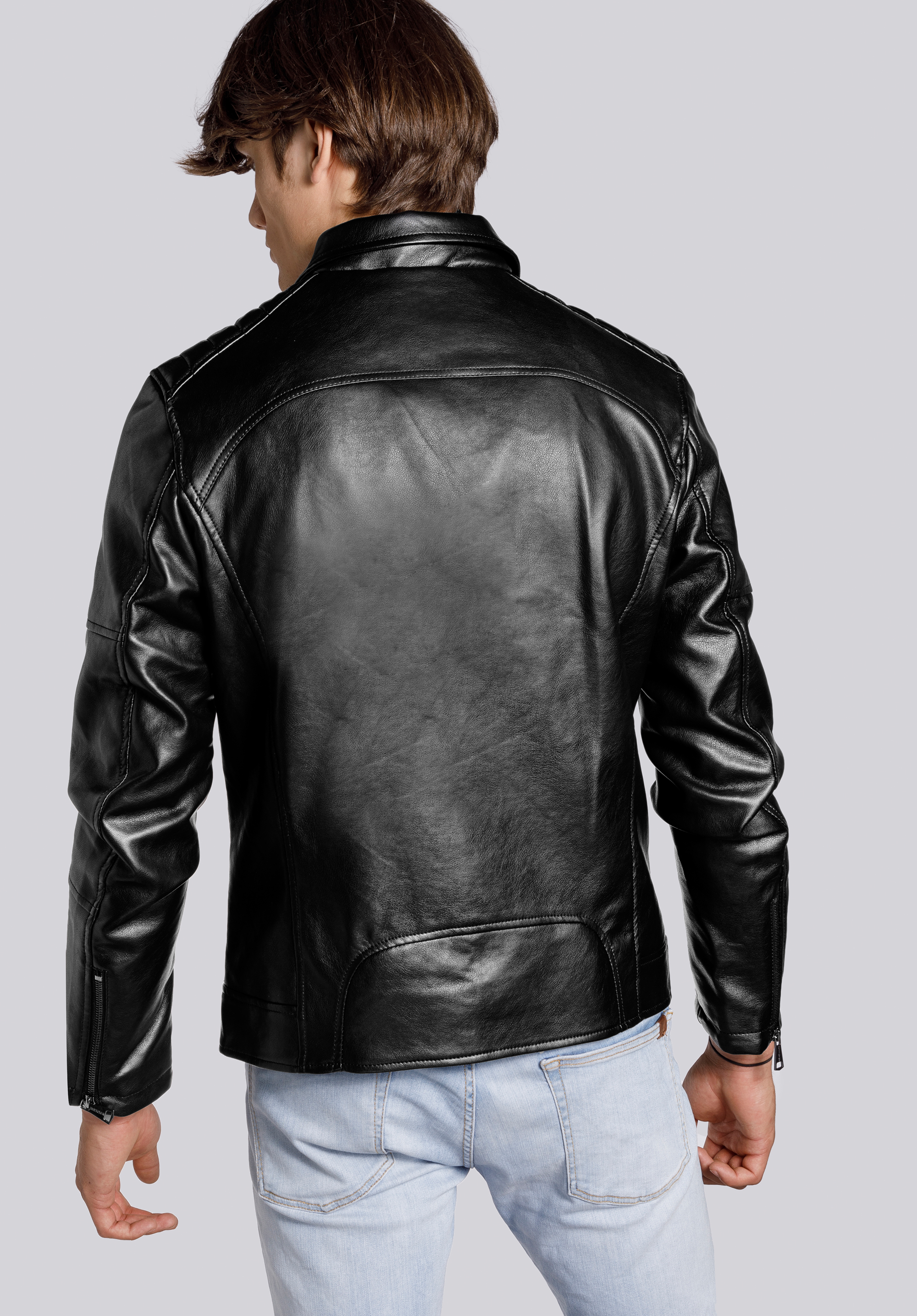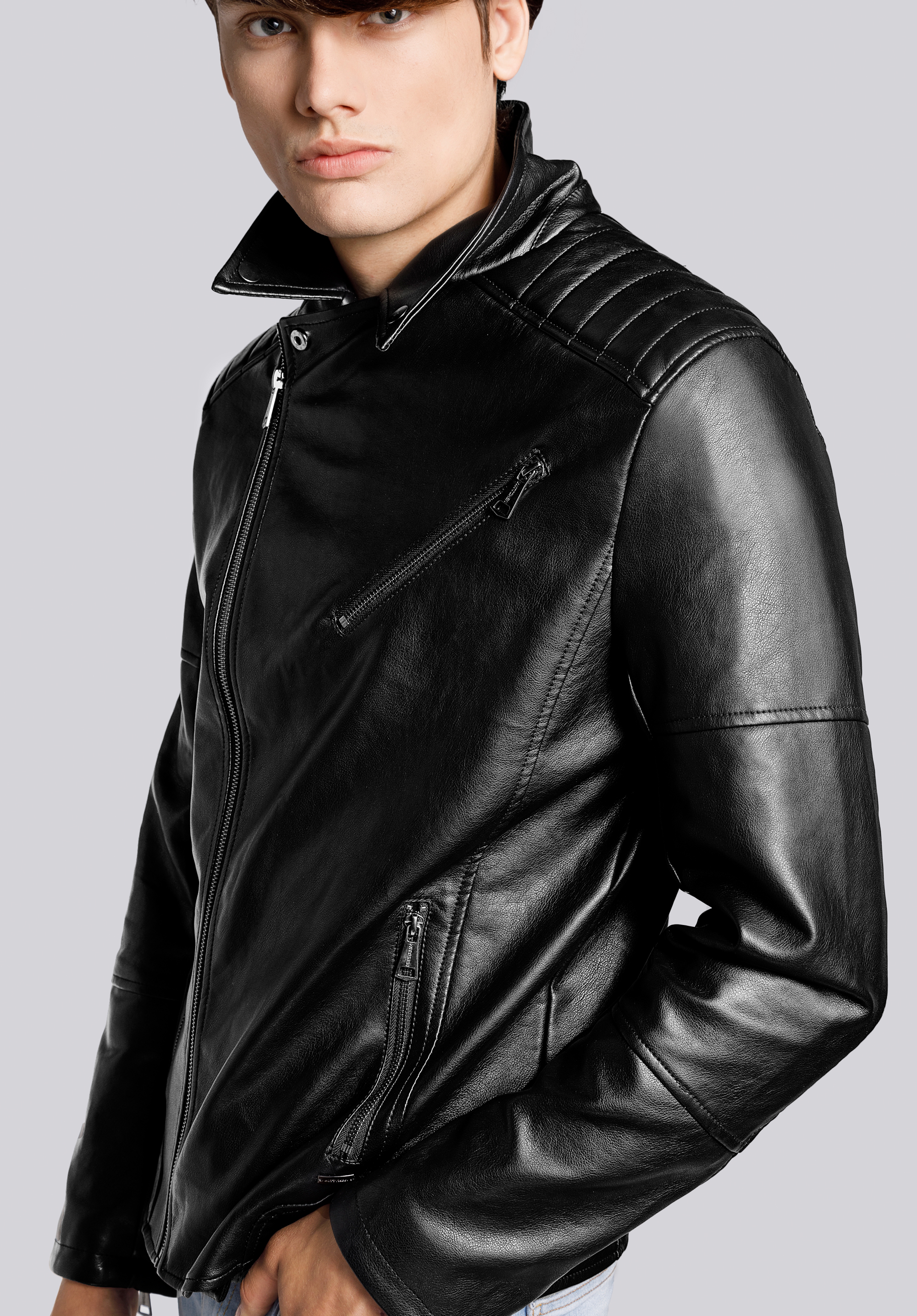 Tuto stylovou bundu osloví muže, kteří rádi dělají dobrý dojem. Siluetu podtrhují prošívané výztuhy a široký límec s ozdobnými patentkami. Bunda má tři ozdobné zipy - jeden na hrudi a dva na rukávech. Do prostorných kapes se svislým zipem uložíte peněženku nebo telefon a v chladných dnech i ruce. Tato pánská bunda je vyrobena z nejkvalitnější měkké ekologické kůže, která bude vypadat skvěle po mnoho let. Klasická pánská kožená bunda z ekologické kůže bude vypadat skvěle jak s tričkem, tak s elegantní košilí.