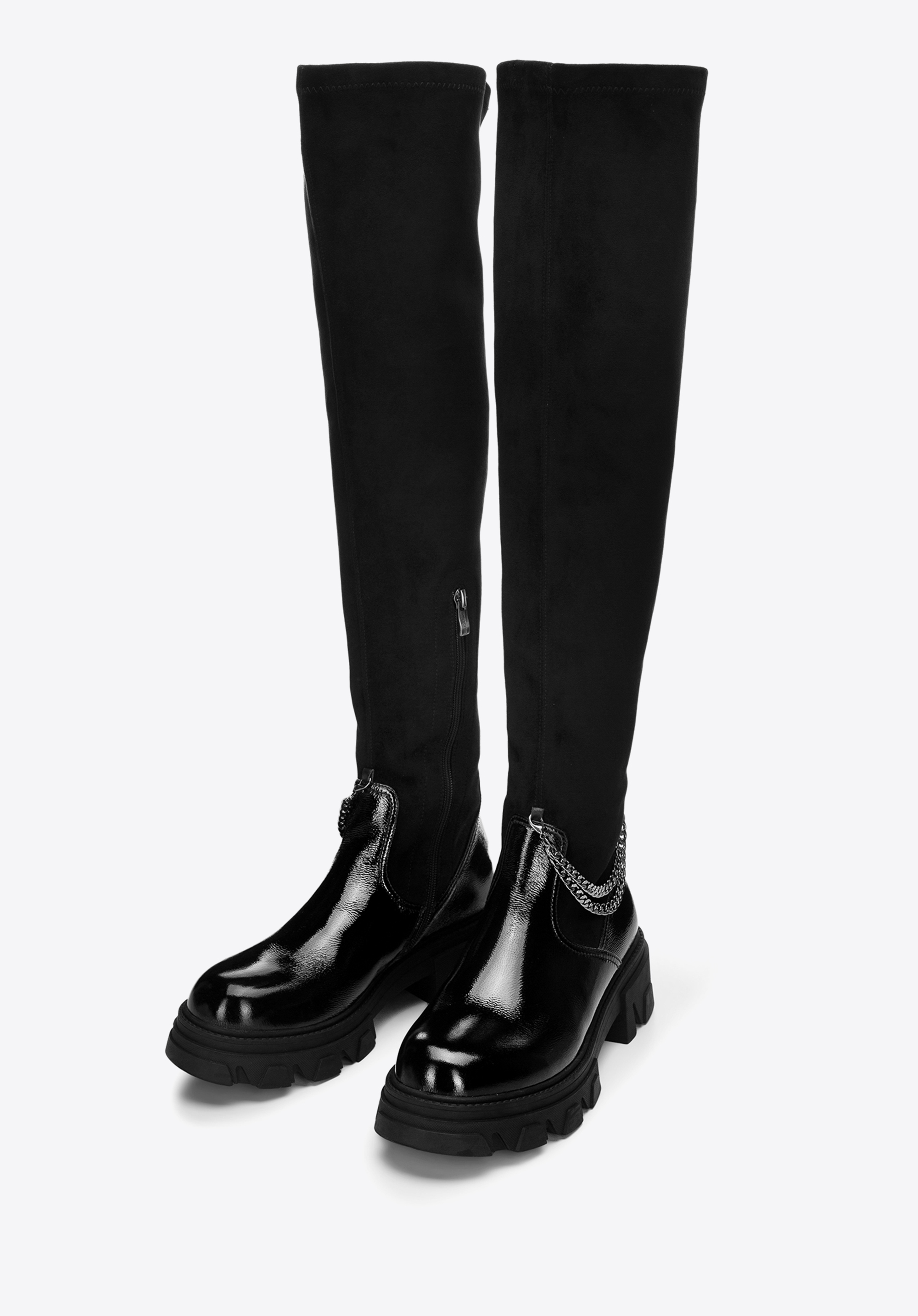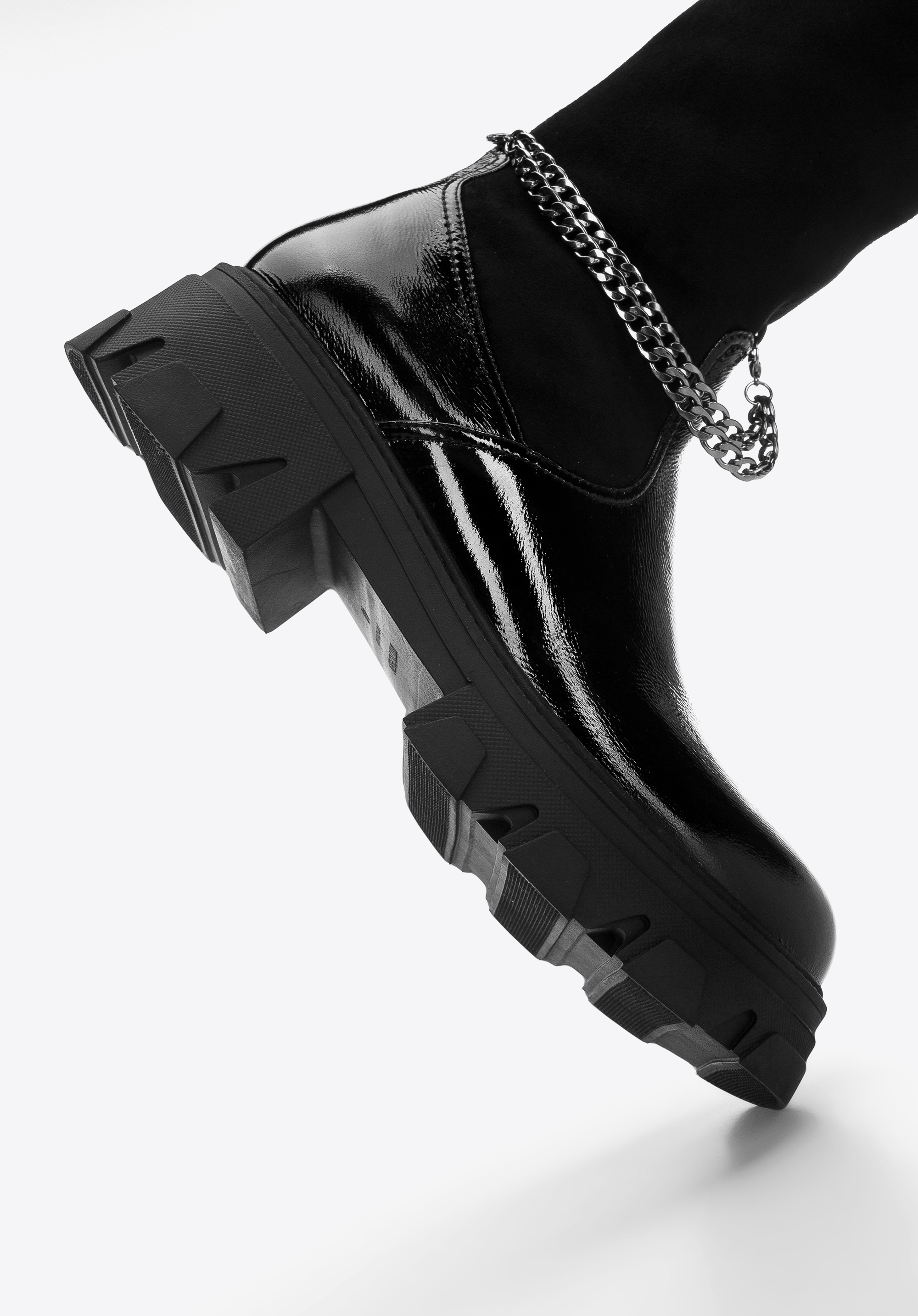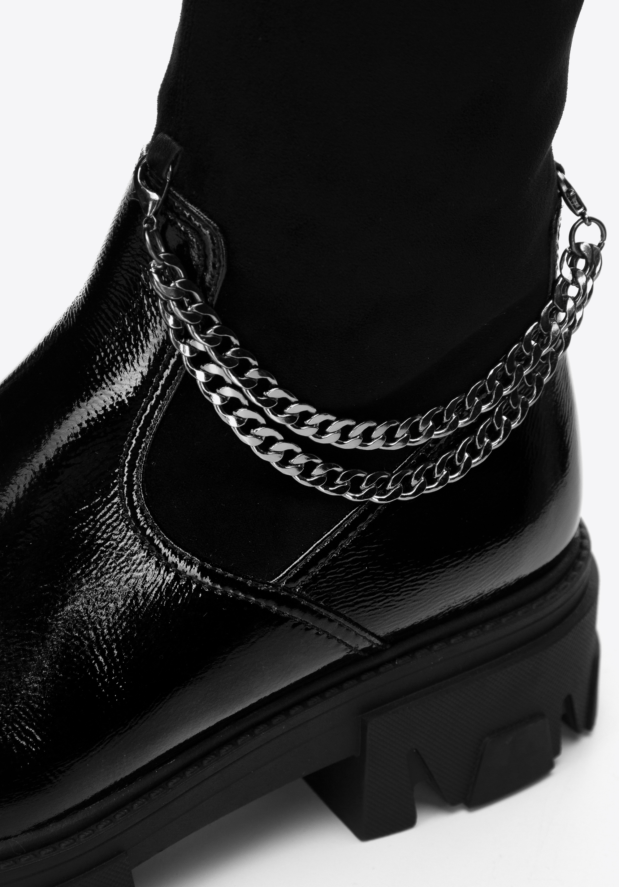 Tyto dámské boty dodají lesk každému obleku. Přední strana je vyrobena z vysoce kvalitní lakované kůže. Ozdobný, odnímatelný řetízek dodává jim jedinečný charakter. Vysoký svršek z pružné ekologické kůže pěkně sedne na nohu a díky vnitřnímu zipu snadno se nazouvají. Silná, gumová podrážka na platformě poskytne dobrou přilnavost téměř za všech podmínek a přidá vám pár centimetrů na výšce. Noste je s oblíbenou bundou nebo elegantním kabátem – jsou univerzální. Dámské lakované boty s řetízkem jsou skvělou volbou pro každou moderní ženu.