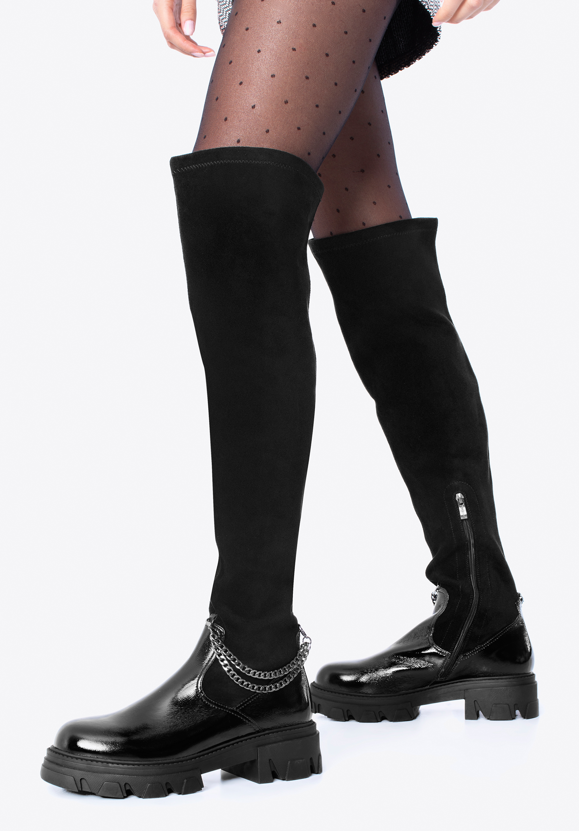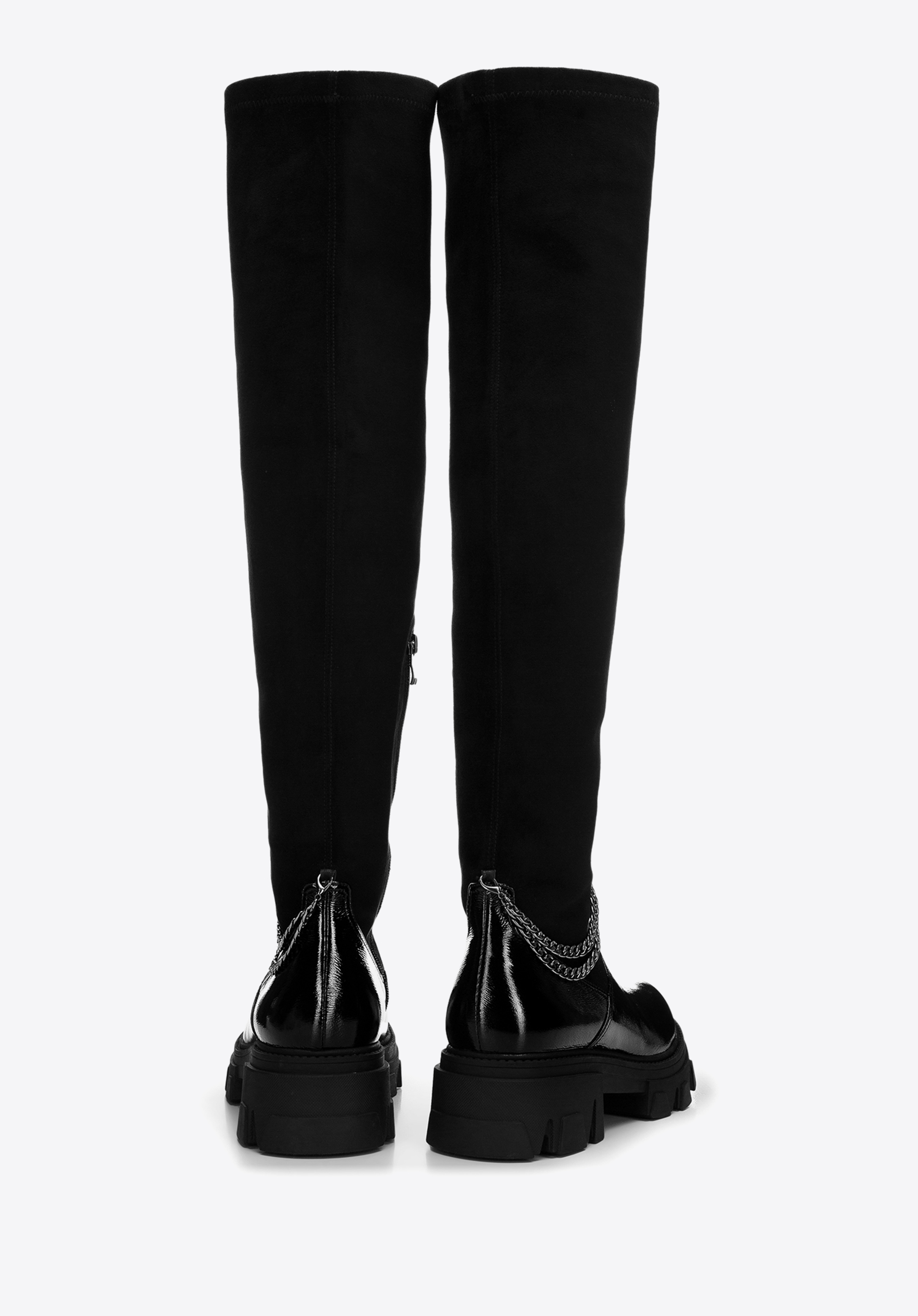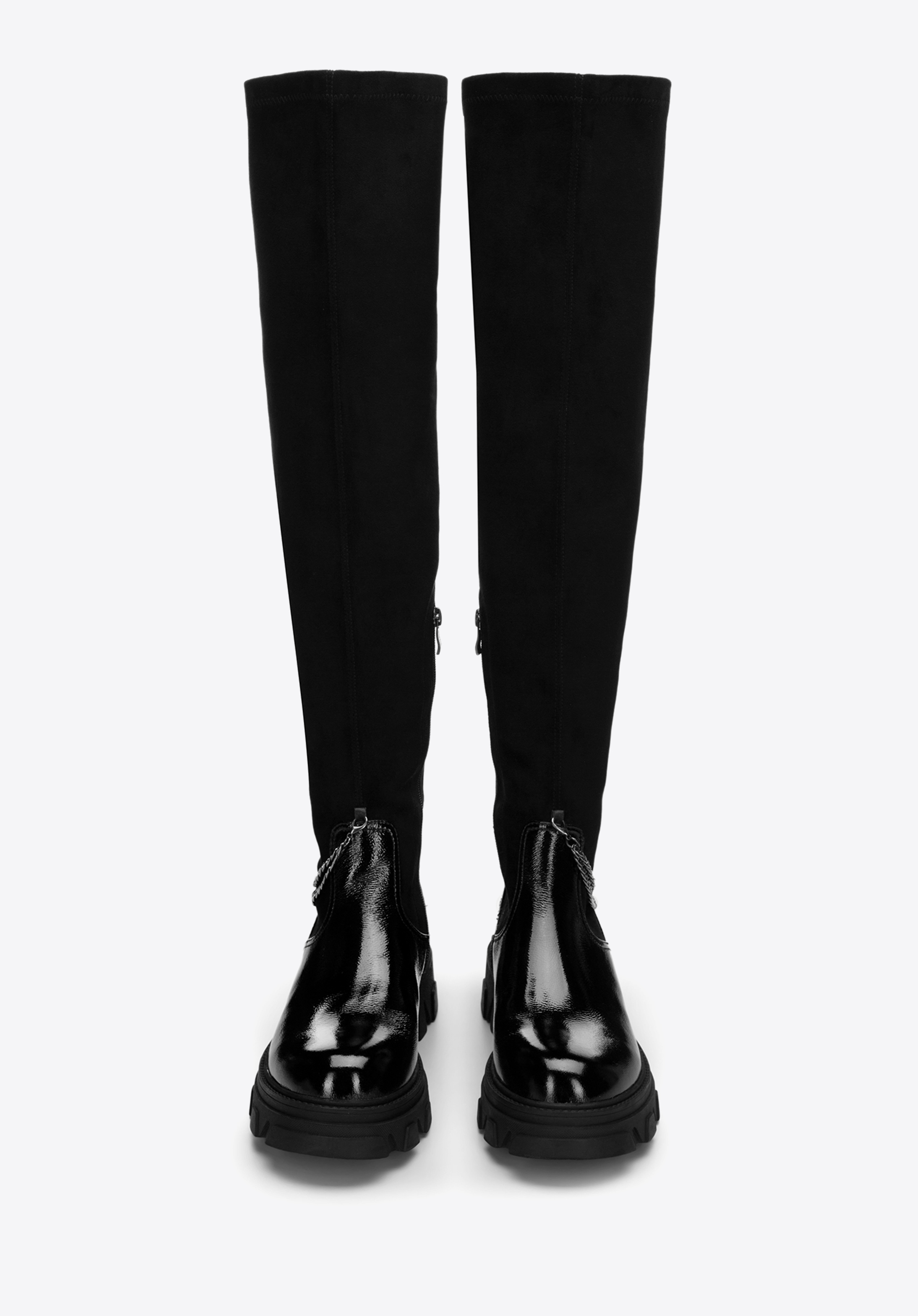 Tyto dámské boty dodají lesk každému obleku. Přední strana je vyrobena z vysoce kvalitní lakované kůže. Ozdobný, odnímatelný řetízek dodává jim jedinečný charakter. Vysoký svršek z pružné ekologické kůže pěkně sedne na nohu a díky vnitřnímu zipu snadno se nazouvají. Silná, gumová podrážka na platformě poskytne dobrou přilnavost téměř za všech podmínek a přidá vám pár centimetrů na výšce. Noste je s oblíbenou bundou nebo elegantním kabátem – jsou univerzální. Dámské lakované boty s řetízkem jsou skvělou volbou pro každou moderní ženu.