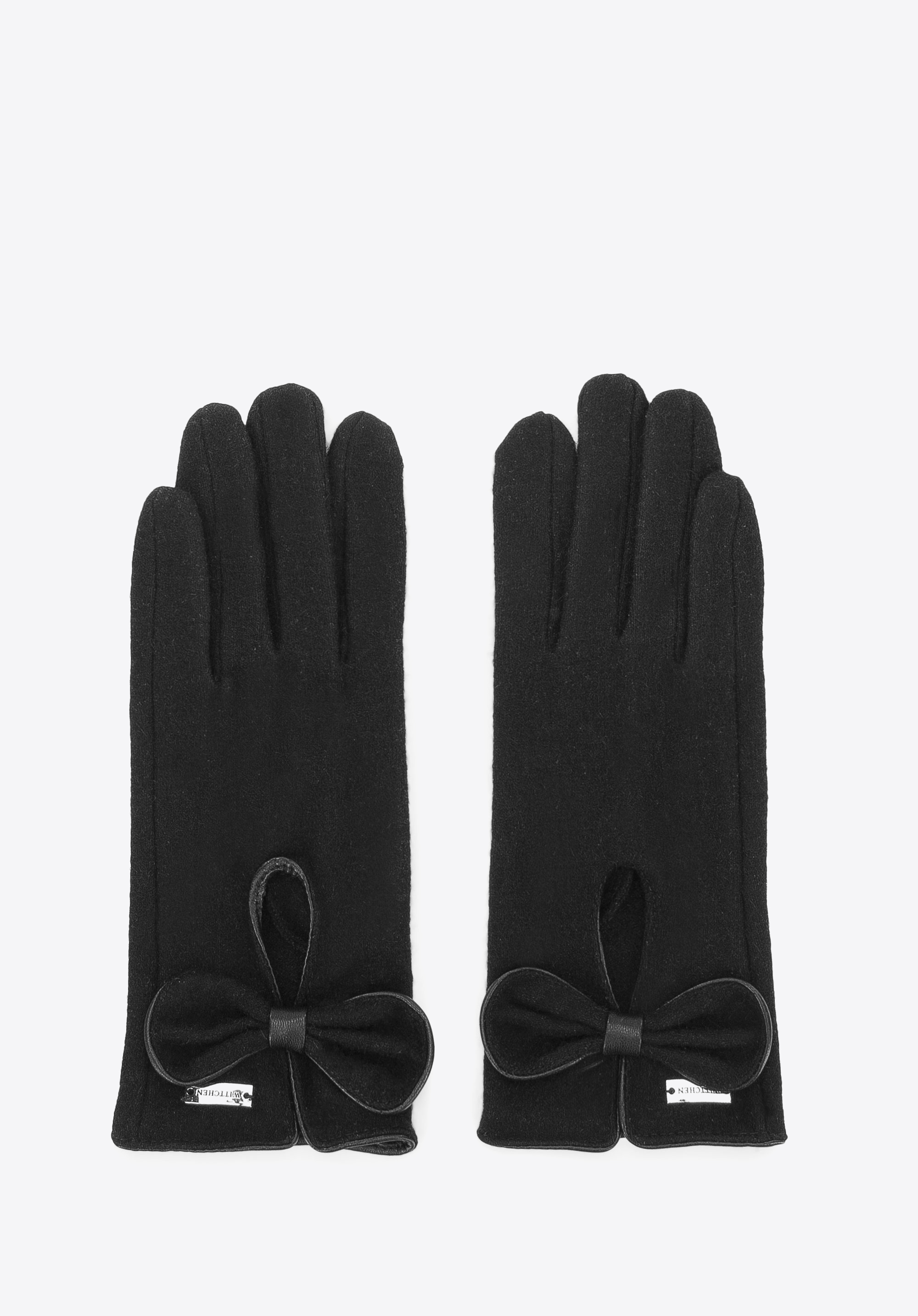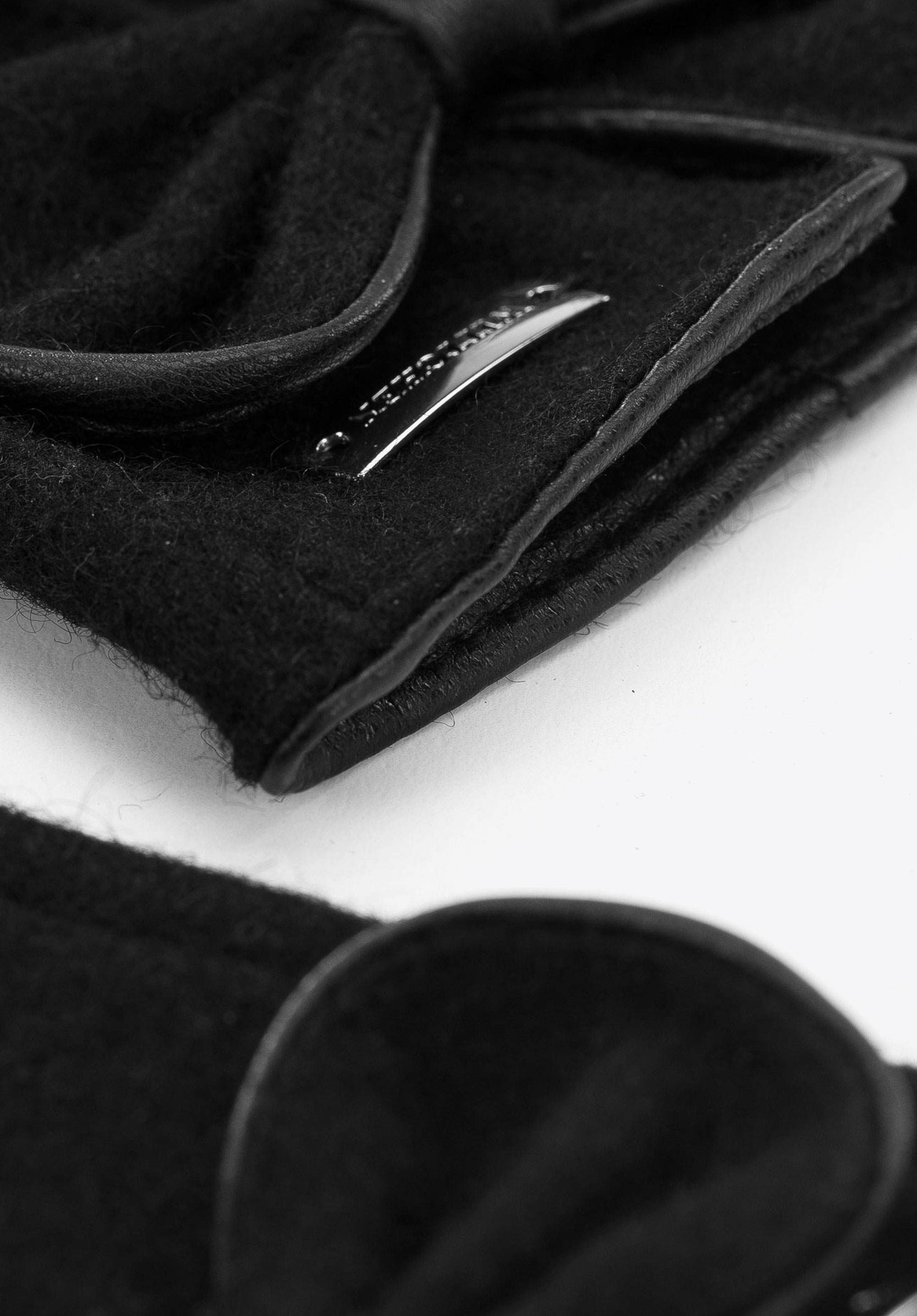 Tyto dámské rukavice jsou jedinečným doplňkem pro chladnější dny. Originální střih a ozdobná mašle dodávají jim charakter. Jsou vyrobeny ze 70% vlny, takže vašim rukám poskytnou pohodlí a teplo. Speciální výšivka ve tvaru květiny pod ukazováčkem umožňuje použití dotykových obrazovek bez sejmutí rukavice. Tento model je poutavý a bude vypadat skvěle i s kontrastními barvami kabátů. Dámské rukavice s výřezem a velkou mašlí budou originálním doplňkem vašeho zimního šatníku.