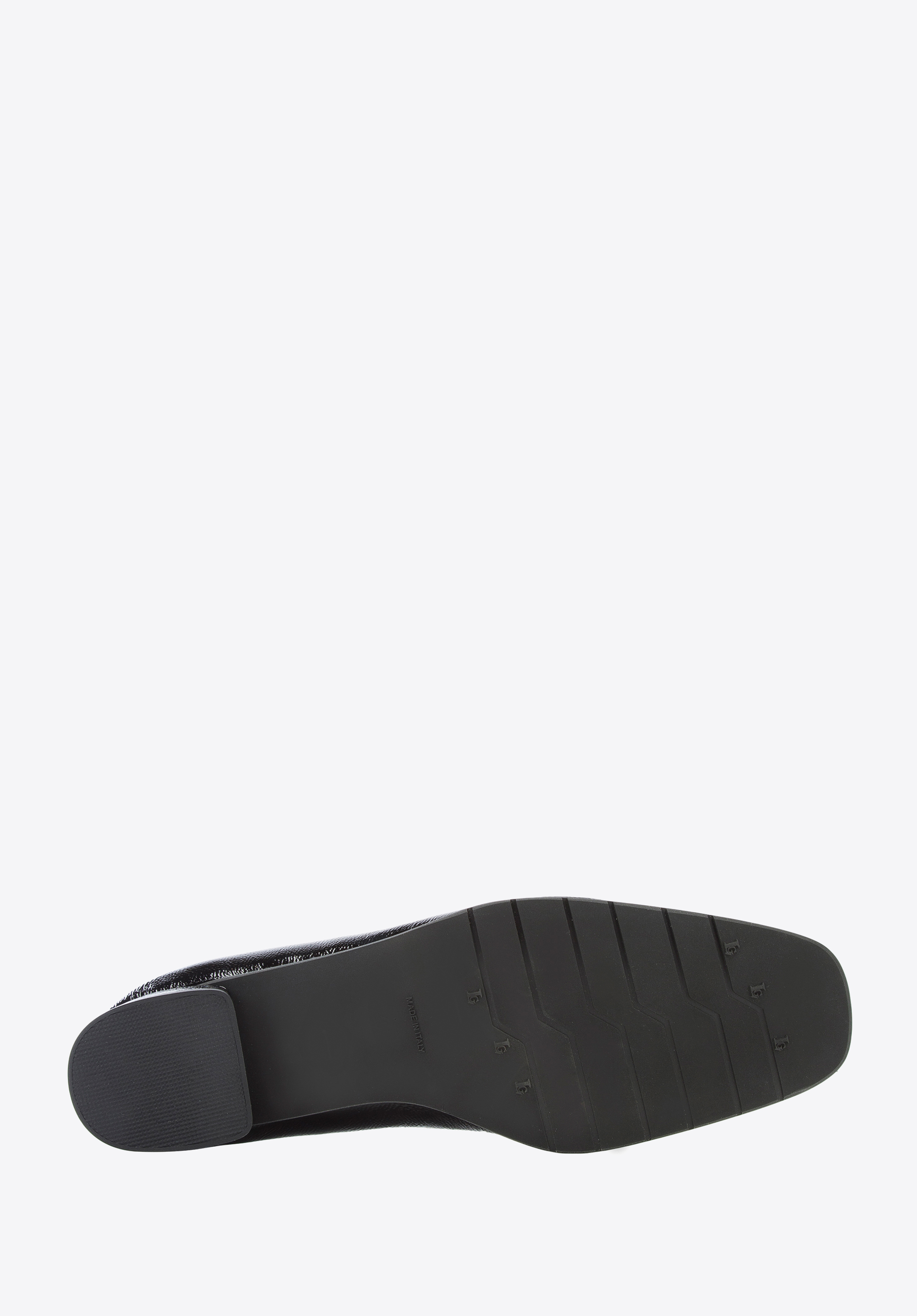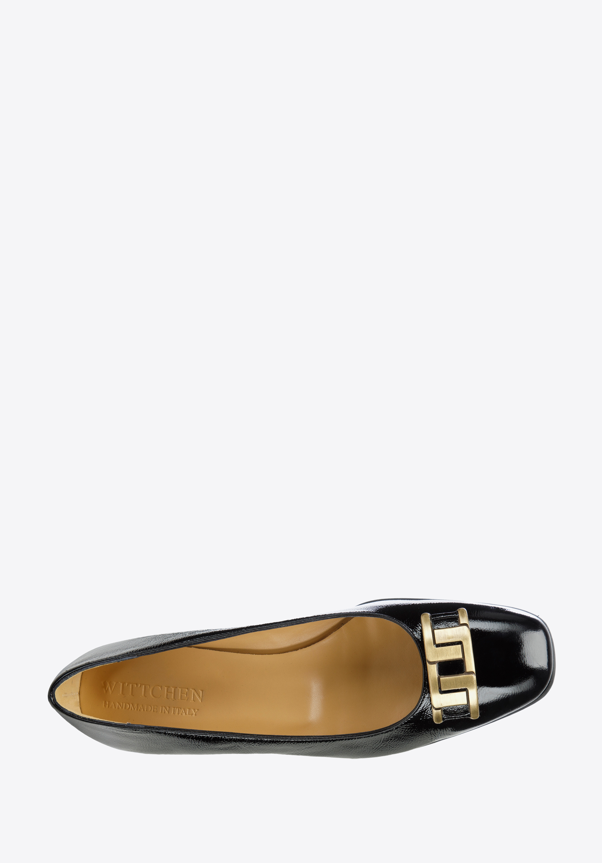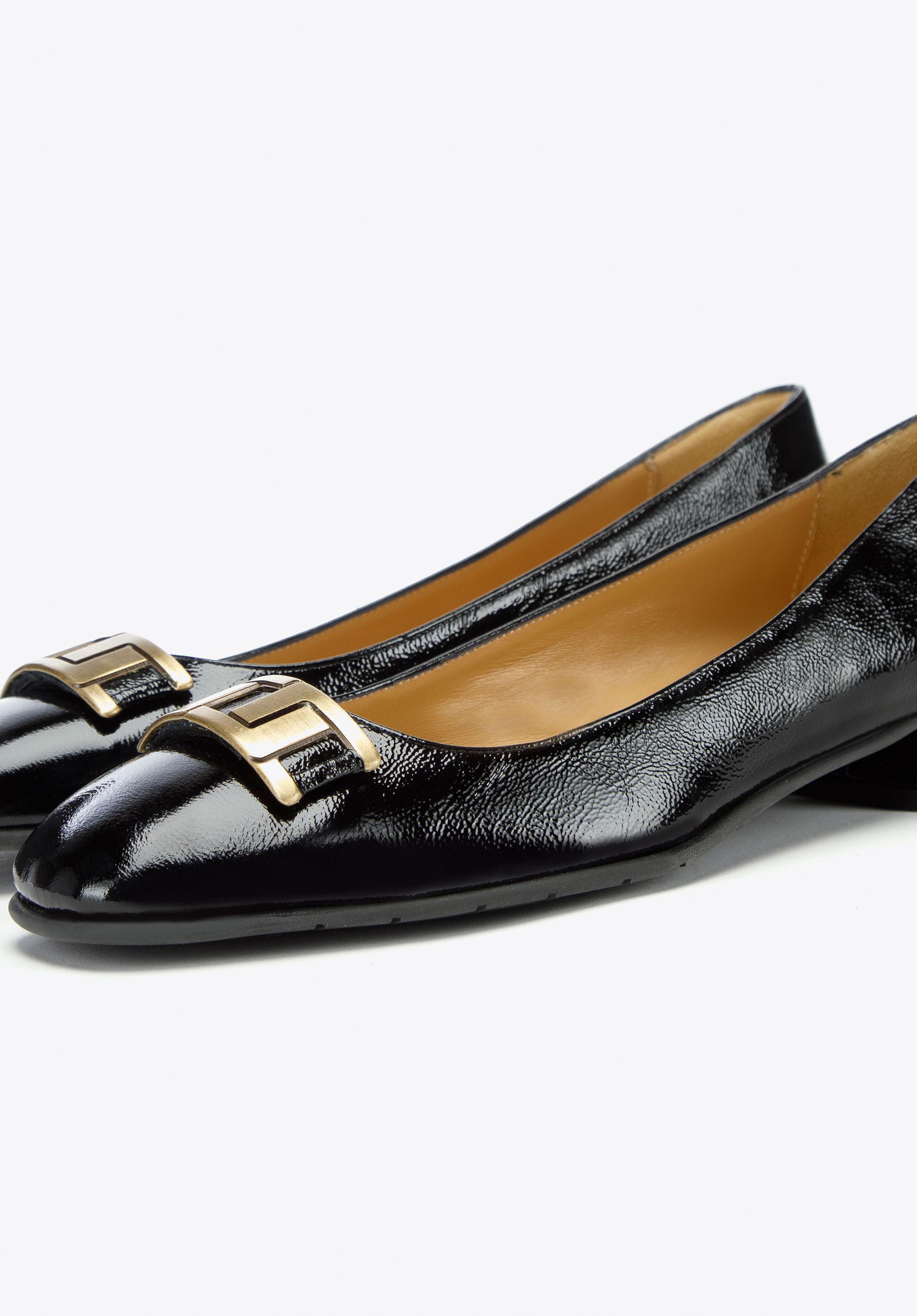 Tyto elegantní lodičky můžete nosit každý den. Pohodlný nízký podpatek a kožená stélka zajistí pohodlnou chůzi po mnoho hodin. Boty byly vyrobeny v Itálii z vysoce kvalitní lakované kůže. Geometrické zdobení na přední straně dodává celému vzhledu eleganci. Noste je k malým černým šatům a dodejte jim lesk - stylově doplní váš oblek za každé situace. Klasické lakované lodičky s geometrickým zdobením budou skvělou volbou pro každou ženu, která má ráda pohodlné a stylové doplňky.