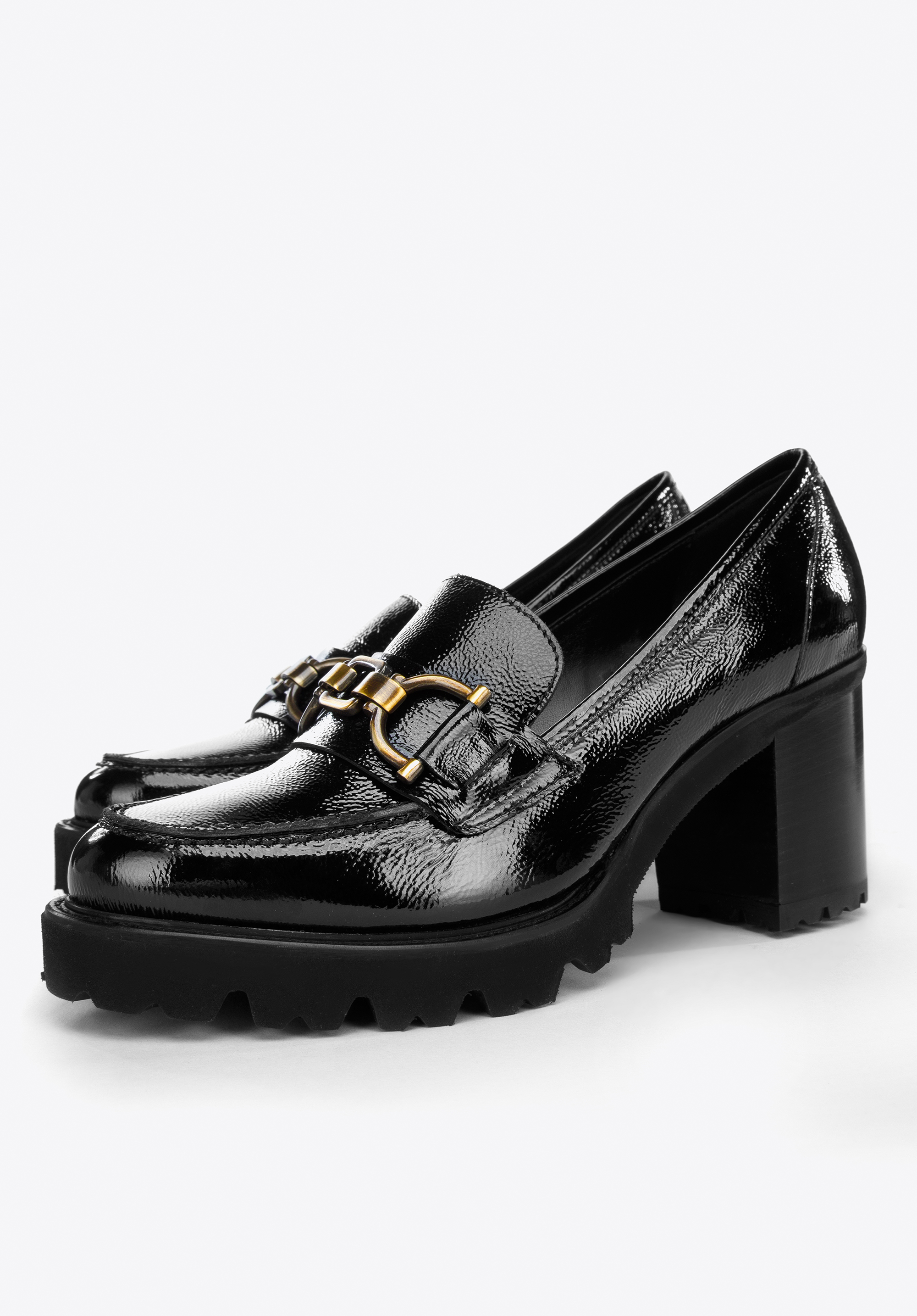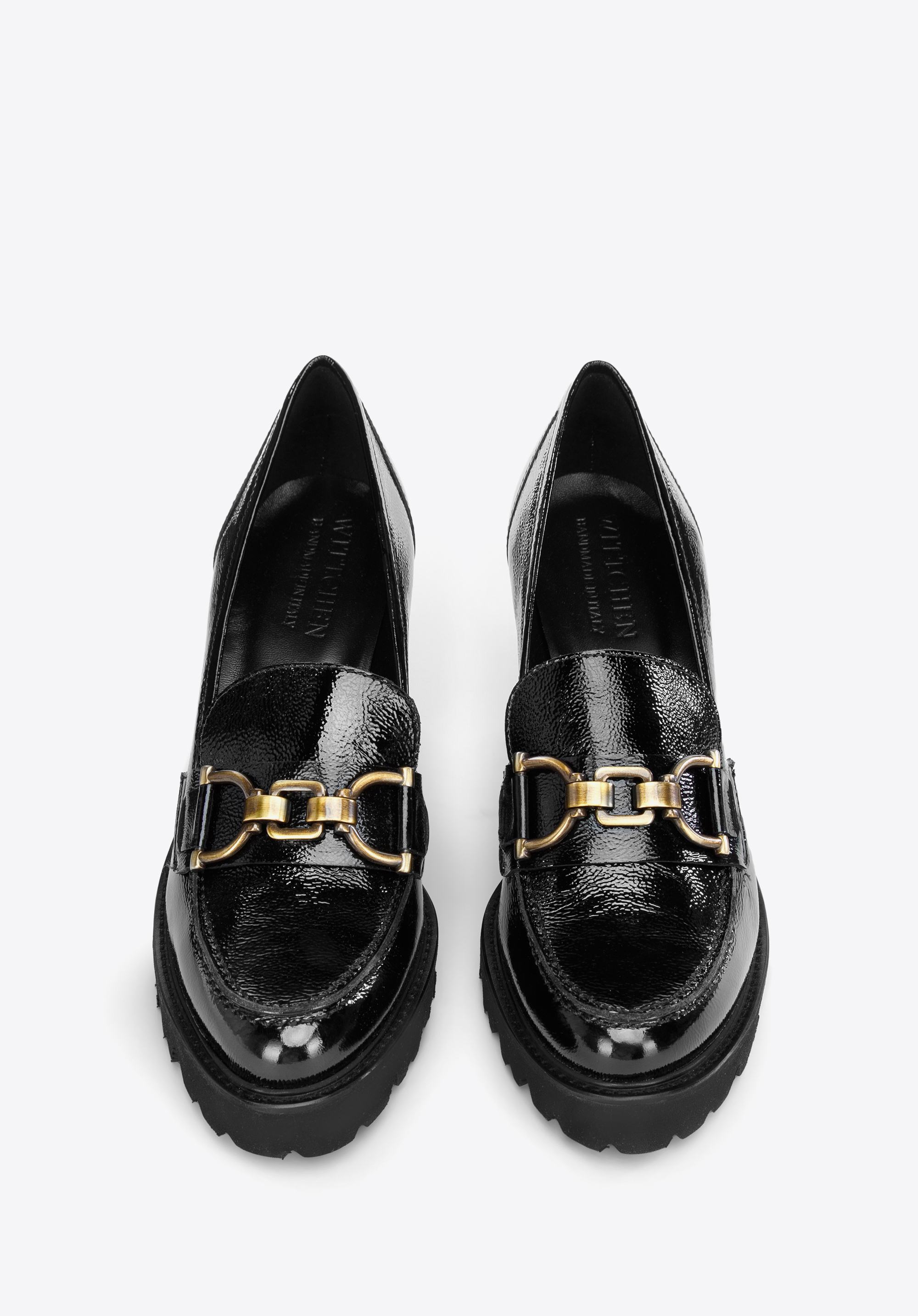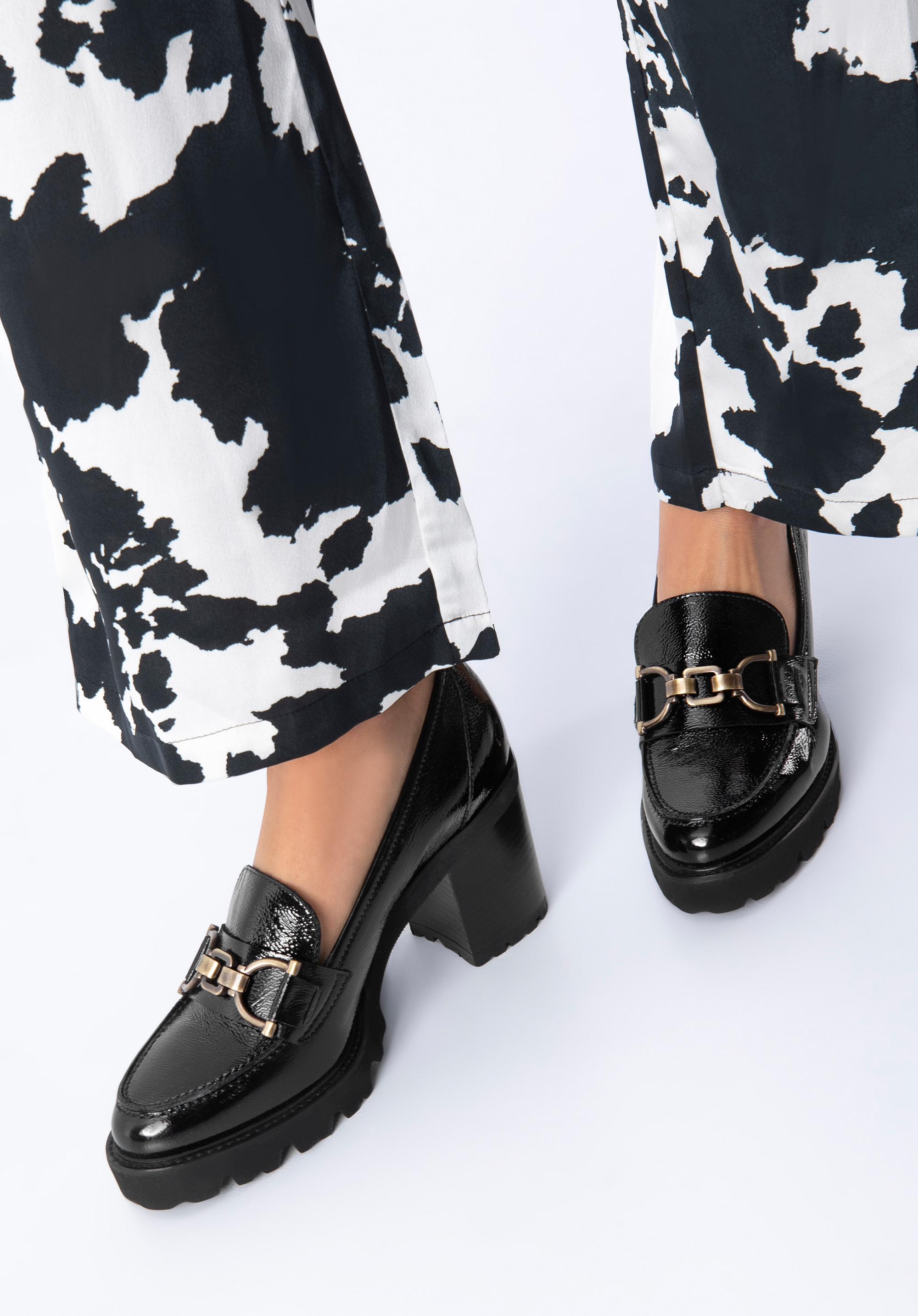 Do šatníku každé ženy patří elegantní a pohodlné boty na vysokém podpatku. Tento model je vyroben z vysoce kvalitní lakované kůže. Zdobí je spona z broušeného kovu. Silný, tvarovaný podpatek je doplněn platformou, která zajišťuje dobrou přilnavost a pohodlnou chůzi po mnoho hodin. Lakované boty se sponou doplní elegantní dámský oblek a dodají eleganci každému obleku.
