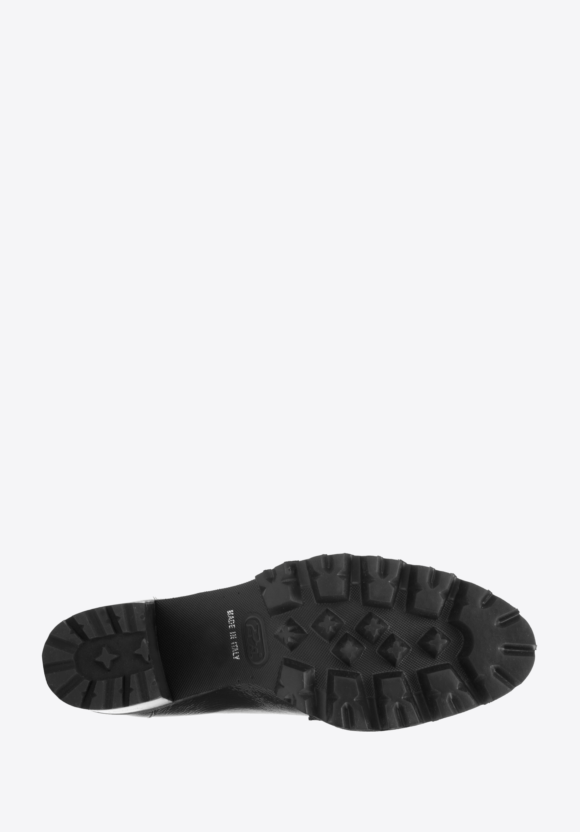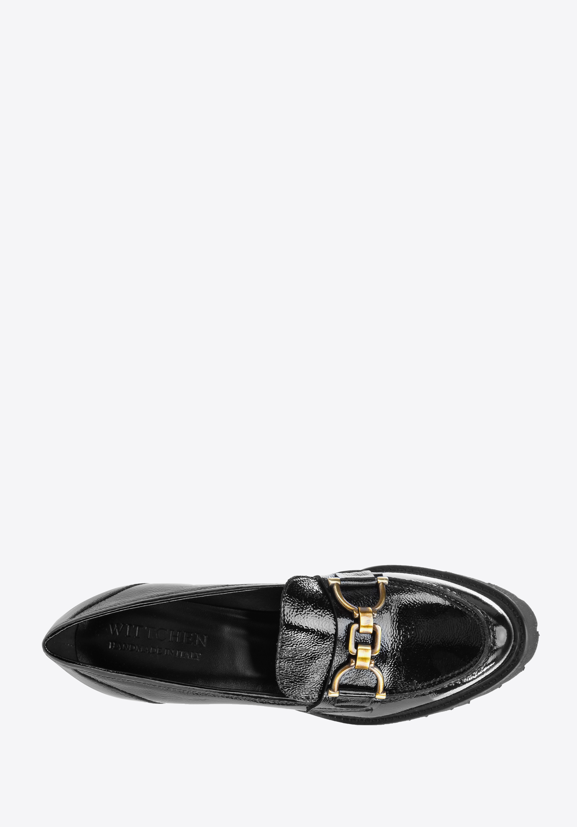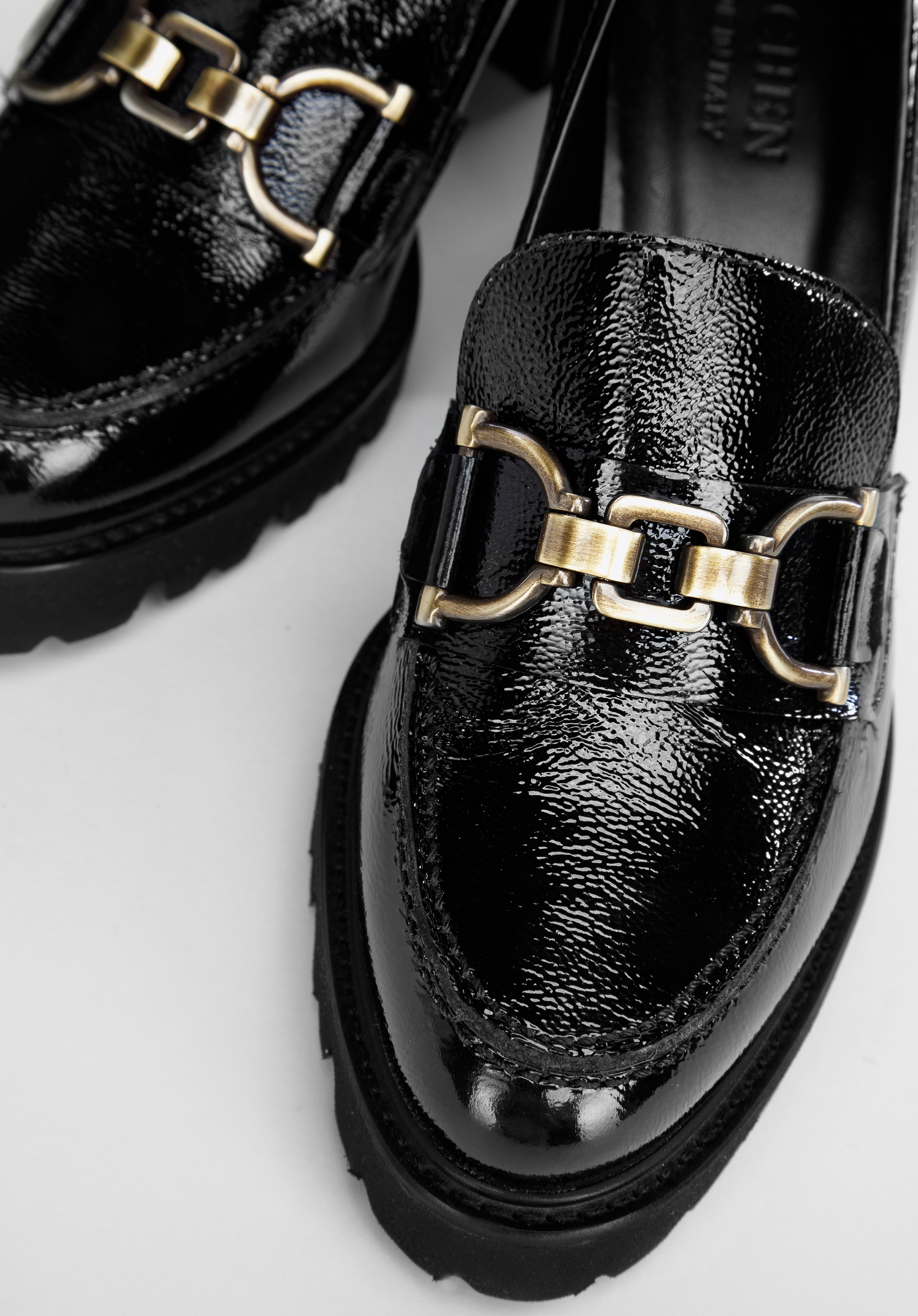Do šatníku každé ženy patří elegantní a pohodlné boty na vysokém podpatku. Tento model je vyroben z vysoce kvalitní lakované kůže. Zdobí je spona z broušeného kovu. Silný, tvarovaný podpatek je doplněn platformou, která zajišťuje dobrou přilnavost a pohodlnou chůzi po mnoho hodin. Lakované boty se sponou doplní elegantní dámský oblek a dodají eleganci každému obleku.