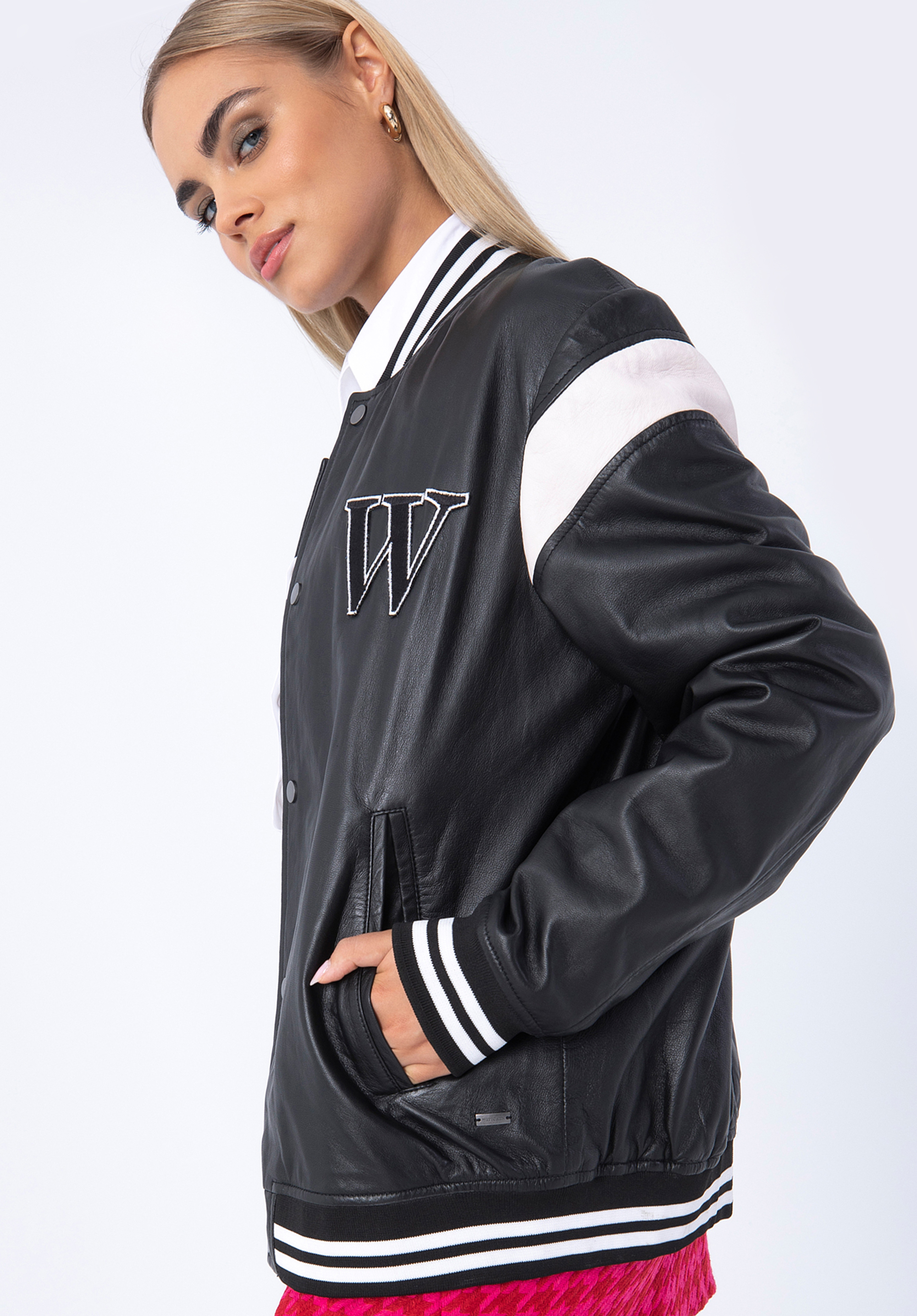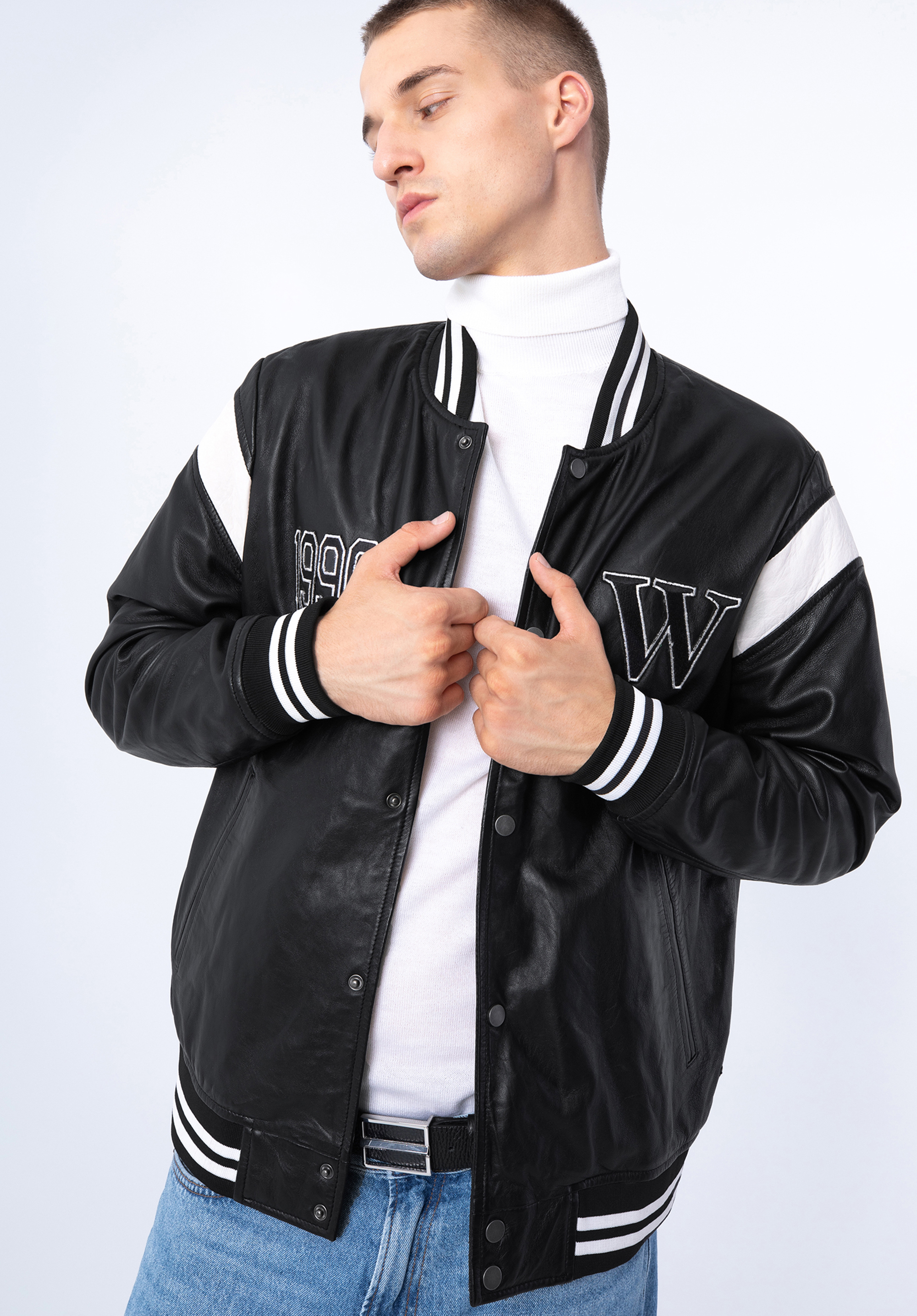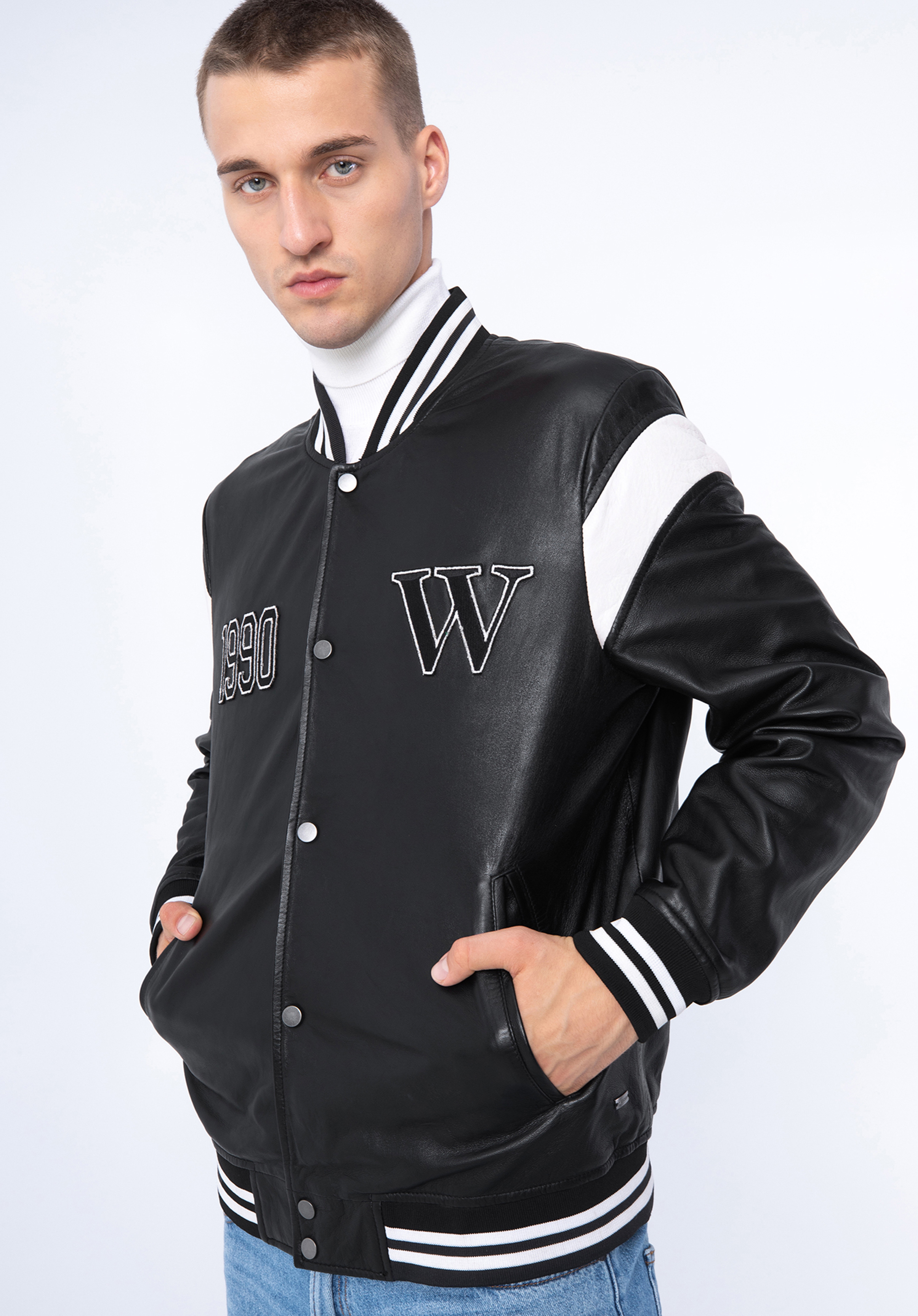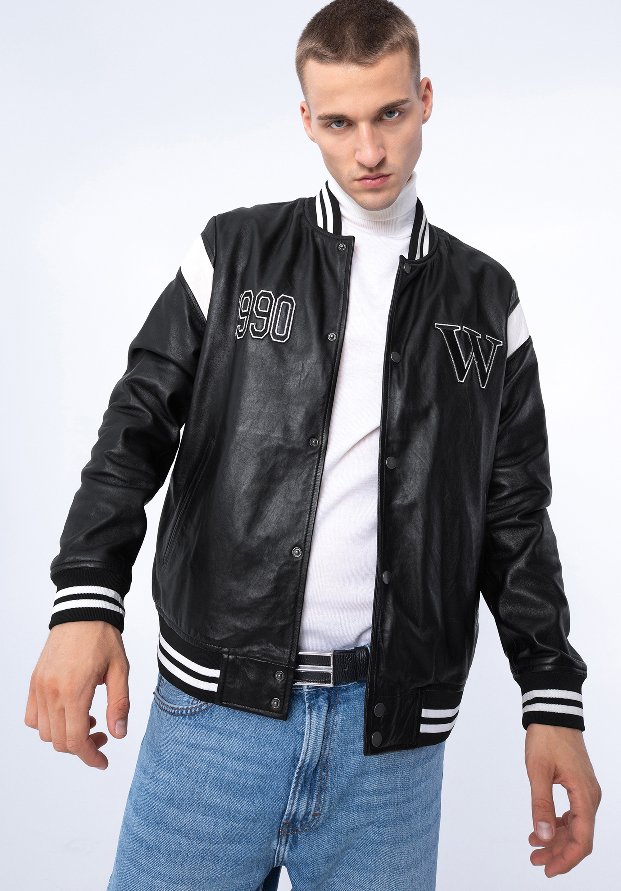 Tato stylová baseballová bunda dodá vašemu šatníku nový styl. Střih bomber bundy je obohacen velkým písmenem "W" a číslem 1990. Je vyrobena z kvalitní přírodní kůže, takže bude vám sloužit mnoho let. Límec, rukávy a spodní část jsou zakončeny pletenou manžetou. Tento model můžete nosit ke každodenním oblekům nebo změnit charakter elegantnějšího stylu. Tato kožená bunda je skvělou volbou pro každého, kdo má rád módní doplňky s charakterem.