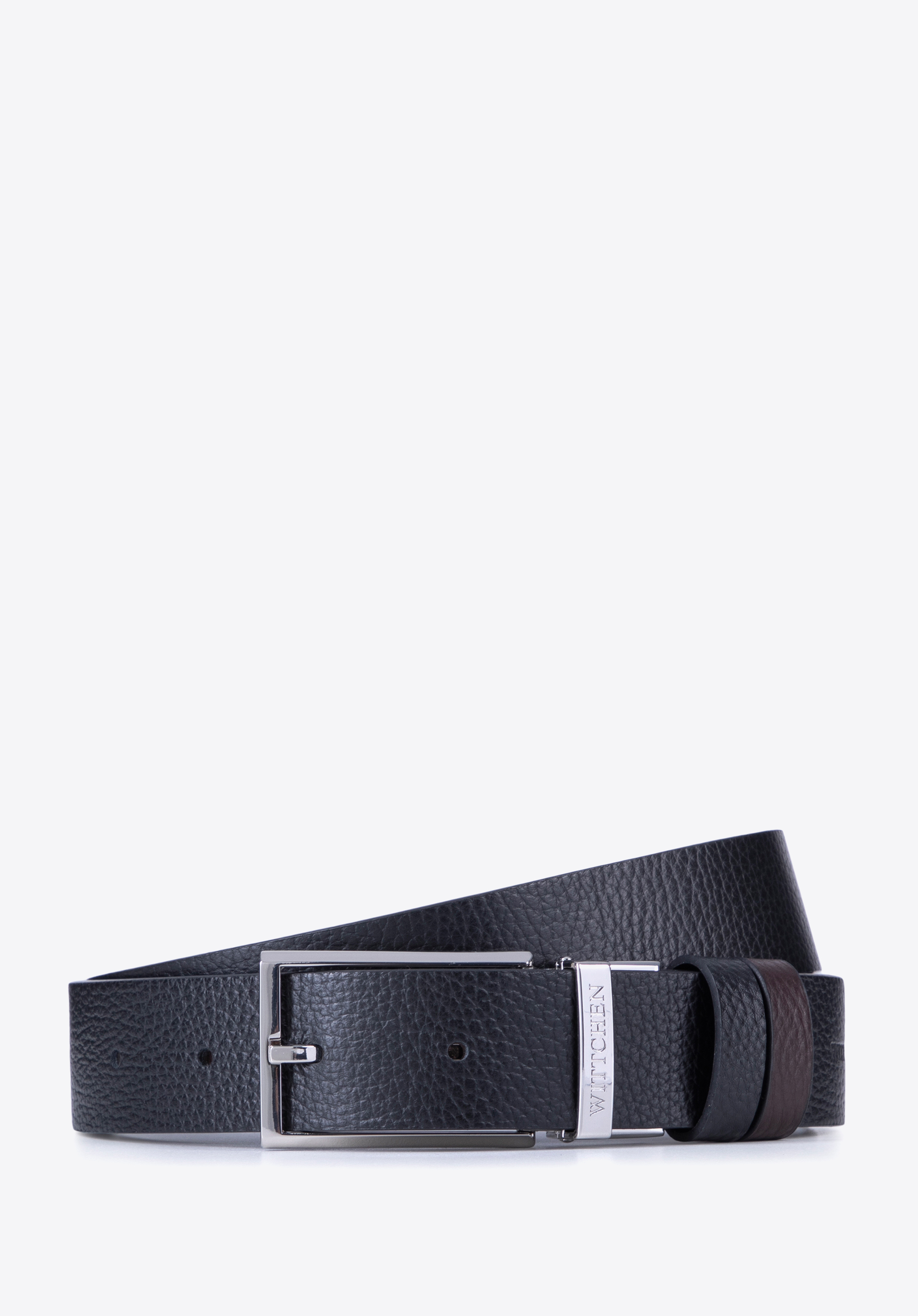 Tento stylový pásek je nadčasovým doplňkem každého muže. Je vyroben z vysoce kvalitní přírodní kůže se zrnitou texturou. Je oboustranný a dvoubarevný, takže snadno ho sladíte téměř s každým oblekem ve vašem šatníku. Pro převrácení stačí zatáhnout a otočit podélnou stříbrnou přezku. Noste ho ke svým oblíbeným džínům – budete vypadat elegantně za každé situace. Klasický oboustranný pánský pásek z kůže bude se vám hodit při mnoha příležitostech a v mnoha sezónách.