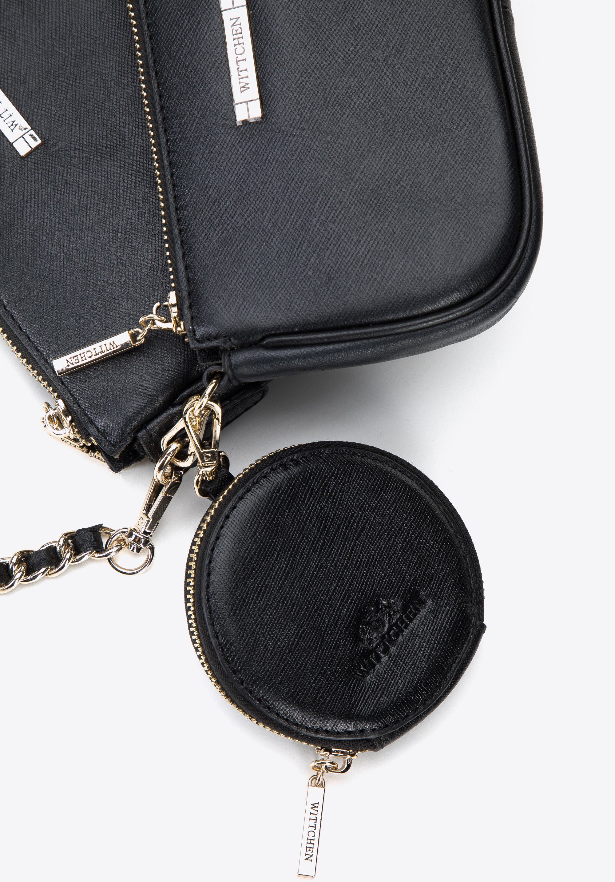 Tento jedinečný doplněk si snadno upravíte podle sebe. Skládá se ze dvou samostatných sáčků a kulatého sáčku spojeného karabinkami. Můžete je nosit dle libosti. Kabelka je vyrobena z vysoce kvalitní přírodní kůže s lesklým kováním. Dovnitř můžete dát svůj telefon, pouzdro na karty, oblíbenou rtěnku a pár drobností. Dámská dvojitá kožená kabelka s pouzdrem na řetízku je stylovým doplňkem, který bude ideální pro každodenní i elegantní stylizace.
