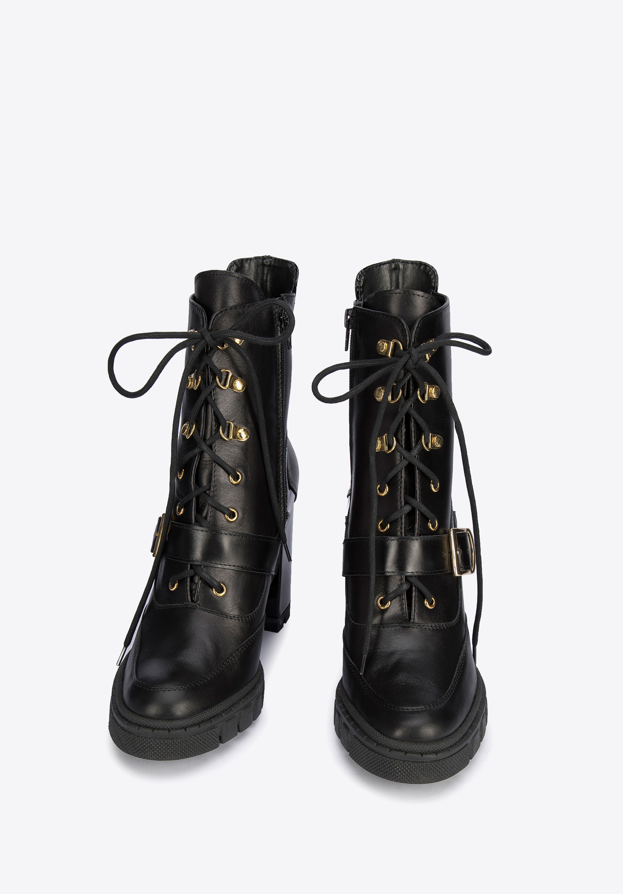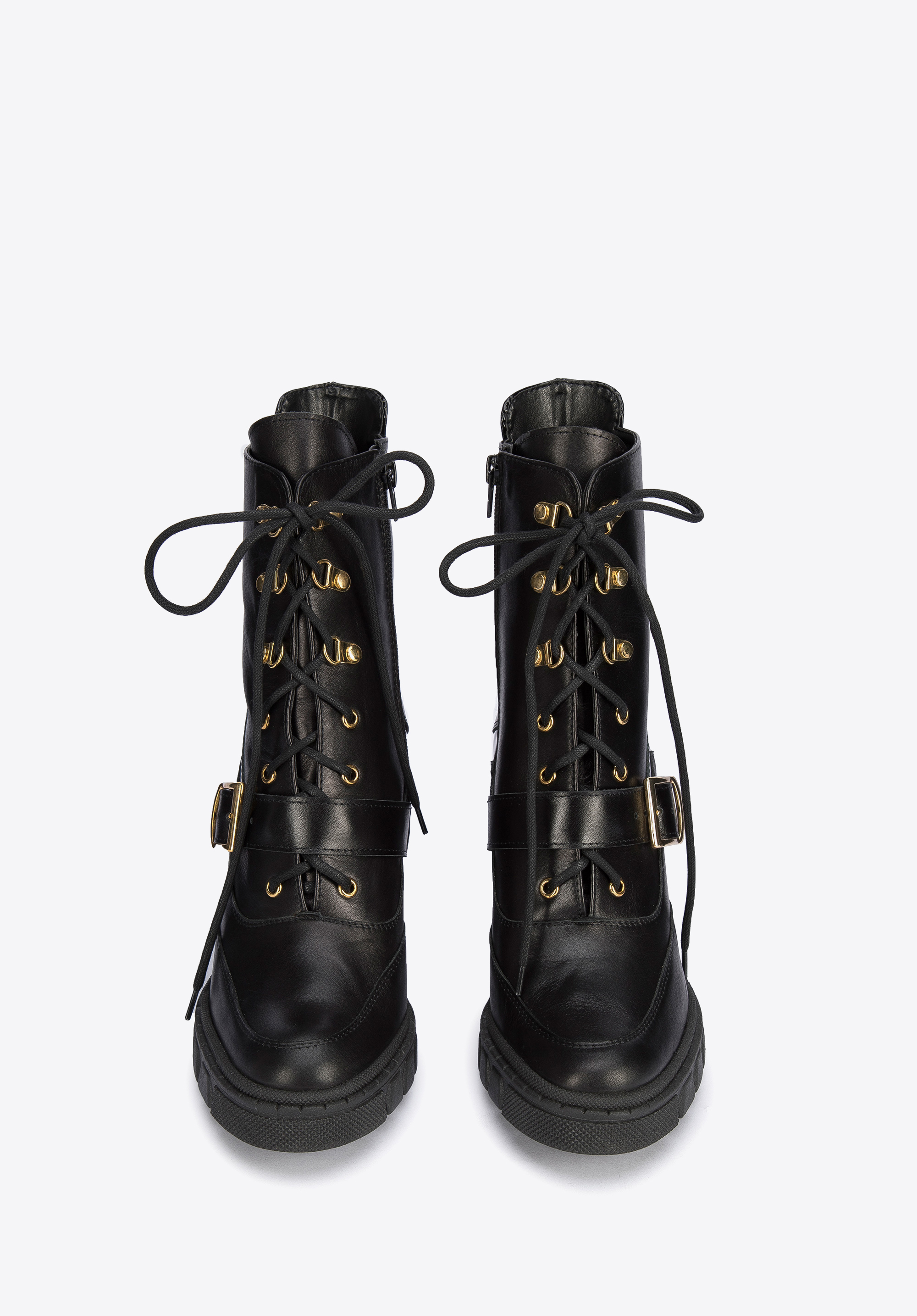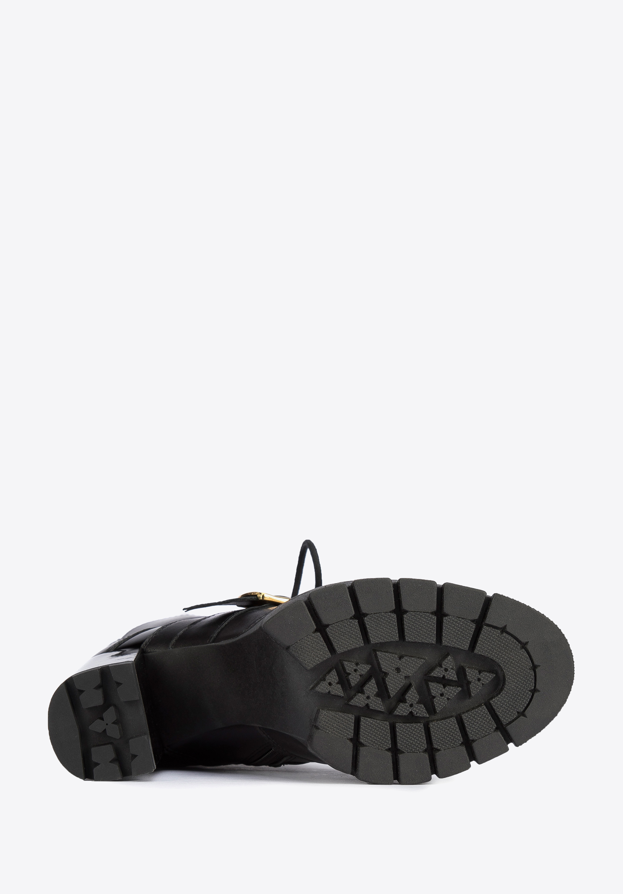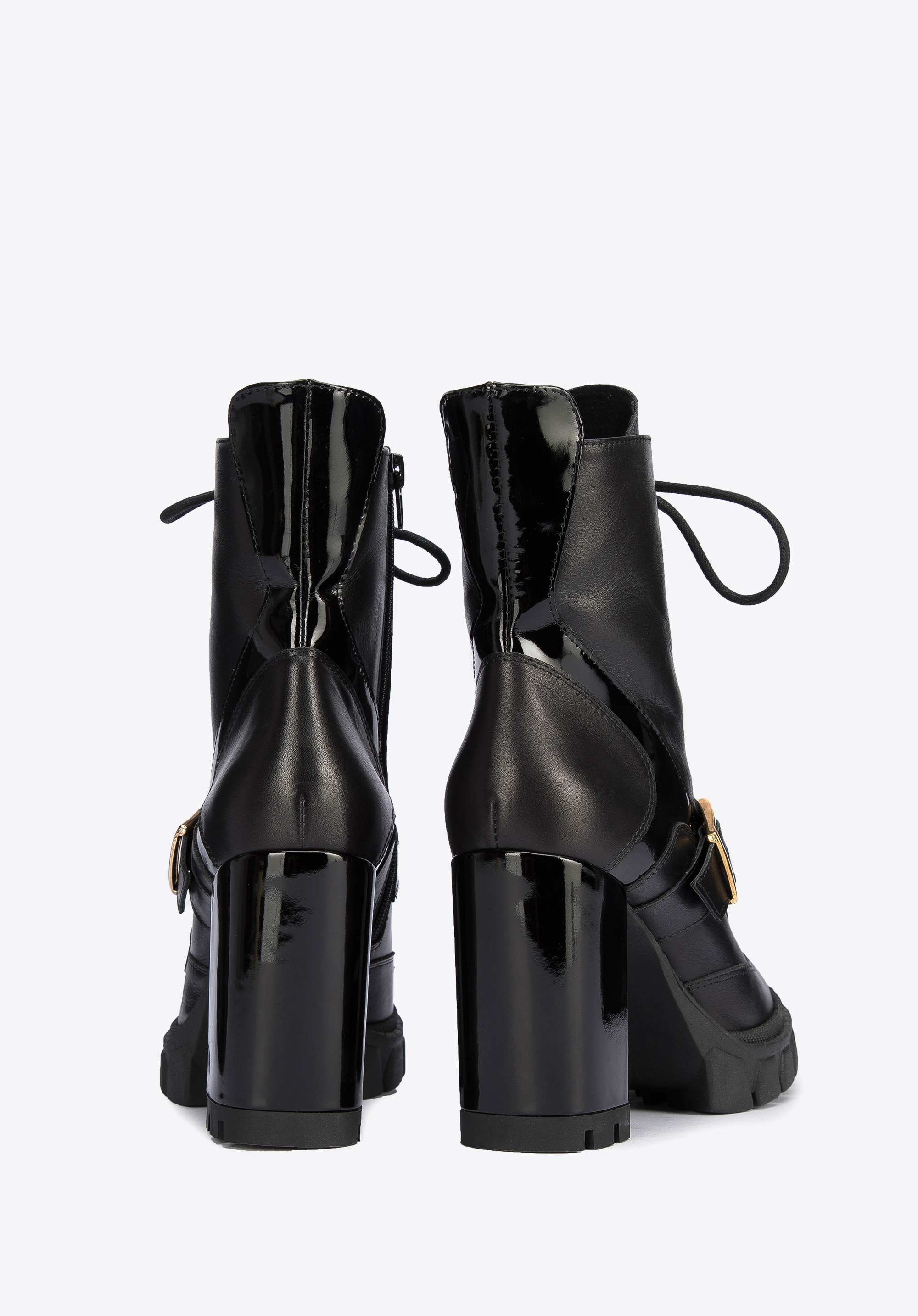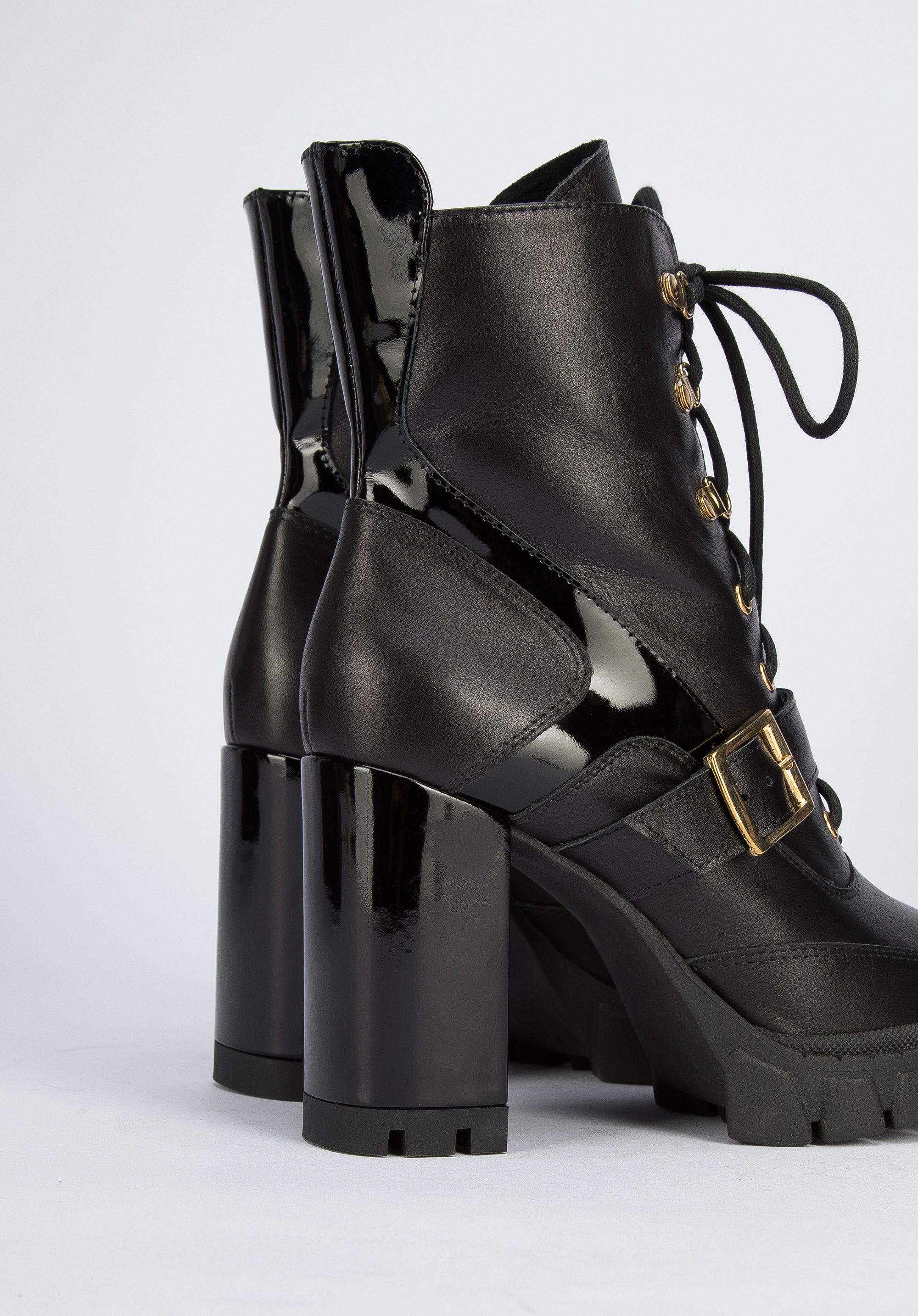 Charakteristické boty pro ženu, která ráda přitahuje pozornost. Tyto boty jsou vyrobeny z kvalitní přírodní kůže, takže budou vám sloužit mnoho let. Podpatek lemovaný lakovanou kůží zajistí pohodlnou chůzi a dodá vám pár centimetrů výšky. Ozdobná zadní část boty a přezka na opasku stylově zdůrazňují produkt. Skvěle doplní váš oblek za každé situace. Kožené kozačky s přezkou na sloupku jsou doplňkem s charakterem pro každou moderní ženu.