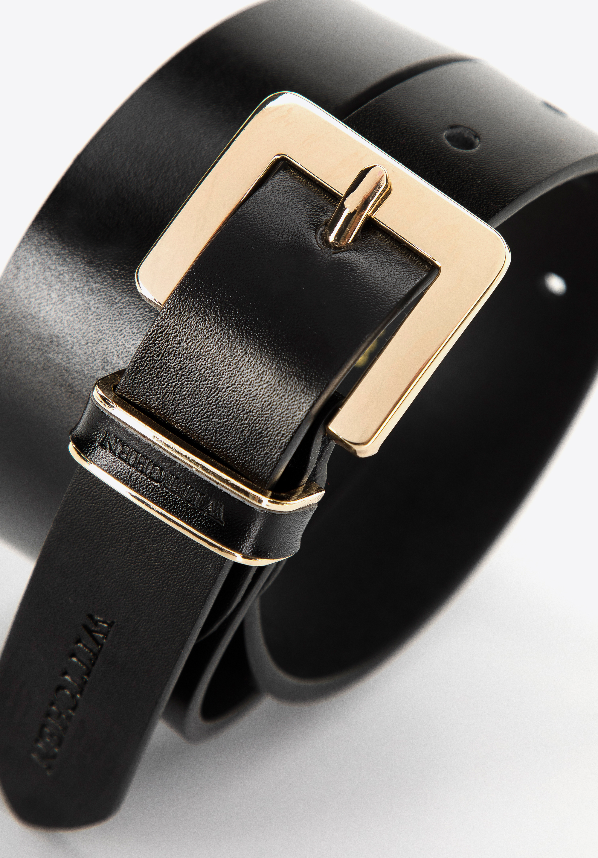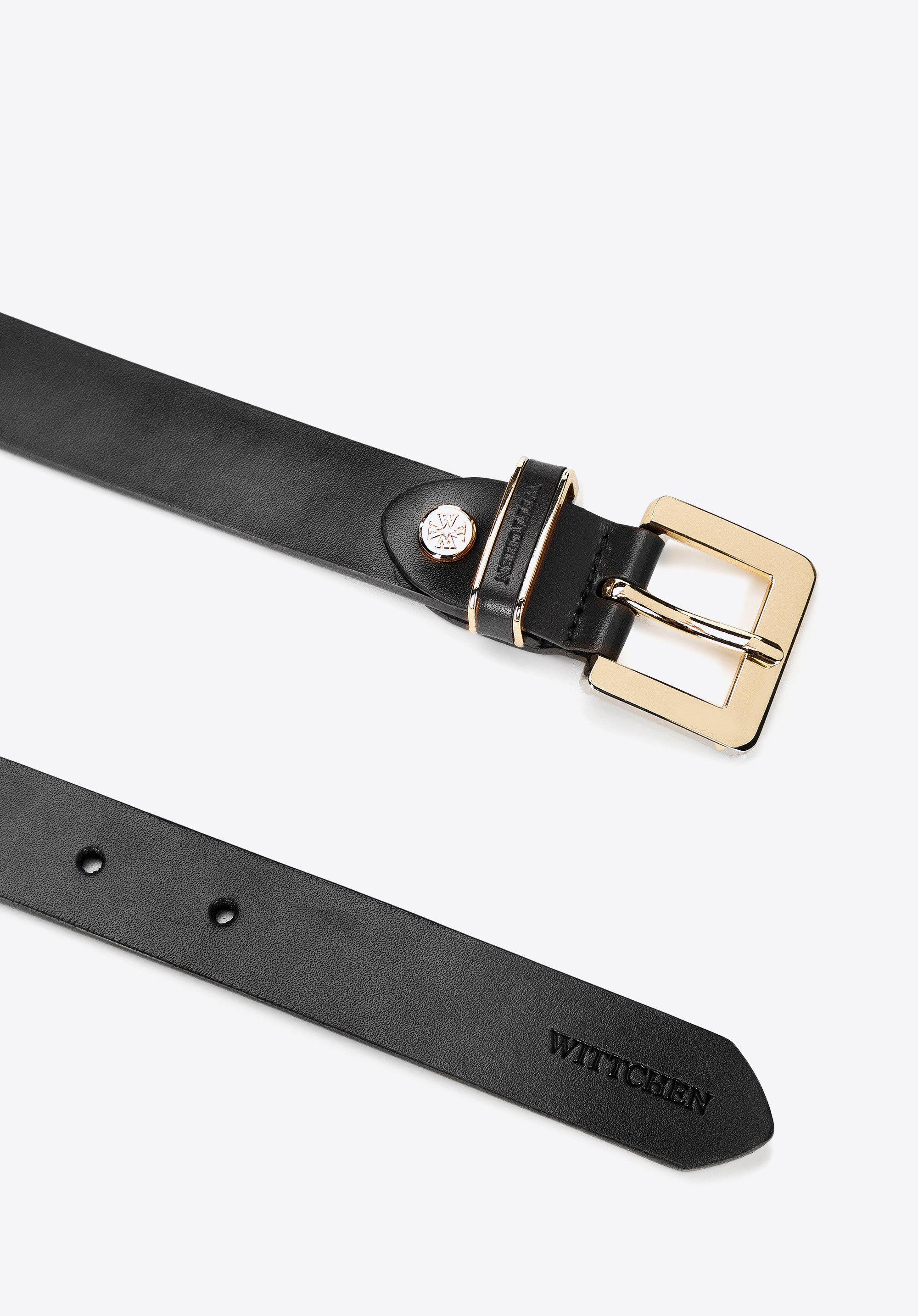 Tento stylový dámský pásek nesmí chybět v šatníku každé ženy. Je vyroben z vysoce kvalitní přírodní kůže. Zdobí ho lesklá, geometrická spona s hladkým povrchem. Celek doplňuje kovové poutko z lemované kůže, s lesklými boky a vyraženým logem WITTCHEN. Můžete ho nosit jak ke svým oblíbeným kalhotám a košili, tak k elegantním šatům. Úzký dámský kožený pásek s ozdobným poutkem je nadčasovým doplňkem, který bude se hodit při mnoha příležitostech.
