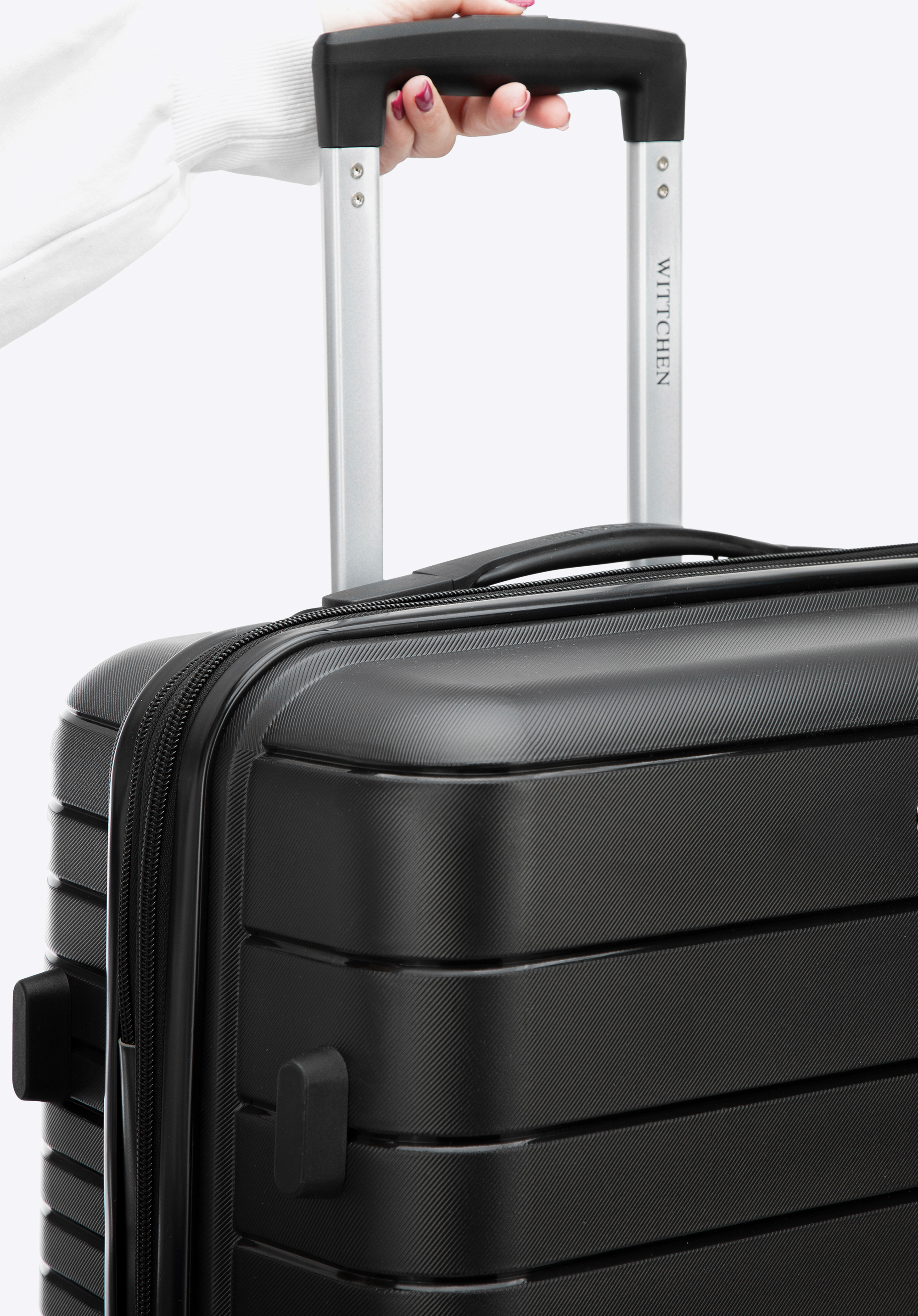 - teleskopická, výsuvná hliníková rukojeť a plastová rukojeť pro usnadnění přenášení zavazadla;