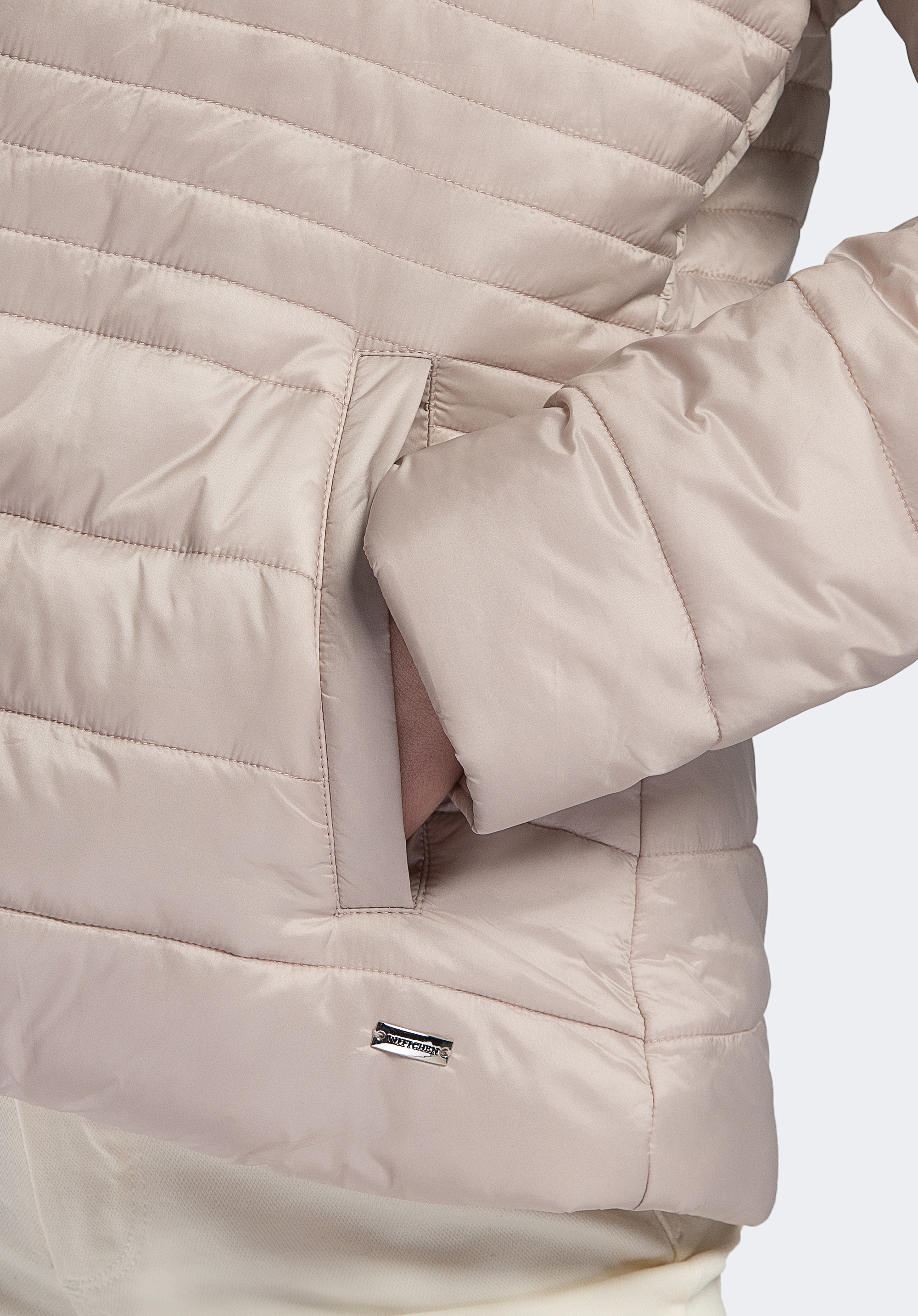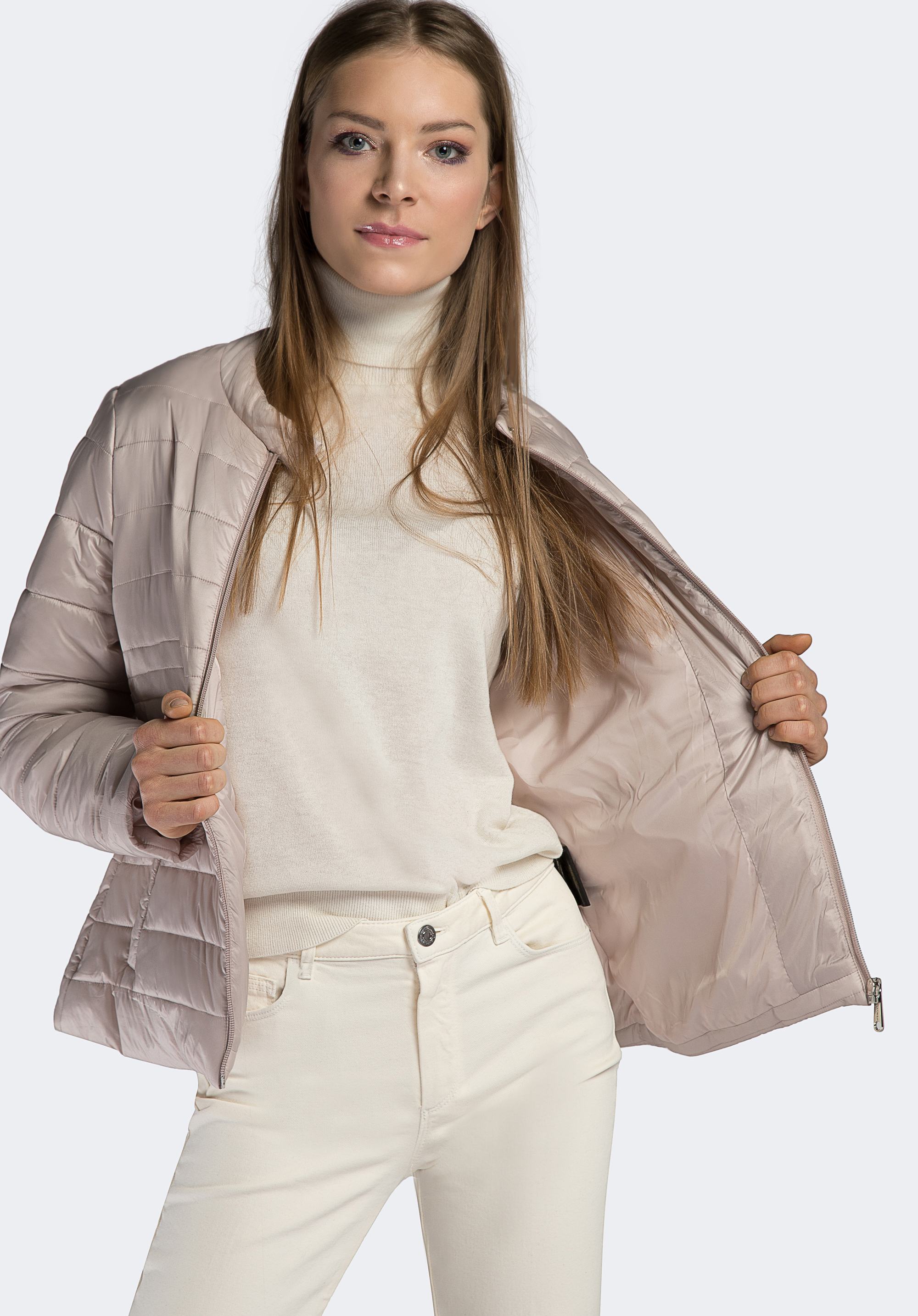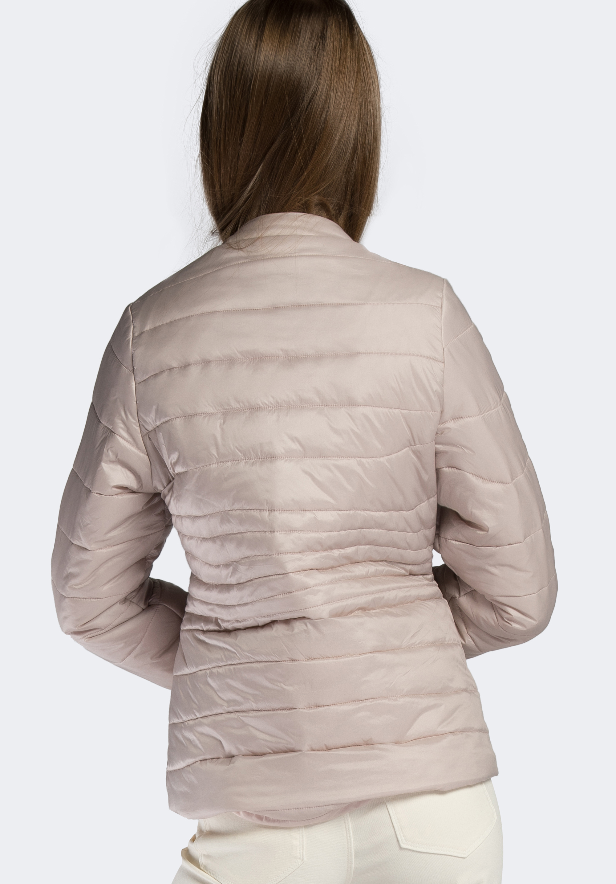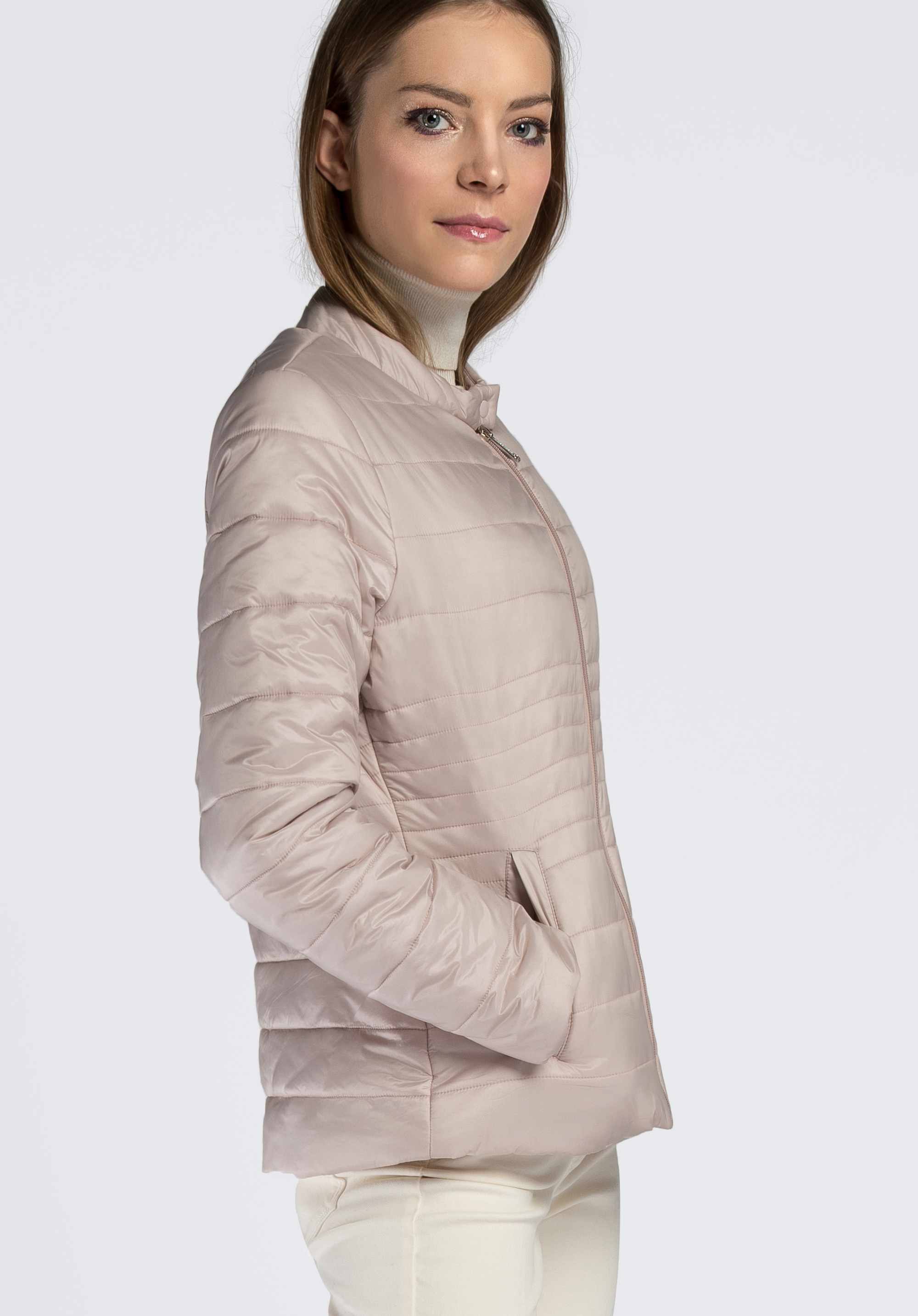 Dámská prošívaná bunda má polyesterovou izolací. Lehký model má krátký stojací límec, který je připevněn pomocí čepu. Model je k dispozici v tmavě modré a světle béžové barvě.