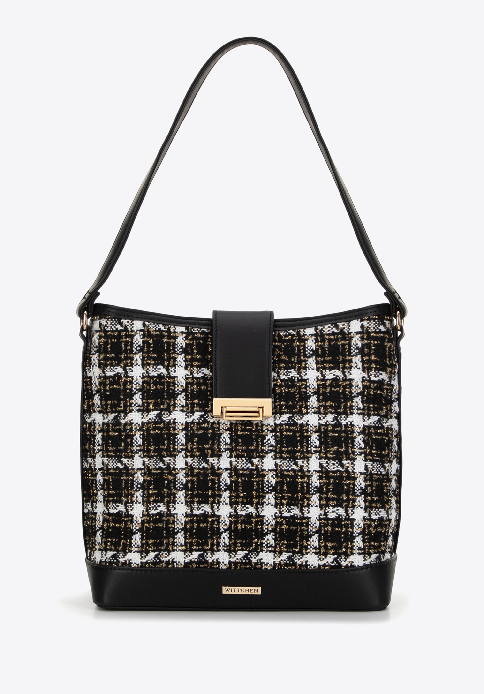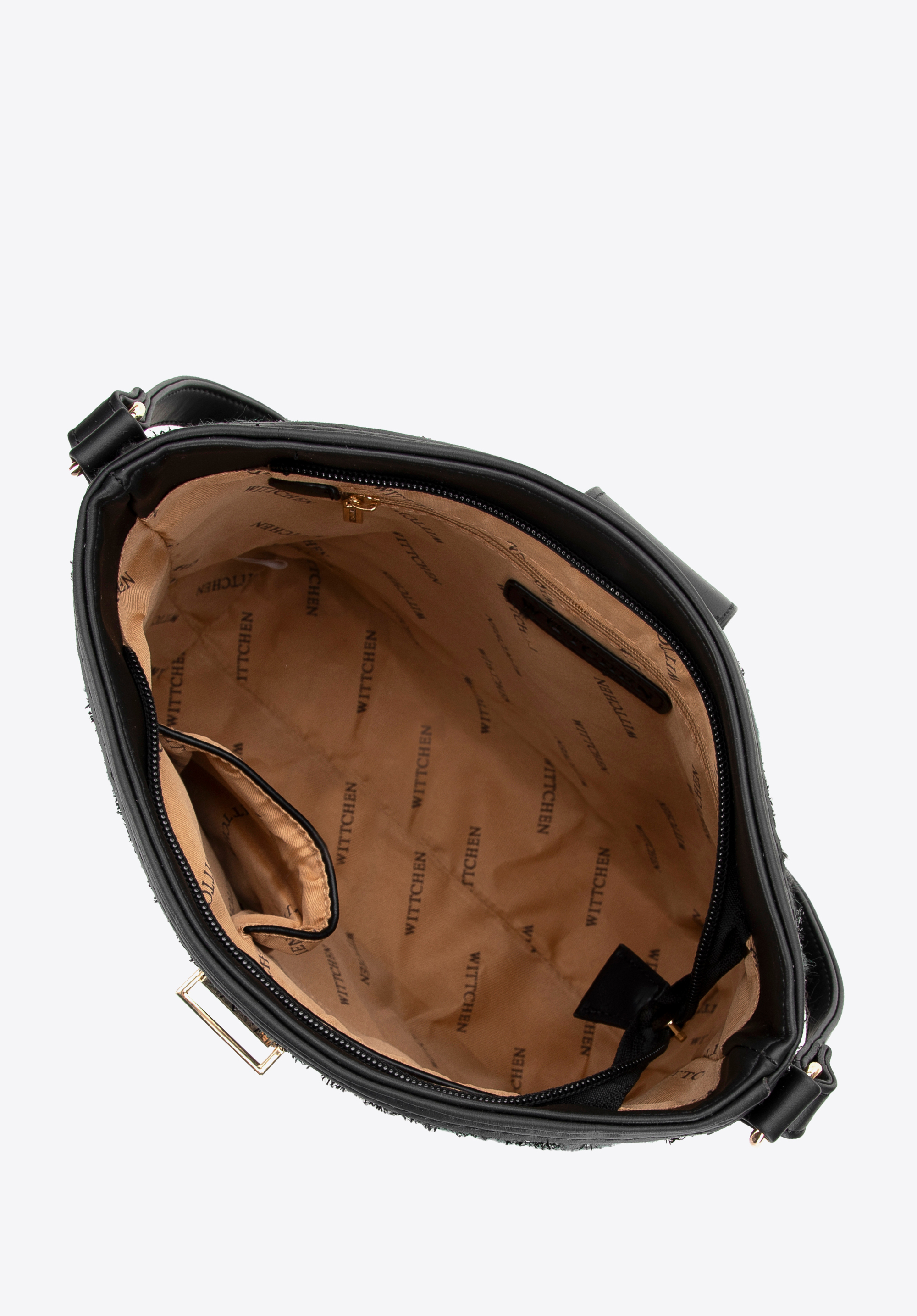 Tato jednokomorová taška zaujme svou strukturou a zajímavým designem, který kombinuje klasiku s moderností. Ozdobný pásek s přezkou, který je doplňkovým zapínáním, odlišuje tento model a dodává mu jedinečný charakter. Rukojeť z ekologické kůže zajišťuje odolnost i styl a odnímatelný a nastavitelný popruh umožňuje upravit délku podle vašich individuálních potřeb. Uvnitř najdete praktické kapsy: jednu uzavíratelnou na zip a dvě otevřené, perfektní na telefon a drobnosti. Vyztužené dno zaručuje stabilitu a drží tvar tašky a decentní logo výrobce umístěné na přední straně a podšívce zdůrazňuje vysokou kvalitu zpracování.