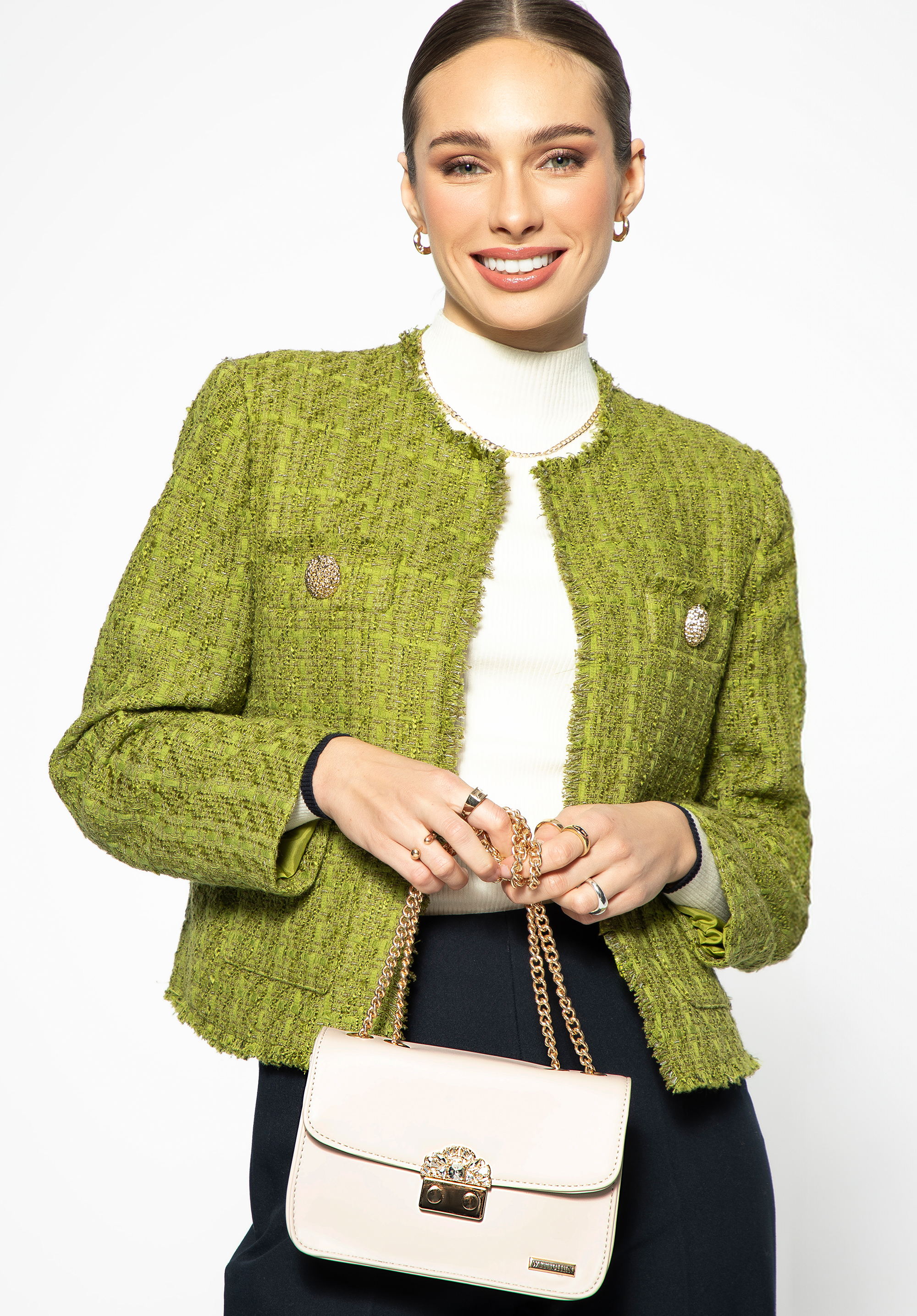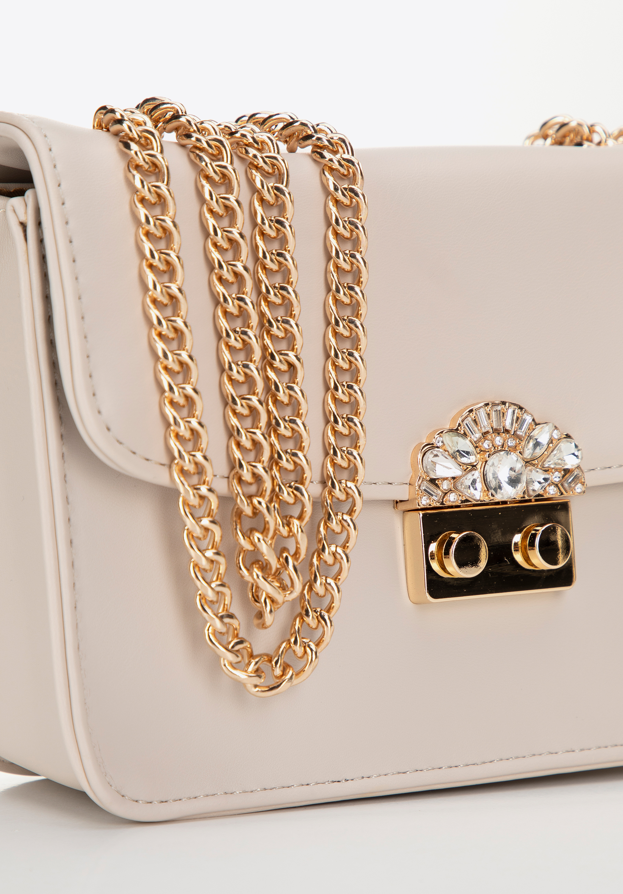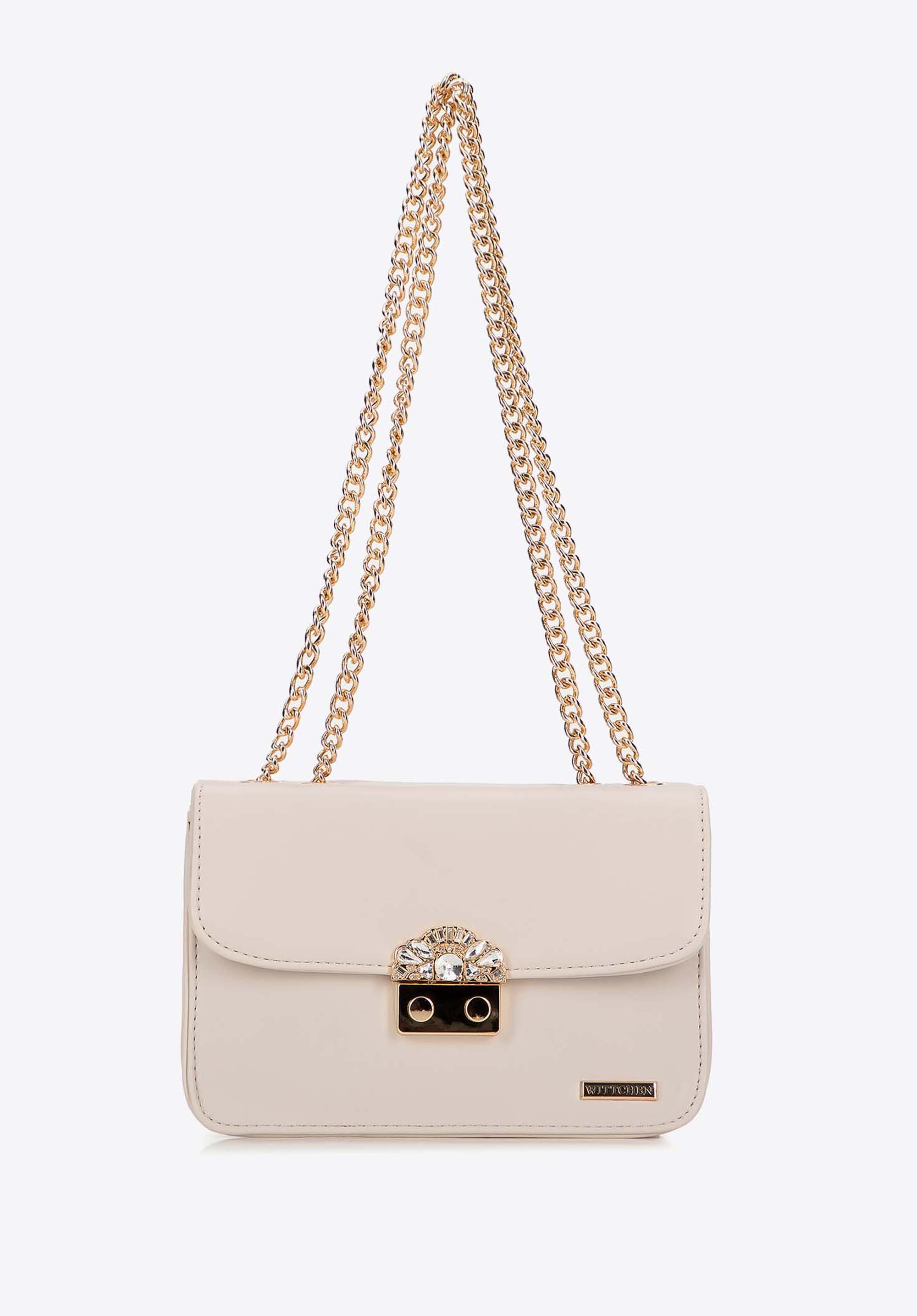 - Zapínání: Spona s ozdobami připomínajícími šperky dodává eleganci a udržuje vaše věci v bezpečí.