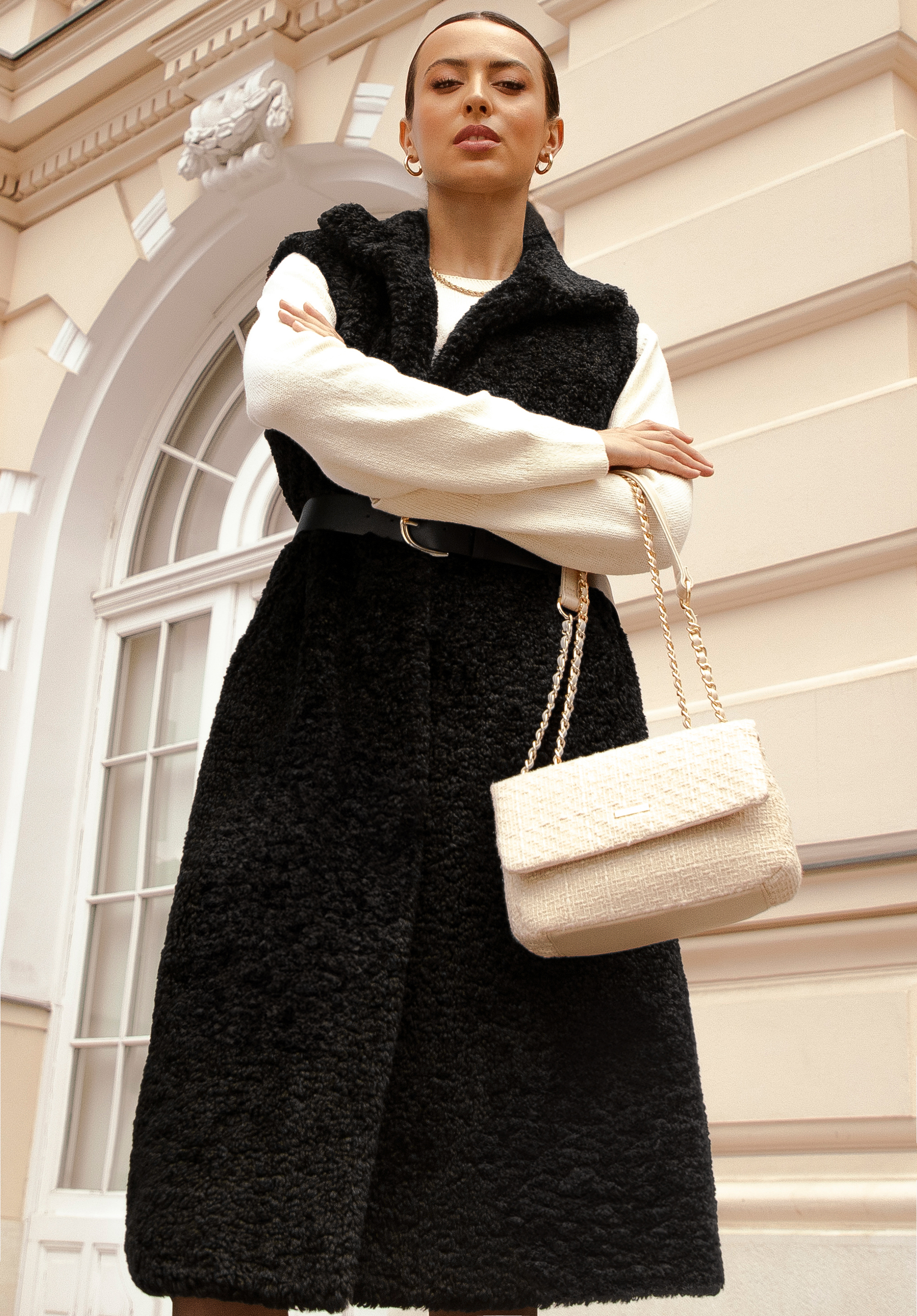 Objevte módu, která kombinuje eleganci a pohodlí. Tato dlouhá dámská vesta nesmí chybět ve vašem šatníku. Vyrobena z měkkého, příjemného materiálu, poskytuje nejen luxusní vzhled, ale také výjimečný komfort nošení. Postranní kapsy jsou praktickým doplňkem, perfektním pro schování rukou v chladnějších dnech, a barevně sladěné háčky decentně zdůrazňují elegantní charakter vesty. Dlouhý střih vesty zeštíhlí postavu a stahovací límec ochrání před větrem a chladem. To vše zvýrazní módní pásek z ekologické kůže, který dodá stylingu harmonii.