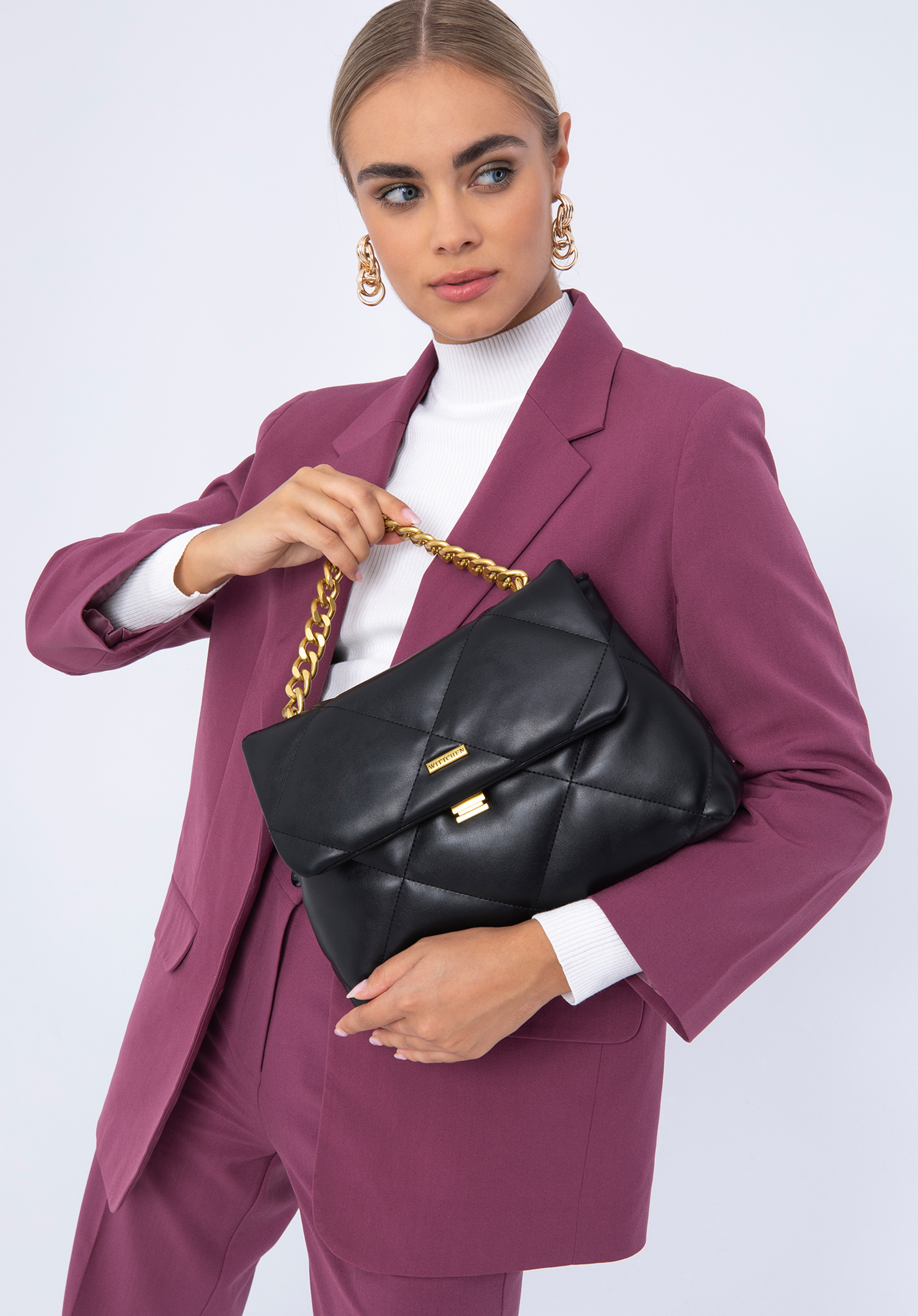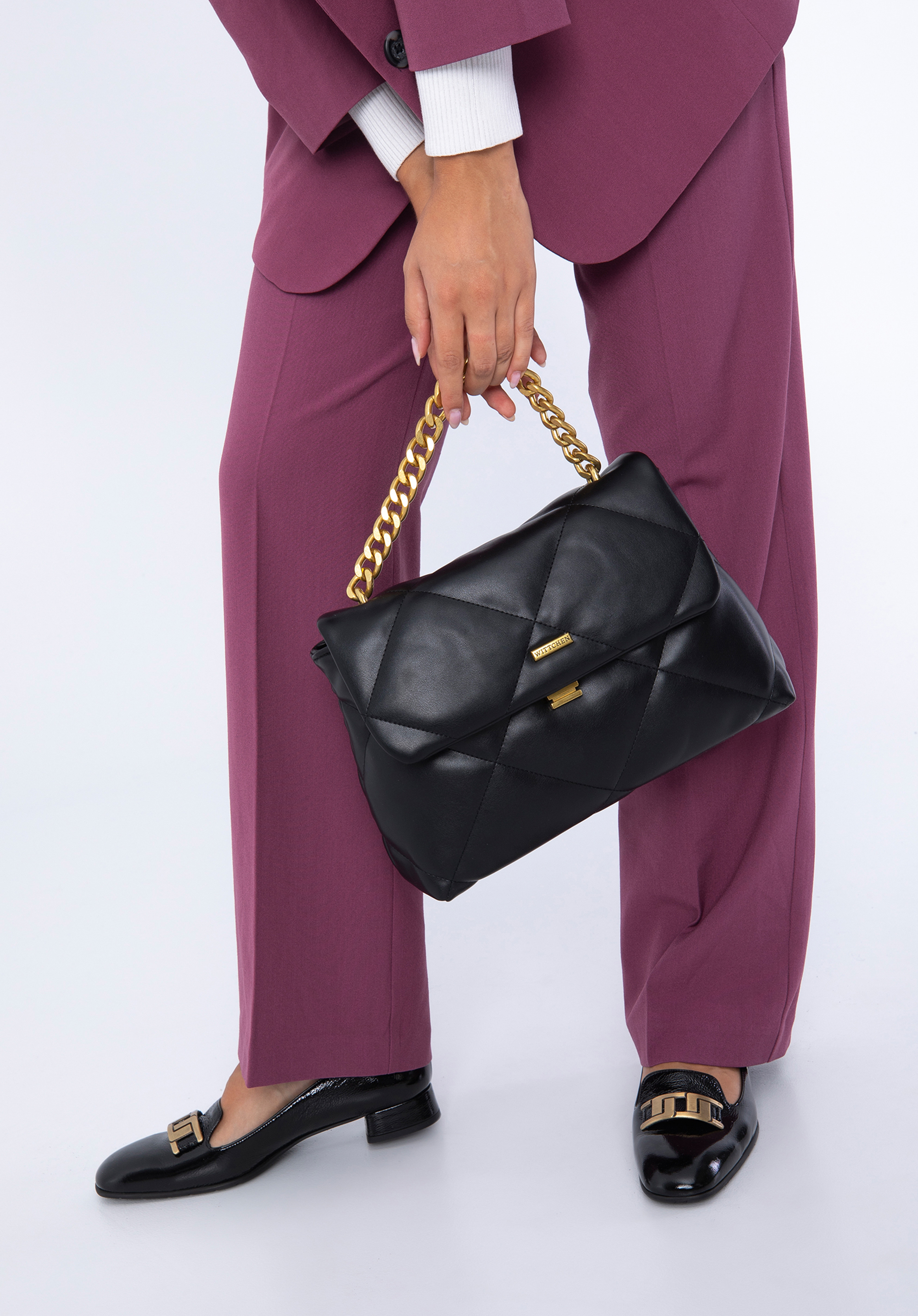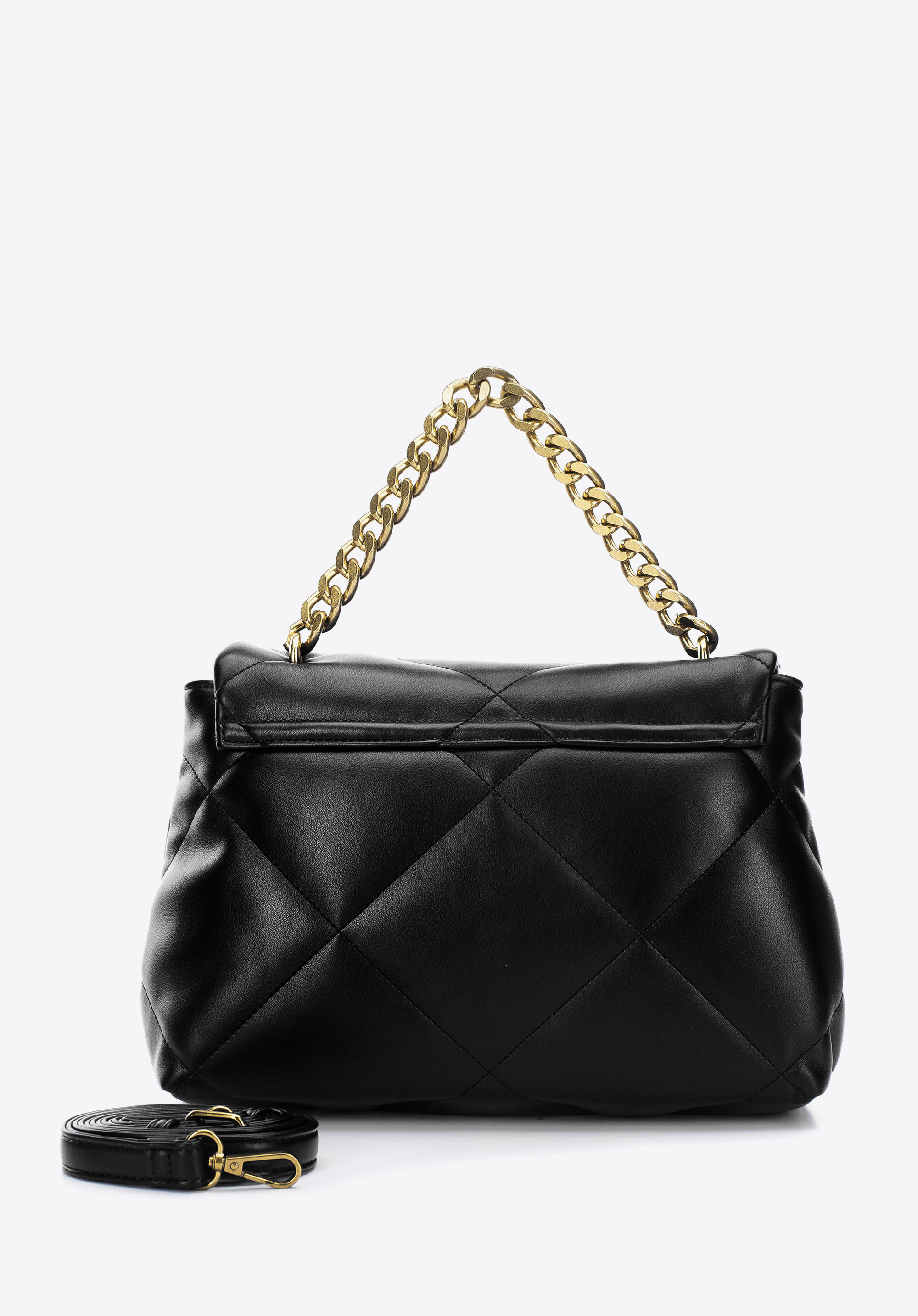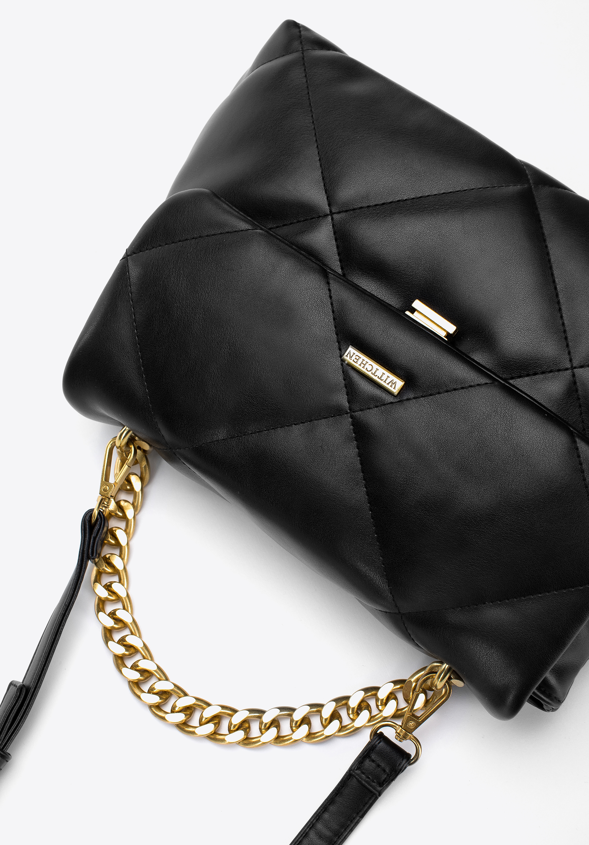 Tato příjemná na dotek kabelka je jedinečným doplňkem, který můžete nosit každý den. Je vyrobena z měkké ekologické kůže, prošívaná do čtverců. Originální spona a kovové prvky zlaté barvy dodávají ji charakter. Dovnitř vejde peněženka, kalendář, malá kosmetická taška, náhradní rukavice a pár drobností - ideální na kávu s kamarádkou, do kina nebo na piknik. Skvěle doplní vaše oblíbené džíny a košili. Prošívaná měkká kabelka z ekologické kůže s řetízkem je skvělou volbou pro každou elegantní ženu.