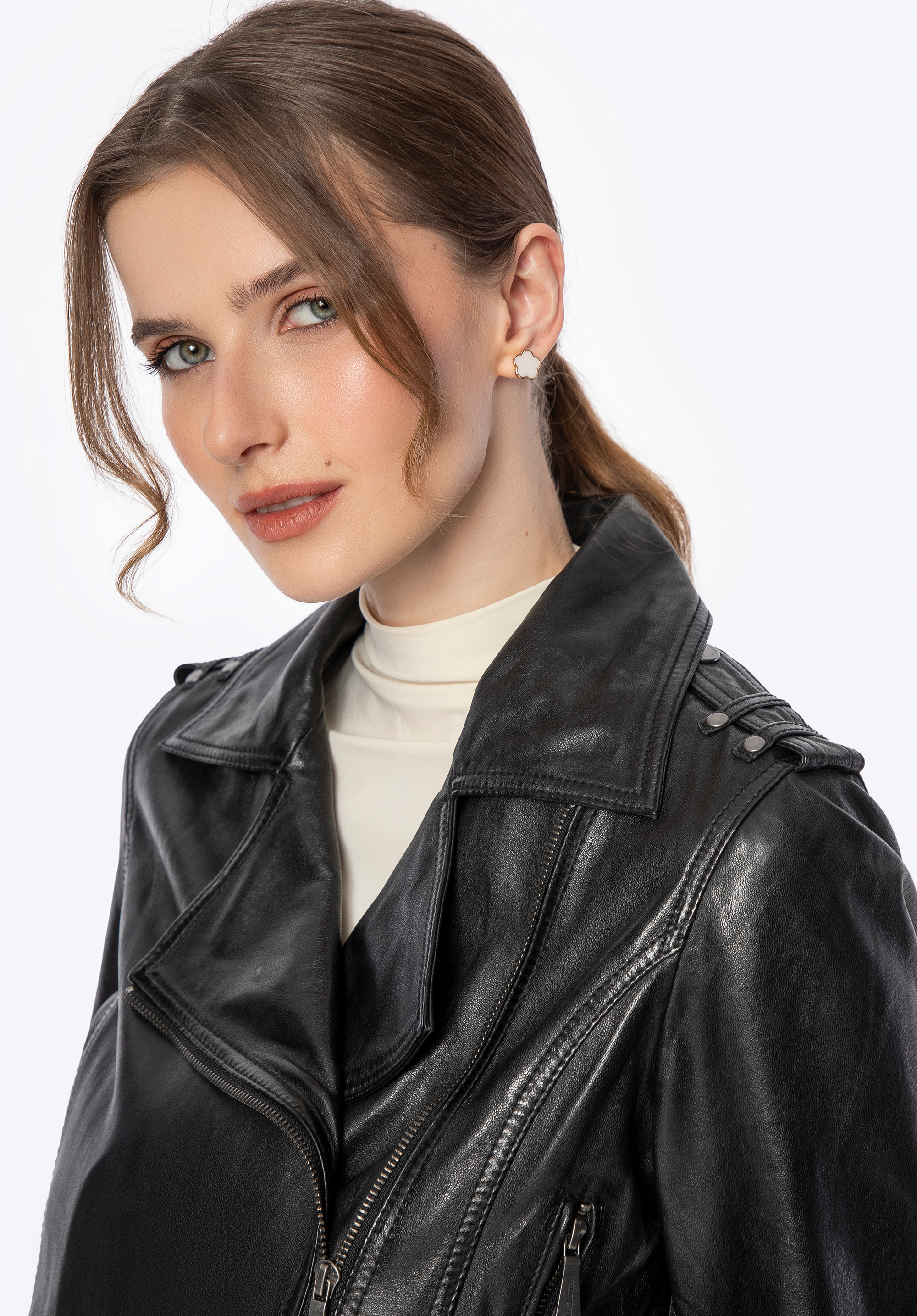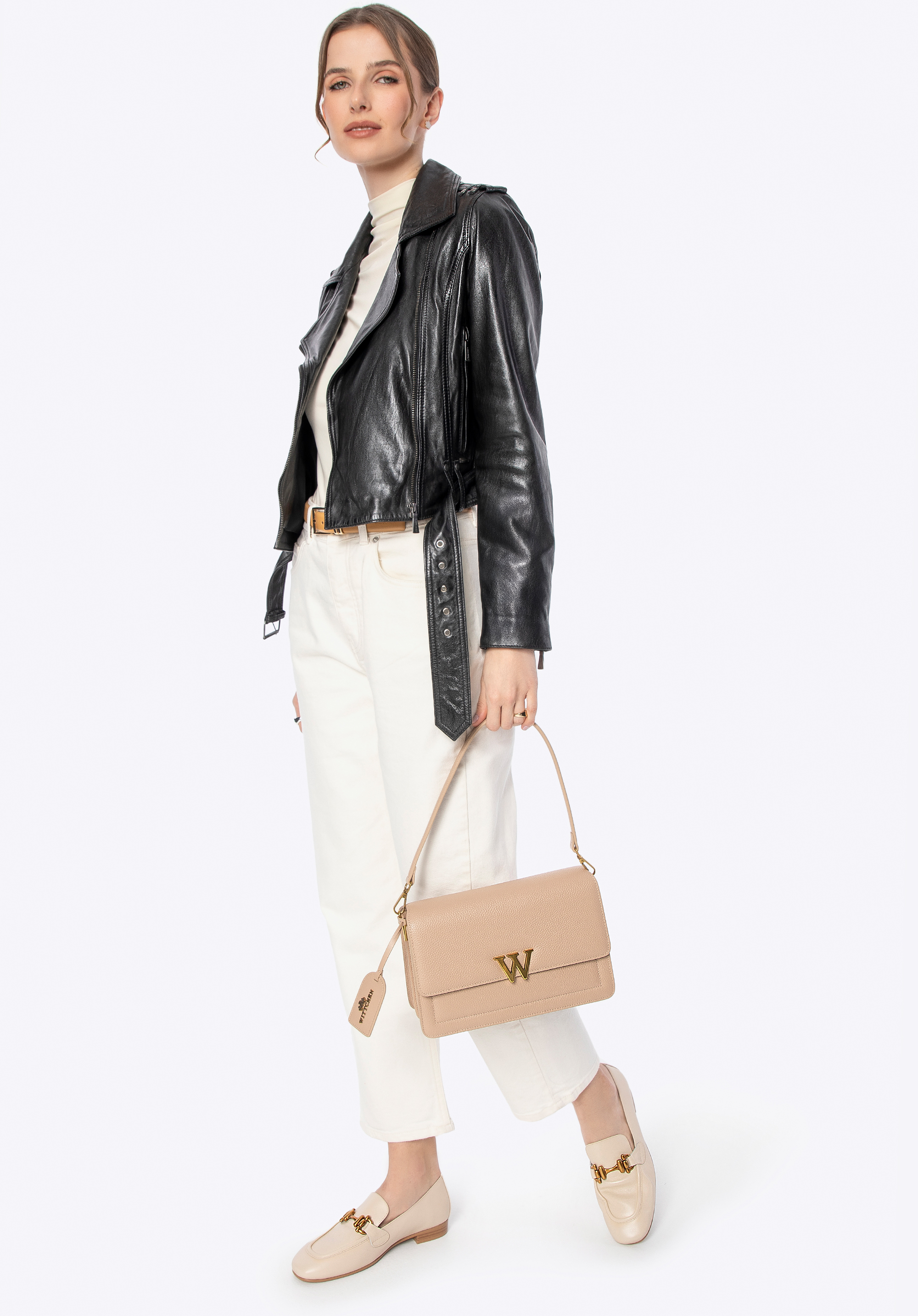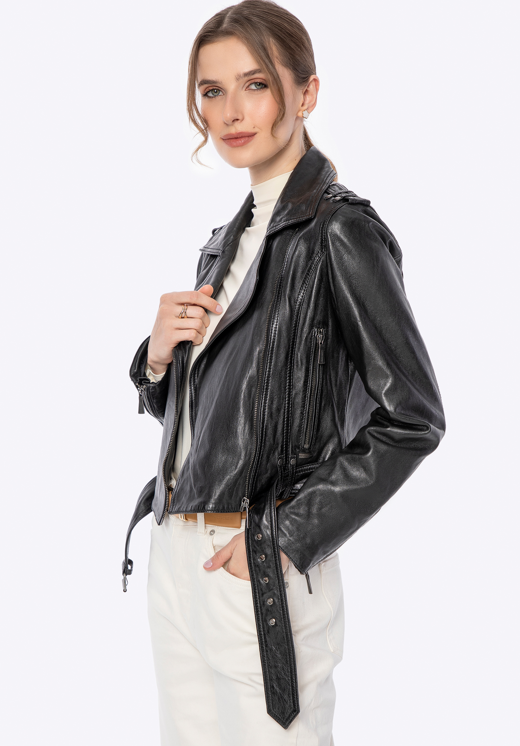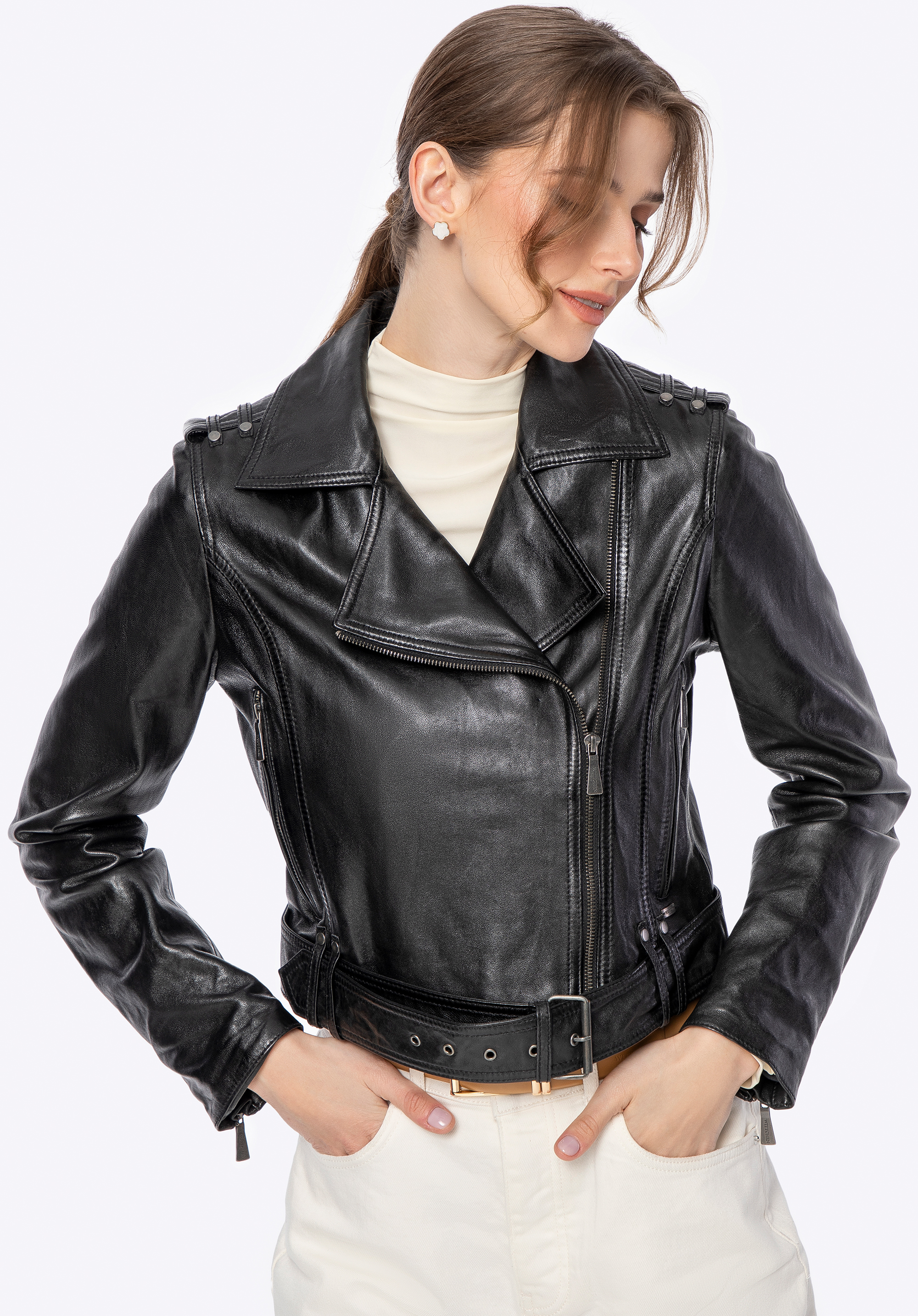 Proměňte svůj každodenní vzhled v něco skutečně výjimečného s touto motorkářskou bundou , která kombinuje eleganci s rebelským nádechem. Vyrobeno z přírodní kůže , je nejen stylové, ale také mimořádně pohodlné. Zapínání na zip a nastavitelný bederní pás s kovovou přezkou zajistí perfektní padnutí a zdůrazní ženskou siluetu. Rukávy lze nastavit pomocí zipu, což vám umožní přizpůsobit vzhled podle vašich preferencí.