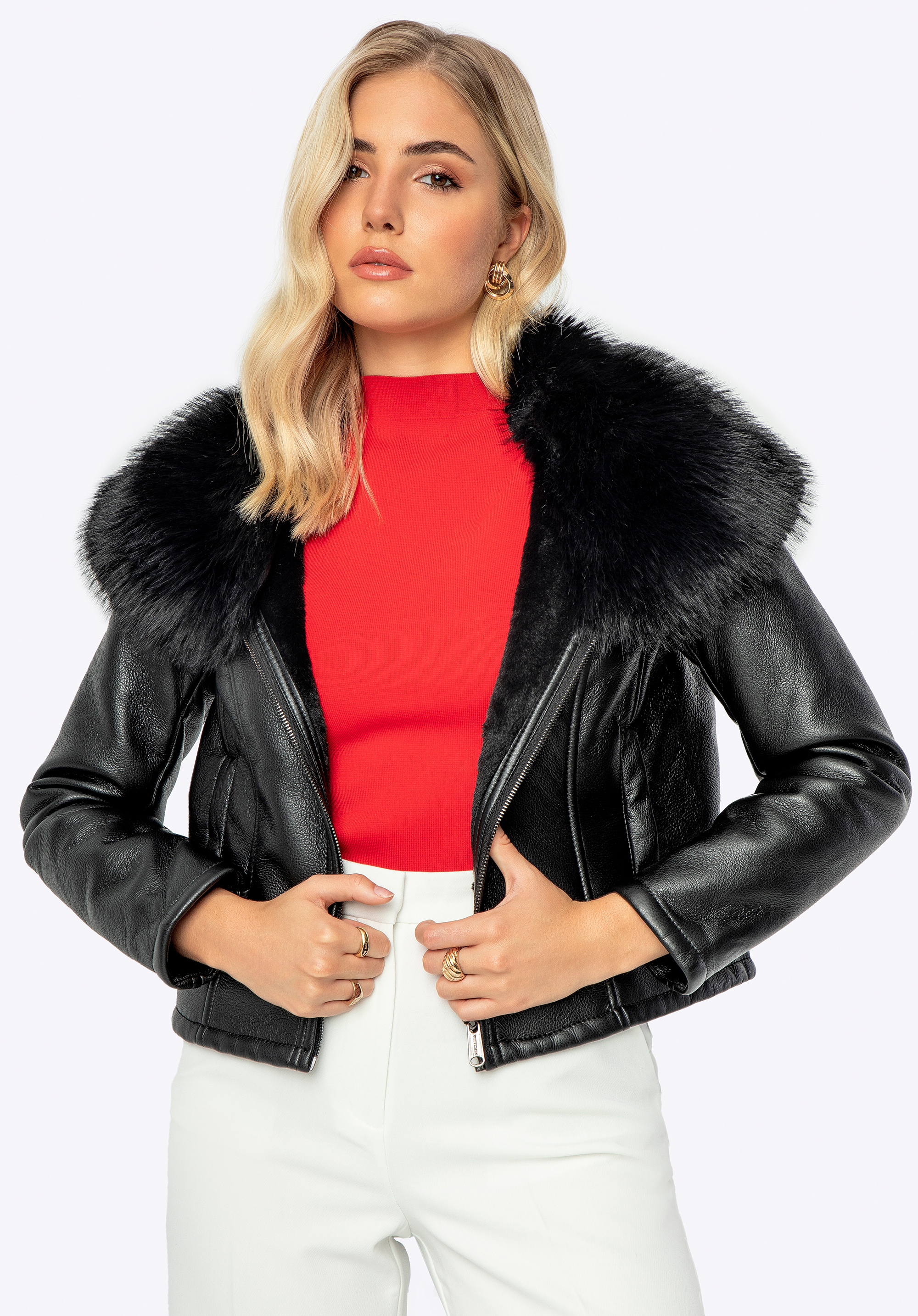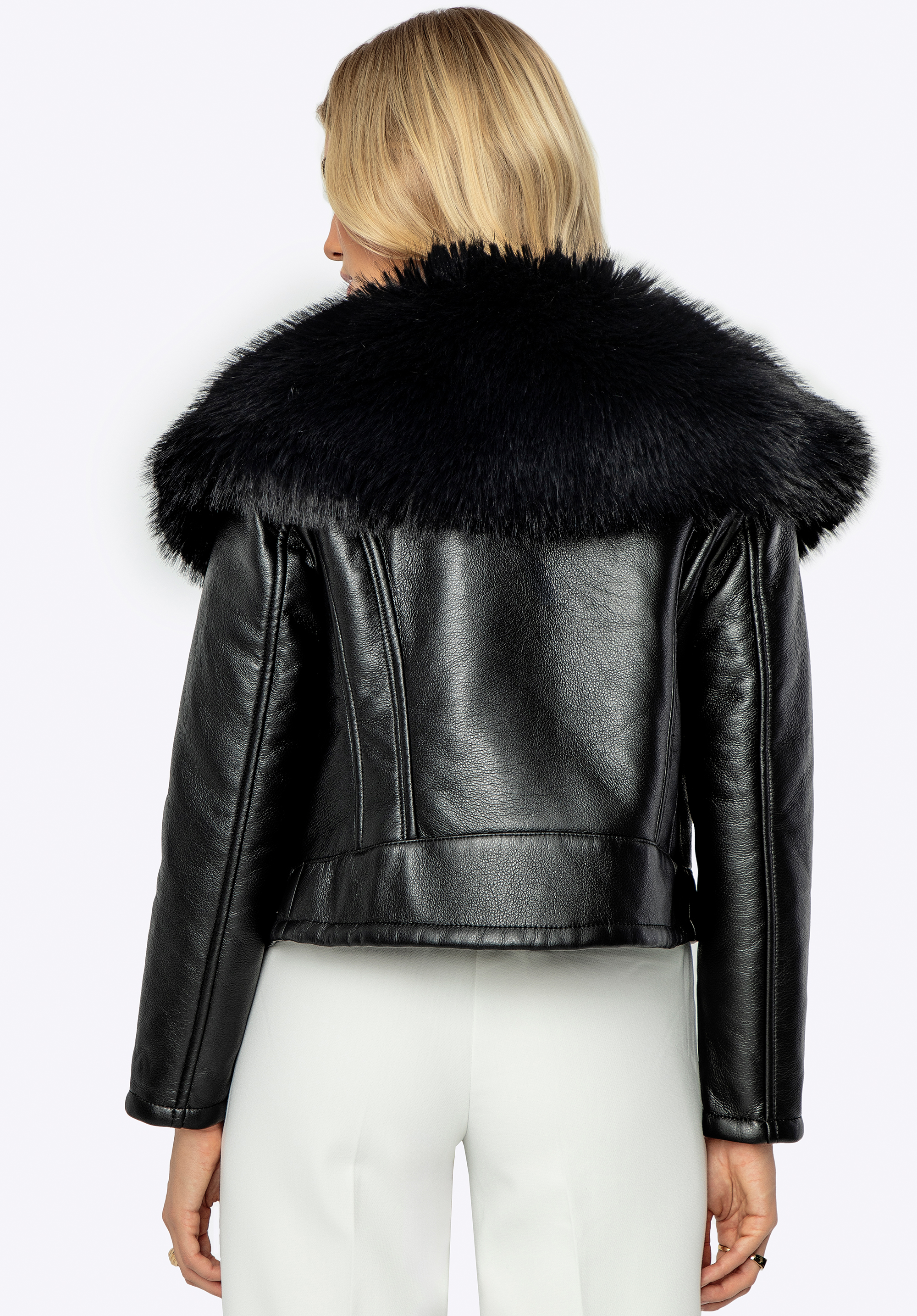 Objevte eleganci a pohodlí v jednom díky dámské bundě z ekologické kůže, ideální pro každou příležitost. Toto stylové svrchní oblečení kombinuje moderní design s funkčností a poskytuje vám jedinečný vzhled a pohodlí. Límec je zdoben jemnou, ekologickou kožešinou dodává celkovému vzhledu eleganci a hřejivost. Jemná kožešina nejen zvyšuje estetiku, ale také chrání před chladem a zajišťuje pohodlí i v chladnějších dnech.