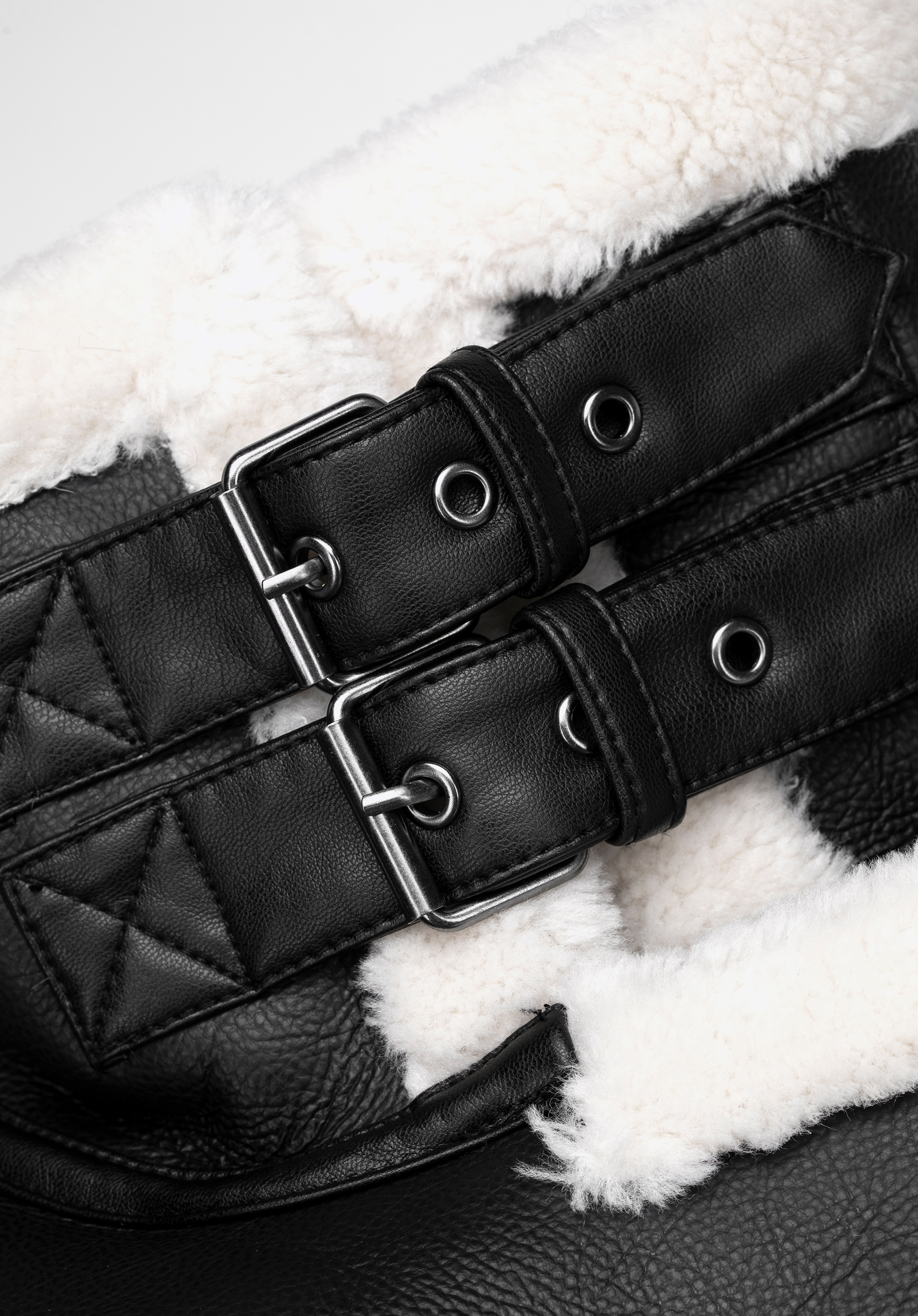 - Nastavitelné pásky z umělé kůže: Umožňují vám upevnit límec výše, aby byl váš krk chráněn za větrných dnů a dodaly mu nádech rockového charakteru.