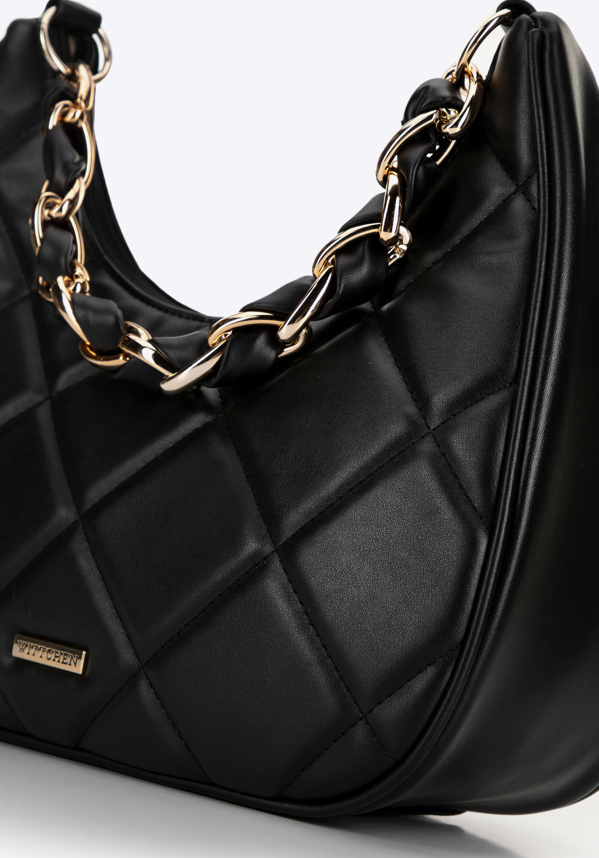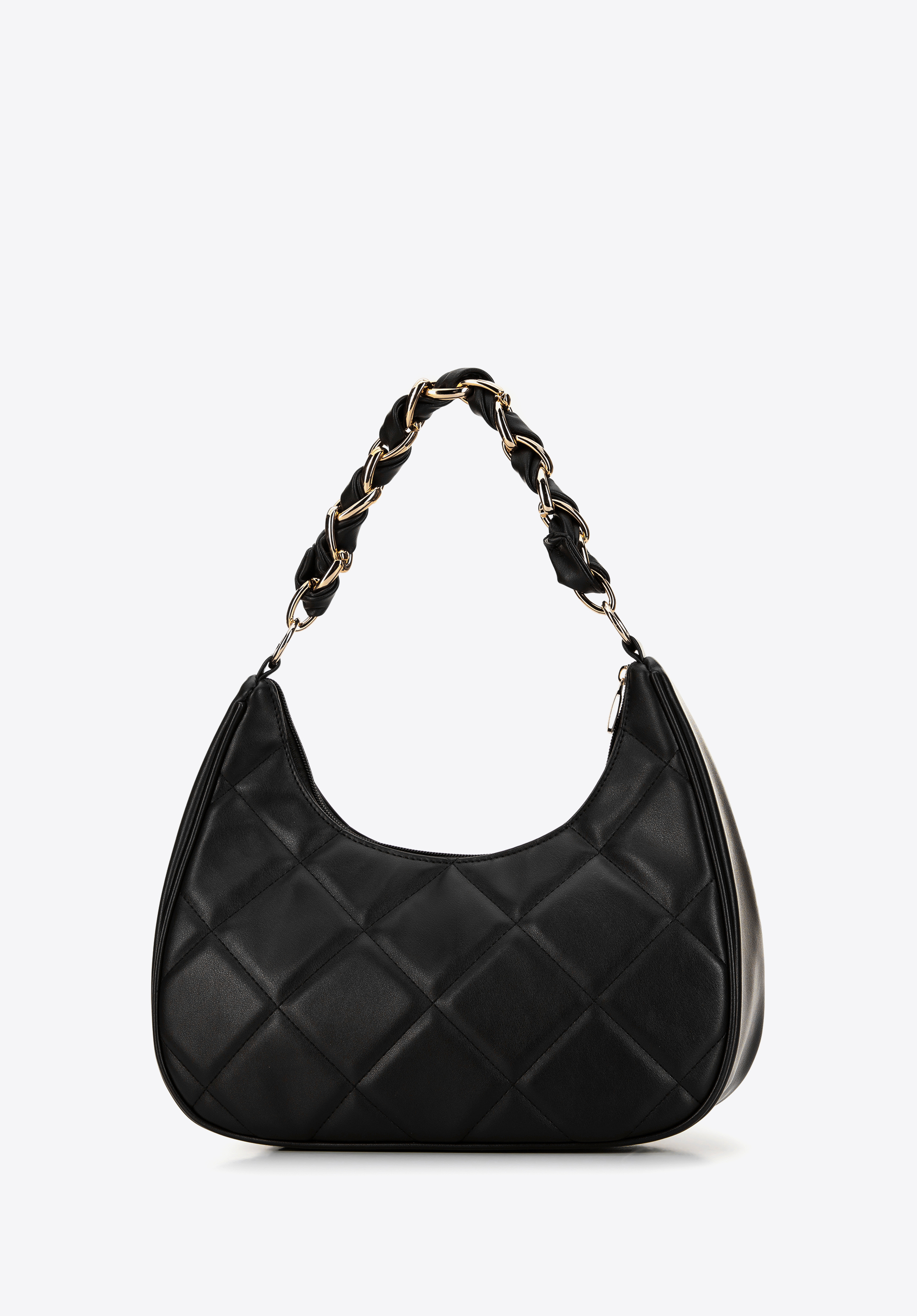 Dodejte svému vzhledu nádech sofistikovanosti s touto jedinečnou dámskou bagetovou taškou z ekologické kůže. Tento model jednokomorové tašky je skutečným designovým mistrovským dílem. Geometrický diamantový vzor a prošívaná textura přitahují pozornost a dodávají tašce jedinečné kouzlo. Rukojeť a popruh z tkaného řetízku dodávají nádech luxusu, zatímco praktický zip udrží vaše věci v bezpečí. Uvnitř jsou tři kapsy: jedna uzavíratelná na zip a dvě otevřené, ideální na telefon, klíče nebo kosmetiku.