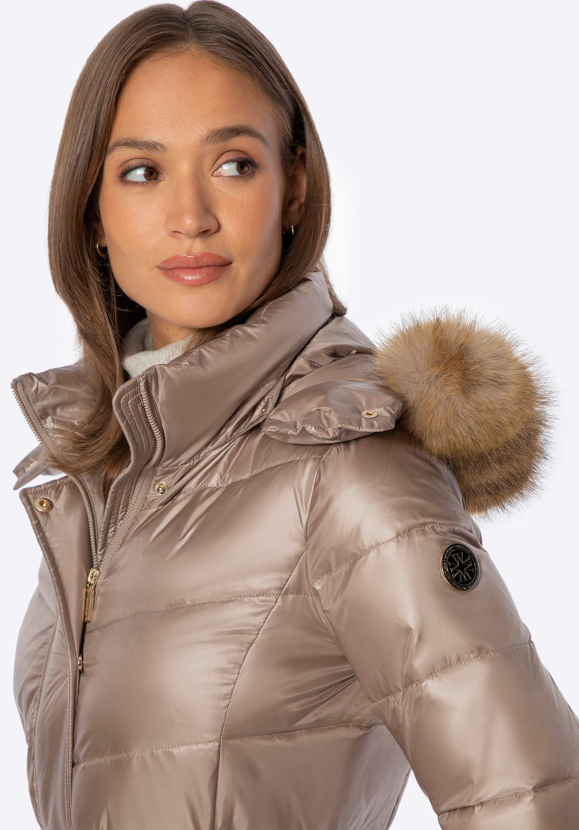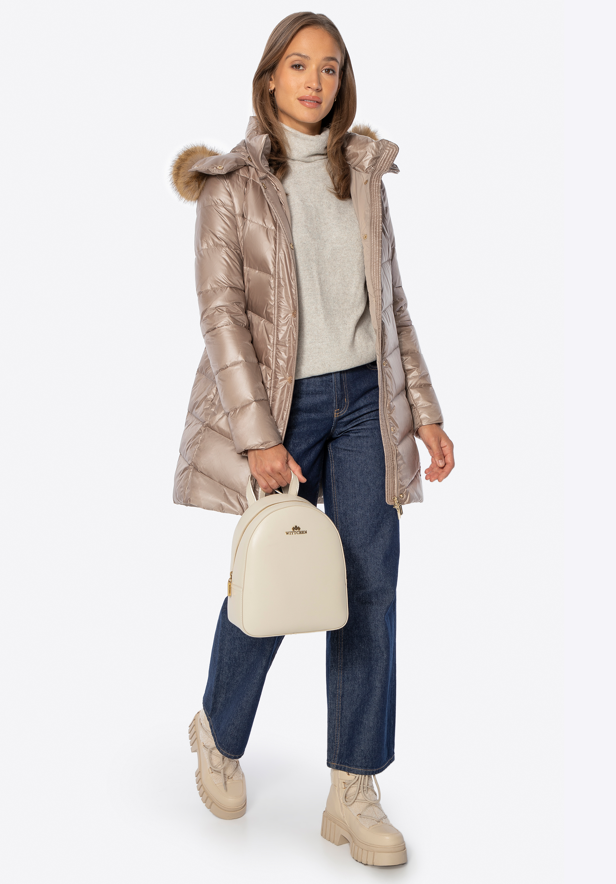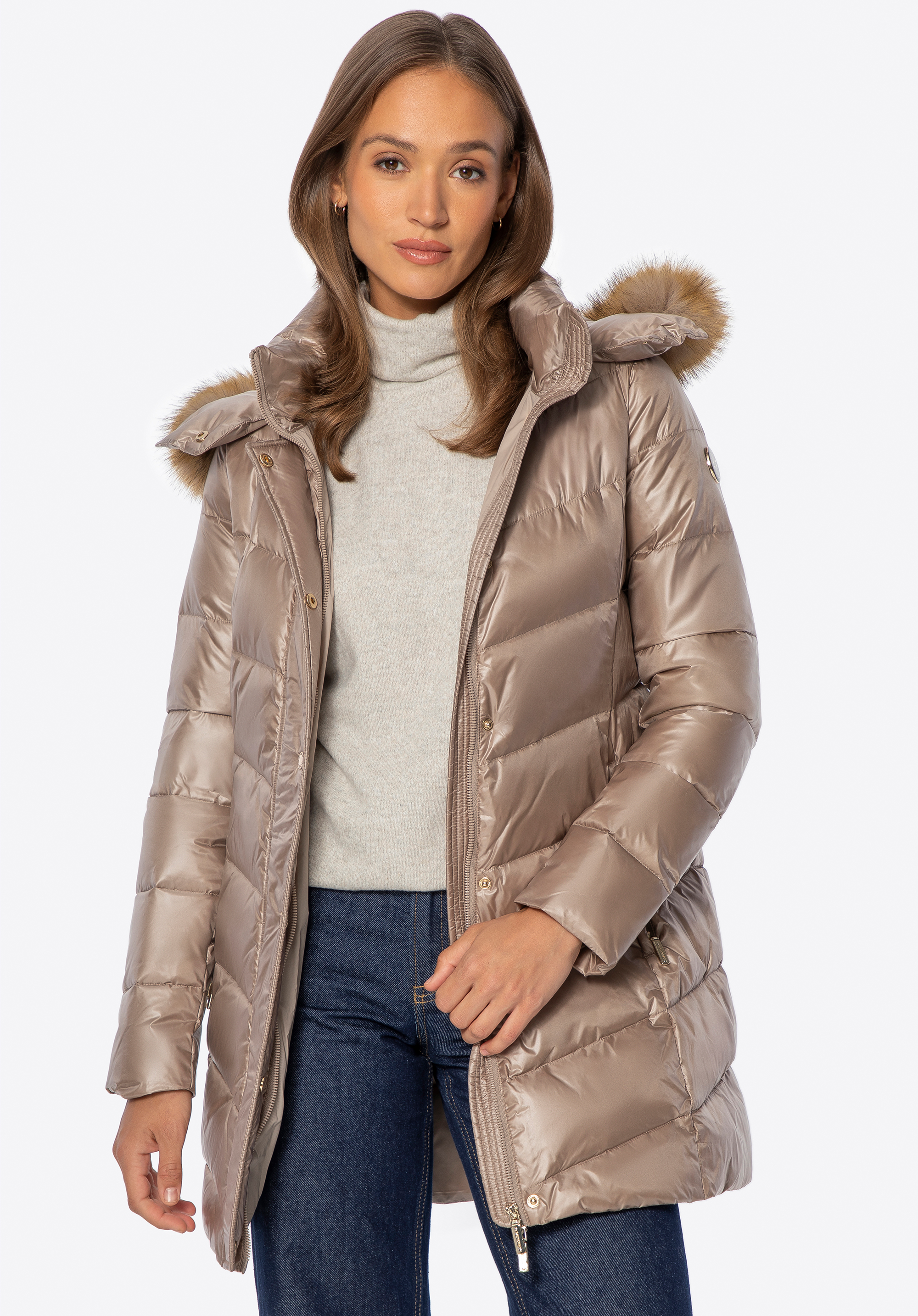 - Odnímatelná kapuce: Zdobená měkkou umělou kožešinou , která dodává eleganci a umožňuje vám přizpůsobit vzhled různým příležitostem.