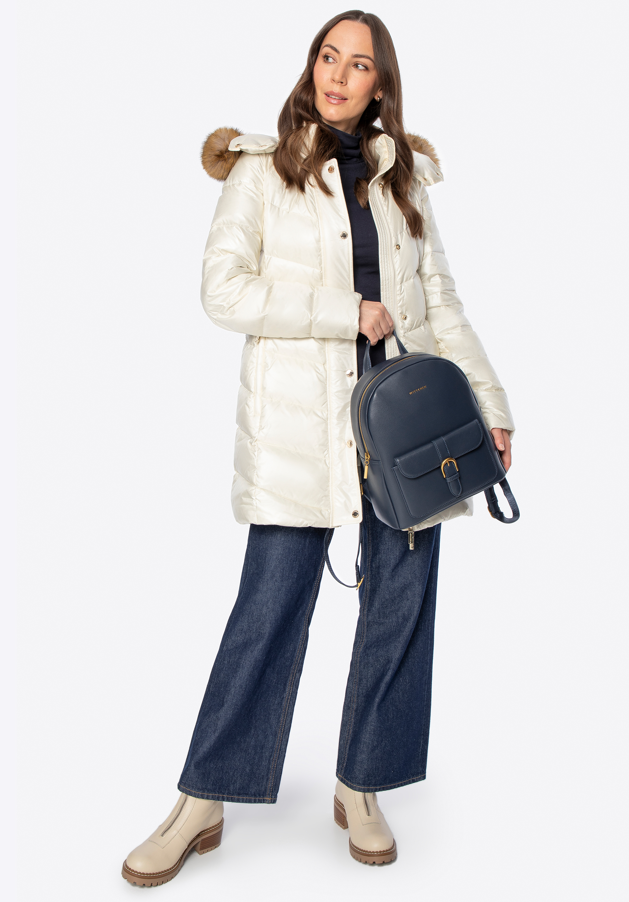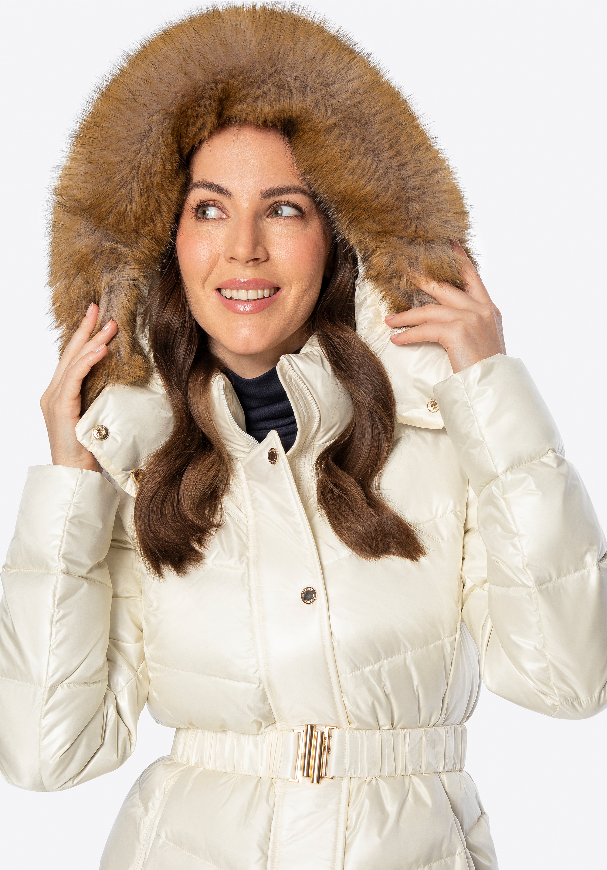 - Odnímatelná kapuce: Zdobená měkkou umělou kožešinou , která dodává eleganci a umožňuje vám přizpůsobit vzhled různým příležitostem.