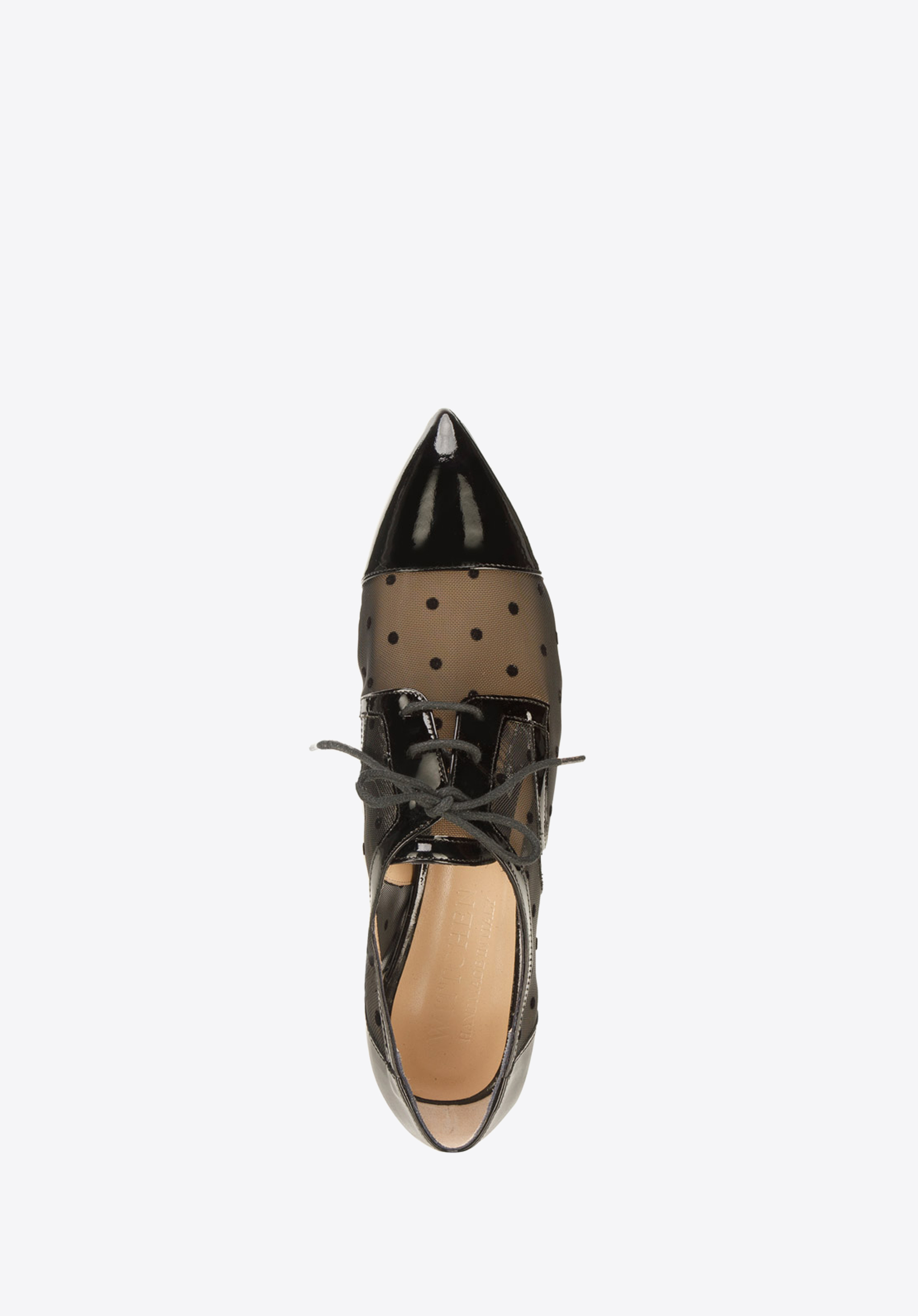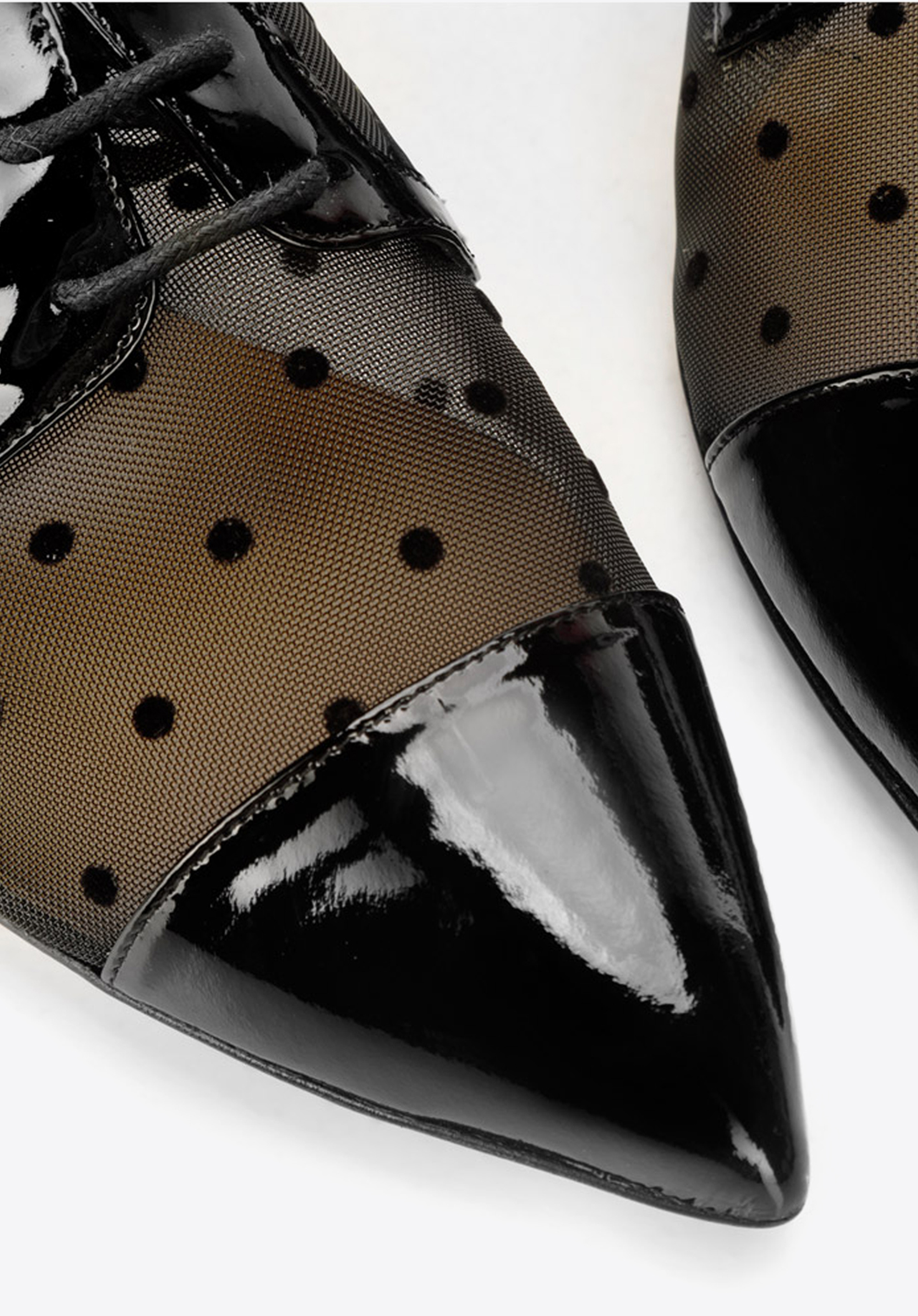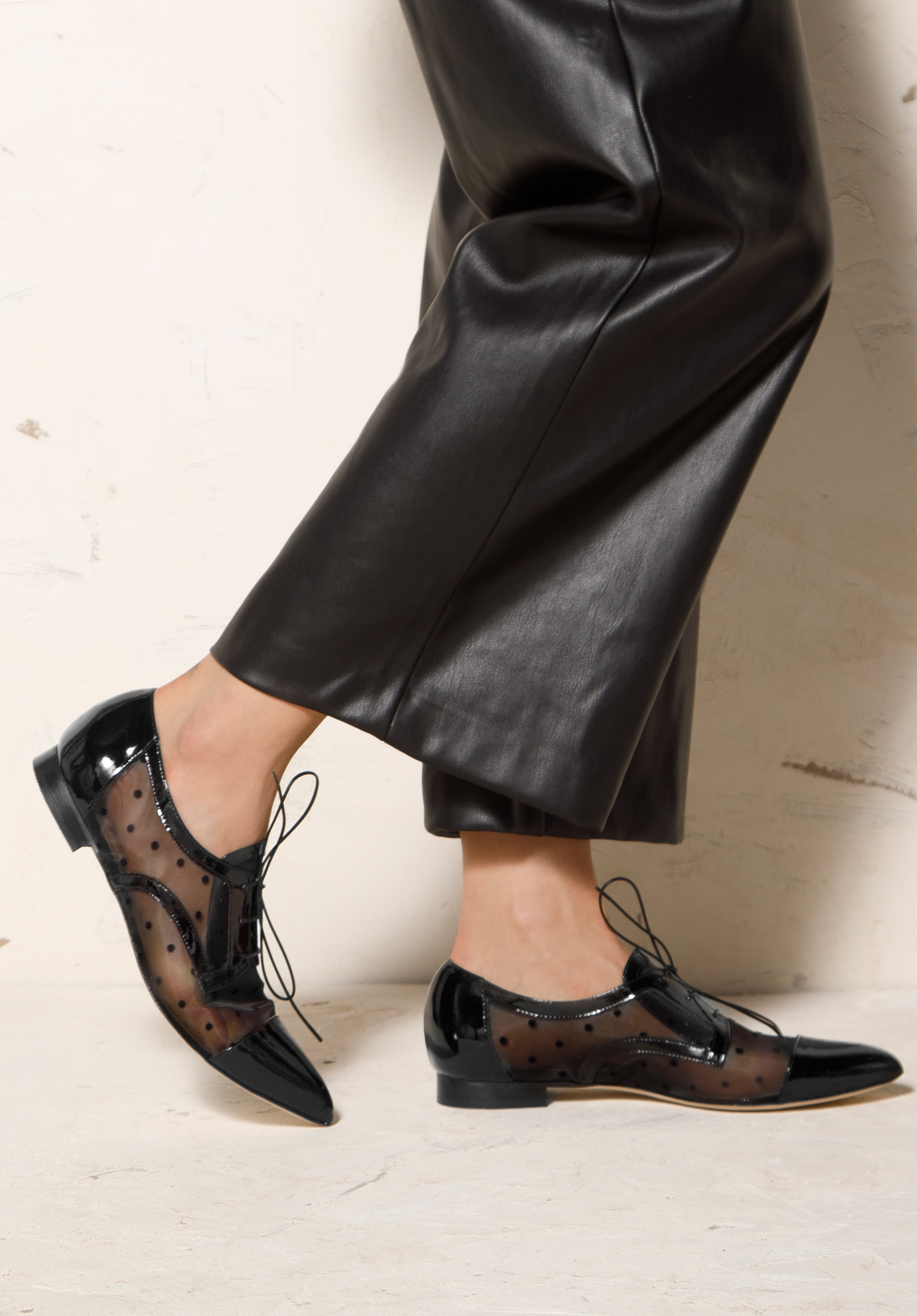 Tyto pohodlné dámské boty jsou inspirovány tanečními botami. Průhlednéboky jsou velmi elegantní. Podpatek je vyroben z lakované kůže. Kožená stélka s měkkou podšívkou postará se o pohodlí. Boty jsou ručně vyrobené z nejkvalitnější prioritní kůže v Itálii.
