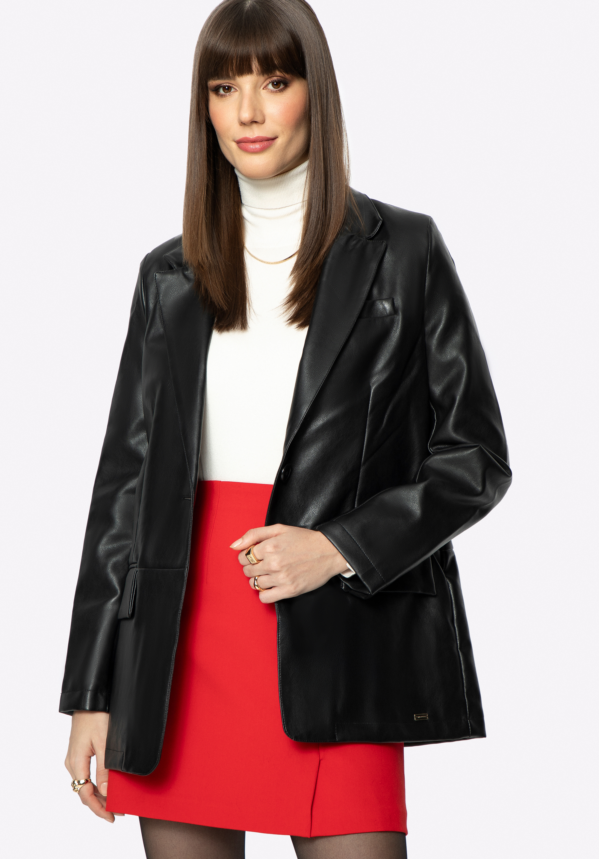Naše rada : pokud chcete dosáhnout celkového vzhledu, spojte tento sako s koženou sukní nebo kalhotami.