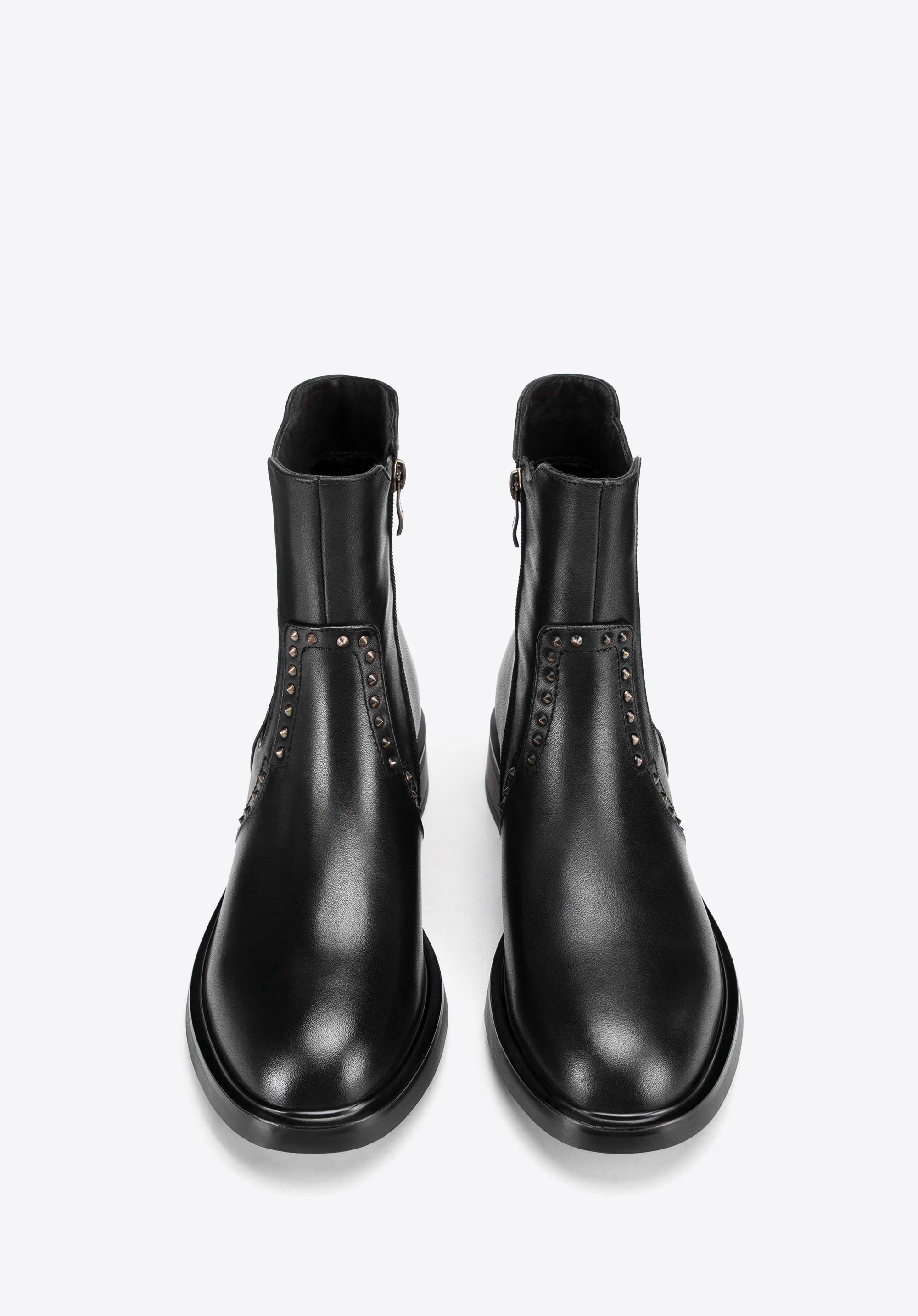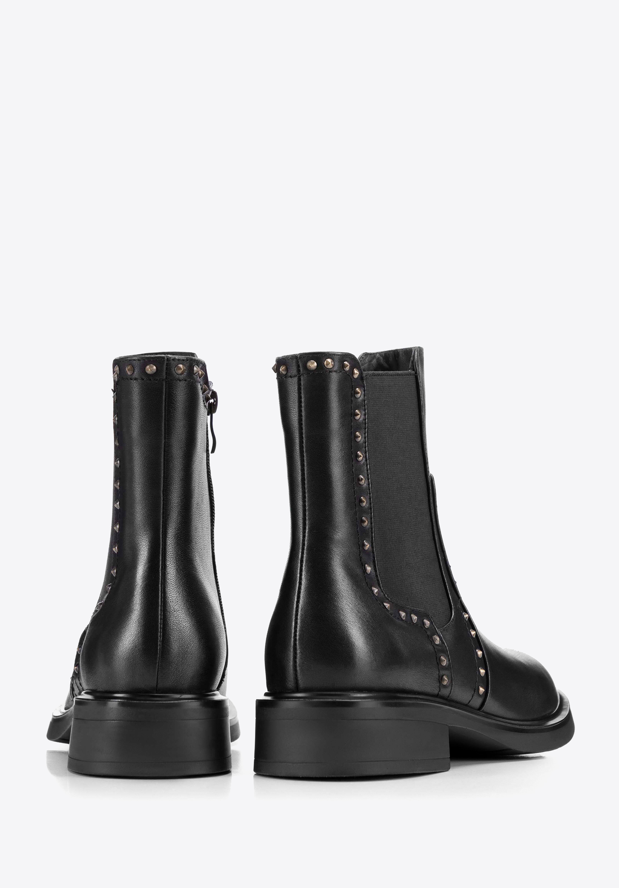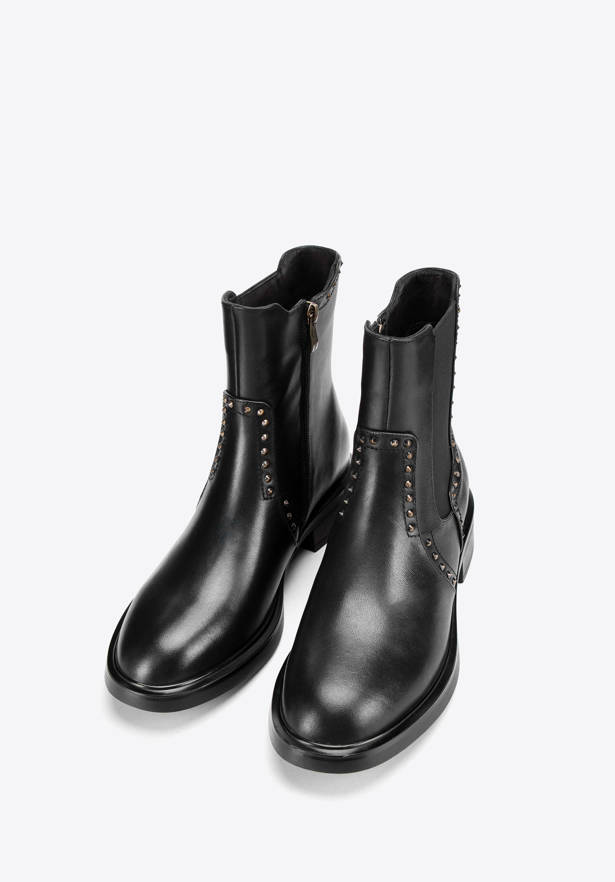 Kožené boty s ozdobnými nýty jsou dokonalou kombinací klasické elegance a jemného rockového akcentu. Vyrobeny z vysoce kvalitní přírodní kůže, zajišťují odolnost a pohodlí po mnoho let. Díky nazouvaní a elastickým vsadkám a zipu obouvání je rychlé a pohodlné. Ozdobné nýty dodávají charakter a zdůrazňují jedinečný styl obuvi.