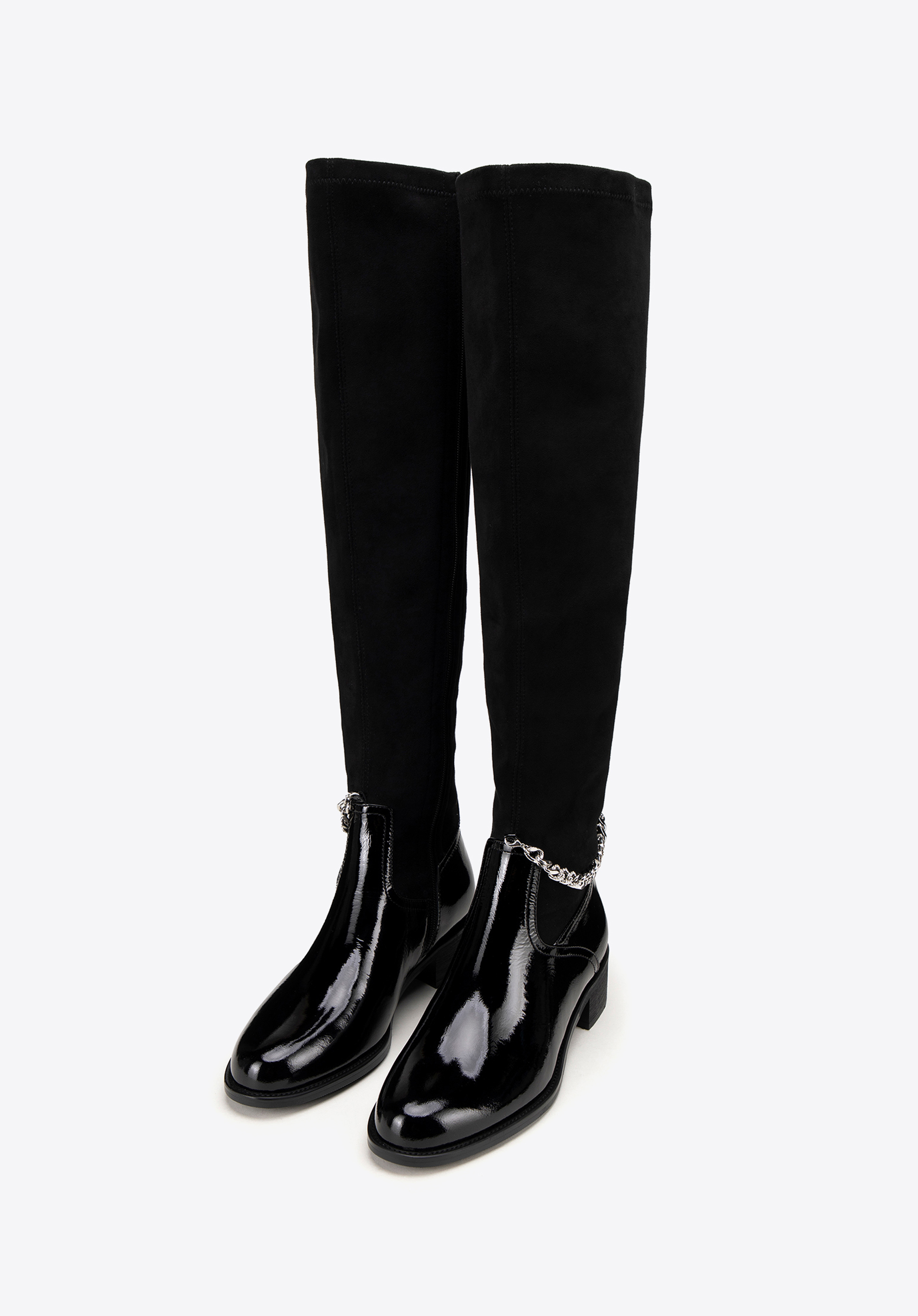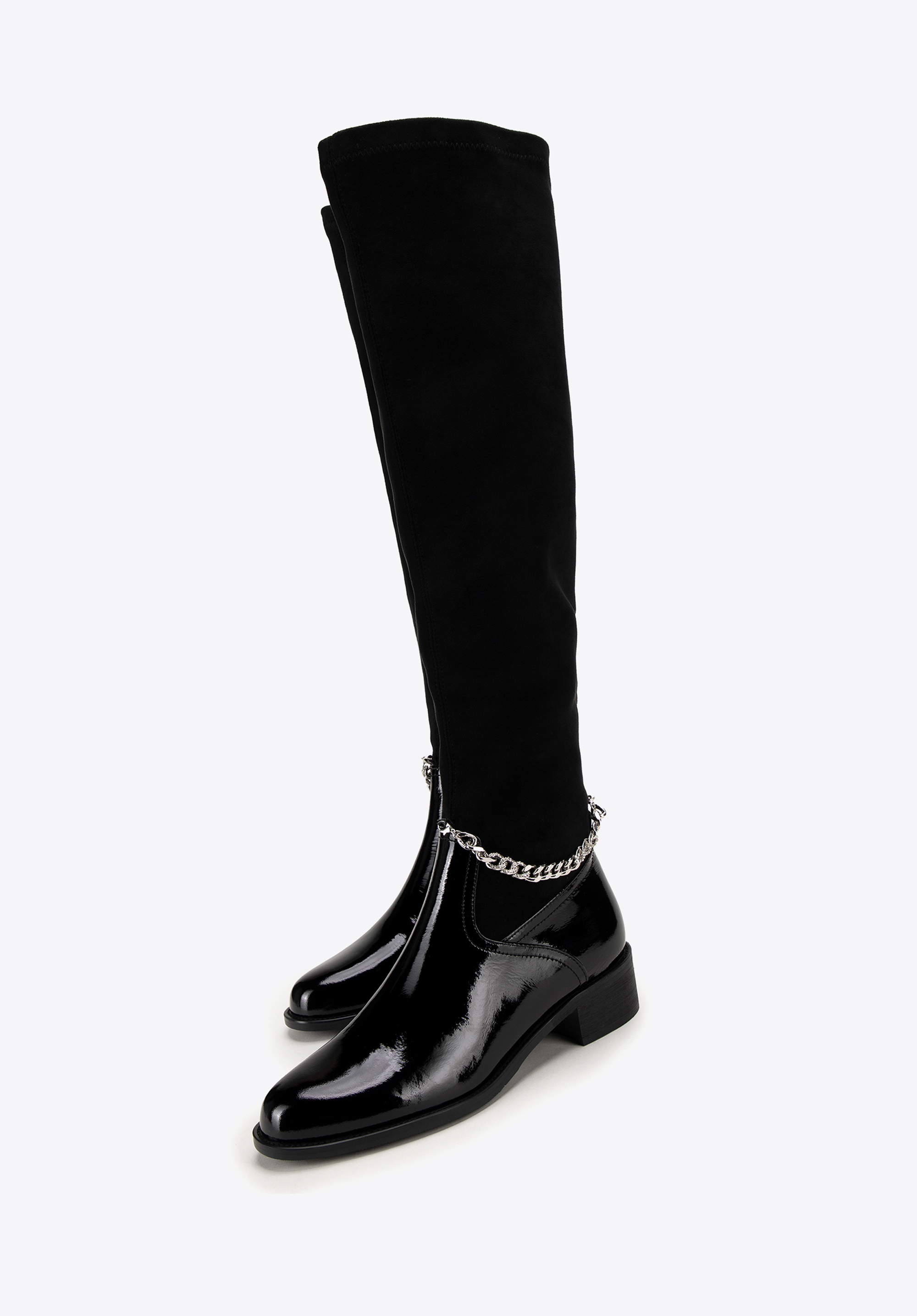 Poznejte dámské kozačky, které se stanou vaším oblíbeným prvkem vašeho šatníku! Díky štíhlému tvaru a řetízku připevněnému na boku tyto boty jsou perfektní volbou pro ženy, které cení klasický styl s nádechem elegance. Jsou ideální pro chladnější měsíce, dodávají styl a teplo každému obleku. Zapínají se na zip a se špičkou ve tvaru mandle, jsou pohodlné a snadno se nazouvají.
