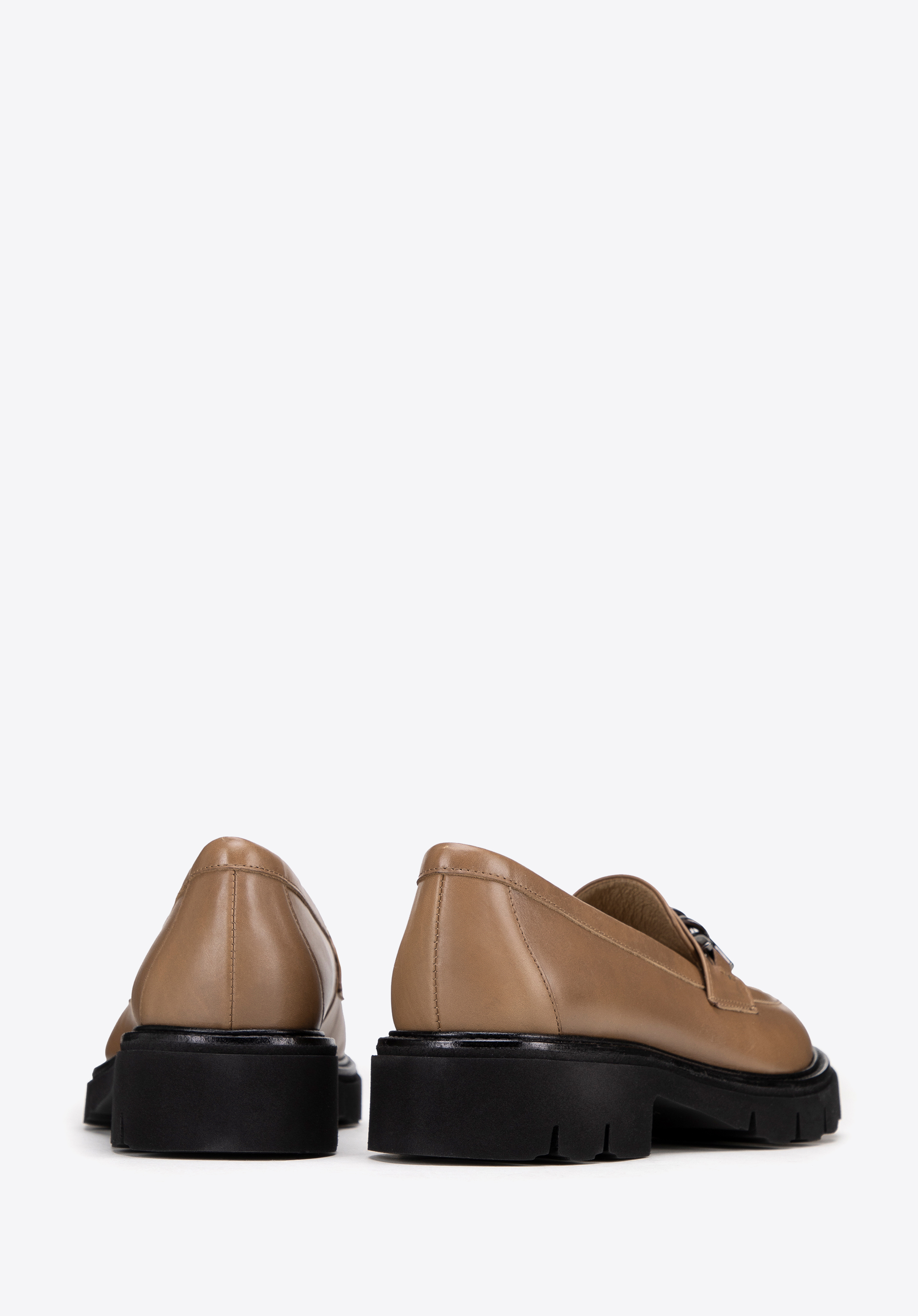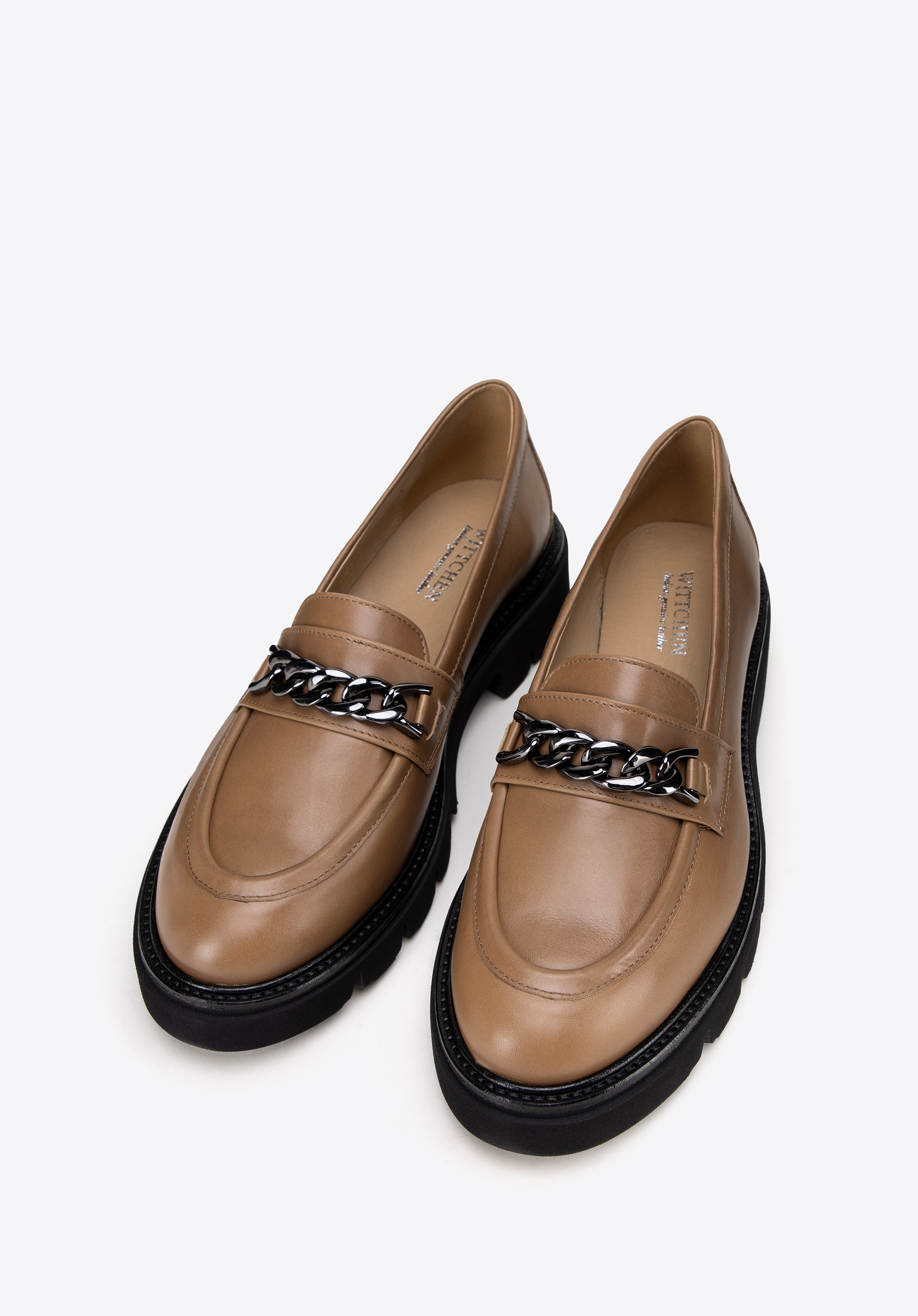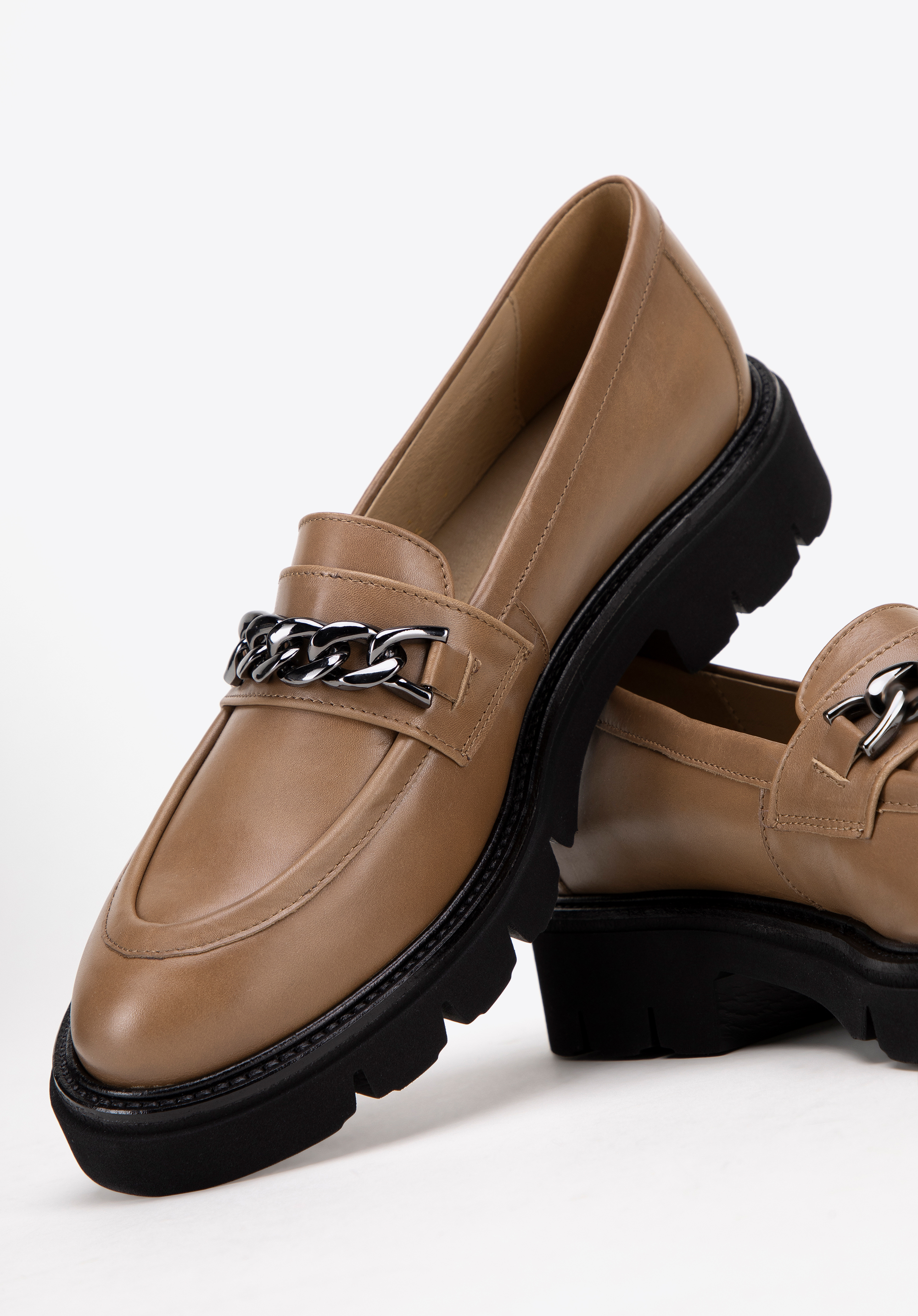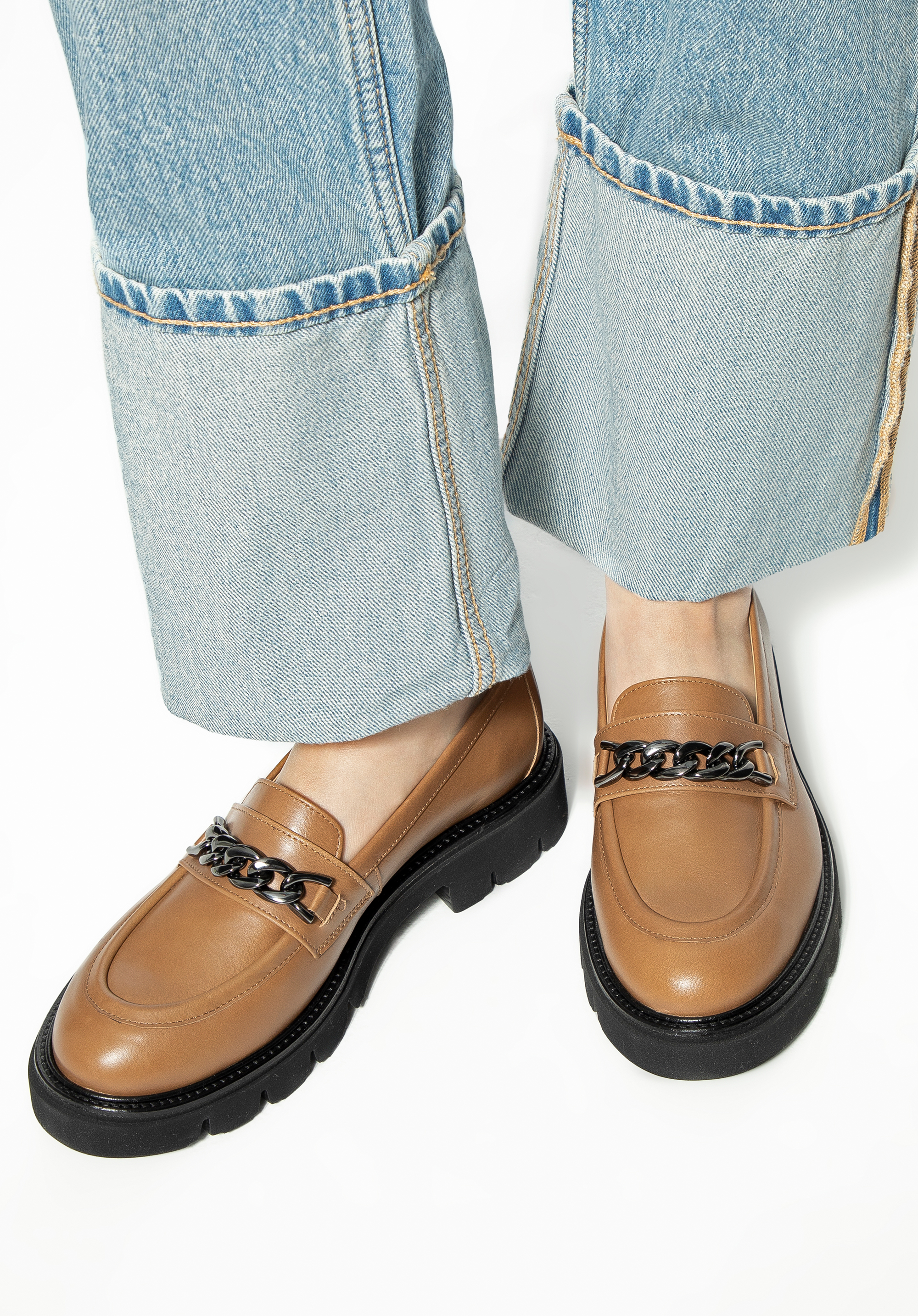 Objevte eleganci a pohodlí v jednom s našimi mokasíny vyrobenými z prvotřídní kůže . Tyto boty s plochým podpatkem , mandlovou špičkou a ozdobným řetízkem na svršku kombinují moderní styl s nádechem luxusu. Robustní podešev s kleštěmi zajišťuje stabilitu a pohodlí, což vám umožní vychutnat si každý krok bez obav z nepohodlí. Špička ve tvaru mandle opticky prodlužuje nohy a dodává jemné kouzlo každému outfitu.