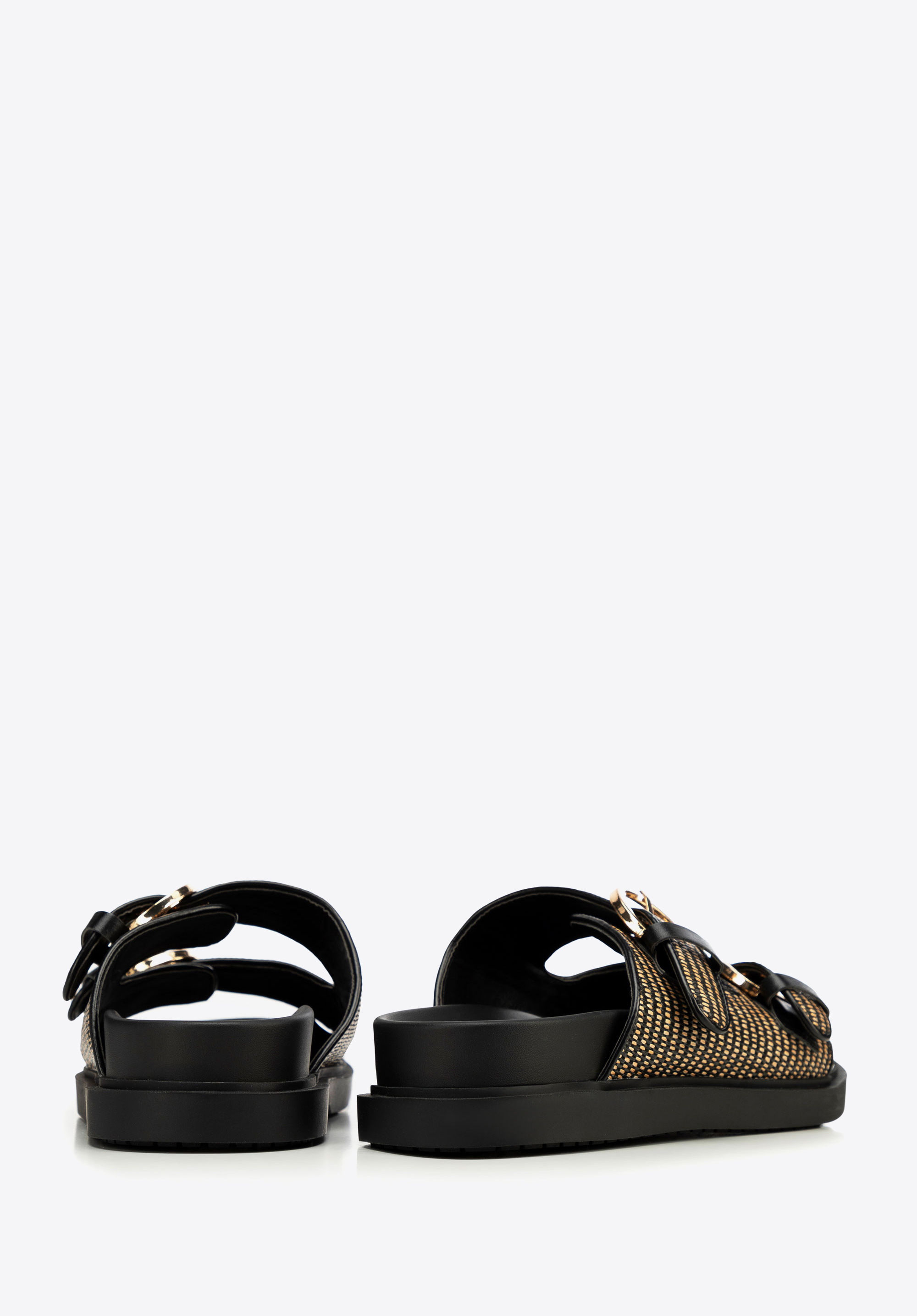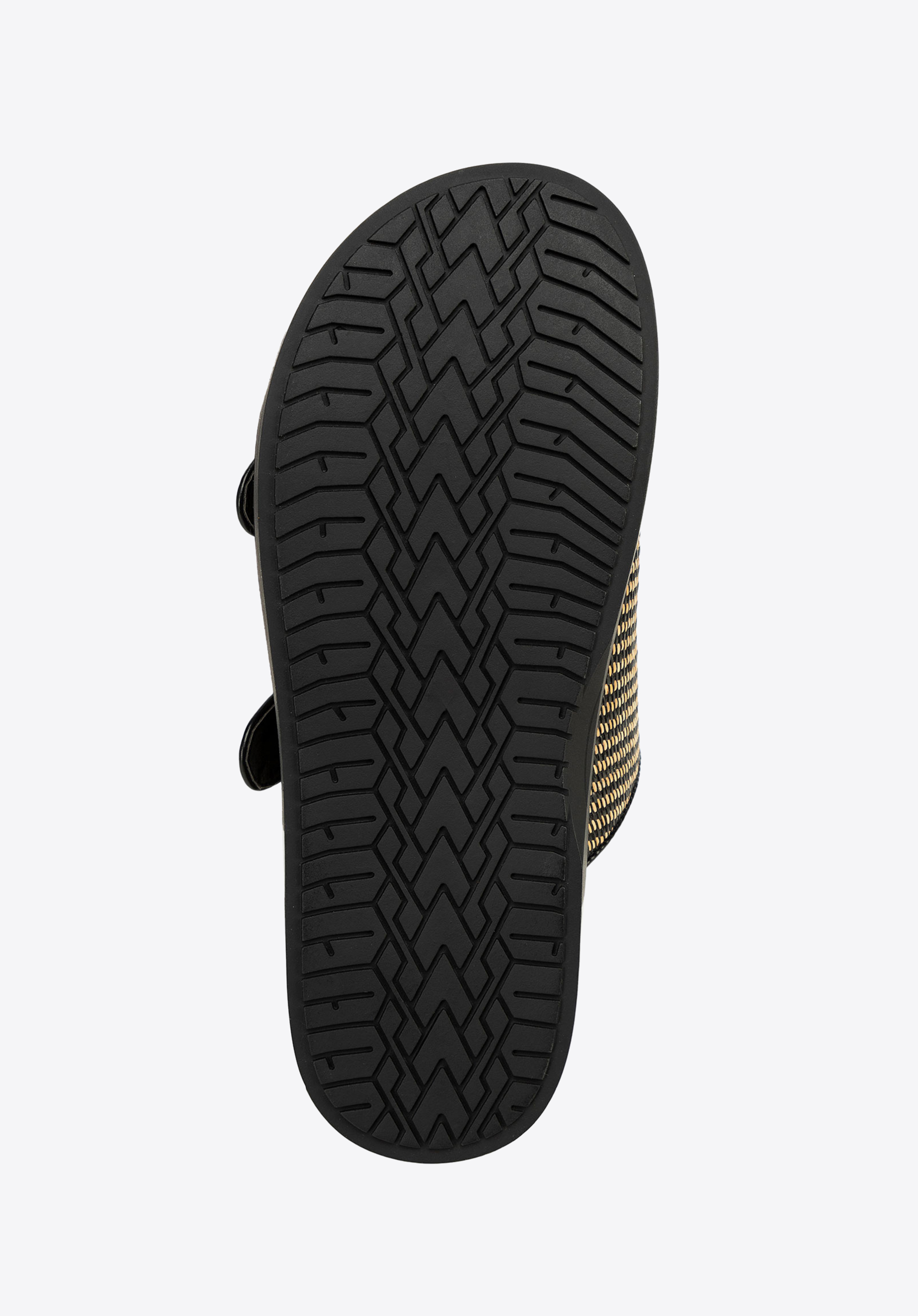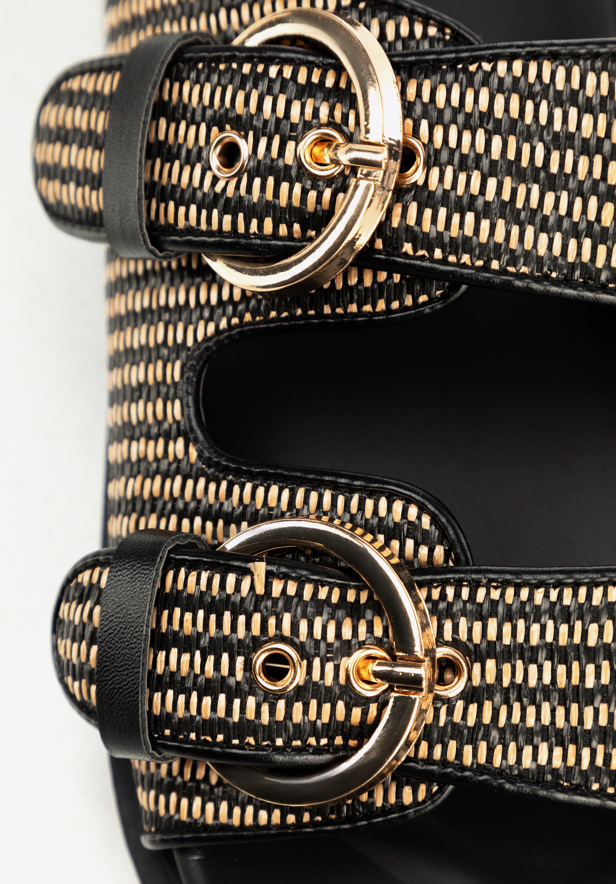 Lehké a plné letního kouzla – tyto dámské sandály jsou perfektní volbou pro horké dny. Jsou vyrobeny z tkaného materiálu s efektem rafie a kombinují pohodlí s nenuceným stylovým vzhledem inspirovaným boho. Dva nastavitelné pásky s jemnými přezkami zajišťují přesné padnutí, zatímco mandlový tvar špičky zvyšuje jejich letní vzhled.