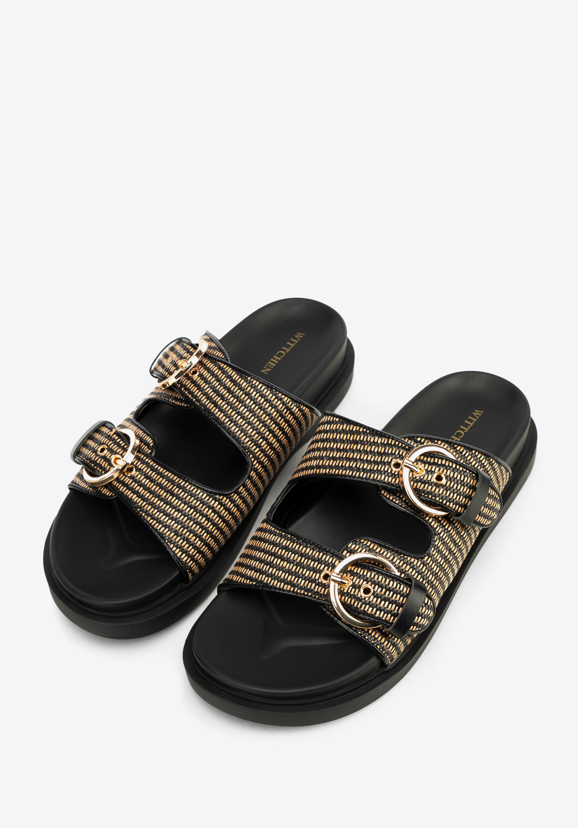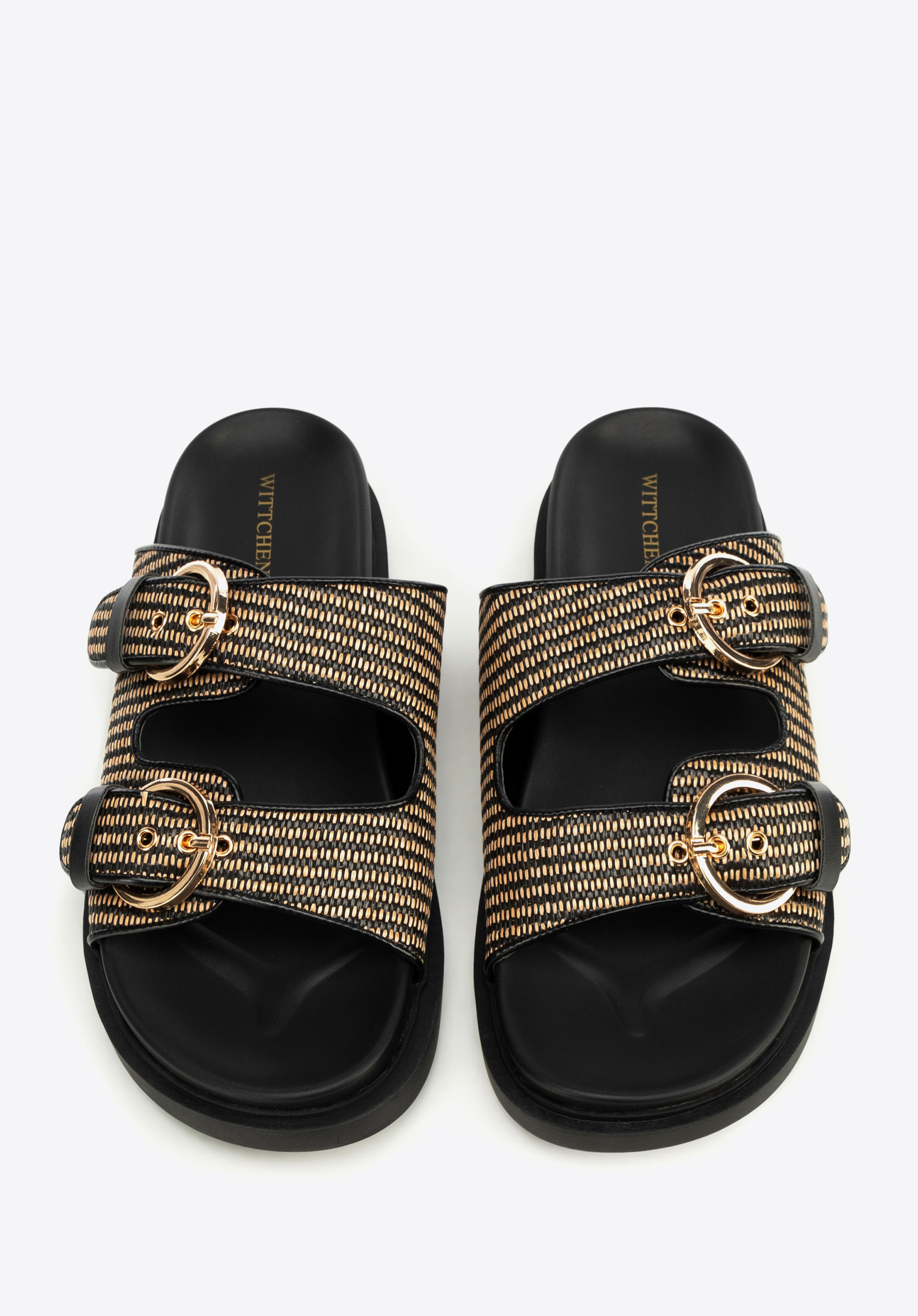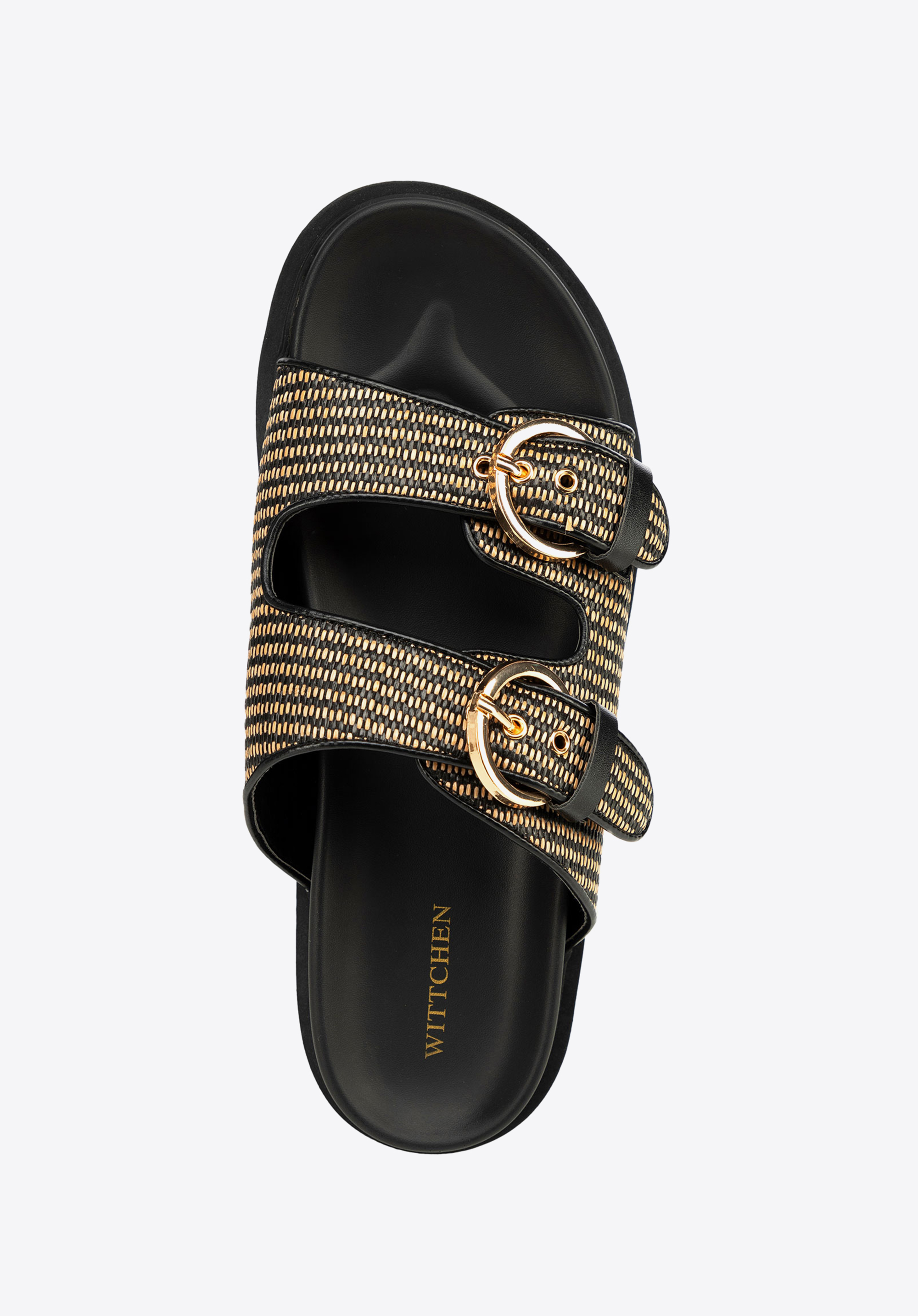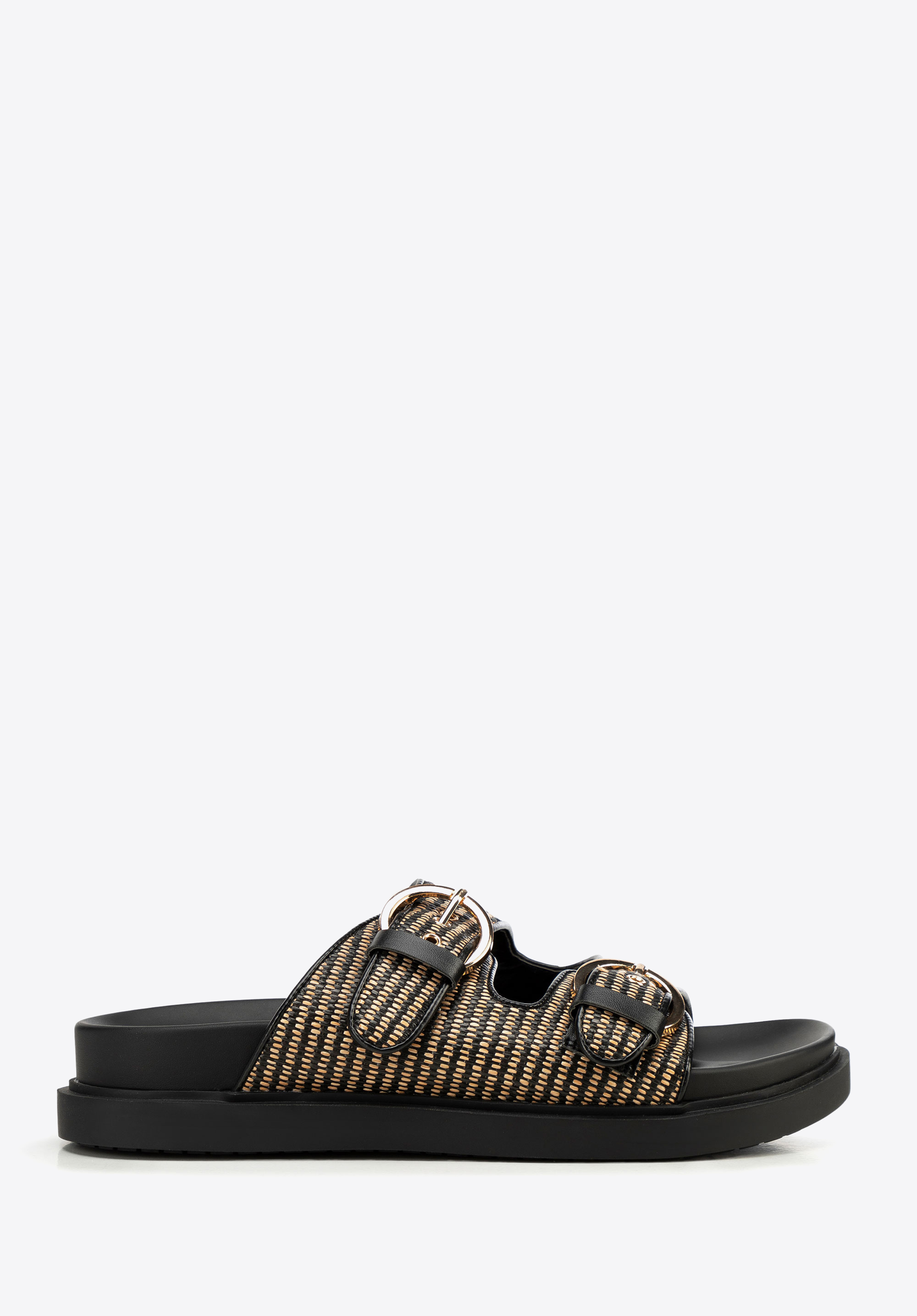 Lehké a plné letního kouzla – tyto dámské sandály jsou perfektní volbou pro horké dny. Jsou vyrobeny z tkaného materiálu s efektem rafie a kombinují pohodlí s nenuceným stylovým vzhledem inspirovaným boho. Dva nastavitelné pásky s jemnými přezkami zajišťují přesné padnutí, zatímco mandlový tvar špičky zvyšuje jejich letní vzhled.