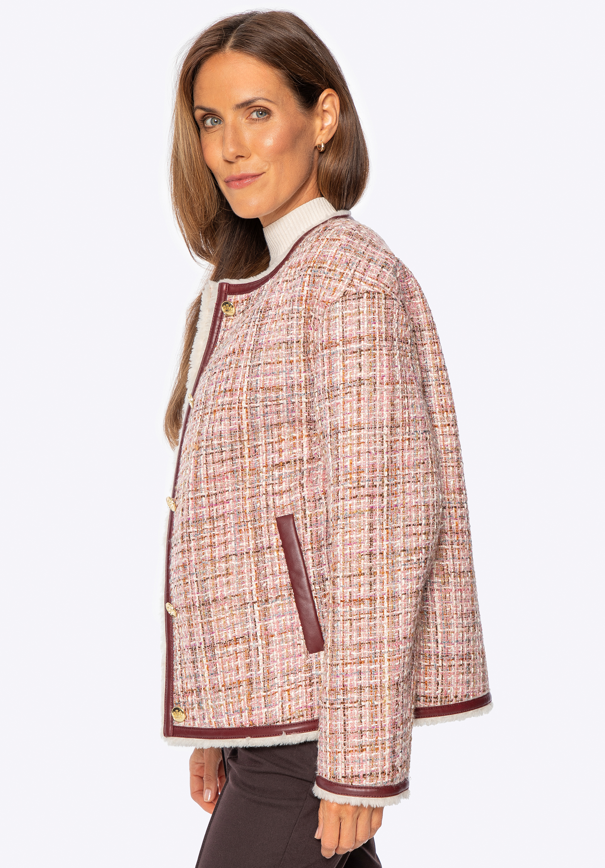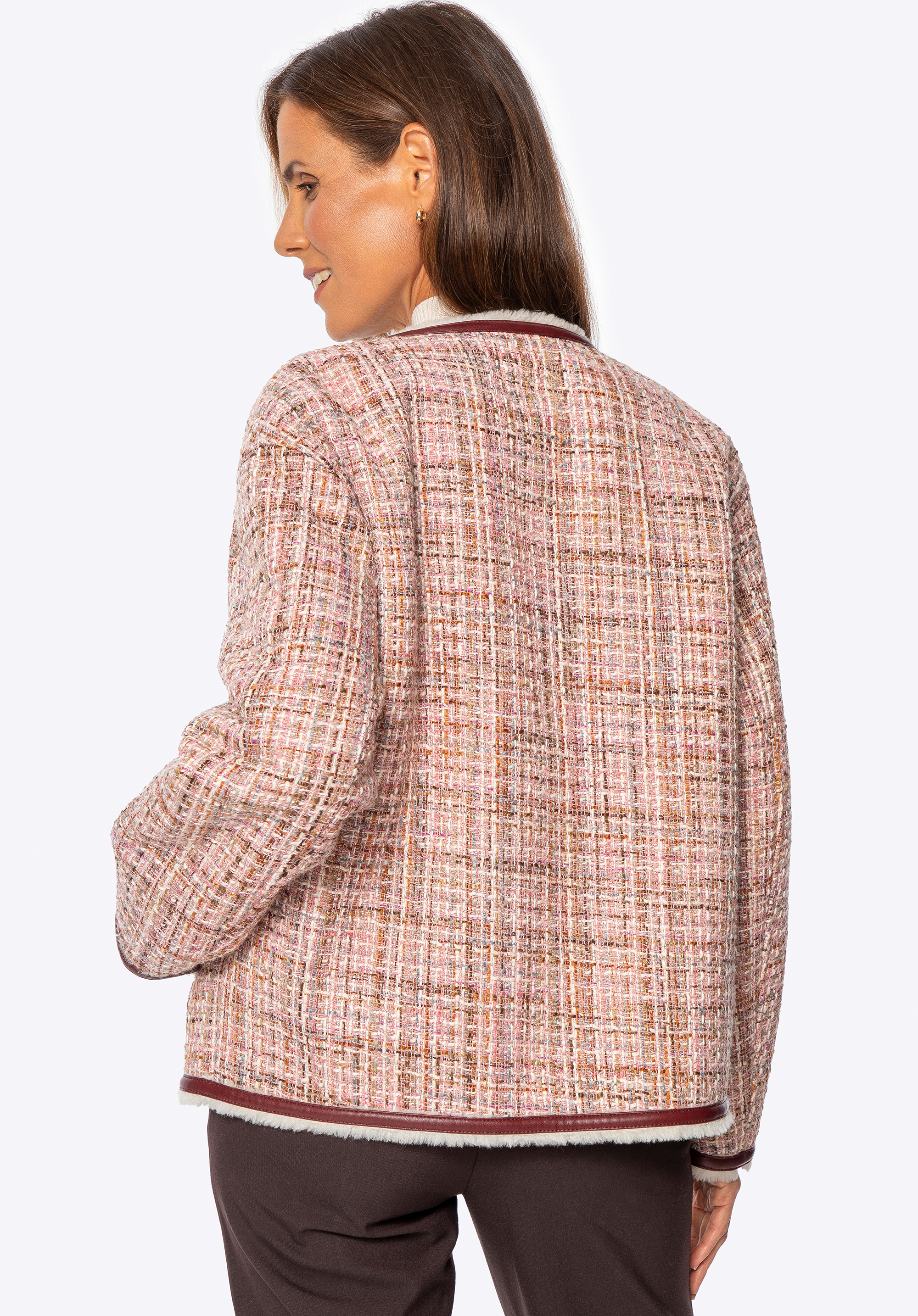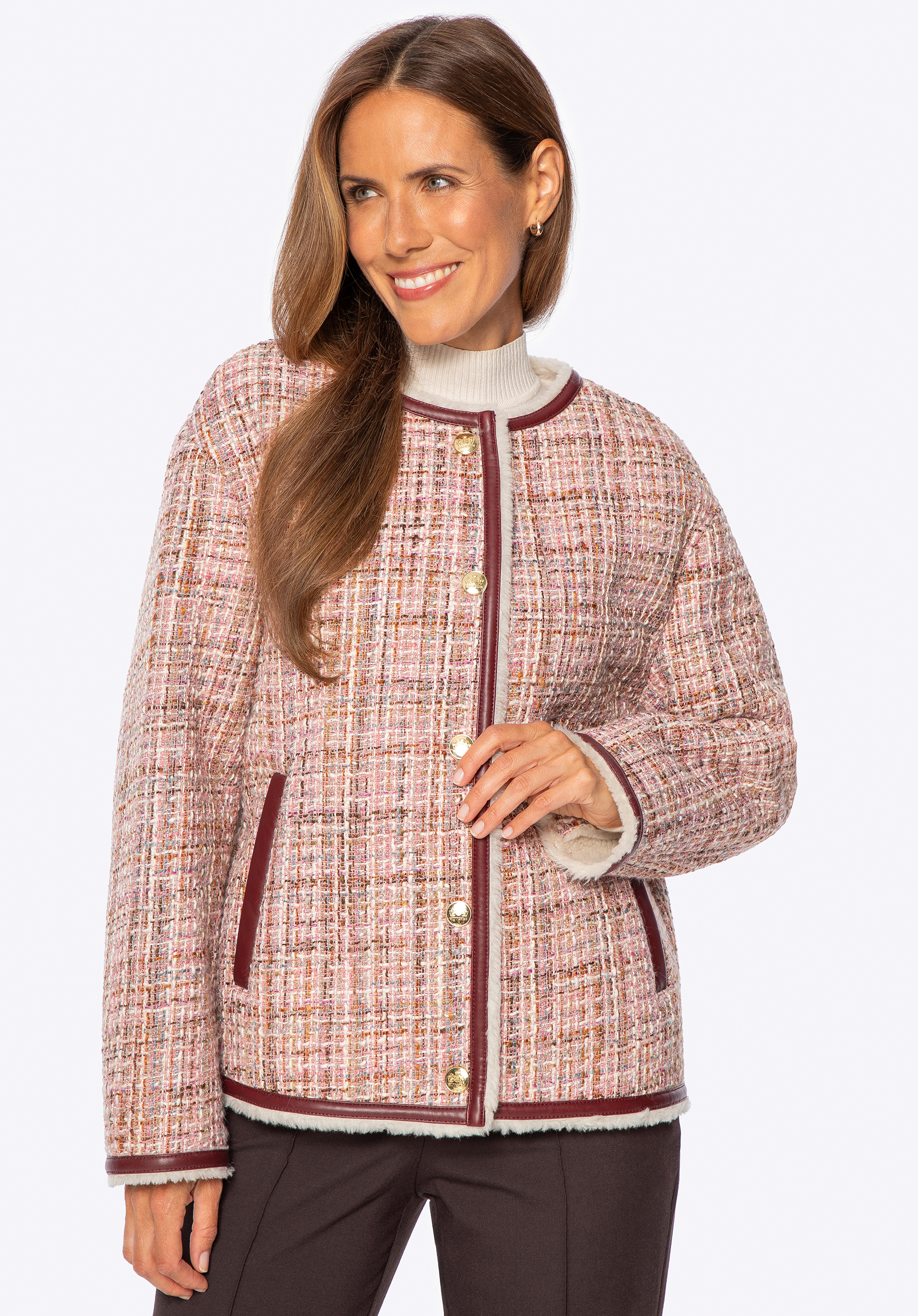 Ponořte se do klasické elegance s moderním nádechem s tímto jedinečným tvídovým sakem . Je vyrobeno z texturovaného polyesteru s jemnými, vícebarevnými přízemi a okouzlí svým osobitým charakterem. Precizní povrchová úprava s kontrastními lemy a lesklými zlatými knoflíky zdůrazňuje sofistikovaný a rafinovaný styl tohoto kousku. Uvnitř je bunda vybavena teplou, měkkou podšívkou z umělé kožešiny , která vám zajistí pohodlí i v zimních podmínkách. Praktické kapsy zvyšují funkčnost, zatímco rovný oversize střih zaručuje volnost pohybu a skvělé pohodlí při nošení.