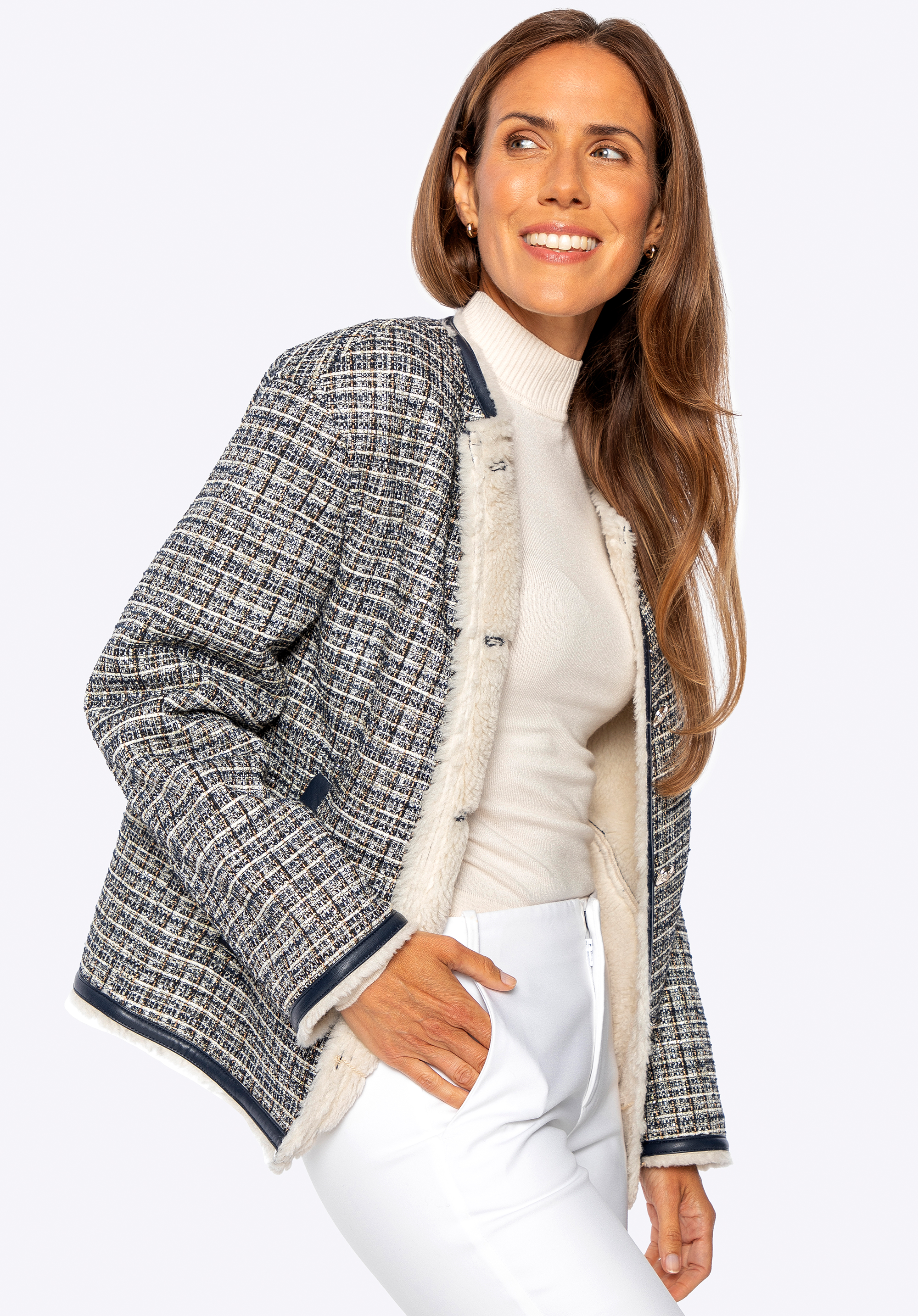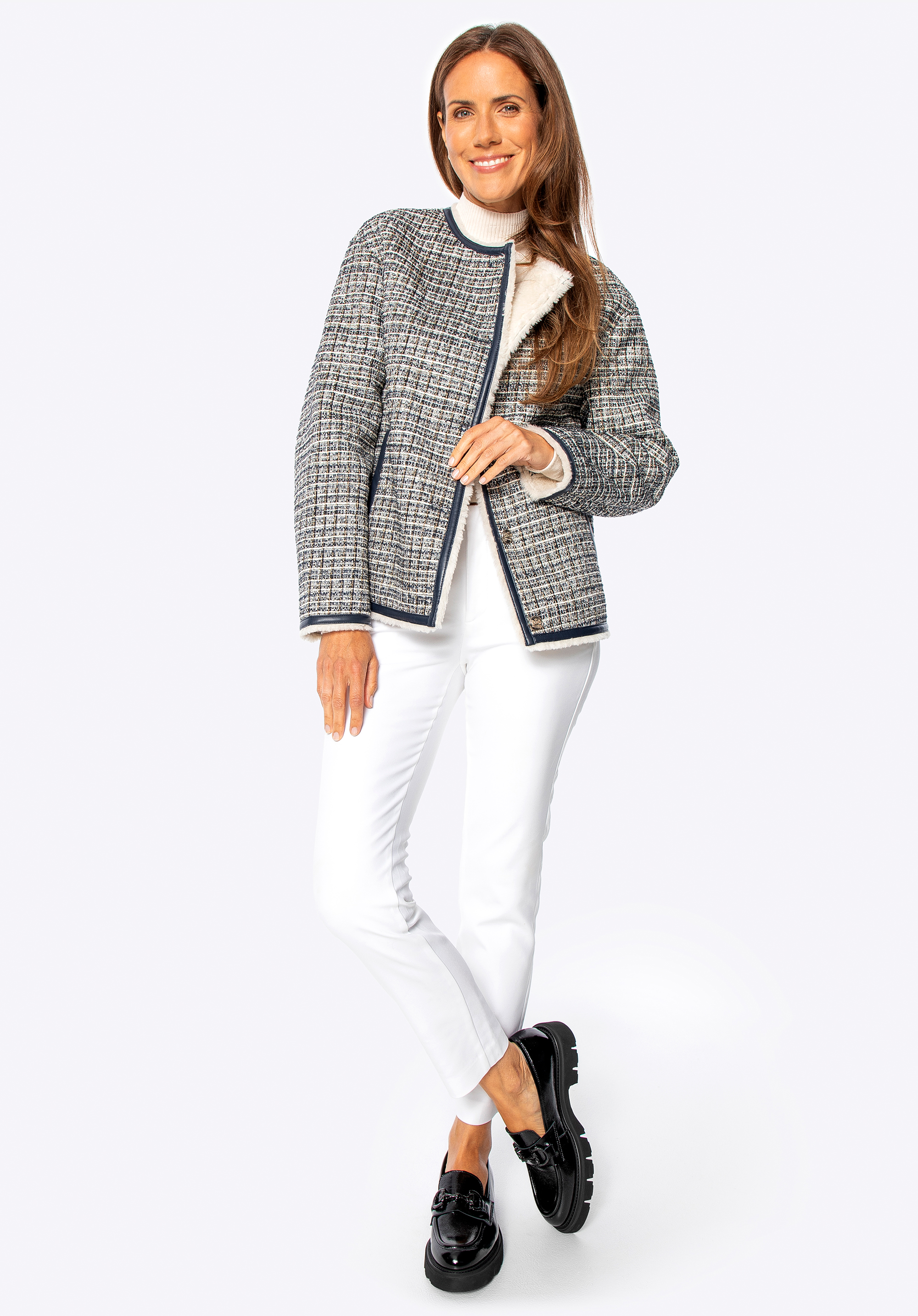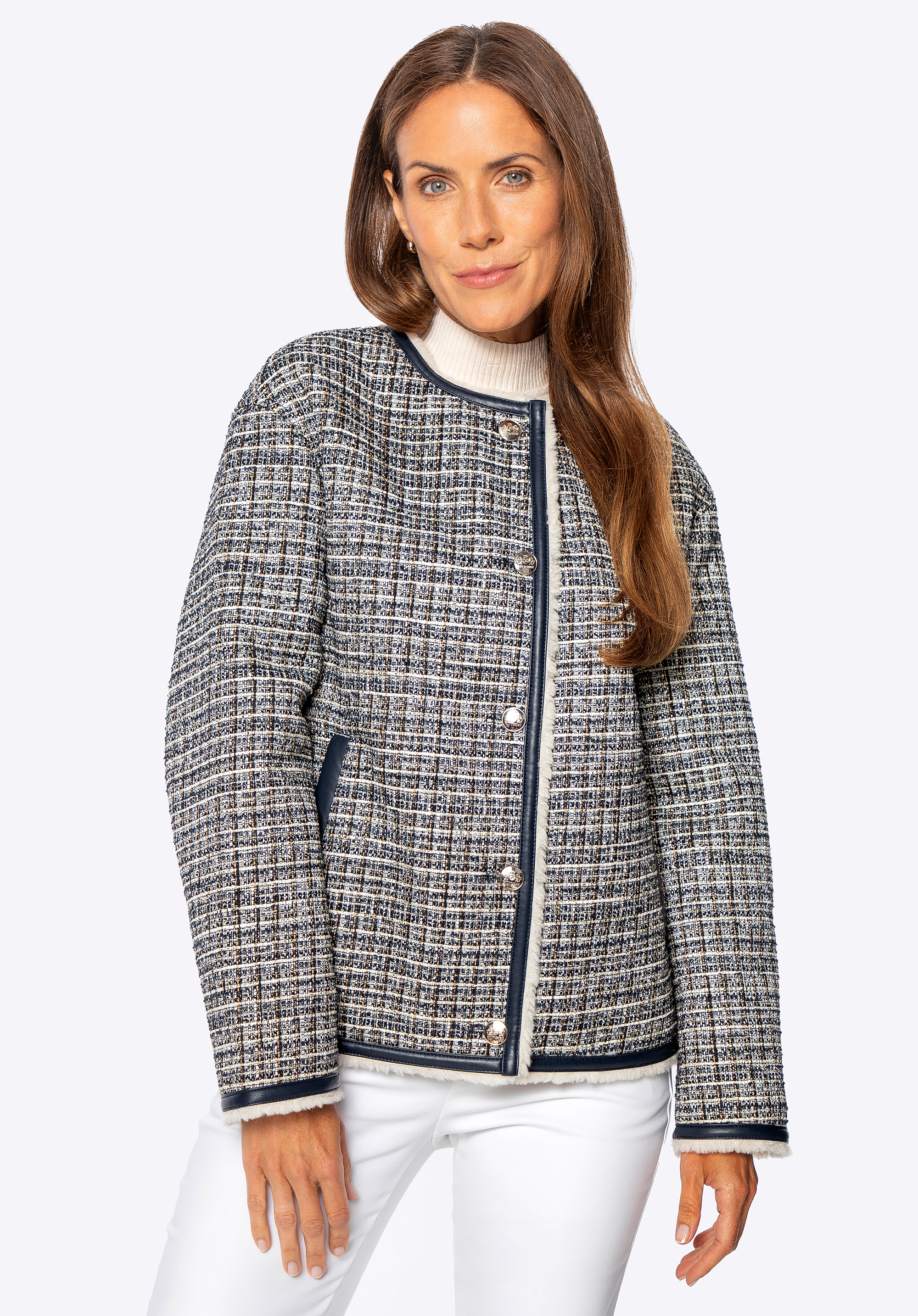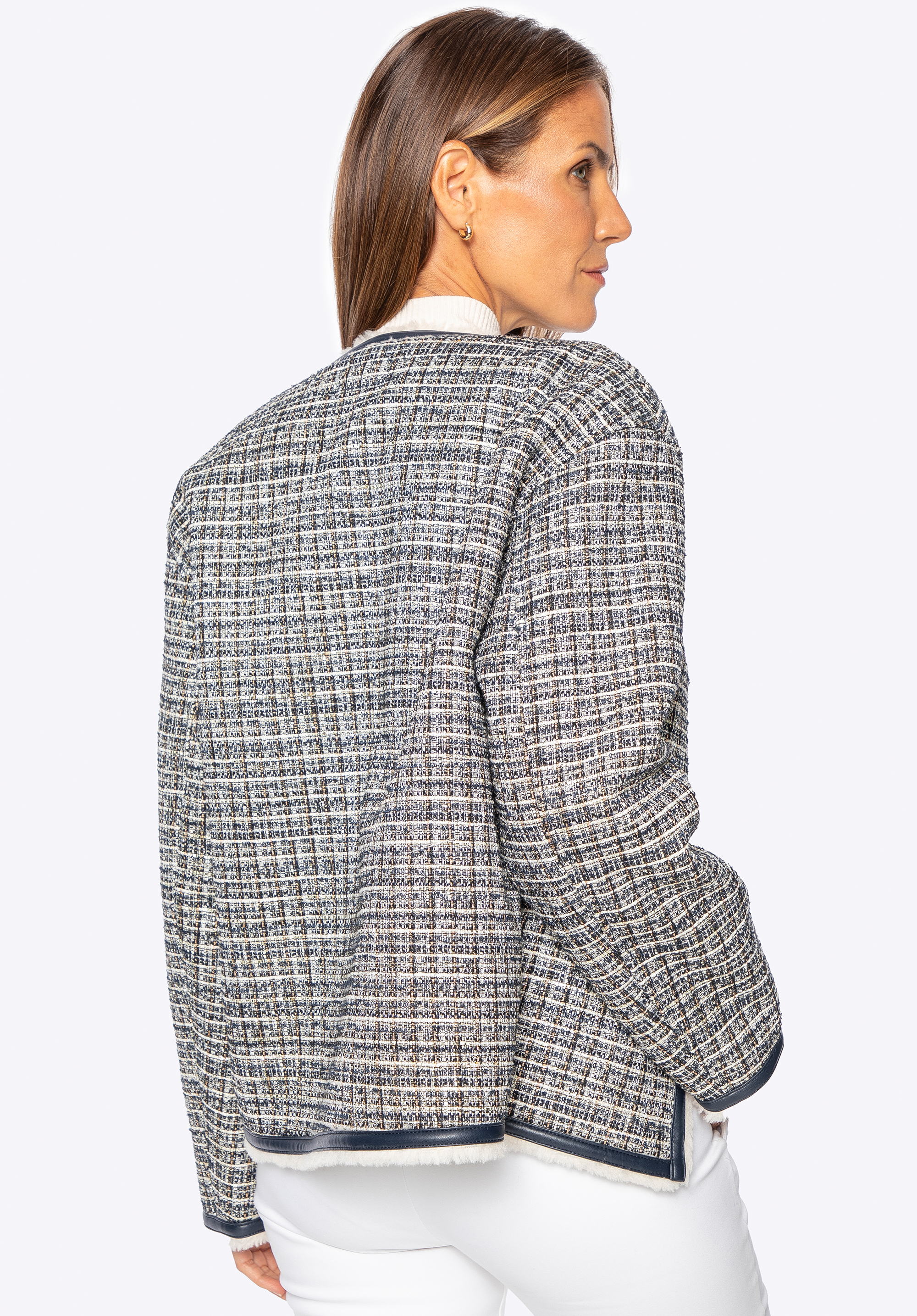 Ponořte se do klasické elegance s moderním nádechem s tímto jedinečným tvídovým sakem . Je vyrobeno z texturovaného polyesteru s jemnými, vícebarevnými přízemi a okouzlí svým osobitým charakterem. Precizní povrchová úprava s kontrastními lemy a lesklými zlatými knoflíky zdůrazňuje sofistikovaný a rafinovaný styl tohoto kousku. Uvnitř je bunda vybavena teplou, měkkou podšívkou z umělé kožešiny , která vám zajistí pohodlí i v zimních podmínkách. Praktické kapsy zvyšují funkčnost, zatímco rovný oversize střih zaručuje volnost pohybu a skvělé pohodlí při nošení.