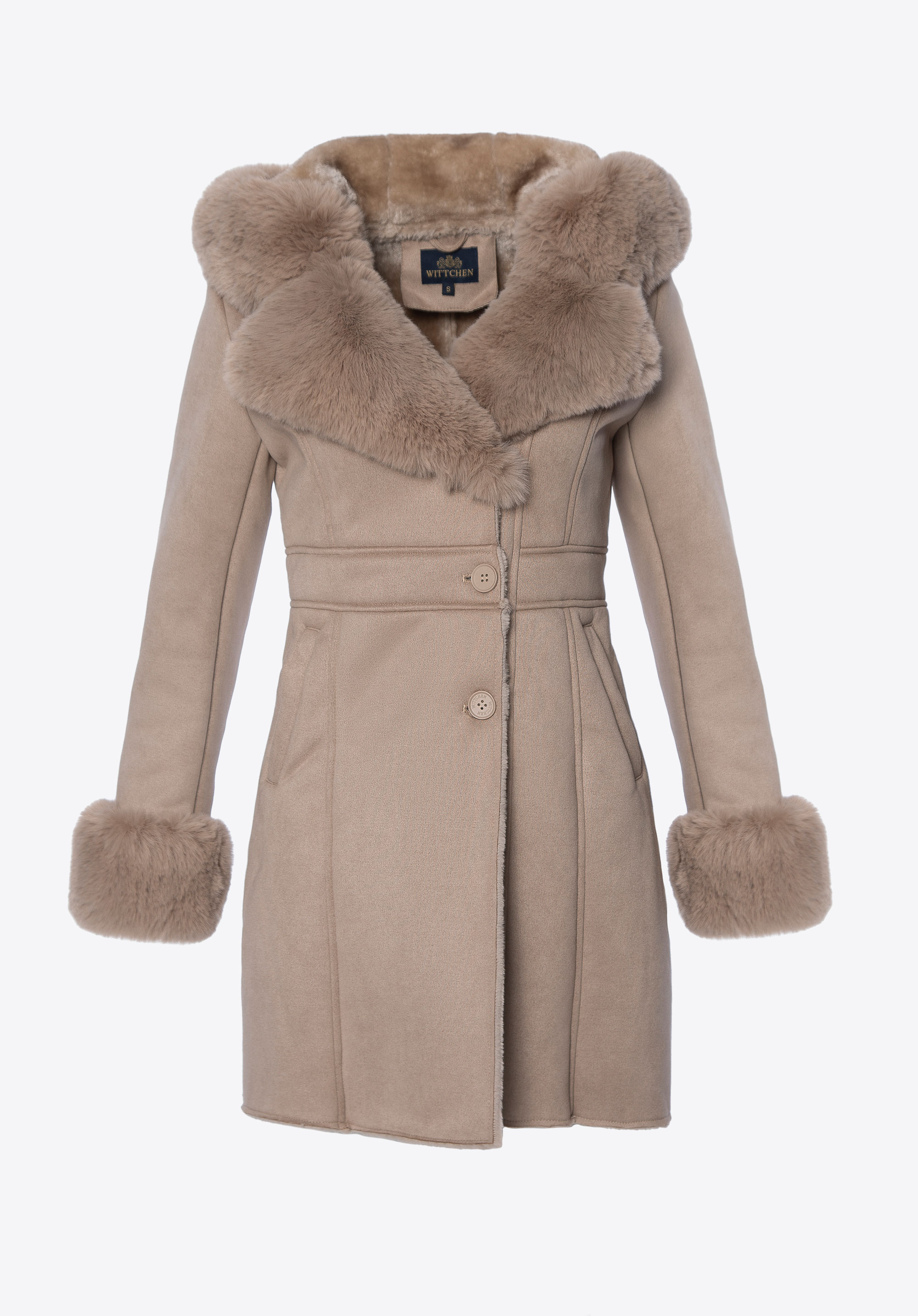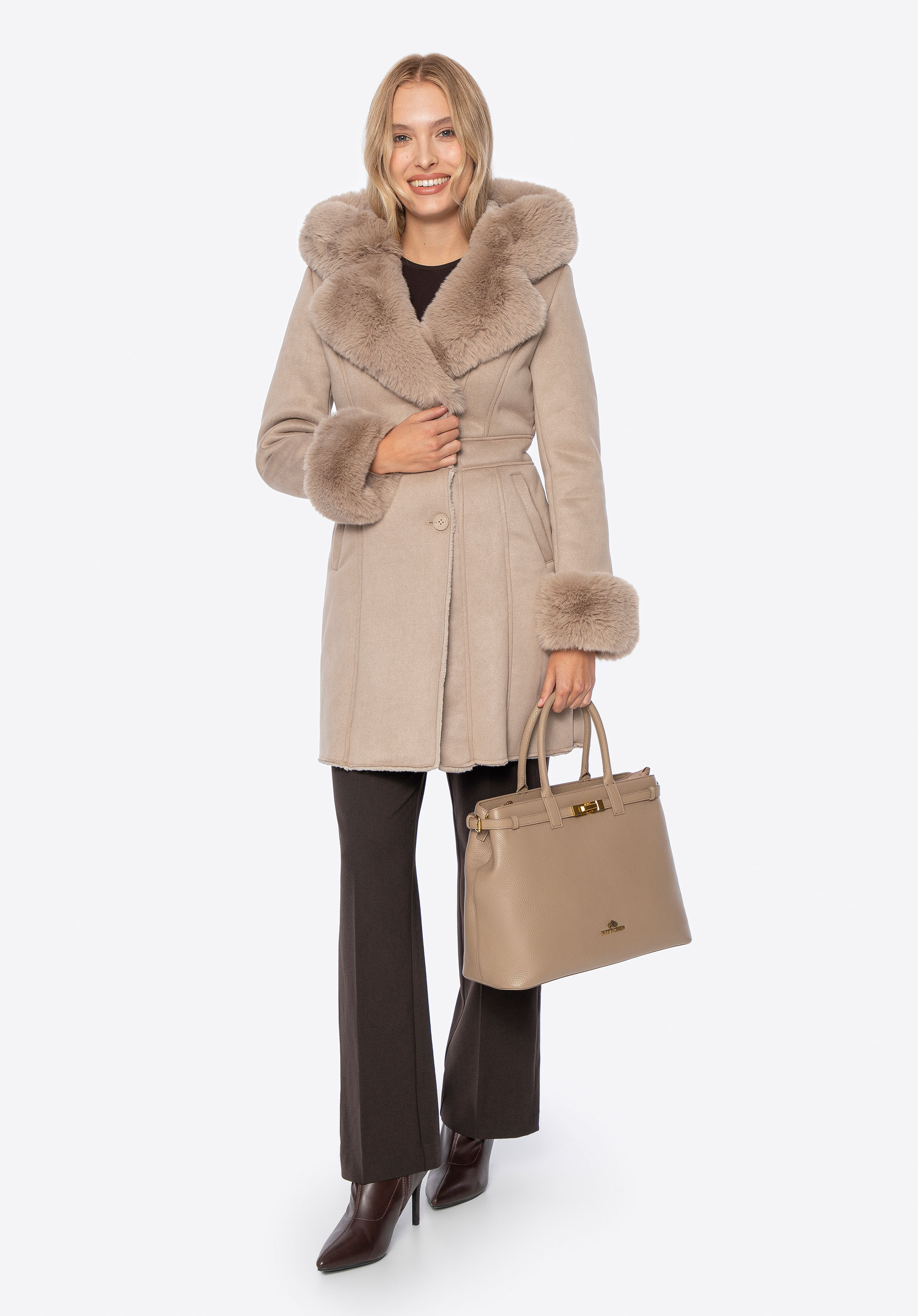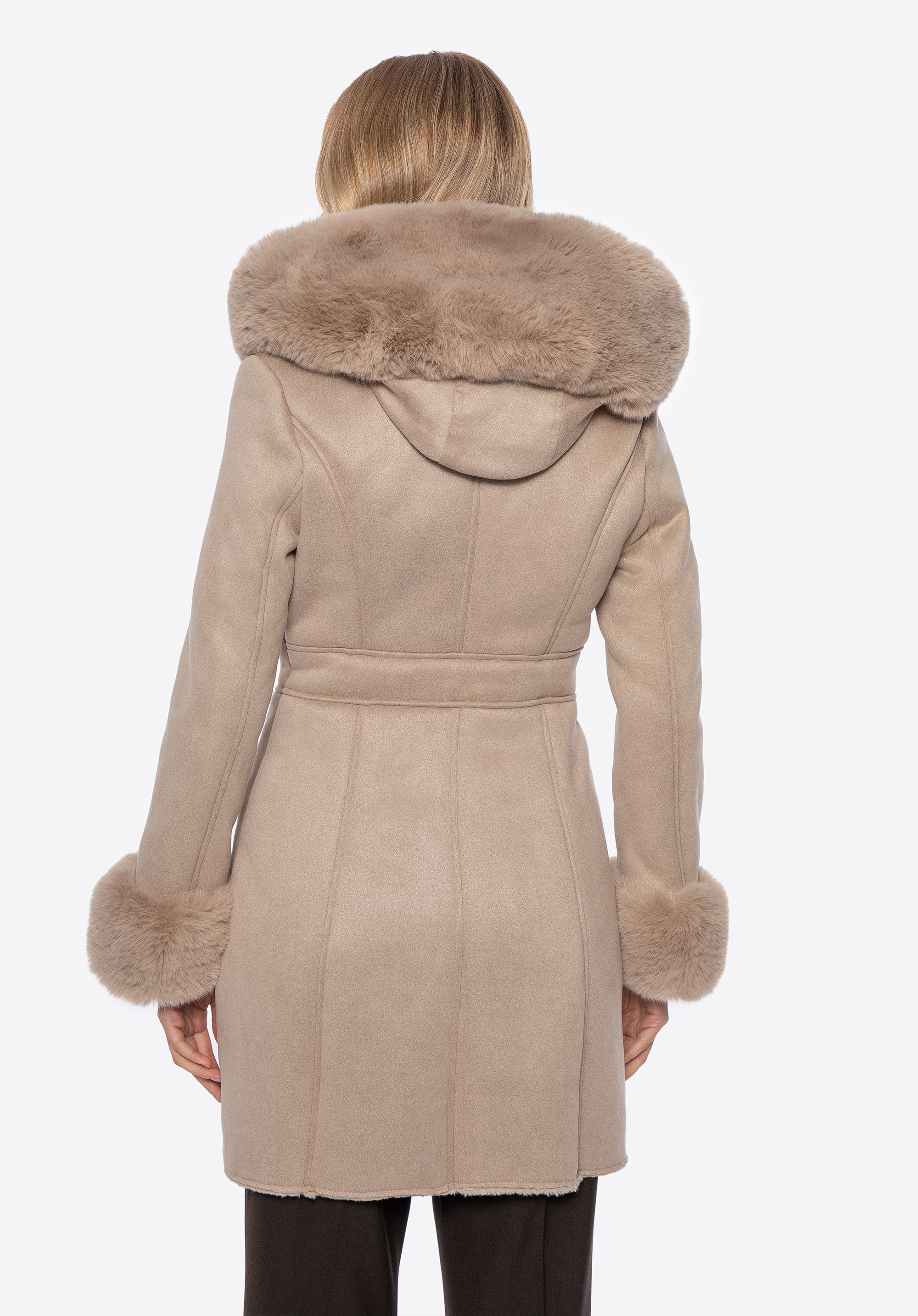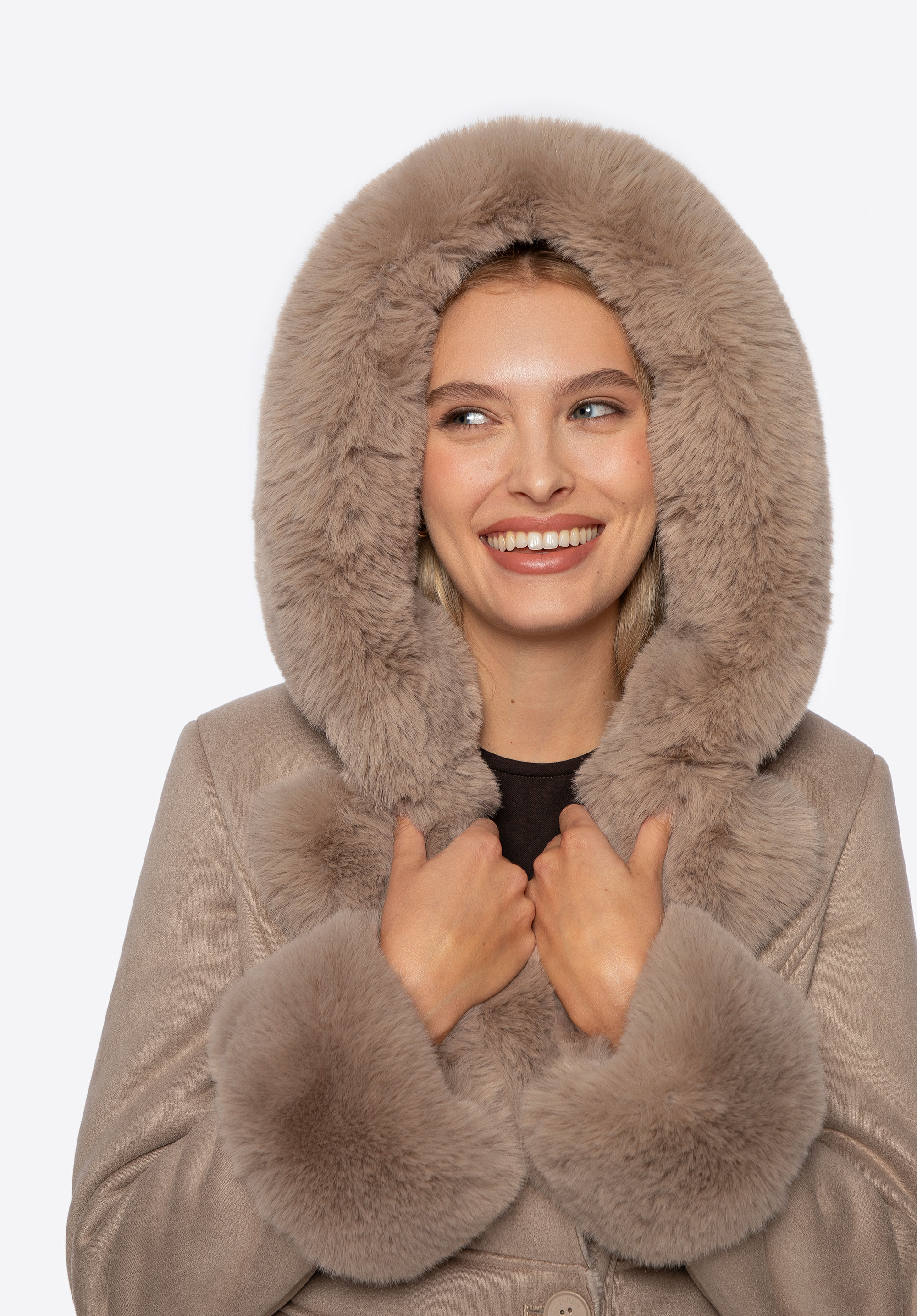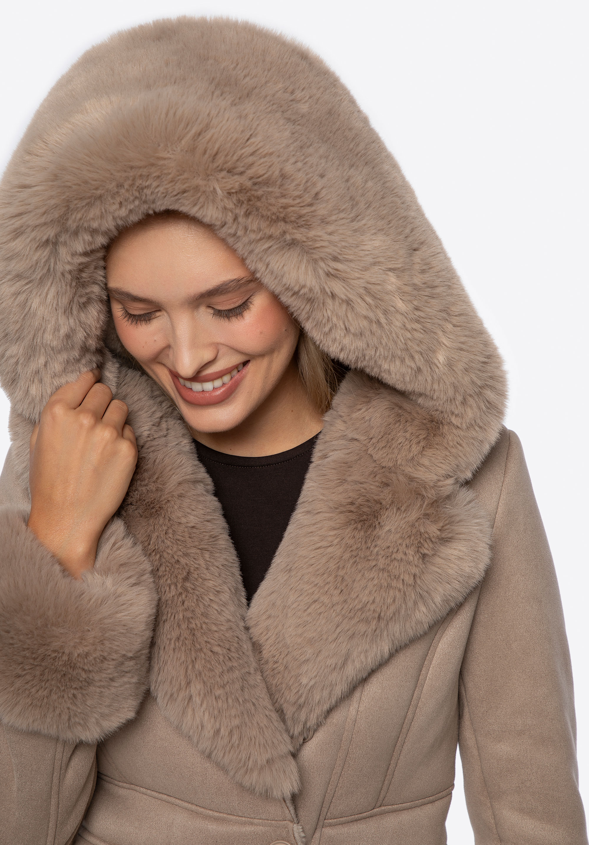 Tento dámský kabát kombinuje klasický styl s pohodlím pro chladnější dny. Je vyroben výhradně z měkké ekologické kožešiny a poskytuje teplo a útulnou, zabalenou siluetu. Přiléhavý střih zdůrazňuje ženskou siluetu a dodává jí elegantní nádech. Kabát má kapuci, kožešinové manžety a podšívku, které dále chrání před chladem a dodávají mu útulný, luxusní nádech.