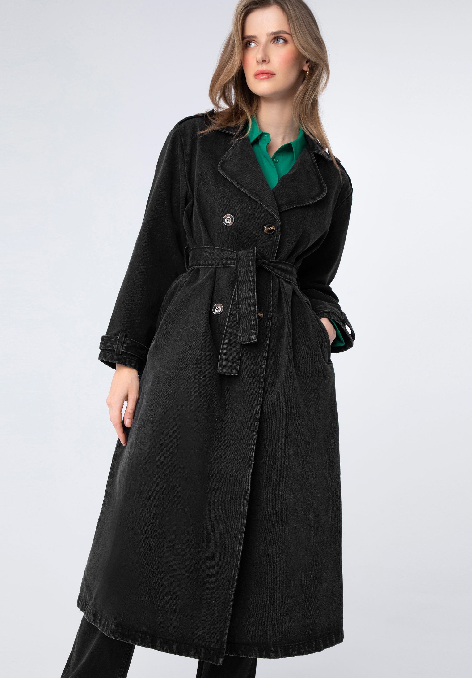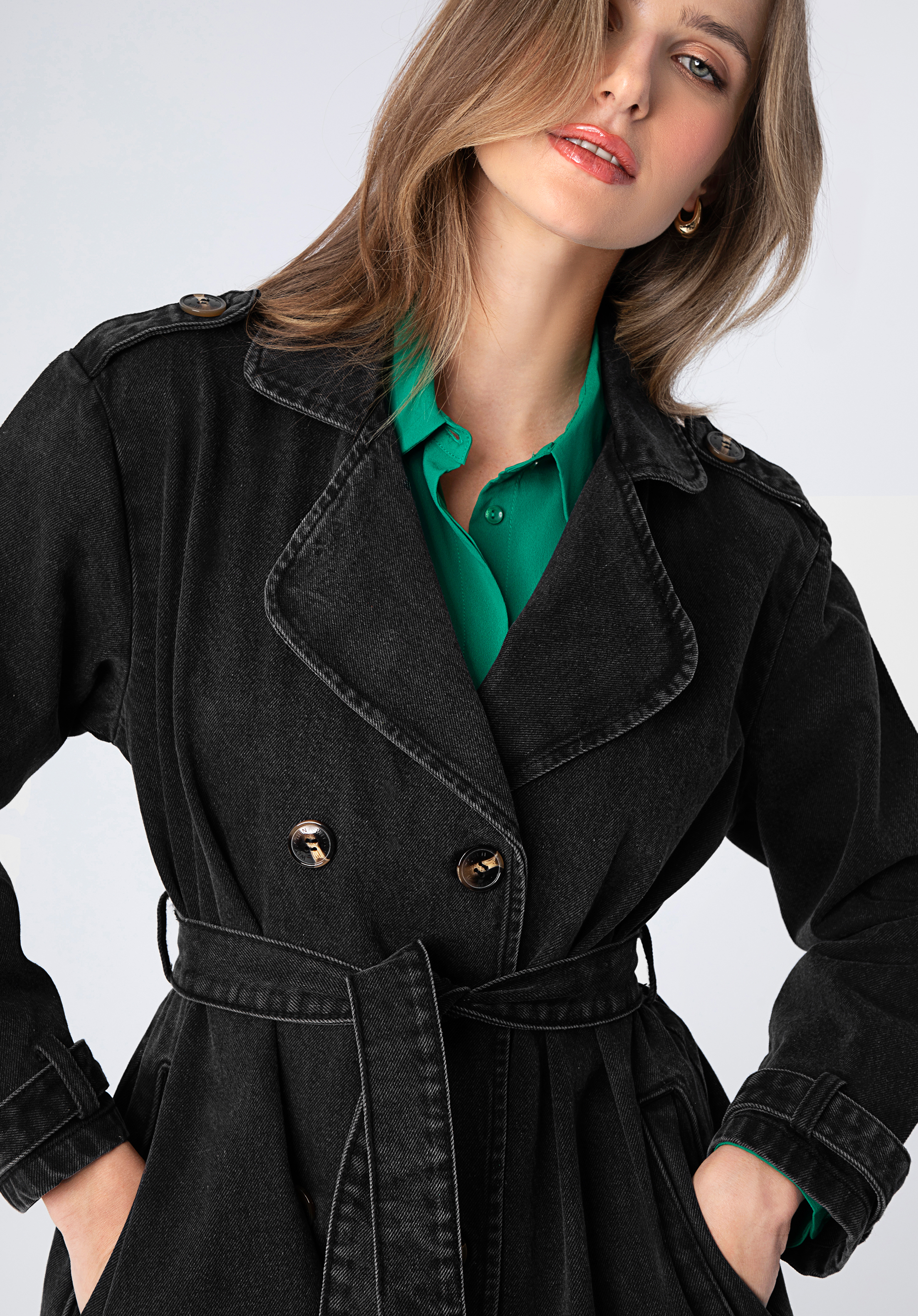 Tento kabát je nabídkou pro všechny milovníky elegantních produktu. Tento lehký kabát vypadá skvěle jak v ležérní verzi, tak k ženským vzdušným šatům. Nárameníky dodávají nadčasovou eleganci a zavazování v pase krásně zvýrazní postavu. Tenký materiál neomezuje pohyb, umožňuje dýchaní a zároveň je perfektním krytem pro první jarní dny. Pro romantickou verzi noste ho s dlouhými bílými šaty a béžovými kovbojskými botami. S černými kalhotami a bílou košilí. Vytvoří velmi módní a stylový komplet na neformální setkání.