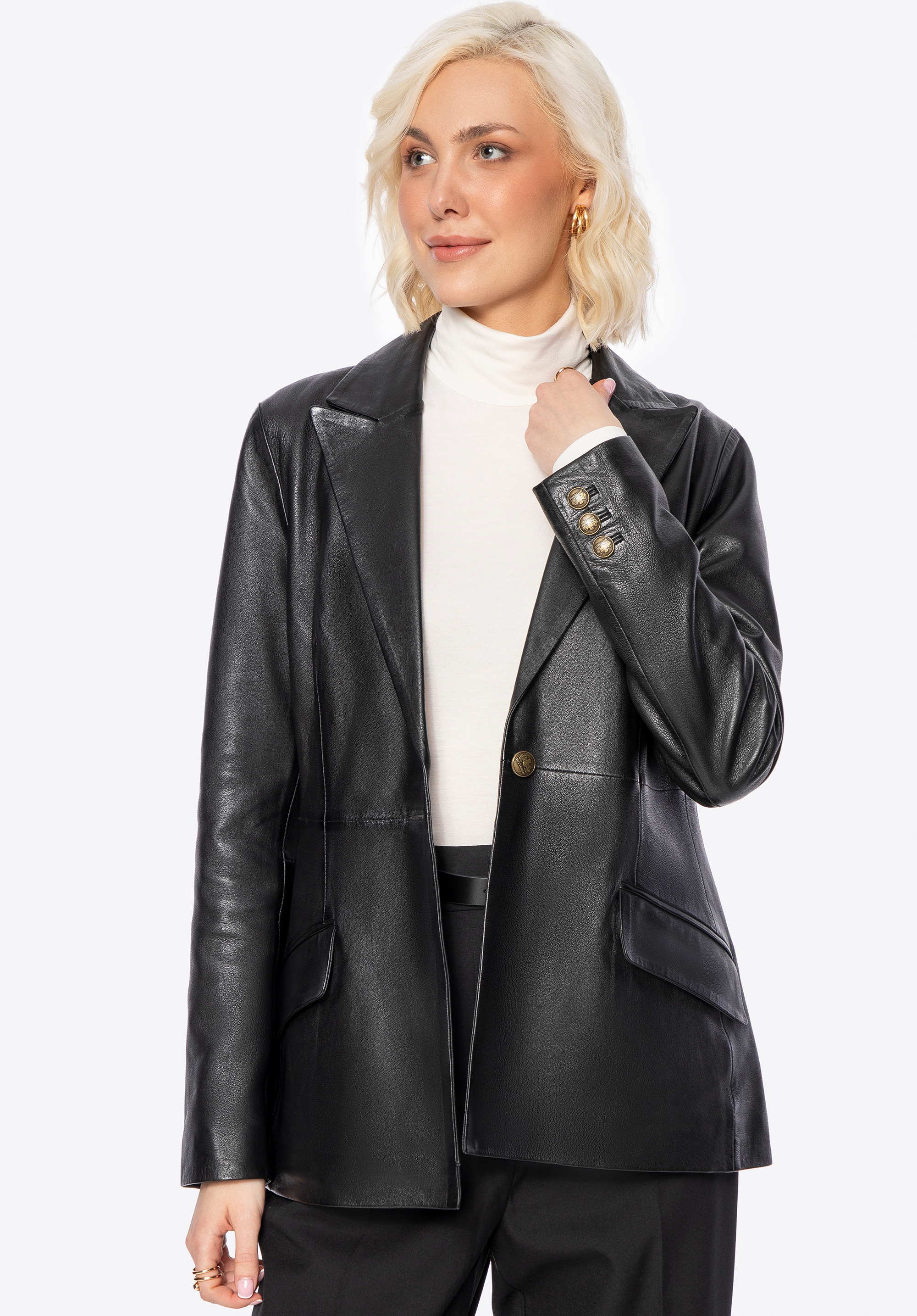 Luxus, který mluví sám za sebe. Tento krásný krátký kabát vyrobený z přírodní ovčí kůže je dokonalým spojením nadčasového stylu a moderní elegance. Každý detail – od značkových kovových knoflíků až po pečlivě zpracovaný, lichotivý střih – je navržen pro ženy, které oceňují kvalitu a sofistikovaný styl. Přizpůsobený střih zvýrazňuje siluetu, zatímco klasický límec dodává nádech rafinovanosti.
