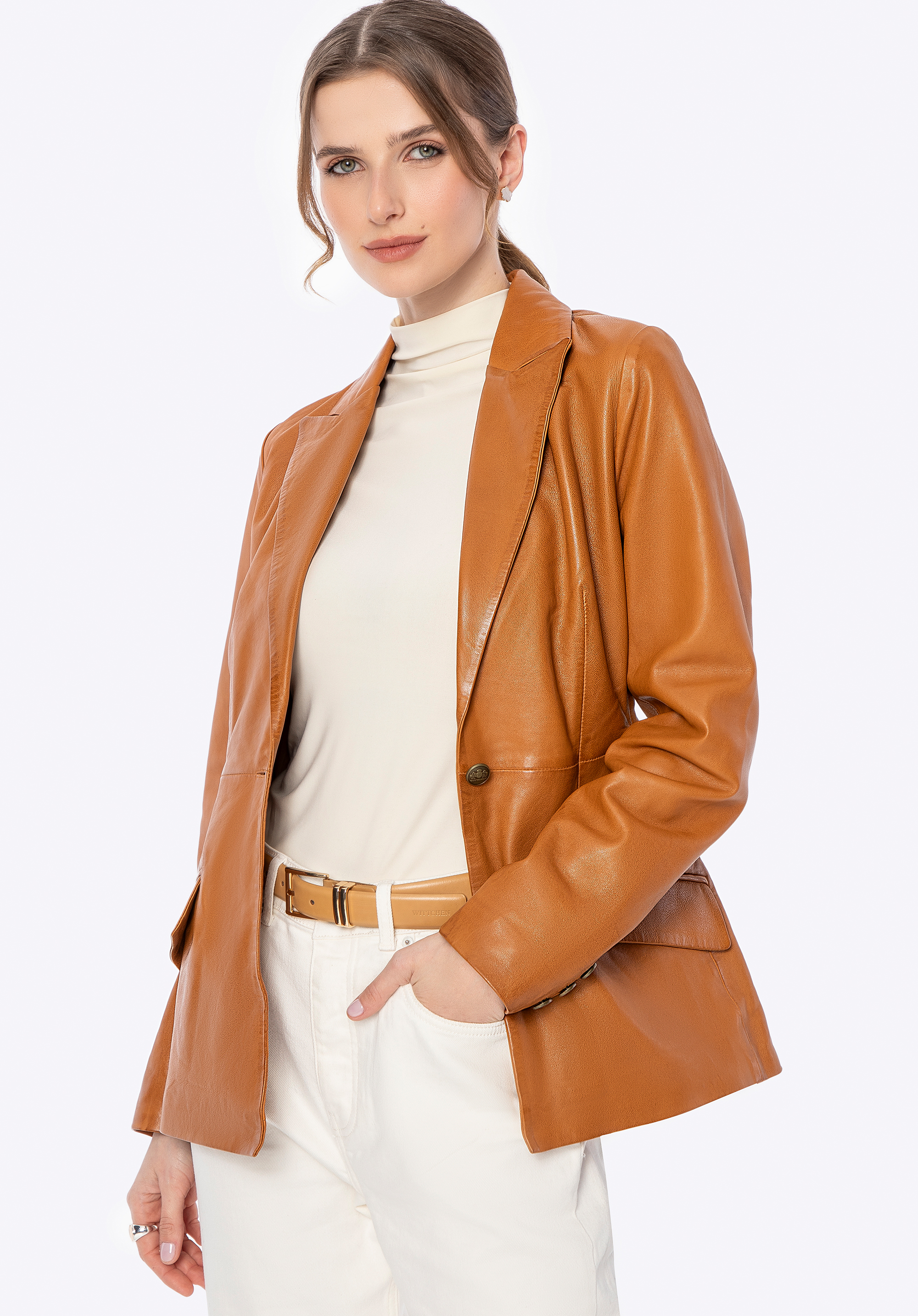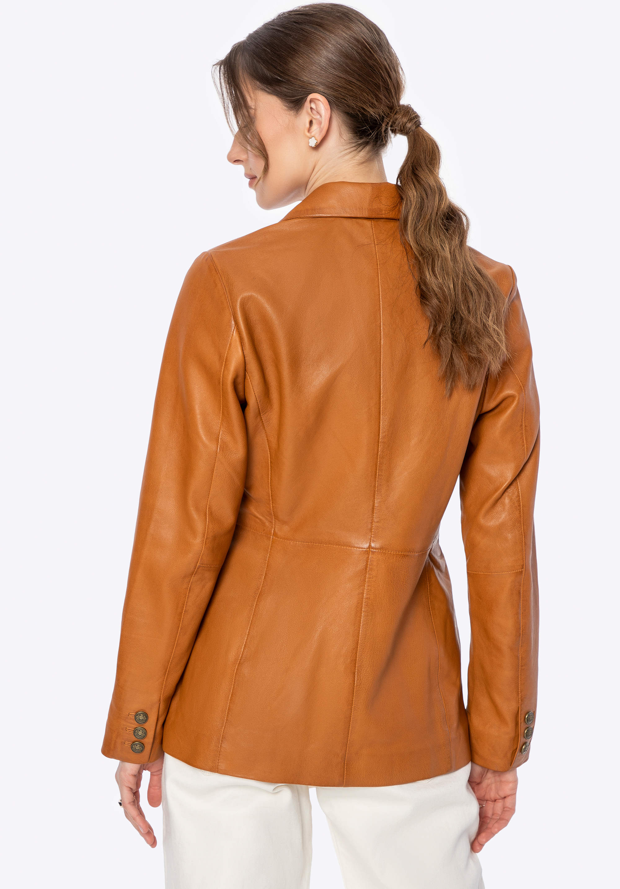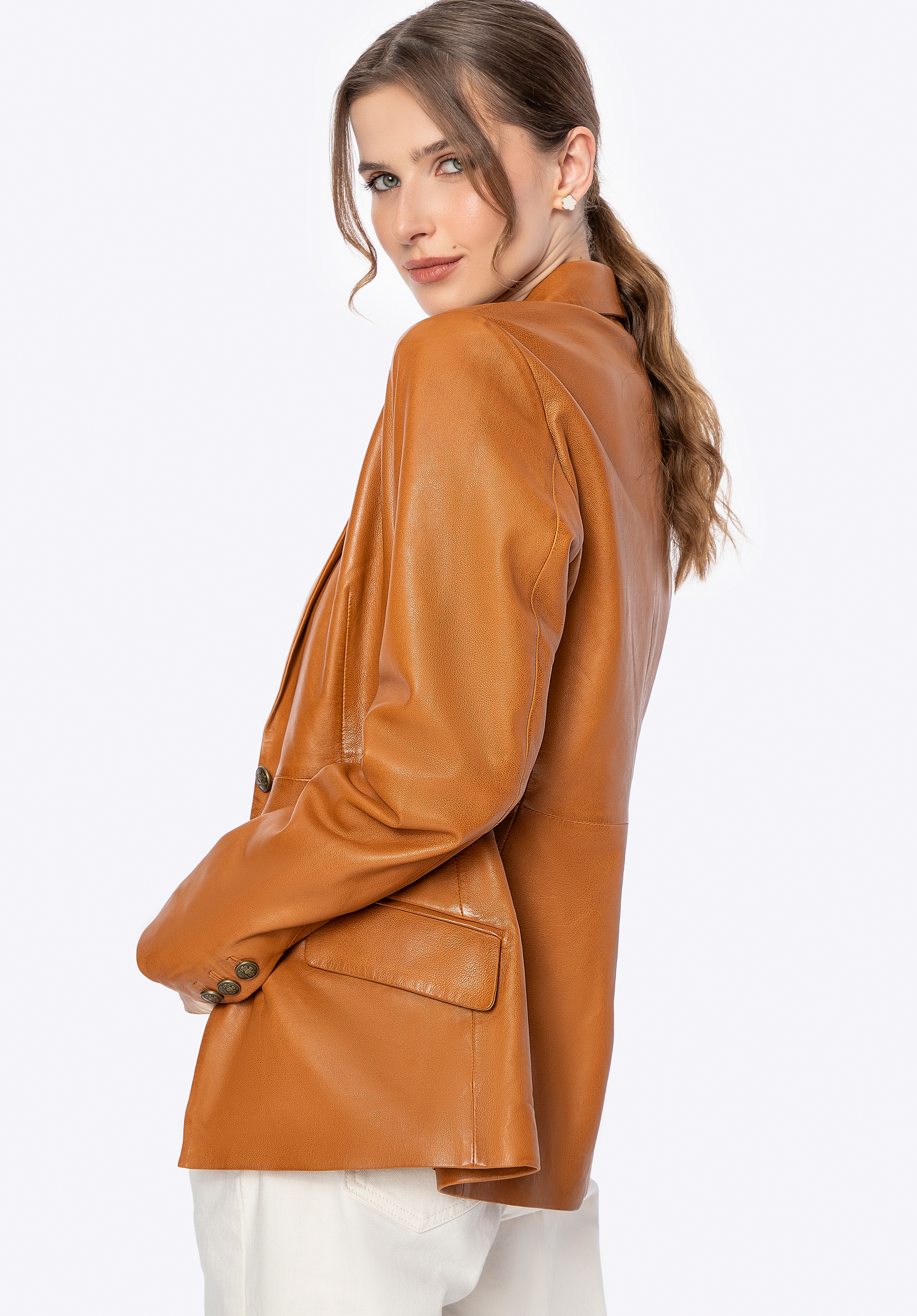 Luxus, který mluví sám za sebe. Tento krásný krátký kabát vyrobený z přírodní ovčí kůže je dokonalým spojením nadčasového stylu a moderní elegance. Každý detail – od značkových kovových knoflíků až po pečlivě zpracovaný, lichotivý střih – je navržen pro ženy, které oceňují kvalitu a sofistikovaný styl. Přizpůsobený střih zvýrazňuje siluetu, zatímco klasický límec dodává nádech rafinovanosti.
