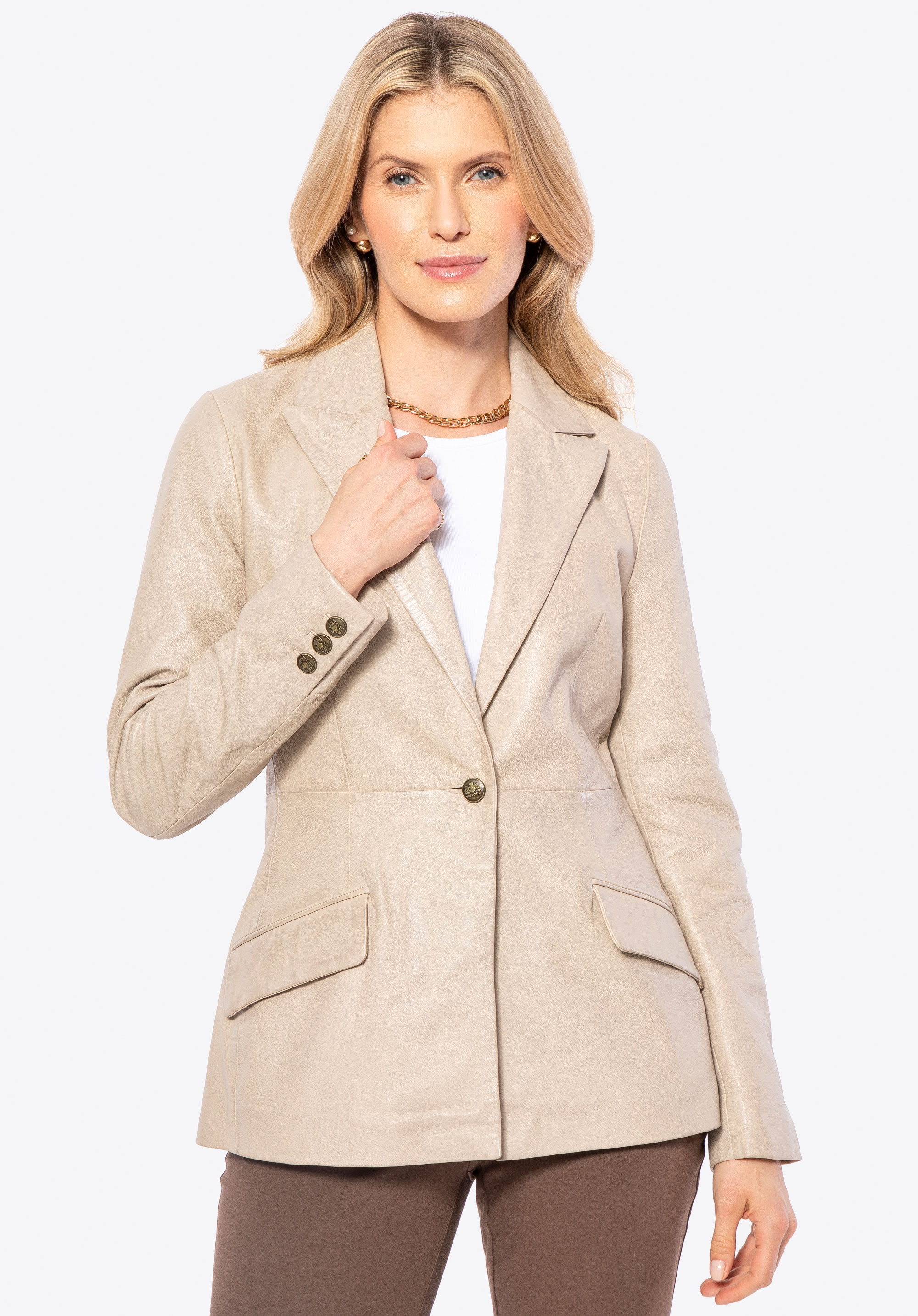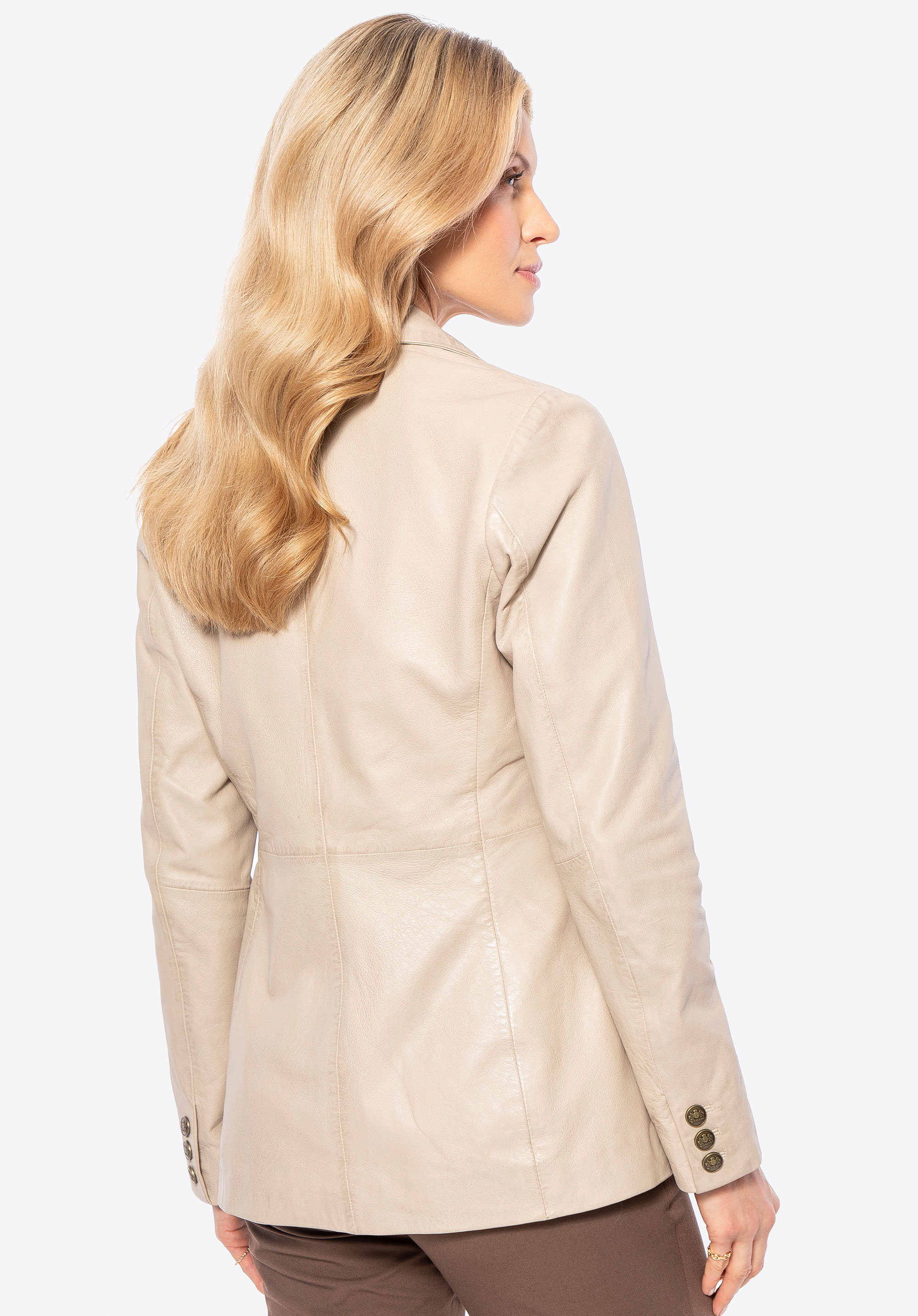 Luxus, který mluví sám za sebe. Tento krásný krátký kabát vyrobený z přírodní ovčí kůže je dokonalým spojením nadčasového stylu a moderní elegance. Každý detail – od značkových kovových knoflíků až po pečlivě zpracovaný, lichotivý střih – je navržen pro ženy, které oceňují kvalitu a sofistikovaný styl. Přizpůsobený střih zvýrazňuje siluetu, zatímco klasický límec dodává nádech rafinovanosti.