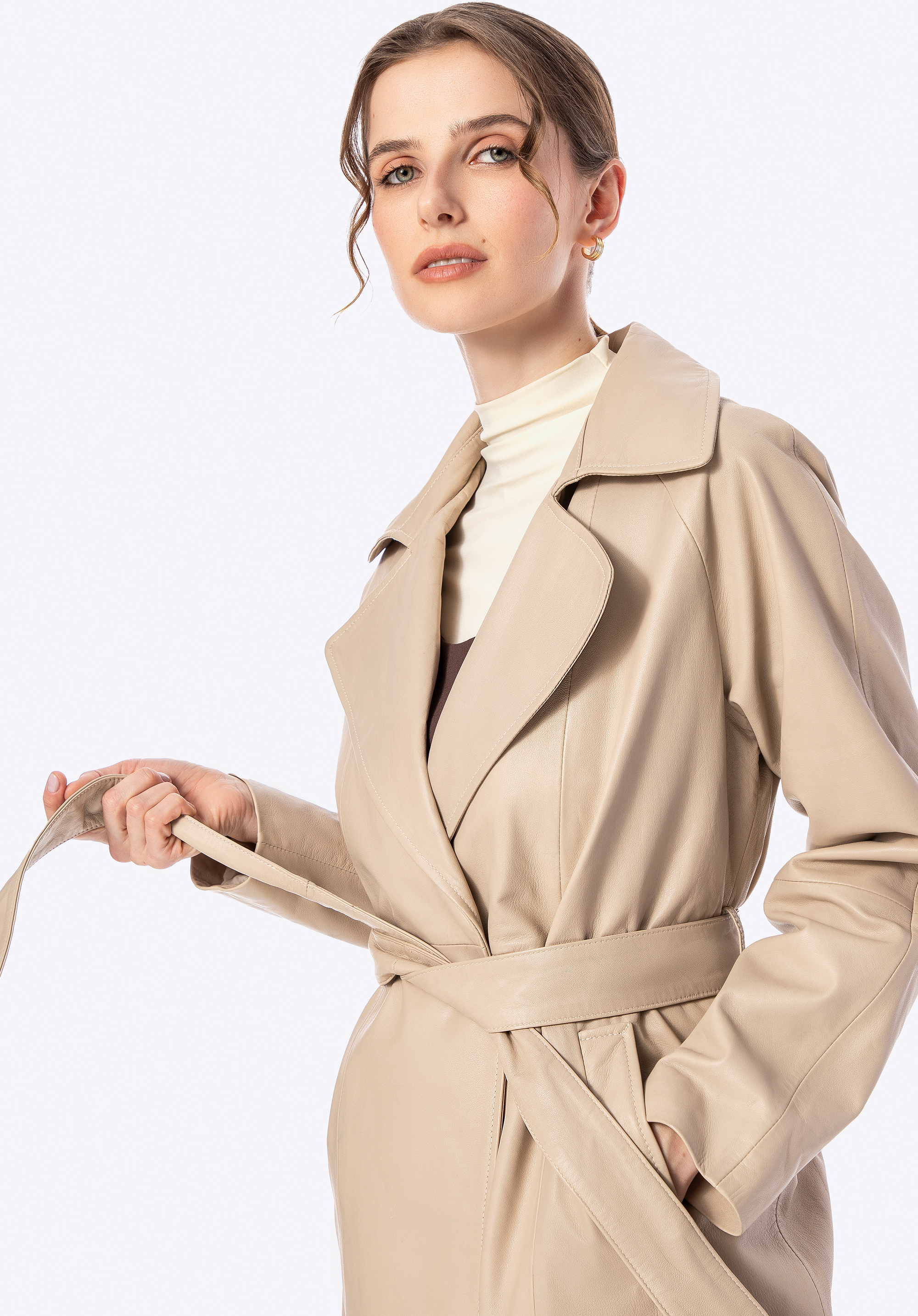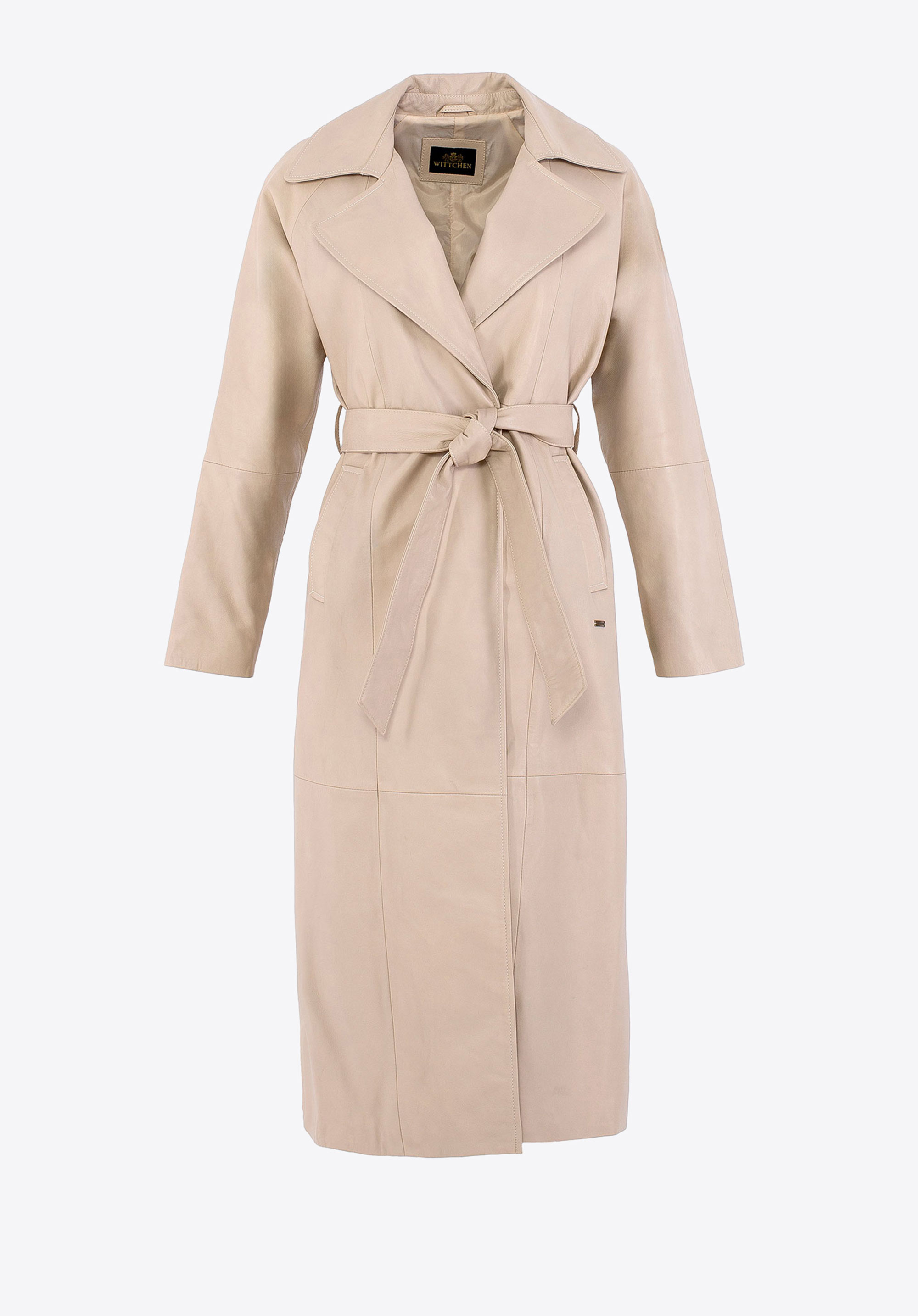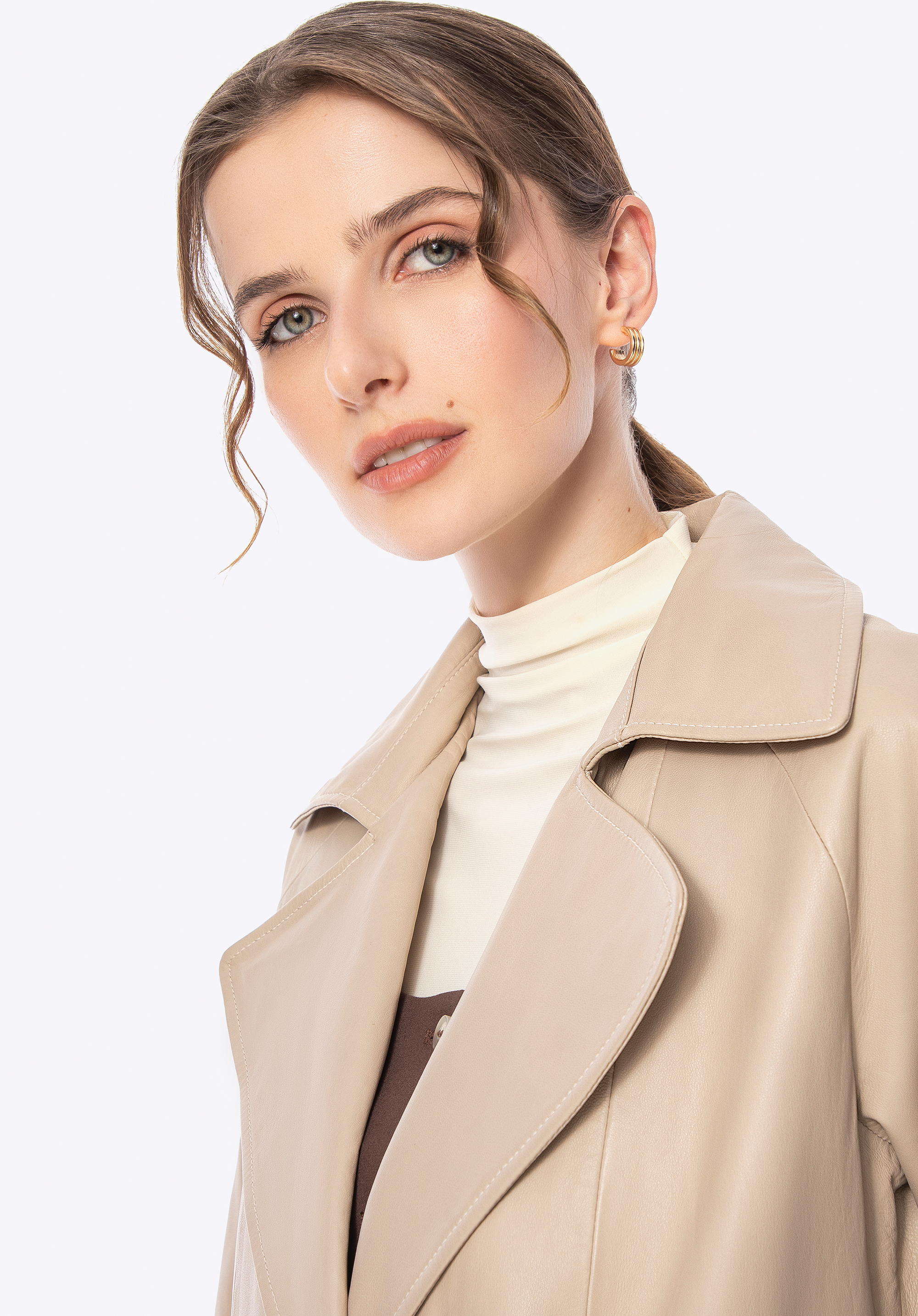 Tento kabát vyrobený z přírodní ovčí kůže je esencí klasického stylu s moderním nádechem. Jeho nadčasový střih jemně zvýrazňuje siluetu, zatímco pásek zajišťuje dokonalé padnutí. Klasický límec , decentní kovové logo a vertikální kapsy hladce zapadají do minimalistického designu a vytvářejí kabát, který vyzařuje eleganci a rafinovanost.