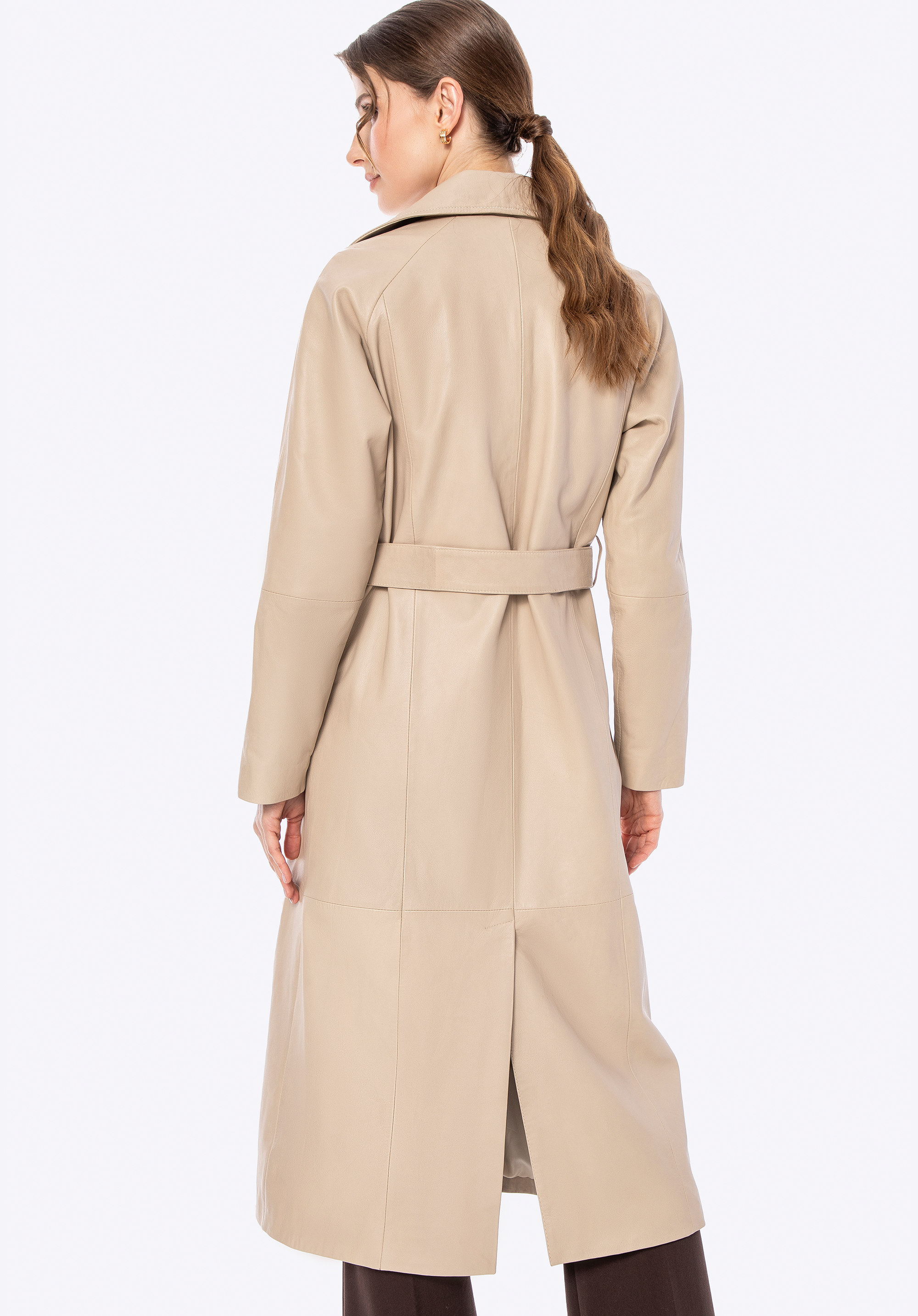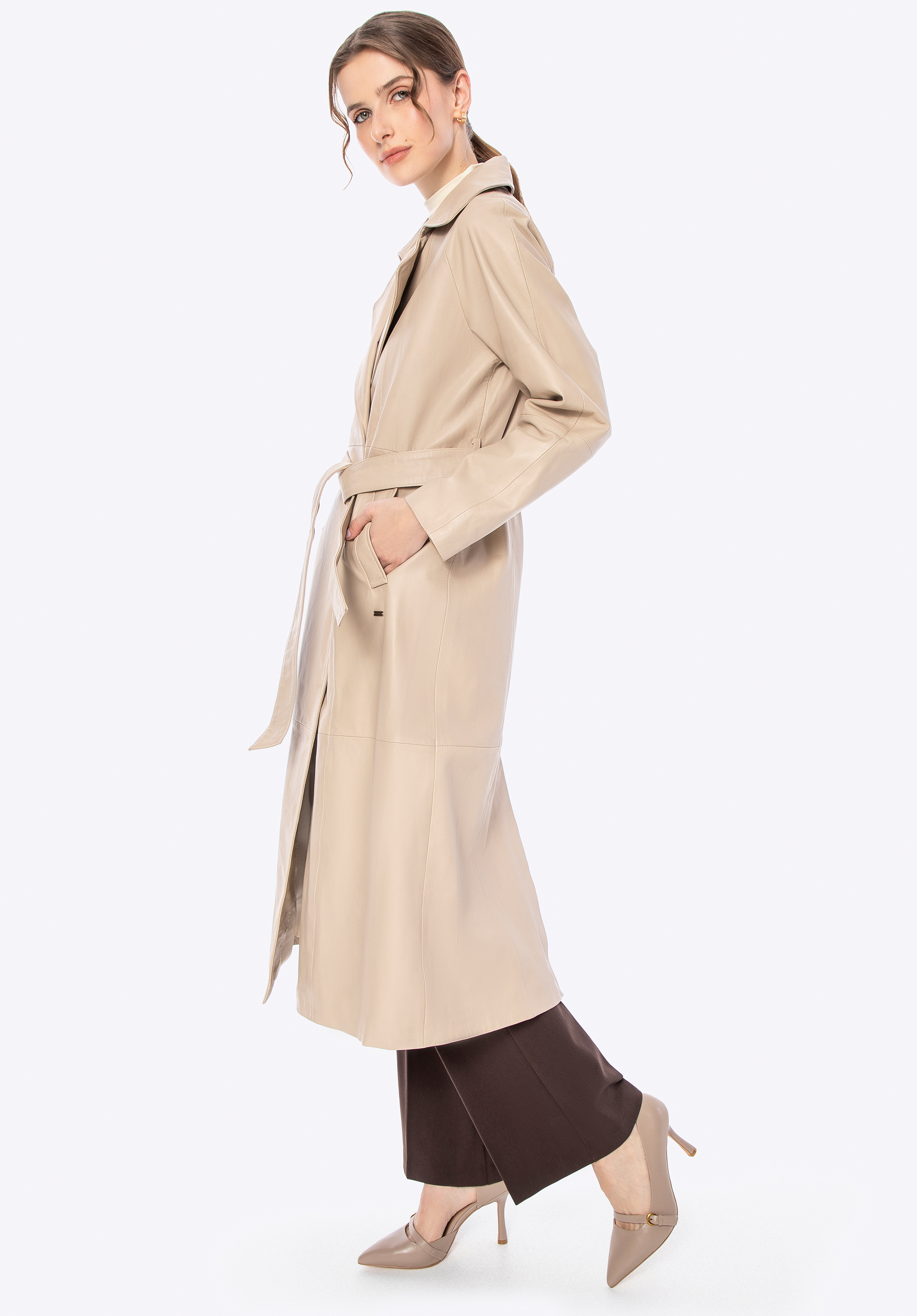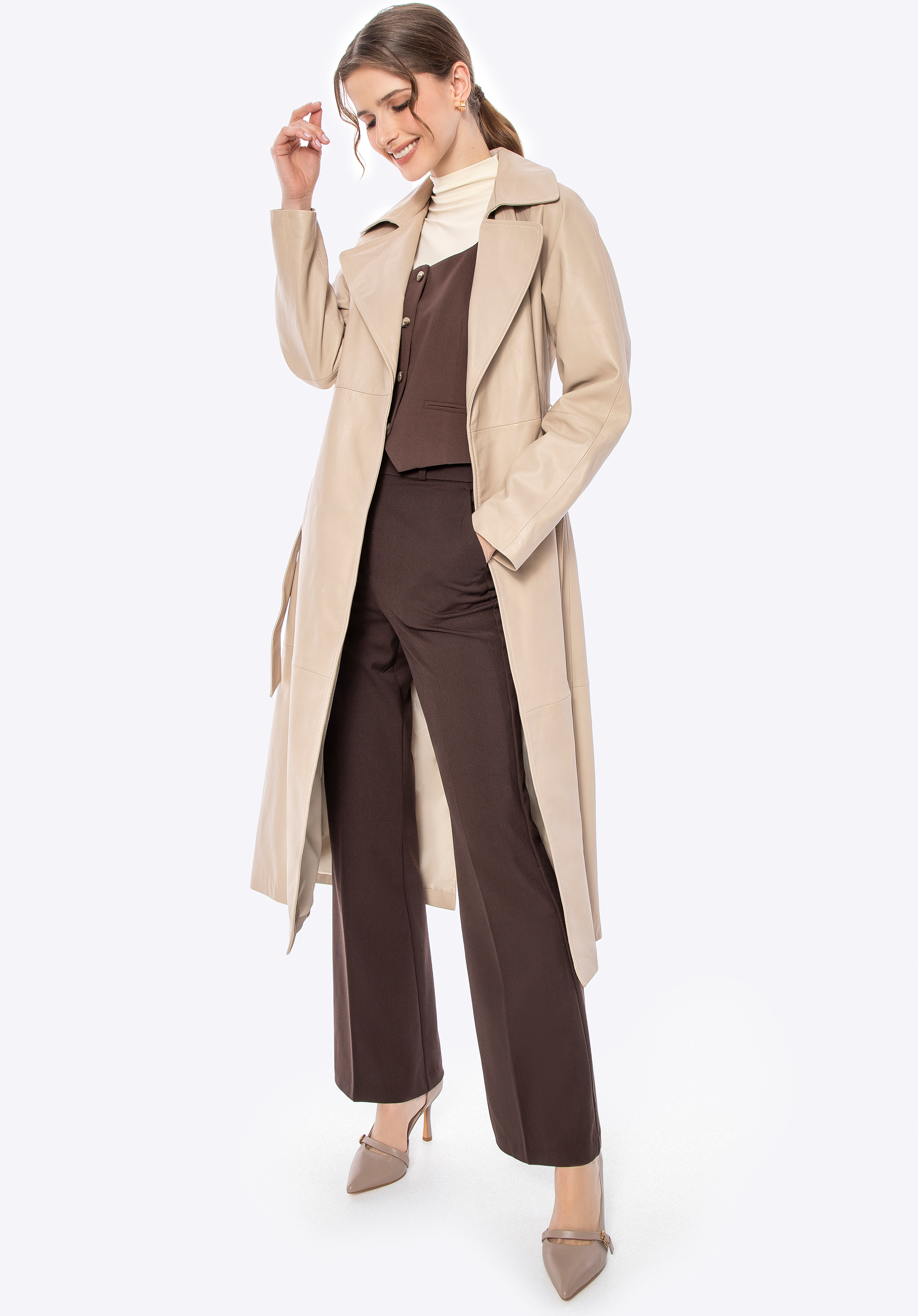 Tento kabát vyrobený z přírodní ovčí kůže je esencí klasického stylu s moderním nádechem. Jeho nadčasový střih jemně zvýrazňuje siluetu, zatímco pásek zajišťuje dokonalé padnutí. Klasický límec , decentní kovové logo a vertikální kapsy hladce zapadají do minimalistického designu a vytvářejí kabát, který vyzařuje eleganci a rafinovanost.