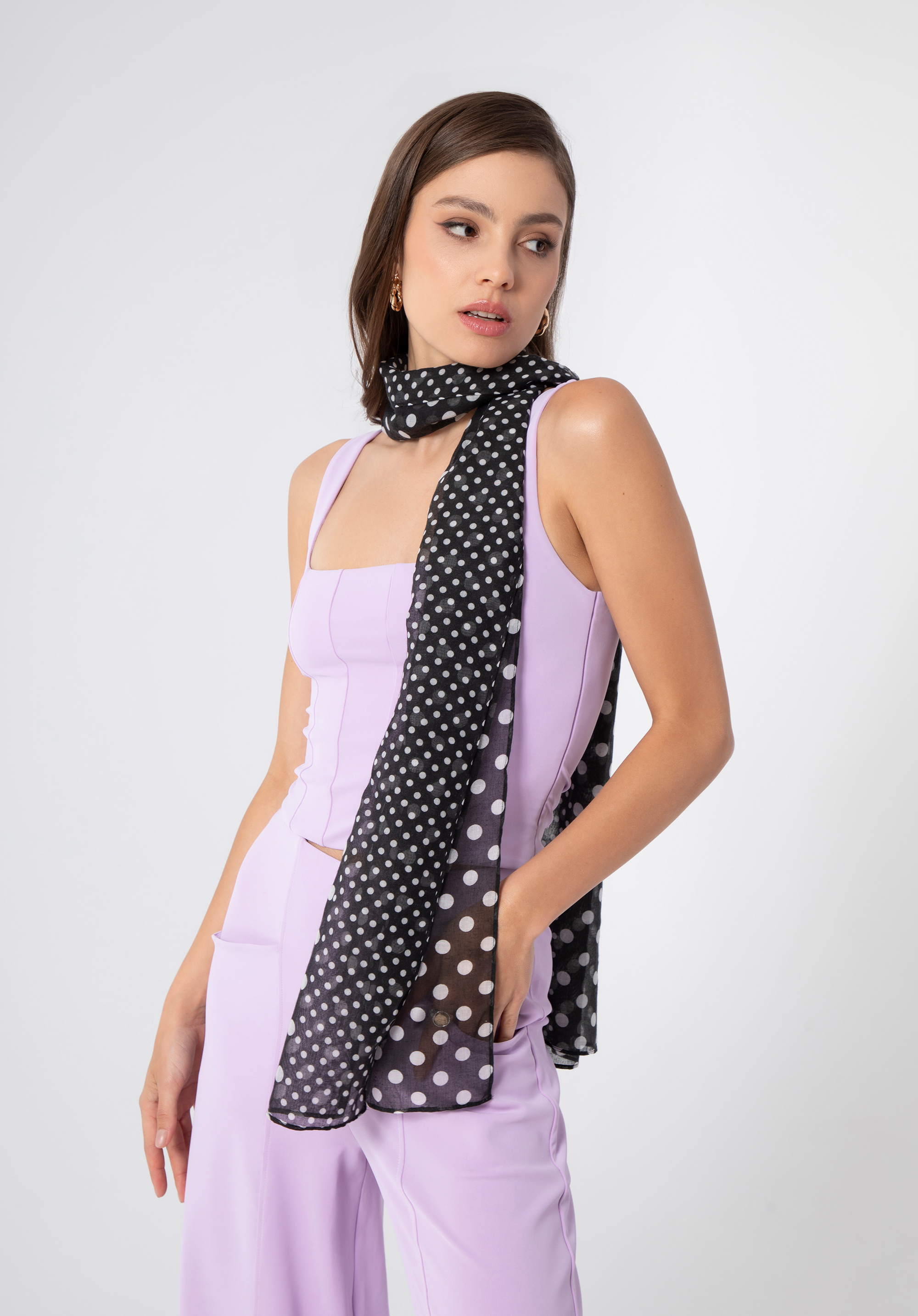 Puntíkovaný šátek lze nosit mnoha různými způsoby – volně kolem krku, nebo jemně uvázaný. Můžete ho také použít jako čelenku, pásek ke kalhotám nebo ozdobu kabelky a dodat charakter každému obleku.