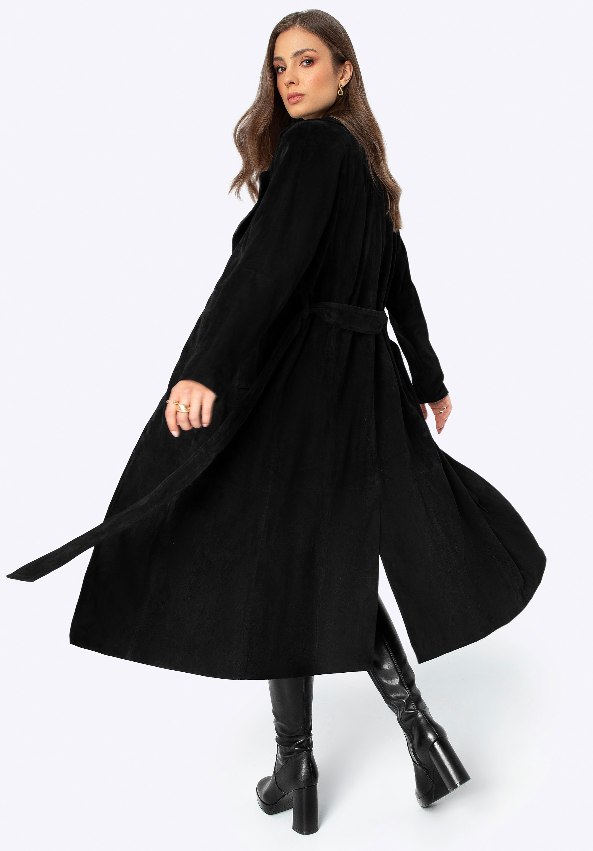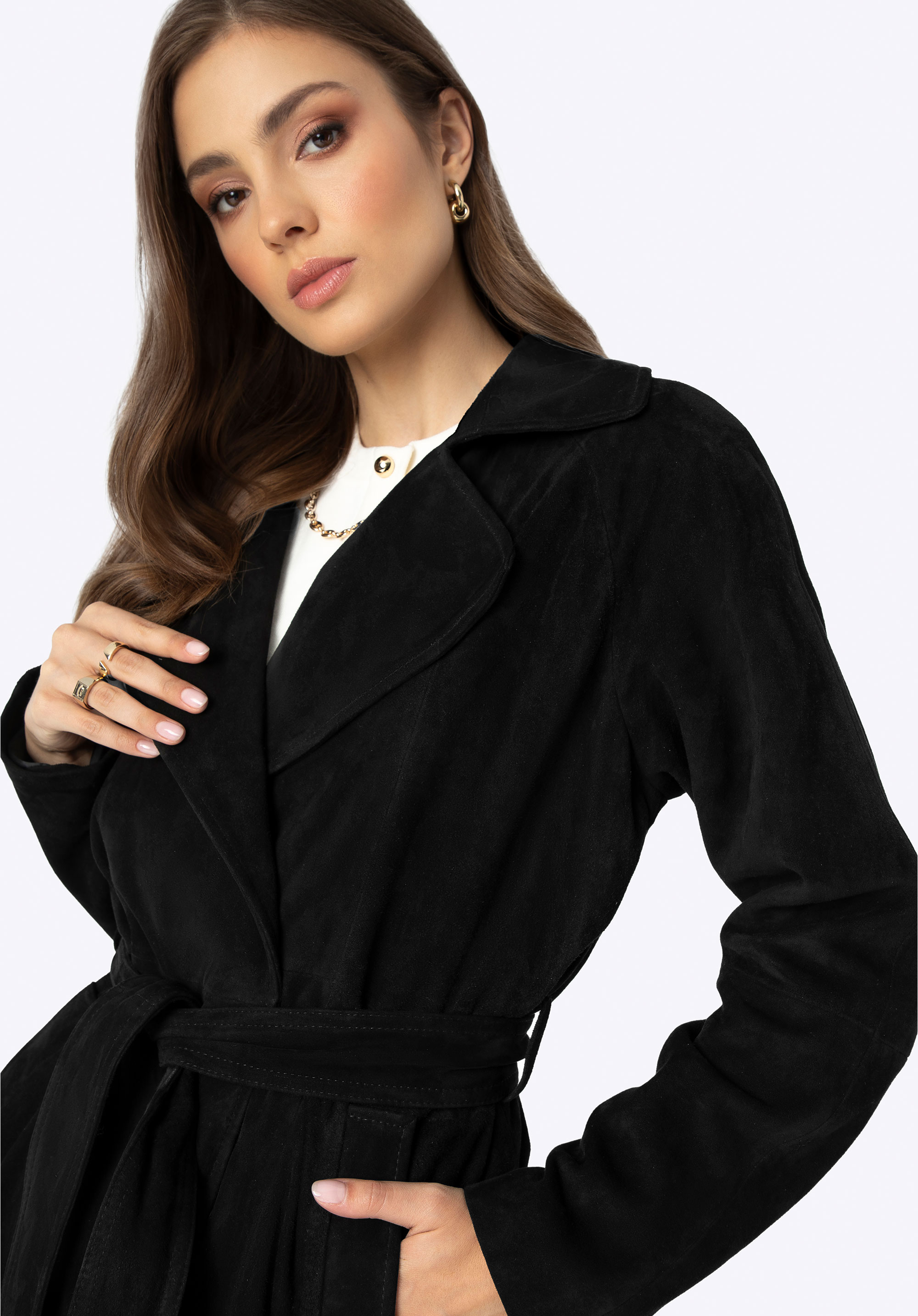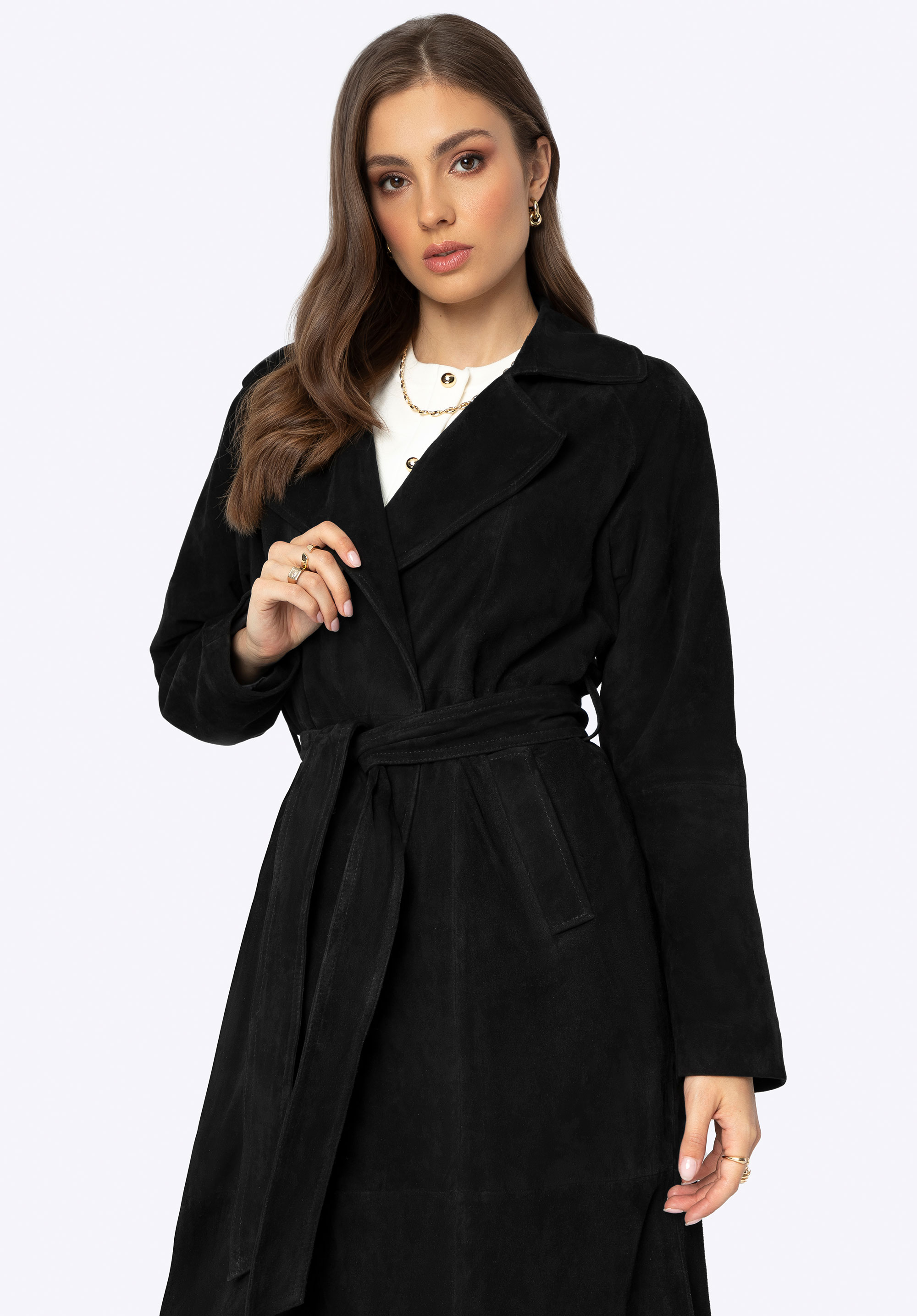 Objevte náš jedinečný kabát vyrobený z nejkvalitnější přírodní kůže. Je to podstata klasiky v moderní verzi, která dodá eleganci každému vašemu obleku. Kabát má jednoduchý střih, který vyzařuje eleganci ve svém minimalismu, ideální pro elegantní každodenní obleky i speciální příležitosti. Tento kabát je nejen stylový, ale díky pásku v pase také dokonale lichotí vaší postavě. Stahovací límec dodává klasické kouzlo, zatímco dvě hluboké kapsy poskytují prostor pro drobnosti, které chcete mít vždy po ruce. Navíc díky rozparku se záhybem vzadu je extrémně pohodlné a snadno se nosí.