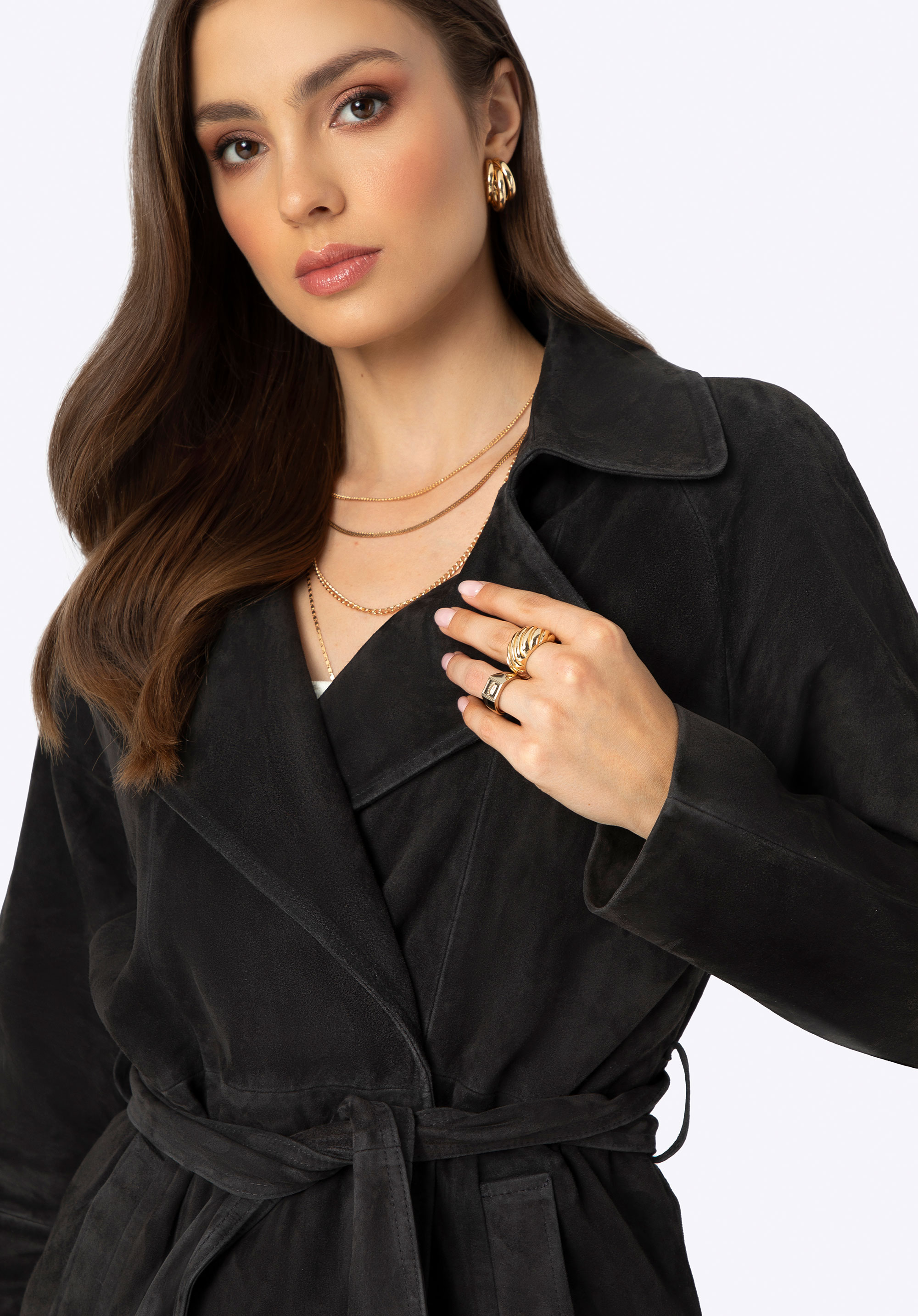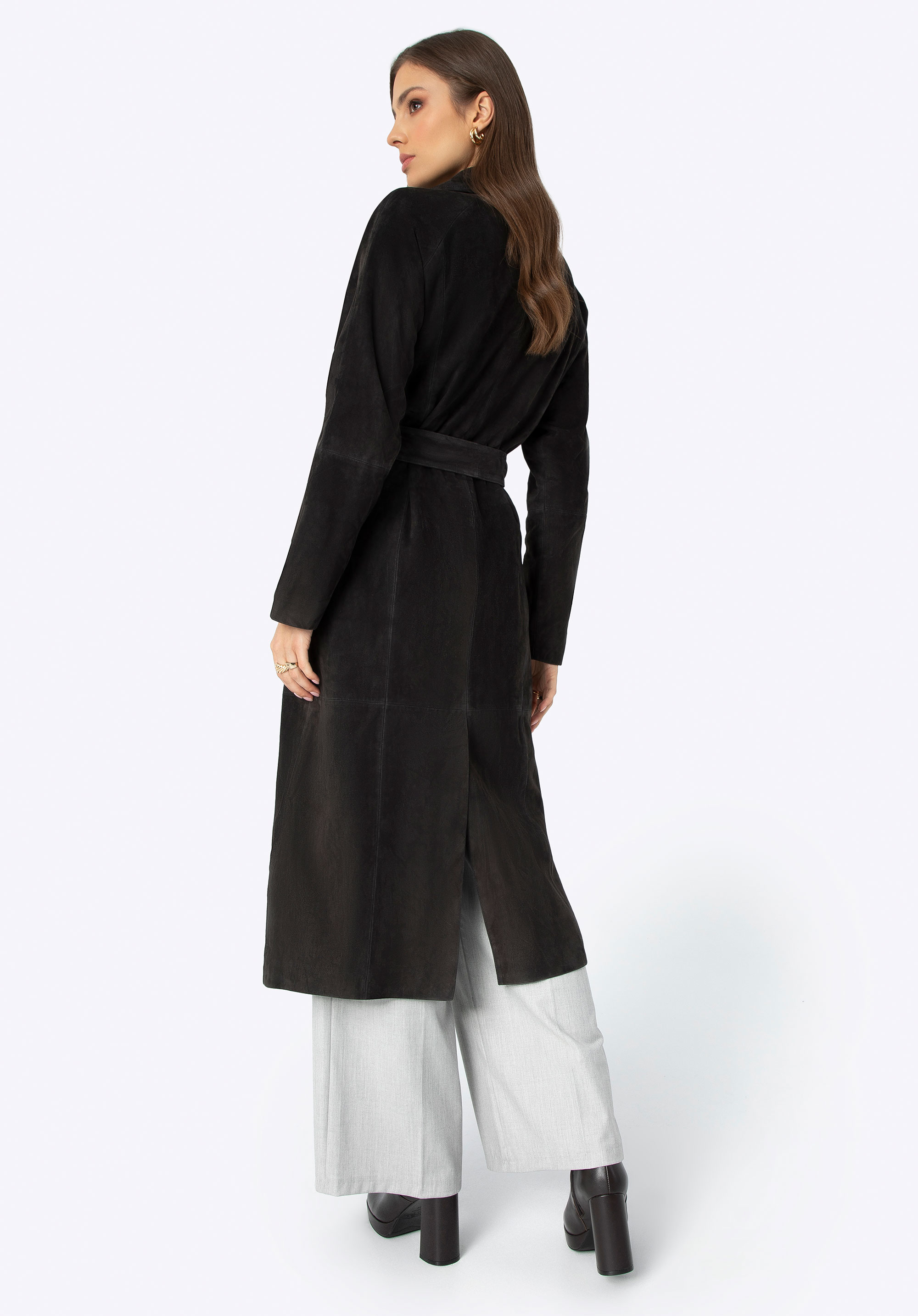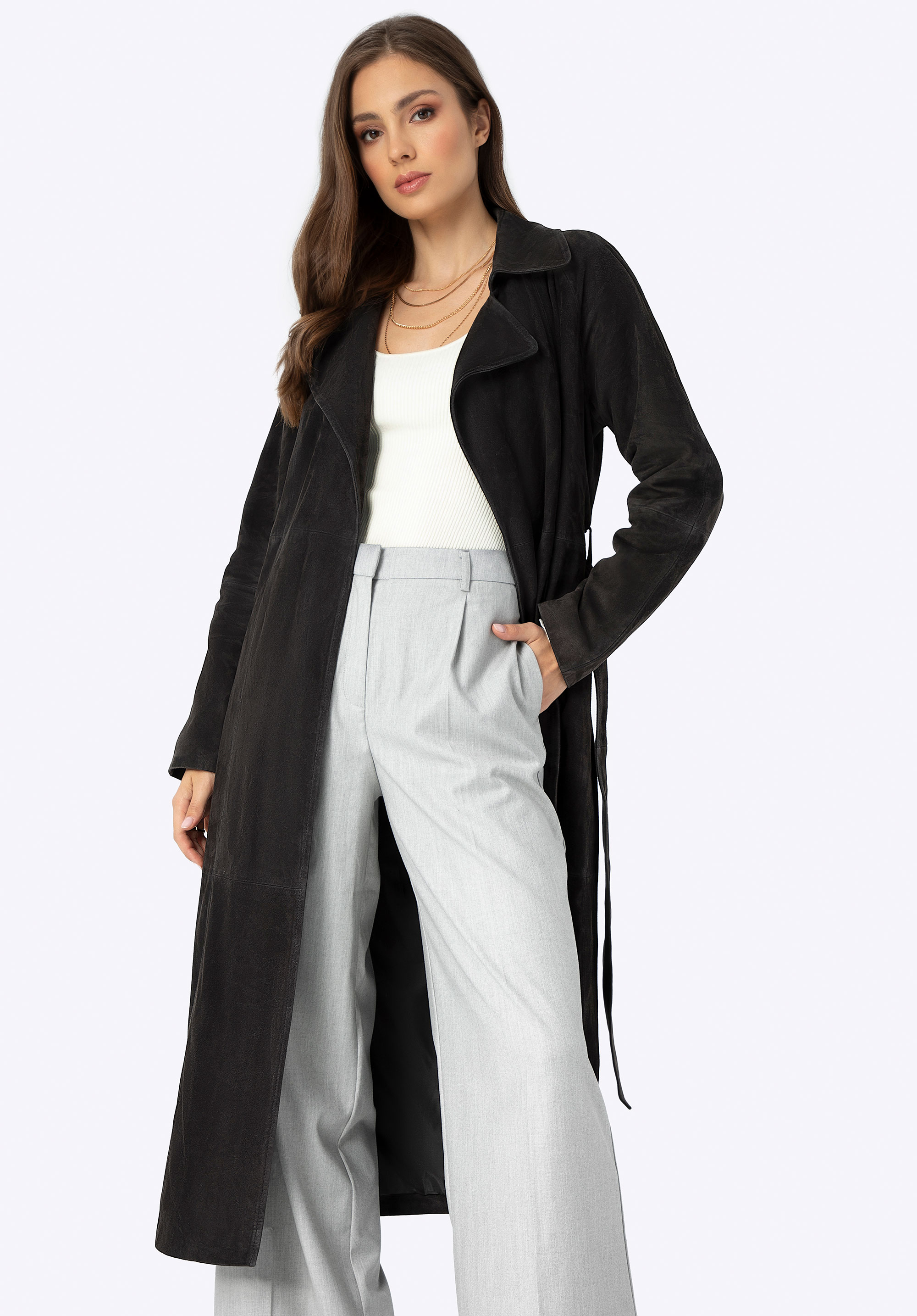 Objevte náš jedinečný kabát vyrobený z nejkvalitnější přírodní kůže. Je to podstata klasiky v moderní verzi, která dodá eleganci každému vašemu obleku. Kabát má jednoduchý střih, který vyzařuje eleganci ve svém minimalismu, ideální pro elegantní každodenní obleky i speciální příležitosti. Tento kabát je nejen stylový, ale díky pásku v pase také dokonale lichotí vaší postavě. Stahovací límec dodává klasické kouzlo, zatímco dvě hluboké kapsy poskytují prostor pro drobnosti, které chcete mít vždy po ruce. Navíc díky rozparku se záhybem vzadu je extrémně pohodlné a snadno se nosí.