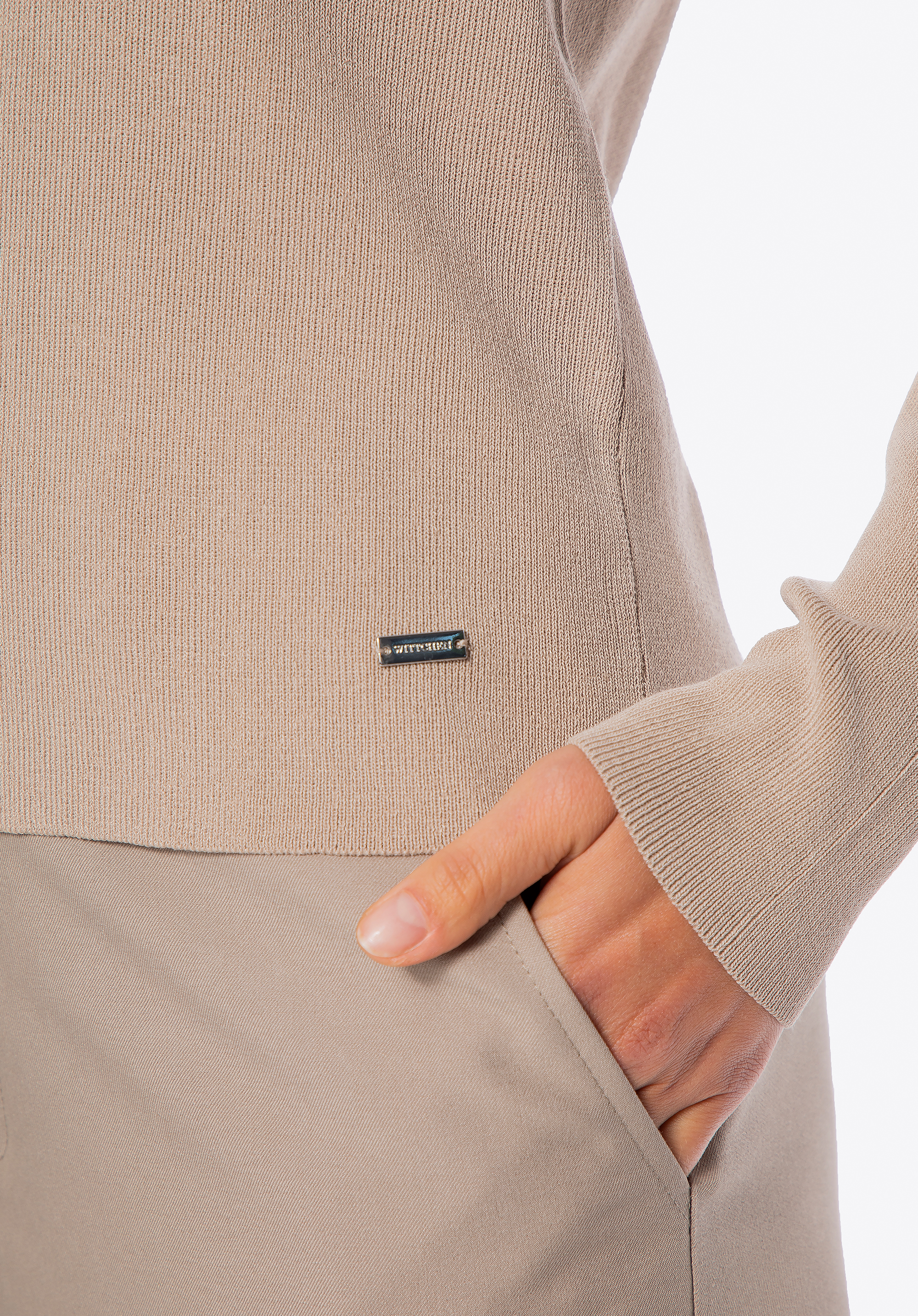 Tento svetr je perfektní volbou, pokud hledáte pohodlí v kombinaci s klasickou elegancí. Je vyroben z měkké a lehké viskózy smíchané s nylonem a nabízí celodenní pohodlí bez ohledu na příležitost. Dlouhé, přiléhavé rukávy jsou navrženy tak, aby úhledně přiléhaly k zápěstím, a zajišťují tak lichotivý střih a elegantní vzhled. Žebrovaný výstřih dodává svetru jemnou strukturu a sofistikovanost. Kovový detail na lemu je moderním akcentem, který zdůrazňuje péči věnovanou zpracování každého prvku a dodává mu moderní nádech.